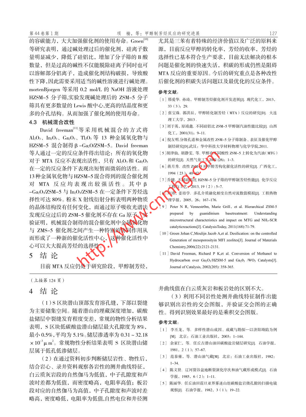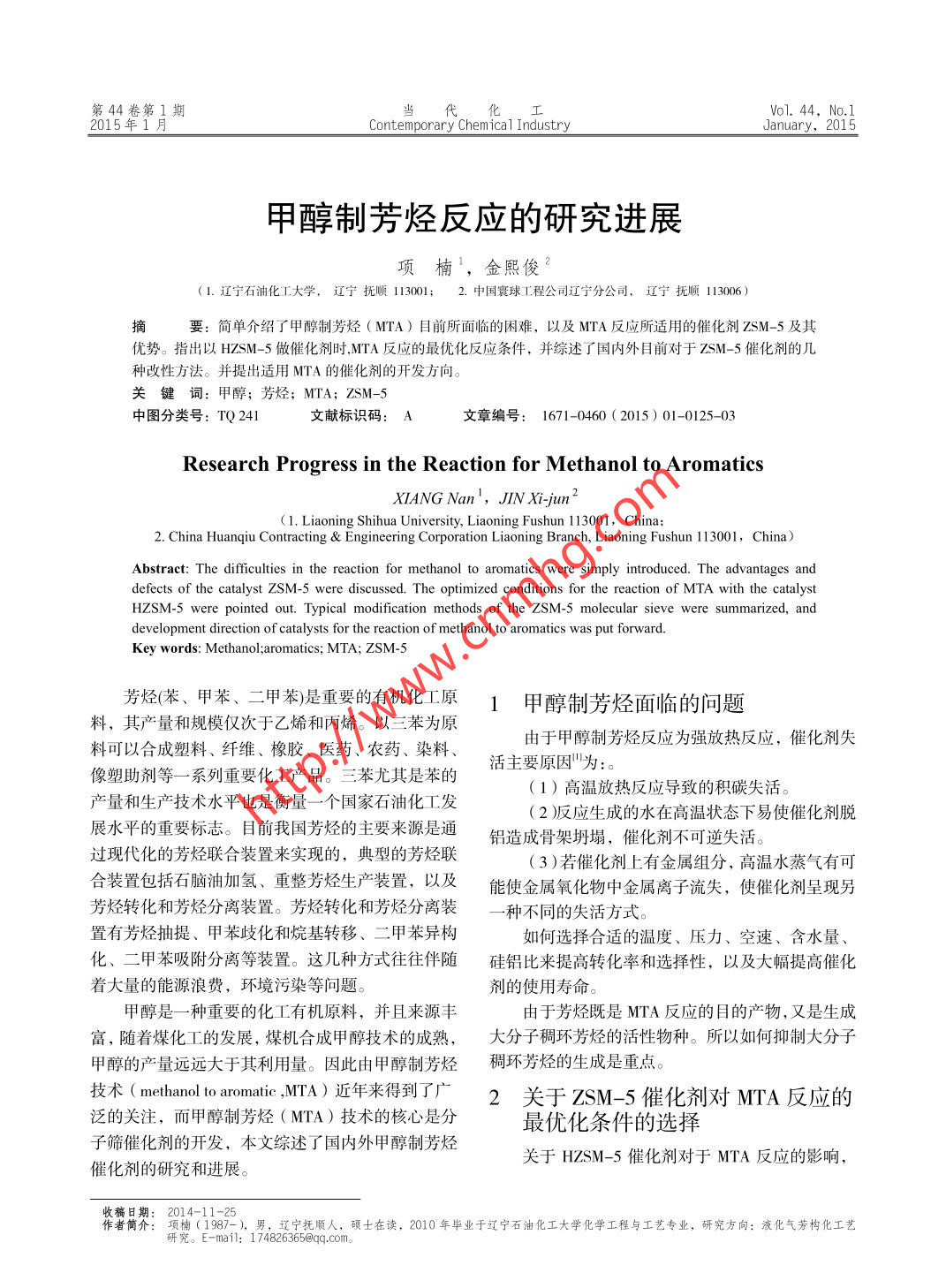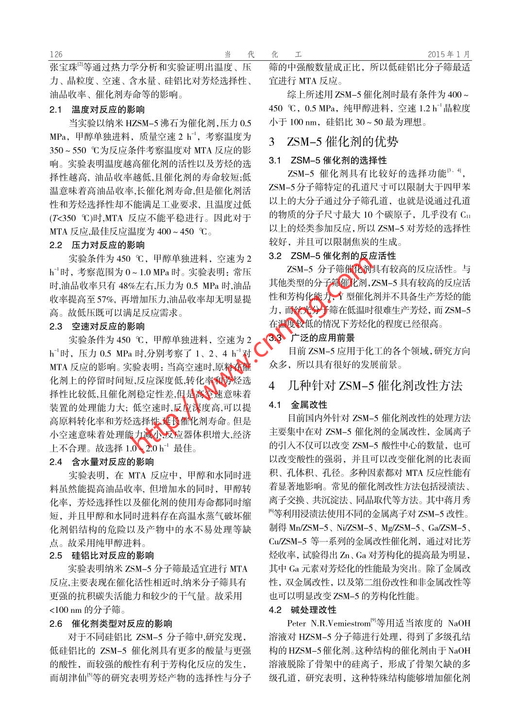 第44卷第1期當代化工Vo1. 44, No.12015年1月Contemporary Chemica 1 IndustryJanuary, 2015甲醇制芳烴反應的研究進展.項楠',金熙俊“(1.遼寧石油化工大學, 遼寧撫順1300;1 2. 中國寰球工程公司遼寧分公司, 遼寧撫順13006 )捅要:簡單介紹了甲醇制芳烴( MTA)目前所面臨的困難,以及MTA反應所適用的催化劑ZSM-5及其優(yōu)勢。指出以HZSM-5做催化劑時,MTA反應的最優(yōu)化反應條件,并綜述了國內(nèi)外目前對于ZSM- -5催化劑的幾種改性方法。并提出適用MTA的催化劑的開發(fā)方向。關鍵詞:甲醇;芳烴; MTA; ZSM-5中圖分類號: TQ 241文獻標識碼: A文章編號: 1671-0460 ( 2015) 01-0125-03Research Progress in the Reaction for Methanol to AromaticsXLANG Nan', JINXi-jun 2(1. Liaoning Shihua University, Liaoning Fushun 113001,China;2. China Huanqiu Contracting & Engineering Corporation Liaoning Branch, Liaoning Fushun 113001,China)Abstract: The difculties in the reaction for methanol to aromatics were simply introduced. The advantages anddefects of the catalyst ZSM-5 were discussed. The optimized conditions for the reaction of MTA with the catalystHZSM-5 were pointed out. Typical modification methods of the ZSM-5 molecular sieve were summarized, anddevelopment direction of catalysts for the reaction of methanol to aromatics was put forward.Key words: Methanol;aromatics; MTA; ZSM-5芳烴(苯、甲苯、二甲苯)是重要的有機化工原1甲醇制芳烴面臨的問題料,其產(chǎn)量和規(guī)模僅次于乙烯和丙烯。以三苯為原料可以合成塑料、纖維、橡膠、醫(yī)藥、農(nóng)藥、染料、由于甲醇制芳烴反應為強放熱反應,催化劑失像塑助劑等- - 系列重要化工產(chǎn)品。三苯尤其是苯的活主要原因"為:。( 1)高溫放熱反應導致的積碳失活。產(chǎn)量和生產(chǎn)技術水平也是衡量一個國家石油化工發(fā)(2 )反應生成的水在高溫狀態(tài)下易使催化劑脫展水平的重要標志。目前我國芳烴的主要來源是通鋁造成骨架坍塌,催化劑不可逆失活。過現(xiàn)代化的芳烴聯(lián)合裝置來實現(xiàn)的,典型的芳烴聯(lián)(3)若催化劑上有金屬組分,高溫水蒸氣有可合裝置包括石腦油加氫、重整芳烴生產(chǎn)裝置,以及能使金屬氧化物中金屬離子流失,使催化劑呈現(xiàn)另芳烴轉(zhuǎn)化和芳烴分離裝置。芳烴轉(zhuǎn)化和芳烴分離裝種不同的失活方式。置有芳烴抽提、甲苯歧化和烷基轉(zhuǎn)移、二甲苯異構(gòu)如何選擇合適的溫度、壓力、空速、含水量、化、二甲苯吸附分離等裝置。這幾種方式往往伴隨硅鋁比來提高轉(zhuǎn)化率和選擇性,以及大幅提高催化著大量的能源浪費,環(huán)境污染等問題。劑的使用壽命。甲醇是- -種重要的化工有機原料,并且來源豐由于芳烴既是MTA反應的目的產(chǎn)物,又是生成富,隨著煤化工的發(fā)展,煤機合成甲醇技術的成熟,大分子稠環(huán)芳烴的活性物種。所以如何抑制大分子甲醇的產(chǎn)量遠遠大于其利用量。因此由甲醇制芳烴稠環(huán)芳烴的生成是重點。技術( methanol to aromatic ,MTA)近年來得到了廣2關于ZSM-5催化劑對MTA反應的泛的關注,而甲醇制芳烴( MTA)技術的核心是分最優(yōu)化條件的選擇子篩催化劑的開發(fā),本文綜述了國內(nèi)外甲醇制芳烴關于HZSM-5催化劑對于MTA反應的影響,催化劑的研究和進展。收稿日期: 2014-11-25.作者簡介:項楠(1987-),男,遼寧撫順人,碩士在讀,2010 年畢業(yè)于遼寧石油化工大學化學工程與工藝專業(yè),研究方向:液化氣芳構(gòu)化工藝研究。E-mail: 174826365@qq.com。126當代化2015年1月.張寶珠等通過熱力學分析和實驗證明出溫度、壓篩的中強酸數(shù)量成正比,所以低硅鋁比分子篩最適力、晶粒度、空速、含水量、硅鋁比對芳烴選擇性、宜進行MTA反應。油品收率、催化劑壽命等的影響。綜上所述用ZSM-5催化劑時最有條件為400~2.1溫度對反應的影響450 C,0.5 MPa,純甲醇進料,空速1.2h"晶粒度當實驗以納米HZSM- -5沸石為催化劑,壓力0.5小于100 nm,硅鋁比30~ 50最為理想。MPa,甲醇單獨進料,質(zhì)量空速2 h",考察溫度為3 ZSM- -5 催化劑的優(yōu)勢350~550C為反應條件考察溫度對MTA反應的影響。實驗表明溫度越高催化劑的活性以及芳烴的選3.1 ZSM- -5催化劑的選擇性擇性越高,油品收率越低,且催化劑的壽命較短;低ZSM-5催化劑具有比較好的選擇功能"”,溫意味著高油品收率,長催化劑壽命,但是催化劑活ZSM-5分子篩特定的孔道尺寸可以限制大于四甲苯性和芳烴選擇性卻不能滿足工業(yè)要求,且溫度過低以上的大分子通過分子篩孔道,也就是說通過孔道(T<350 C)時,MTA 反應不能平穩(wěn)進行。因此對于的物質(zhì)的分子尺寸最大10 個碳原子,幾乎沒有CuMTA反應,最佳反應溫度為400~450 C。以上的烴類參加反應,所以ZSM--5對芳烴的選擇性2.2壓力對反應的影響較好,并且可以限制焦炭的生成。實驗條件為450 C,甲醇單獨進料,空速為23.2 ZSM-5 催化劑的反應活性hr時,考察范圍為0~ 1.0 MPa時。實驗表明:常壓ZSM-5分子篩催化劑具有較高的反應活性。與時,油品收率只有48%左右,壓力為0.5 MPa時,油品其他類型的分子篩催化劑,ZSM- 5具有較高的反應活收率提高至57%,再增加壓力,油品收率卻無明顯提性和芳構(gòu)化能力, Y型催化劑并不具備生產(chǎn)芳烴的能高。故低壓既可以滿足反應需求。力,而絲光分子篩在低溫時很難生產(chǎn)芳烴,而ZSM-52.3空速對 反應的影響在溫度較低的情況下芳烴化的程度已經(jīng)很高。實驗條件為450 C,甲醇單獨進料,空速為2 3.3 廣泛的應
