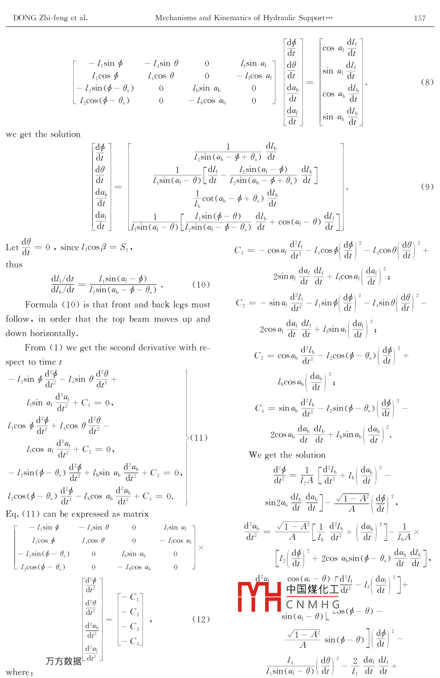 Dec.2001Journal of China University of Mining & TechnologVol 11 No. 2Mechanisms and Kinematics ofHydraulic Support for Top-Coal CavingDONG Zhi-feng(董志峰), WANG Show-feng(王壽峰),CHANG Hong(常宏), wUJian(吳建)2I. Department of Mechanical and Electronic Engineering, CUMT. Beijing, 100083, P. R. China2. Department of Resource Exploitation Engineering, CUMT, Beijing, 100083, P. R. ChinaAbstract: The structure and characteristic of new type of hydraulic support for top-coal caving were discussed. The mechanism and kinematics of the hydraulic support were analyzed. The formulas were deduced to calculate the velocity and acceleration of top beam, shield beam, front and back legs, whichgive the solution to the design and research for hydraulic support.Key words: top-coal caving; hydraul ic support; mechanisms; kinematicsCLC number: TD 355+ 41 Document code: a Article ID: 1006-1266(2001)02-0155-041 Introductiontop beam form the closed roofunlaceIntegrated mechanized top-coal caving is a coal of the front legs inclining forward slightly are conmining method in longwall where the machine and nected with the middle of the top beam. The topequipment such as shearer, conveyors and hydraulicnd hydraulic ends of the back legs are connected with the frontsupports are highly integrated and mining and cav- part of shield beam. The cylinders of the back legsing are carried on concurrently. The great achieve- can not only provide push force to support the roofments in this field of our country are well known in load, but also provide pull force to balance the topthe whole world. However, hydraulic supports, beam. All of bottom ends of the legs are connectedthe most important machines in top-coal caving, arewith the base. The base has a structure like chairIsually heavy in weight, large in scale and compli- back connected with the shield beam. One end ofcated in structure, It is difficult to move them and the shield beam is connected with top beam, and theto assemble or disassemble them. So it is not suitable other end is connected with the rear beam in whichfor coal mine where the geological conditions are not is an opening board. Both rear beam and openingvery good.3. In order to solve this problem, a newboard are driven and controlled by cylindertype of hydraulic support for top-coal caving was de- adjust the caving coal to move. Under the reareloped This hydraulic support is light in weightompact in size, high in load capacit2 Characteristic of the New Support2. 1 Structure of the hydraulic supportThe hydraulic support, as shown in Fig. 1mainly composed of top beam 2. front beam 1中國(guó)煤化工shield beam 5, base 6, rear beam 8, cylinder 7CNMHG hvdraulic supporte top1. Front beam; 2. Top beam: 3. Front legs:4. Back legs; 5. Shiled beam: 6. Base;and front beam which can stretch out and backCylinder; 8. Rear beam: 9. Opening boardReceiveda數(shù)據(jù)-05-08Biography DONG Zhi-feng(1975-) male, from Anhui Province, associate professor156Journal of China University of mining & TechnologyVol. 11 No. 2beam is the back conveyor. Two cylinders drive themovements of the support and the conveyors.2.2 Features and characteristics1) The concurrent stretching out and back ofcan prevent the front coal roof from2) The two planes at different angles on theshield beam make the top-coal move down and becrashed slowly, and prevent the coal and the rockFig 2 Mechanisms of the hydraulic supportfrom being mixed. Therefore, the good quality ofcoal can be minedn(H-d.cos 8-do3)The double function(push and pull) of backleg's cylinders provides a good loading capacity andB=i(H-h,-d cos 0)the position balance of the top beam(2)4)The base and shield beam are hinged directsin d=lsin a-lsinφ+d-h1)ly, which increases the strength of the structure tobear the deviant load and to work with inclinationsin a,=Th-db+l,sin(b-0)]5)There is a large space in back of the chair on In AO,BO,, therethe basemen for conveyer to move caving coal1=√l+B-2l0(-a+B),(3)hich provides a bigger space and a higher heightthan that of other supports for caving coalA,=l(h-dr-d sin 8)2+6) The strucuture of the support provides(l4cos0+l1cos中-S1-S2)2]2,(4)horizontal force to maintain the roof in good condirotanh,-dbtion as the roof moves down gradually.The path equation of C on top beam is7) The support can be moved conveniently because it is light in weight, small in size and compactxc=s+s2+lcos(6)ye=dr+ lsin afIn structure.3. 2 Kinematics analysis8) The low position of caving coal opening deFrom(1)we get the first derivative with respcreases the dust and improves the working environto time tdll, sin gl sin b3 Kinematics of the Hydraulic Supportdo3. 1 Mechanism anal ysislesin aThe main mechanisms of the support is consistsof base, front legs, back legs, top beam and shieldd i lcos bbeam, which can be simplified as a plalcos a dtnism with 5 rods, 6 revolute pairs and 2 sliding(7)dφdlbpairs. The base is frame with Or, O, and O,(Figl2sin(中-.)2)中國(guó)煤化工From Fig. 2, we haveCNMHGL, cos f+ L,cos 0=S+S,+ lcos arl2cos(中-6。)l sing+h+ lsin b= dr+ lisin arl2cos(中-日)-l1cosa=Sll2siy數(shù)據(jù)+h1= L sin ab+dEg (7) can be expressed as matrixDONG Zhi-feng et almechanisms and Kinematics of Hydraulic Supportdldi cos al dtdedl,l1cosφl(shuí), cos 6(8)l2sin(∮-6)0 l,sin adlbl2cos(中-0n)lcos ahdd ewe get the solutiondldtl2sin(a-中+6n)dtdll1sin(ax1-中)dlL, sin (a-o)Ldt L, sin(ab-4+0,)dt(9)dt0)dtLl sin(a-0)LL2sin(ar -.) dt+ cos(a-8dodt=0, since L, cos B=Sd2l-L, d dpsd edl,/dtA,sin(ar-p)sino da dl odlb/dtl2sin(a1-小-n)d2l,Formula (10) is that front and back legs mustlsin yd cfollow, in order that the top beam moves up andown horizontally.2cos anda dl+l sin al\ dtFrom(1) we get the second derivative withdtl2cos(中-B.)d20-lsin 8.5+dhi.cos adCt= sin a dr2-lasin(s-o) dicOSdah dlb2cos adear(11)+C2=0,d2gBasin (s-Ba) dzd2 abdt2+C3=d p-iad2+4/ca/2d 2acos(-B)2中0d2+C=0.SInaiEg (11)can be expressed as matrixd 2a1-A21d2L cos gALl dt2dtl