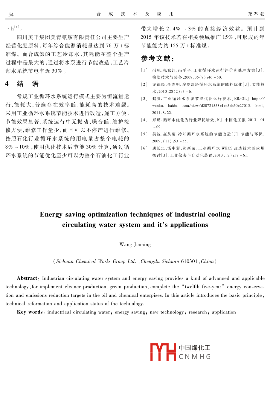 第29卷第4期合成技術(shù)及應用Vol 29 No 42014年12月SYNTHETIC TECHNOLOGY AND APPLICATIONDee.2014設(shè)備改造工業(yè)循環(huán)水系統(tǒng)節(jié)能優(yōu)化技術(shù)及應用汪家銘(川化集團有限責任公司四川成都610301)摘要:工業(yè)循環(huán)水系統(tǒng)節(jié)能優(yōu)化技術(shù)為石油和化工企業(yè)實現(xiàn)清潔生產(chǎn)、綠色生產(chǎn),完成“十二五”節(jié)能減排目標,提供了一種先進適用的新技術(shù)。介紹了該技術(shù)的基本原本原理、技術(shù)改造及應用現(xiàn)狀關(guān)鍵詞:工業(yè)循環(huán)水節(jié)能新技術(shù)研究應用中圖分類號:TQ085.4文獻標識碼:B文章編號:1006-334X(2014)04005203根據(jù)國家有關(guān)規(guī)定,企業(yè)高溫產(chǎn)品、設(shè)備必須用目標工業(yè)循環(huán)水冷卻,循環(huán)水系統(tǒng)以水為介質(zhì)用于工藝該技術(shù)由系統(tǒng)運行能量利用效率分析技術(shù)、系過程的冷(熱)量交換和傳送,在這其中涉及循環(huán)水統(tǒng)經(jīng)濟運行優(yōu)化整改技術(shù)、系統(tǒng)能量監(jiān)測和控制技泵組、管網(wǎng)、換熱裝置、制冷設(shè)備、冷卻塔等全流程,術(shù)及高效節(jié)能產(chǎn)品與制造技術(shù)組成。其主要技術(shù)內(nèi)其主要依靠水泵為動力源來推動循環(huán)水流動。容包括:a)循環(huán)水系統(tǒng)各換熱設(shè)備、管網(wǎng)、泵站的壓據(jù)不同國家工業(yè)統(tǒng)計,水泵的耗電量約占全國發(fā)電力、流量、溫度等運行參數(shù)精確采集技術(shù);b)換熱網(wǎng)量的15%~21%。當前,我國循環(huán)水用量已經(jīng)占到絡(luò)優(yōu)化和管網(wǎng)水力優(yōu)化數(shù)學模型建立;c)對流量工業(yè)用水總量的70%,工業(yè)循環(huán)水系統(tǒng)用泵能耗占管網(wǎng)阻力、水泵運行效率等專家分析診斷及優(yōu)化系到70%以上,運行能耗巨大統(tǒng);d)水力平衡調(diào)節(jié)裝置、高效節(jié)能泵等多種針對循環(huán)水系統(tǒng)在石油化工等領(lǐng)域是必不可少的基性強的系列高效節(jié)能產(chǎn)品本環(huán)節(jié),其以水泵為動力源,電能消耗較大,約占石在工業(yè)冷卻循環(huán)水系統(tǒng)運行過程中,通過水泵化生產(chǎn)過程中總用電量的8%~10%。據(jù)國外統(tǒng)水量和智慧閥門的輸配協(xié)同節(jié)能優(yōu)化控制,將冷卻計,工業(yè)循環(huán)水泵系統(tǒng)運行效率約70%,我國工業(yè)終端的溫度嚴格控制在設(shè)定的區(qū)間內(nèi)。智慧閥門始循環(huán)水泵系統(tǒng)運行效率約為50%,有的不合理的系終處在大開度位置進行實時智能調(diào)節(jié),實現(xiàn)了復雜統(tǒng)運行能量浪費高達40%以上,最少的也有20%左管網(wǎng)的動態(tài)水力和熱力平衡,使系統(tǒng)流量與管網(wǎng)阻右2。目前,我國石化行業(yè)循環(huán)水系統(tǒng)普遍存在能尼極小化。根據(jù)冷卻水溫度的在線檢測,對冷卻塔耗較高的現(xiàn)象,與先進國家相比,水泵效率低5%以的智慧閥門和冷卻風機進行優(yōu)化控制,在自適應滿上,系統(tǒng)效率低20%以上。因此,推廣工業(yè)冷卻循足冷卻塔管網(wǎng)的動態(tài)水力平衡、熱力平衡及高效輸環(huán)水系統(tǒng)節(jié)能優(yōu)化技術(shù)對行業(yè)節(jié)能意義重大。配條件下,使各個冷卻塔的冷卻效果最優(yōu)化。在實1基本原理行上述三項控制的同時,確定水泵組的開機臺數(shù)和變頻的優(yōu)化控制,使水泵輸出功率極小化,機組效率工業(yè)循環(huán)水節(jié)能優(yōu)化技術(shù)根據(jù)流體力學與熱交極大化,從而最大程度節(jié)電。在總結(jié)節(jié)能優(yōu)化運行換原理,分析工業(yè)循環(huán)水系統(tǒng)能量輸配與交換效率,基礎(chǔ)上,可對水泵的規(guī)格特性進行調(diào)整和改造,以達并采用先進節(jié)能控制方法結(jié)合智慧閥門技術(shù)、工業(yè)到水泵機組的能效優(yōu)化配置。同時基于物聯(lián)網(wǎng)智慧變頻技術(shù),對工業(yè)循環(huán)水系統(tǒng)中水泵、閥門與管網(wǎng)、閥門技術(shù)實珋了循環(huán)水系統(tǒng)流程各參數(shù)實時監(jiān)測、終端熱交換器、冷卻塔等單元進行優(yōu)化控制,將循環(huán)系中國煤化工可實現(xiàn)系統(tǒng)運行的遠水冷卻終端的溫度、流量和工藝參數(shù)嚴格控制在設(shè)程CNMHG定的區(qū)間內(nèi),進行循環(huán)水系統(tǒng)流程各參數(shù)實時監(jiān)測收稿日期:2014-11-26系統(tǒng)能效分析與運行優(yōu)化,使復雜管網(wǎng)的動態(tài)水力作者簡介:汪家銘(1949—),男,江蘇蘇州人,工程師,從事化工科和熱力平衡,確保系統(tǒng)流量與管網(wǎng)阻尼極小化,以提技期刊編輯及化工情報信息工作,先后在國內(nèi)各種公開刊物上發(fā)表高工業(yè)循環(huán)水系統(tǒng)整體能效,實現(xiàn)綜合節(jié)能的過化工科技論文260余篇第4期汪家銘.工業(yè)循環(huán)水系統(tǒng)節(jié)能優(yōu)化技術(shù)及應用532技術(shù)改造歐亞賜福集團、LG甬興化學、遼寧化學工業(yè)公司等,正處于大范圍推廣應用階段。工業(yè)冷卻循環(huán)水系統(tǒng)節(jié)能優(yōu)化技術(shù)因其實際應該技術(shù)在鋼鐵、石化、電力、化工、化纖、醫(yī)藥、冶用節(jié)能效果顯著,目前已在全國成功應用于近I000~金、樓宇中央空調(diào)、城鎮(zhèn)區(qū)域供熱、城市供熱等行業(yè)個工業(yè)