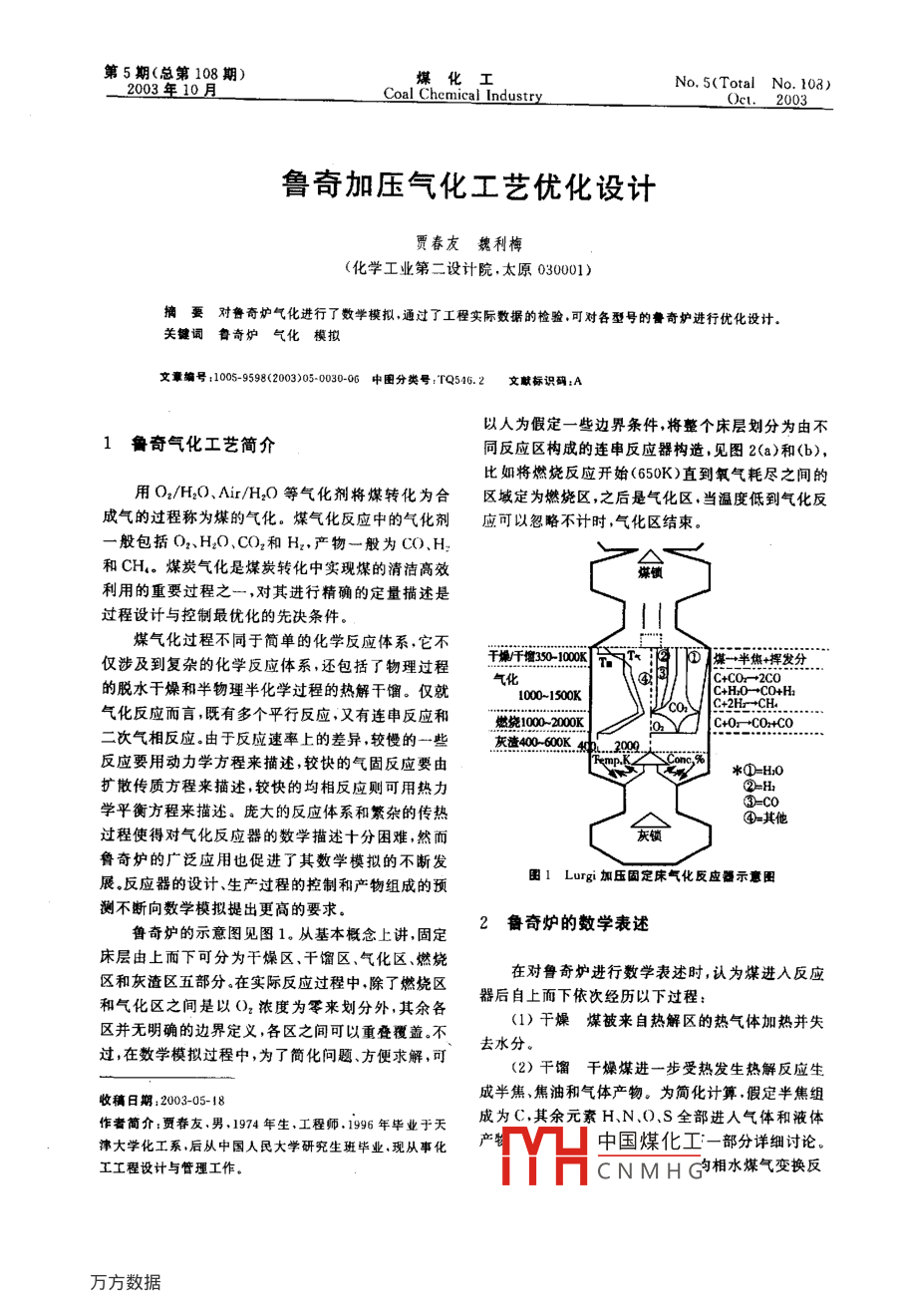 第5期(總第108期)煤化工2003年1No, 5(Total No 103Coal Chemical Industr2003魯奇加壓氣化工藝優(yōu)化設(shè)計(jì)賈春友魏利梅(化學(xué)工業(yè)第二設(shè)計(jì)院,太原03001)摘要對(duì)魯奇爐氣化進(jìn)行了數(shù)學(xué)模擬,通過了工程實(shí)際數(shù)據(jù)的檢驗(yàn)可對(duì)各型號(hào)的魯奇爐進(jìn)行優(yōu)化設(shè)計(jì)關(guān)詞魯奇爐氣化模擬文章編號(hào):1005-9598(2003)050030-06中圖分類號(hào):TQ516.2文獻(xiàn)標(biāo)識(shí)碼:A以人為假定一些邊界條件,將整個(gè)床層劃分為由不1魯奇氣化工藝簡(jiǎn)介同反應(yīng)區(qū)構(gòu)成的連串反應(yīng)器構(gòu)造,見圖2(a)和(b),比如將燃燒反應(yīng)開始(650K)直到氧氣耗盡之間的用O2/H2O、Air/H2O等氣化劑將煤轉(zhuǎn)化為合區(qū)域定為燃燒區(qū),之后是氣化區(qū),當(dāng)溫度低到氣化反成氣的過程稱為煤的氣化。煤氣化反應(yīng)中的氣化劑應(yīng)可以忽略不計(jì)時(shí),氣化區(qū)結(jié)束般包括O2H2O、CO2和H2,產(chǎn)物一般為CO、H和CH4。煤炭氣化是煤炭轉(zhuǎn)化中實(shí)現(xiàn)煤的清潔高效利用的重要過程之一,對(duì)其進(jìn)行精確的定量描述過程設(shè)計(jì)與控制最優(yōu)化的先決條件。煤氣化過程不同于簡(jiǎn)單的化學(xué)反應(yīng)體系,它不僅涉及到復(fù)雜的化學(xué)反應(yīng)體系,還包括了物理過程干燥餾350-100的脫水于燥和半物理半化學(xué)過程的熱解干餾。僅就氣化1000~1500K氣化反應(yīng)而言既有多個(gè)平行反應(yīng),又有連串反應(yīng)和燃燒10002000K次氣相反應(yīng)由于反應(yīng)速率上的差異,較慢的一些灰渣400600K反應(yīng)要用動(dòng)力學(xué)方程來描述,較快的氣固反應(yīng)要由擴(kuò)散傳質(zhì)方程來描述,較快的均相反應(yīng)則可用熱力學(xué)平衡方程來描述。龐大的反應(yīng)體系和繁雜的傳熱④=其他過程使得對(duì)氣化反應(yīng)器的數(shù)學(xué)描述十分困難,然而魯奇爐的廣泛應(yīng)用也促進(jìn)了其數(shù)學(xué)模擬的不斷發(fā)展反應(yīng)器的設(shè)計(jì)、生產(chǎn)過程的控制和產(chǎn)物組成的預(yù)圖1 Lurgi加壓固定床氣化反應(yīng)器示意圖測(cè)不斷向數(shù)學(xué)模擬提出更高的要求魯奇爐的示意圖見圖1。從基本概念上講,固定魯奇爐的數(shù)學(xué)表述床層由上面下可分為干燥區(qū)、干餾區(qū)、氣化區(qū)、燃燒區(qū)和灰渣區(qū)五部分。在實(shí)際反應(yīng)過程中除了燃燒區(qū)在對(duì)魯奇爐進(jìn)行數(shù)學(xué)表述時(shí),認(rèn)為煤進(jìn)入反應(yīng)和氣化區(qū)之間是以O(shè)2濃度為零來劃分外,其余各器后自上而下依次經(jīng)歷以下過程:區(qū)并無明確的邊界定義各區(qū)之間可以重疊覆蓋。不(1)干燥煤被來自熱解區(qū)的熱氣體加熱并失過,在數(shù)學(xué)模擬過程中,為了簡(jiǎn)化問題、方便求解,可去水分。(2)干餾干燥煤進(jìn)一步受熱發(fā)生熱解反應(yīng)生收稿日期:2003-05-18成半焦焦油和氣體產(chǎn)物。為簡(jiǎn)化計(jì)算,假定半焦組作者簡(jiǎn)介:賈春友,男,1974年生,工程師,1996年畢業(yè)于天成為C,其余元素HN、O、S全部進(jìn)入氣體和液體津大學(xué)化工系,后從中國(guó)人民大學(xué)研究生班畢業(yè),現(xiàn)從事化中國(guó)煤化工一部分詳細(xì)討論。工工程設(shè)計(jì)與管理工作CNMHG相水煤氣變換反003年10月賈春友等:魯奇加壓氣化工藝優(yōu)化設(shè)計(jì)31表1化學(xué)反應(yīng)和組分編碼自由區(qū)干燥區(qū)干燥餾區(qū)Ax+02-2-10+2-0020熱氣體干餾區(qū)4 H20氣化區(qū)CC+H2g)→C0+H2氣化區(qū)6 CH半焦D C+2H2-CHaN2(含所有隋性氣2解化性氣體ECO+H2O(g)→CO2+H2CHoN燃燒區(qū)燃燒區(qū)F干餾氣體生成反應(yīng)9 HrS灰區(qū)10半焦渣反應(yīng)氣體千餾焦溜生成反應(yīng)11灰分(a)H于燥過程3水分圖2 Lurgi固定床氣化錫分區(qū)及連串構(gòu)造模型示意圖應(yīng)為這些反應(yīng)的生成物均為重量基準(zhǔn)。在模擬計(jì)算C+HO(g)→CO+H2△H=131.306k]/mol中,所有反應(yīng)的化學(xué)計(jì)量系數(shù)取反應(yīng)方程式右側(cè)(1)為正,左側(cè)為負(fù)C+CO2→2CO△H=172.47kJ/mol…(2)對(duì)氣體組分物料衡算、固體組分物料衡算、氣體C+2H2→CH4△H=-74.84kJ/mol…(3)總能量衡算、固體總能量衡算的表述如下CO+H2O(g)→CO2+HdM△H=-41.16kJ/mol…(4)…………(6)其中前兩個(gè)反應(yīng)為強(qiáng)吸熱反應(yīng),后兩個(gè)反應(yīng)=AU,R+…弱放熱反應(yīng),故氣相自燃燒區(qū)進(jìn)入氣化區(qū)后,在向上流動(dòng)的過程中溫度迅速降低。4)燃燒半焦在燃燒區(qū)氧化生成CO)和dz=A,[-feER, 4H+sQ+Q - QmJ/CpCO2,考慮到燃燒產(chǎn)物的分布,給出如下綜合反應(yīng)式z=A-JsR△H-Q.-Qx-QmJ(Cm…AC+Q2→2(X-1)CO+(2-入)CO△H=-565.98+172.47kJ/mol其中λ介于1~2之間。干燥區(qū)僅涉及煤中水分向氣相的轉(zhuǎn)移,故(5)灰分的熱交換半焦在燃燒區(qū)發(fā)生劇烈的j=4,13。相應(yīng)的衡算方程為:氧化燃燒反應(yīng)后,熾熱的灰分進(jìn)入灰分區(qū),同溫度較az=ARs……(10)低的氣化劑發(fā)生熱交換,一方面對(duì)氣化劑進(jìn)行預(yù)熱;另一方面使灰分的溫度降至適宜排放的溫度。dC=a,Rs.……(11)在對(duì)魯奇爐進(jìn)行數(shù)學(xué)表述時(shí),由于涉及的反應(yīng)反應(yīng)速率R8和R扌之間存在如下關(guān)系:組分、溫度、組成等變量數(shù)目很