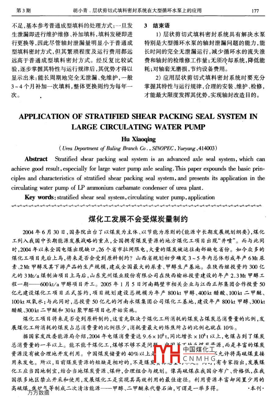大氮肥2005年Large Scale Nitrogenous Ferilizer Industry第28卷第3期層狀剪切式填料密封系統(tǒng)在大型循環(huán)水泵,上的應(yīng)用胡小青(中石化巴陵分公司尿素部,湖南岳陽,414003)摘要。層狀剪切式密封系統(tǒng)是-種技 術(shù)較為先進(jìn)的軸密封系統(tǒng),特別是對(duì)于大型水泵軸密封,能取得良好的效果。文中對(duì)層狀剪切式填料密封系統(tǒng)的基本原理與特點(diǎn)進(jìn)行論述,并介紹其在尿素裝置低壓甲銨冷凝器循環(huán)水泵上的應(yīng)用情況。關(guān)鍵詞層狀剪 切式密封系統(tǒng)循環(huán)水泵 應(yīng)用現(xiàn)行大型循環(huán)水泵考慮到軸封的安裝檢修難在纖維材料之間,而非其與轉(zhuǎn)軸之間,同時(shí)“旋轉(zhuǎn)易程度、可靠性、價(jià)格及循環(huán)水自身特性等因素,層”與“不動(dòng)層”一起構(gòu)成屏障,對(duì)介質(zhì)起到阻擋作幾乎都選用普通成型填料密封作為軸封的方式,用,達(dá)到阻止泄漏的目的。而放棄密封性能好但價(jià)格昂貴、檢修不便的機(jī)械1.2主要特點(diǎn)密封,如此帶來的問題是由于大型水泵的軸徑大,與普通成型填料軸封相比,層狀剪切式密封填料腔的縱橫向尺寸均較大,來自填料壓蓋的壓系統(tǒng)主要具有如下特點(diǎn):緊力很難由柔性的軟填料均勻的向內(nèi)、向外傳遞1)密封效果好。層狀剪切式密封系統(tǒng)的主.到位,因而難以達(dá)到良好的密封效果,循環(huán)水泄漏體為膠泥狀混合物,無固定形狀,在填充填料腔時(shí)嚴(yán)重,-般的填料密封泄漏標(biāo)準(zhǔn)(20~30滴min)較易均勻的分布到腔內(nèi)各處,并在水泵開啟后幾幾乎不可能長時(shí)間得到滿足。分鐘內(nèi),通過“旋轉(zhuǎn)層”的運(yùn)動(dòng)進(jìn)行自動(dòng)調(diào)節(jié)而達(dá)中石化巴陵分公司尿素裝置低壓甲銨冷凝器到均勻分布,使填料腔內(nèi)各處材料均具有效密封循環(huán)水泵(901 J/Js)采用普通成型填料密封方式,能力(普通成型填料的密封能力沿軸向由內(nèi)至外軸封泄漏量在90t/月左右,不僅浪費(fèi)大量的水資是逐步減弱的),因而總體上具有較好的密封性源,同時(shí)也使軸封的維護(hù)維修頻率始終保持較高能,通過合適的調(diào)節(jié),能達(dá)到完全無泄漏。的狀態(tài)。2003 年開始對(duì)填料軸密封進(jìn)行改造,改2)不傷軸套。由于軸旋轉(zhuǎn)時(shí)內(nèi)層纖維材料用層狀剪切式填料密封方式后,使這一狀況大為會(huì)纏繞在軸上,并與軸-起同步旋轉(zhuǎn),二者間無相改觀。對(duì)運(yùn)動(dòng),即無摩擦產(chǎn)生,對(duì)軸套無磨損,或者對(duì)所裝配軸套的表面加工精度要求極低。1層狀剪切式密封系統(tǒng)基本原理與特點(diǎn)3)無須冷卻系統(tǒng)。普通填料由于相對(duì)運(yùn)動(dòng)1.1 基本原理.完全集中在軸套與成型填料內(nèi)側(cè),二者之間壓緊層狀剪切式密封系統(tǒng)的主體為纖維加強(qiáng)合成力大,相互摩擦?xí)a(chǎn)生大量熱量,為防止填料燒材料及多種添加劑的膠泥狀混合物,具有高強(qiáng)度、毀,需要附設(shè)冷卻系統(tǒng)。而層狀剪切式密封系統(tǒng)自潤能力摩擦系數(shù)低、混合物分子間吸引力小的的相對(duì)運(yùn)動(dòng)發(fā)生在“旋轉(zhuǎn)層”“不動(dòng)層”內(nèi)部,徑向特性,在軸旋轉(zhuǎn)過程中,從內(nèi)層開始纖維材料會(huì)纏成梯度遞減方式,并且材料有自潤能力,摩擦系數(shù)繞在軸上,并與軸一起同步旋轉(zhuǎn),形成一個(gè)“ 旋轉(zhuǎn)低,中國煤花節(jié)低,無須加設(shè)冷卻裝層",隨著“旋轉(zhuǎn)層"的直徑逐漸增加,軸對(duì)纖維的置。:TYHCNMHG纏繞能力逐步減弱(這是因?yàn)檩S的扭力是固定的,收稿8期:200- 10-15;收到修改稿日期:2005-03-07。隨著力矩的增加,扭矩逐步減弱的結(jié)果),沒有與作者簡介:胡小青, 1990年畢業(yè)于江蘇化工學(xué)院化工機(jī)械專軸纏繞在-起的部分纖維材料,與填料腔內(nèi)壁保業(yè),工程師,現(xiàn)在中石化巴陵分公司尿素部從事設(shè)備管理工作。持相對(duì)靜冉數(shù)或一個(gè)“不動(dòng)層”,這樣摩擦就發(fā)生已發(fā)表論文多篇。聯(lián)系電話:0730-8536023。176大氮肥2005年第38卷2層狀剪切式密封 系統(tǒng)在循環(huán)水泵.上的應(yīng)用預(yù)先通過專用槍擠壓好的條狀填料,則通過手工2.1循環(huán)水泵 工藝與設(shè)備參數(shù)填塞在內(nèi)外骨架填料環(huán)軸套、泵蓋內(nèi)壁所形成的低壓甲銨冷凝器循環(huán)水泵型號(hào)為CEN300-填料腔中,將填料壓蓋適當(dāng)壓平、壓緊即可。此時(shí)250,單級(jí)離心泵,介質(zhì)為蒸汽冷凝液,密度將專用填料槍接到泵蓋的接口上,按水泵操作規(guī)980kg/m3 ,運(yùn)動(dòng)黏度1000Pa.s, 泵轉(zhuǎn)速88800r/h,定開啟水泵,觀察泵運(yùn)行5~10min后,膠泥狀混葉輪直徑φ 0.320m,軸規(guī)格φ 0.085 m x 0.735m,合物的自動(dòng)調(diào)節(jié)、內(nèi)部剪切層的形成基本結(jié)束,根軸套規(guī)格φ 0.100mx0.115m,成型填料規(guī)格φ據(jù)泄漏情況用填料腔緩慢補(bǔ)加填料,直到完全無0.100m/0.125 mx 0.013m,-次安裝6根,中間加泄漏。層狀剪切式填料的安裝簡圖如圖1。冷卻水環(huán),由泵出口管線上引冷卻水從泵蓋接口2.4安裝 、維護(hù)與維修特點(diǎn)導(dǎo)人填料腔對(duì)填料進(jìn)行冷卻。水泵正常流量層狀剪切式填料密封系統(tǒng)在工作原理與結(ji