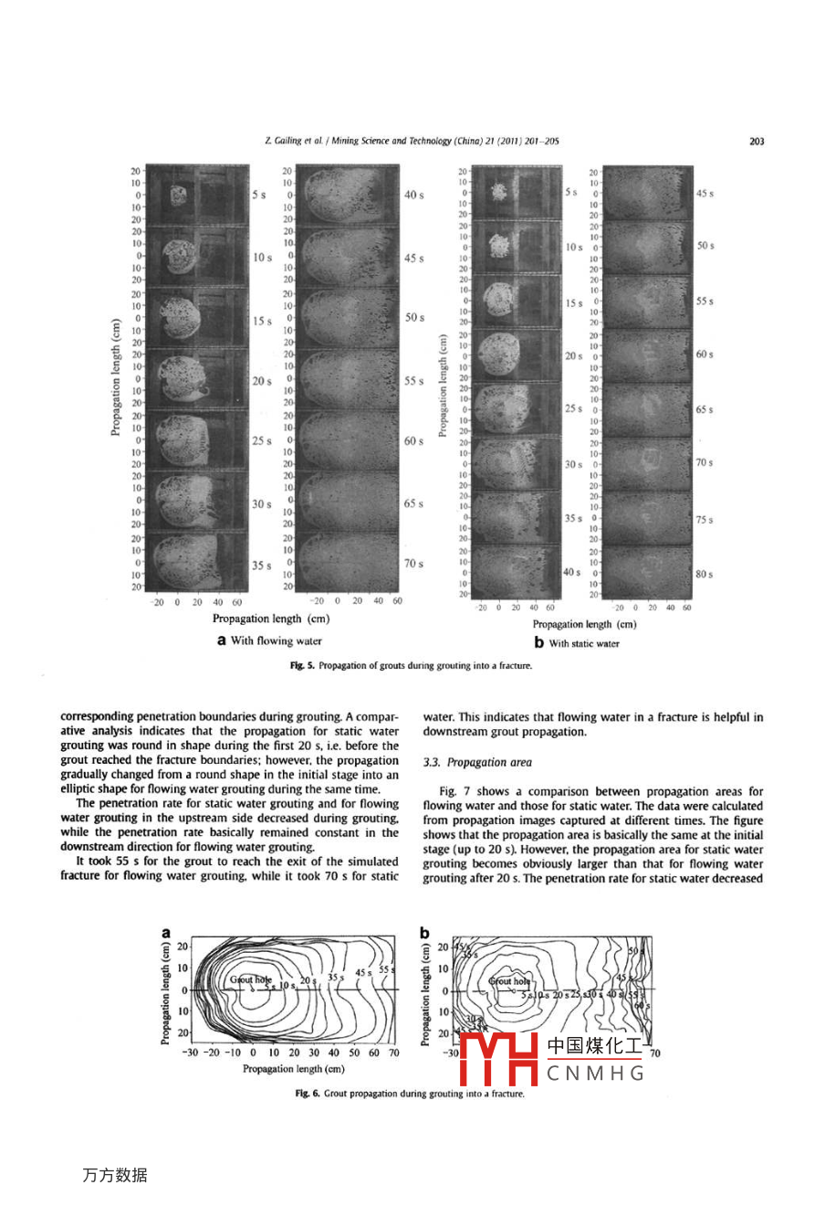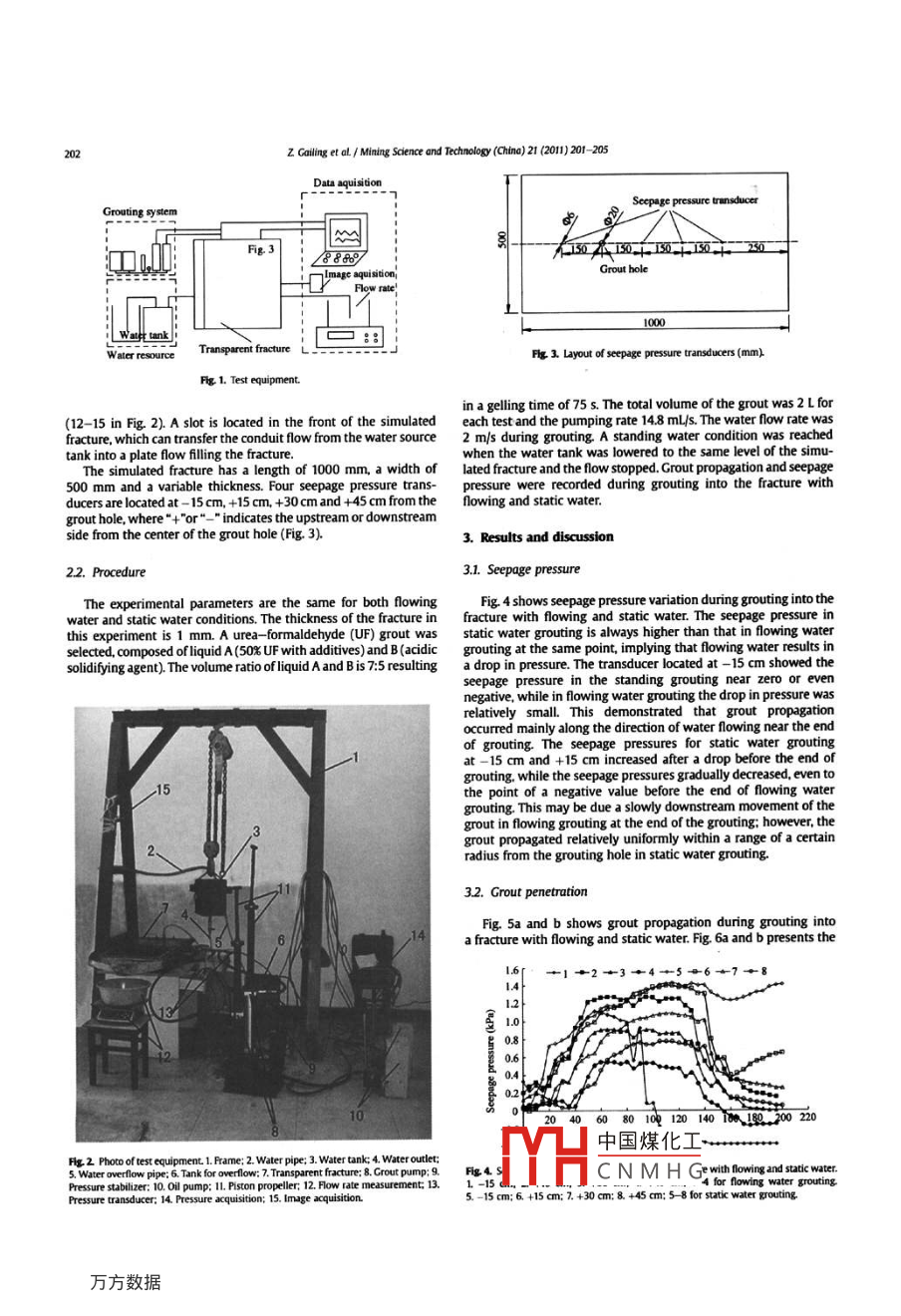 Mining Science and Technology (China) 21 (011)201 -205Contents lists available at ScienceDirectMining Science and Technology (China)ELSEVIERjournal homepage: www. elsevier. com/locate/mstcComparative.experimental investigation of chemical grouting intoa fracture with flowing and static waterZhang Gailinga*, Zhan Kaiyuab, Gao Yue a, Wang Wenxuea"State Key Laberatory of Geomechanics and Deep Underground Eng ineering School of Resources and Ceosciences, China University of Mining 6 Technology. Xuzhou 221008. China"Choneqing Design 5 Research Institute. Sino Coal hermarional Engineering Croup. Chongqing 400016. ChinaARTICLE 1 NFOABSTRACTArticle history:We present a series of experimental tests on chemical grouting into a fracture with flowing and starticReceived 2 August 2010water, using a transparent fracture grouting experimental device. Variations of seepage pressure andReceived in revised formgrout propagation were compared in our investigation. The results show that flowing water results inAcceRealiorober 2010drops of seepage pressure, development of penetration radi in the upstream side and drops of propa-gation area during the same period, compared with grouting in static water. The propagation area instatic water is always round before grouts reach the joint boundaries. However, the propagation shapeKeywords:changes from round to an lliptic shape for grouting into a fracture with flowing water. A theoreticalRock fracturemodel for the grout penetration radius in a fracture considering flowing velocity was developed andChemical groutingvalidated by our experimental results. These results are helpful in improving understanding of fractureFlowing water groutinggrouting mechanism and in guiding engineering practices.Static water groutingCopyright。2011, China University of Mining & Technology. All rights reserved.Scale model test1. Introductionexplosion efect of cement and chemically grouted material of thesurrounding rocks in a tunnel [16],Groundwater hazards in underground coalmines in China haveGrouting in flowing water is a common problem encountered inresulted in thousands of fatalities and threatened mining safety,practice, especially in the treatment of groundwater, sudden inrushsocial stability and sustainable development. Grouting for sealingand seepage control [2.4,17- -21]. However, the effect of flowoff groundwater pathways can mitigate environmental effects andvelocity on grout propagation has not been thoroughly consideredgroundwater resource loss due to long term drainage. Therefore, itin grouting design and implementation. Ren derived a propagationis one of the most widely used groundwater hazard treatmentformula for chemical grout in flowing water [22 His result showsalternatives, including dewatering. constructing bulkheads andthat grout propagation is a series of columns with increasing radigrouting|1-5].and moving the center of the circles downstream. However, thisMany researchers have studied grouting theory for fssured rockmass. For instance, Hao et aL and Yang et al developed a theoreticalorder to identify the mechanism and to establish a grouting modelmodel to simulate grout propagation in fractured networks based onfor fracture grouting with flowing water, it is important to inves-the Monte-Carlo approach[6- -8].Liet al. derived a grout propagationtigate comparatively the propagation and seepage pressure varia-formula for grouting into an lliptic fssure [9]. Yang et al experi-tions during grouting into fractures with flowing and static water.mentally studied the factors affecting cement-based grout propa-We present a comparative study on fracture grouting under thegation both in a single fracture and a fracture network [10] Funehagconditions of both flowing and static water, using scaled modelet al. developed a new method for calculating the penetration lengthtests and theoretical analysis.and radius for fracture grouting with silica sol and validated themethod by experiments and in-situ measurements [11-13]. Gothall2. Experimentalet al. investigated fracture dilation and fracture- fracture interactionduring grouting [14,15]. Zhu et al. experimentally studied the anti-2.1. EquipmentFigs. 1 and 2 show the experimental equipment, which includesE-mail address: gailing-zhang0cumtedu.cn (億Calilingh(8-11中國(guó)煤化工2), a grouting system: data acquisition system1674-52641S - see fron matter Copyright。2011 China Universiy of Mining 8 Technology. ATYHCNMHGdol10.1016/j.mstc.201102 021202z Glling et al/ Mining Scene and Tchnolo (Chino)21 (011)201 -205Dat aquistionSeepage pressure transducerGrouing ystem雖--F83| 887Grout hole一nImagc squisiton;Flow rate'10000Water resoureTransparent fracturem3. Layout of sepage pessre transducers (mm)電1. Test equipmentin a gllig time of 75 s. The total volume of the grout was2L for(12- -15 in Fig. 2). A slot is located in the front of the simulated each test and the pumping rate 14.8 mL/s. The water flow rate wasfracture, which can transfer the conduit flow from the water source2 m/s during grouting. A standing water condition was reachedtank into a plate flow fling the fracture.When the water tank was iowered to the same level of the simu-when the water tank was lowered tothe sametevetorunesmusThe simulated fracture has a length of 1000 mm, a width of lated fracture and the flow stopped. Grout propagation and seepage500 mm and a variable thickness. Four seepage pressure trans- pressure were recorded during grouting into the fracture withducers are located at -15 cm, +15 cm, +30cm and +45 cm fromthe flowing and static water.grout hole, where "+"or"- " indicates the upstream or downstreamside from the center of the grout hole (Fig. 3).3. Results and discussion22. Procedure3.1. Seepage pressureThe experimental parameters are the same for both flowingFig. 4 shows seepage pressure variation during grouting into thewater and static water conditions. The thickness of the fracture in fracture with flowing and static water. The seep
