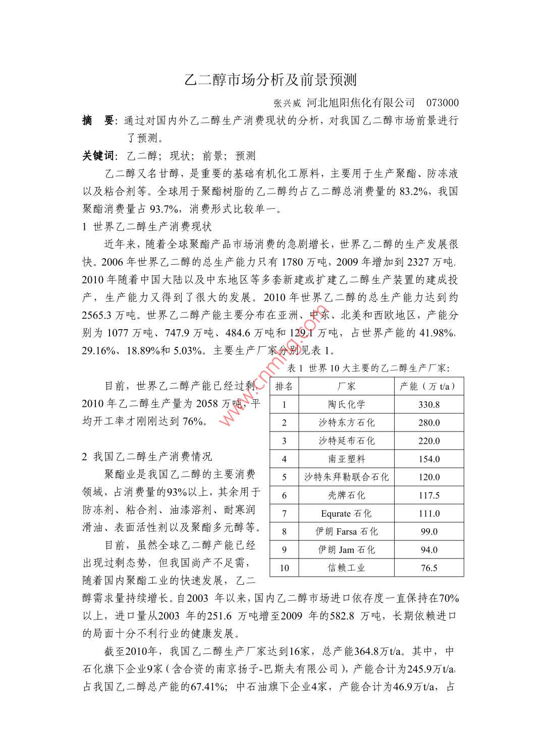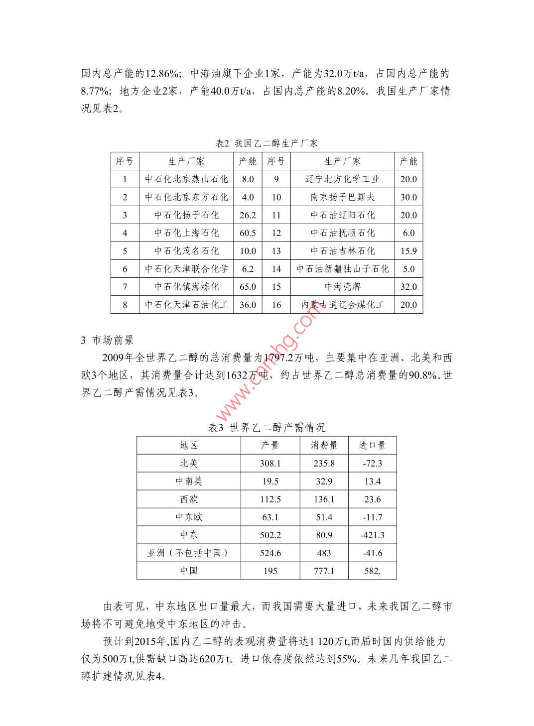 乙二醇市場分析及前景預(yù)測張興威河北旭陽焦化有限公司073000摘要:通過對國內(nèi)外乙二醇生產(chǎn)消費現(xiàn)狀的分析,對我國乙二醇市場前景進行了預(yù)測。關(guān)鍵詞:乙二醇;現(xiàn)狀;前景;預(yù)測乙二醇又名甘醇,是重要的基礎(chǔ)有機化工原料,主要用于生產(chǎn)聚酯、防凍液以及粘合劑等。全球用于聚酯樹脂的乙二醇約占乙二醇總消費量的83.2%,我國聚酯消費量占93.7%,消費形式比較單1世界乙二醇生產(chǎn)消費現(xiàn)狀近年來,隨著全球聚酯產(chǎn)品市場消費的急劇增長,世界乙二醇的生產(chǎn)發(fā)展很快。2006年世界乙二醇的總生產(chǎn)能力只有1780萬噸,2009年增加到2327萬噸2010年隨著中國大陸以及中東地區(qū)等多套新建或擴建乙二醇生產(chǎn)裝置的建成投,生產(chǎn)能力又得到了很大的發(fā)展。2010年世界乙二醇的總生產(chǎn)能力達到約2565.3萬噸。世界乙二醇產(chǎn)能主要分布在亞洲、中東、北美和西歐地區(qū),產(chǎn)能分別為1077萬噸、747,9萬噸、484.6萬噸和129,1萬噸,占世界產(chǎn)能的41.98%2916%、18.89%和5.03%。主要生產(chǎn)廠家分別見表1。表1世界10大主要的乙二醇生產(chǎn)廠家目前,世界乙二醇產(chǎn)能已經(jīng)過剩,排名廠家產(chǎn)能(萬ta)200年乙二醇生產(chǎn)量為2058萬噸,平1陶氏化學(xué)330.8均開工率才剛剛達到76%。沙特東方石化280.0234沙特延布石化220.02我國乙二醇生產(chǎn)消費情況南亞塑料154.0酯業(yè)是我國乙二醇的主要消費「5沙特朱拜勒聯(lián)合石化|1200領(lǐng)域,占消費量的93%以上,其余用于6殼牌石化117.5防凍劑、粘合劑、油漆溶劑、耐寒潤Equate石化l11.0滑油、表面活性劑以及聚酯多元醇等。伊朗 Farsa石化99.0目前,雖然全球乙二醇產(chǎn)能已經(jīng)。伊朗加m石化94.0出現(xiàn)過剩態(tài)勢,但我國尚產(chǎn)不足需10信賴工業(yè)76.5隨著國內(nèi)聚酯工業(yè)的快速發(fā)展,乙二醇需求量持續(xù)增長。自2003年以來,國內(nèi)乙二醇市場進口依存度一直保持在70%以上,進口量從2003年的251.6萬噸增至2009年的5828萬噸,長期依賴進口的局面十分不利行業(yè)的健康發(fā)展截至2010年,我國乙二醇生產(chǎn)廠家達到16家,總產(chǎn)能3648萬ta。其中,中石化旗下企業(yè)9家(含合資的南京揚子-巴斯夫有限公司),產(chǎn)能合計為2459萬ta占我國乙二醇總產(chǎn)能的6741%;中石油旗下企業(yè)4家,產(chǎn)能合計為469萬ta,占國內(nèi)總產(chǎn)能的1286%;中海油旗下企業(yè)1家,產(chǎn)能為32.0萬ta,占國內(nèi)總產(chǎn)能的8.77%;地方企業(yè)2家,產(chǎn)能40.0萬ta,占國內(nèi)總產(chǎn)能的820%。我國生產(chǎn)廠家情況見表2表2我國乙二醇生產(chǎn)廠家序號生產(chǎn)廠家產(chǎn)能序號生產(chǎn)廠家1中石化北京燕山石化8.09遼寧北方化學(xué)工業(yè)2002中石化北京東方石化4010南京揚子巴斯夫30.03中石化揚子石化26211中石油遼陽石化20.0中石化上海石化60.512中石油撫順石化6.0中石化茂名石化10.013中石油吉林石化1596中石化天津聯(lián)合化學(xué)6,214中石油新疆獨山子石化50中石化鎮(zhèn)海煉化65015中海殼牌32.08中石化天津石油化工36016內(nèi)蒙古通遼金煤化工2003市場前景2009年全世界乙二醇的總消費量為1797.2萬噸,主要集中在亞洲、北美和西歐3個地區(qū),其消費量合計達到1632萬噸,約占世界乙二醇總消費量的90,8%。世界乙二醇產(chǎn)需情況見表3。表3世界乙二醇產(chǎn)需情況地區(qū)產(chǎn)量消費量進口量北美308.1235.8中南美19.532.913.4西歐112.5136.1中東歐63.1中東502.2-421.3亞洲(不包括中國)524.648341.6中國195777.1582由表可見,中東地區(qū)出口量最大,而我國需要大量進口,未來我國乙二醇市場將不可避免地受中東地區(qū)的沖擊預(yù)計到2015年,國內(nèi)乙二醇的表觀消費量將達1120萬t,而屆時國內(nèi)供給能力僅為500萬t供需缺口高達620萬t。進口依存度依然達到55%。未來幾年我國乙二醇擴建情況見表4表4我囯乙二醇擴建情況序號廠家產(chǎn)能備注中石油成都乙烯38She工藝,預(yù)計2011年投產(chǎn)安徽宿州豐原生物化學(xué)公司18SD工藝中石化武漢乙烯預(yù)計2011年投產(chǎn)吉林博大生化有限公司生物法制乙醇、乙二醇杜邦能源化工公司期5萬噸,二期15萬噸河陽酒精實業(yè)有限公司一期8萬噸2011投產(chǎn)河南洛陽孟津縣7河南永金化工與通遼金煤化工20河南商丘永城市結(jié)語1)雖然世界乙二醇產(chǎn)能已經(jīng)過剩,但由于區(qū)域不平衡性,我國乙二醇尚處于嚴(yán)重產(chǎn)不足需的狀況,并且短時期內(nèi)不會改變,因此,乙二醇項目具有非常好的發(fā)展前景。2)但同時我們也要清晰地看到,我國乙二醇將受到世界的沖擊,尤其是具有低成本優(yōu)勢的中東地區(qū)的沖擊,我國乙二醇市場也將面臨很大挑戰(zhàn)