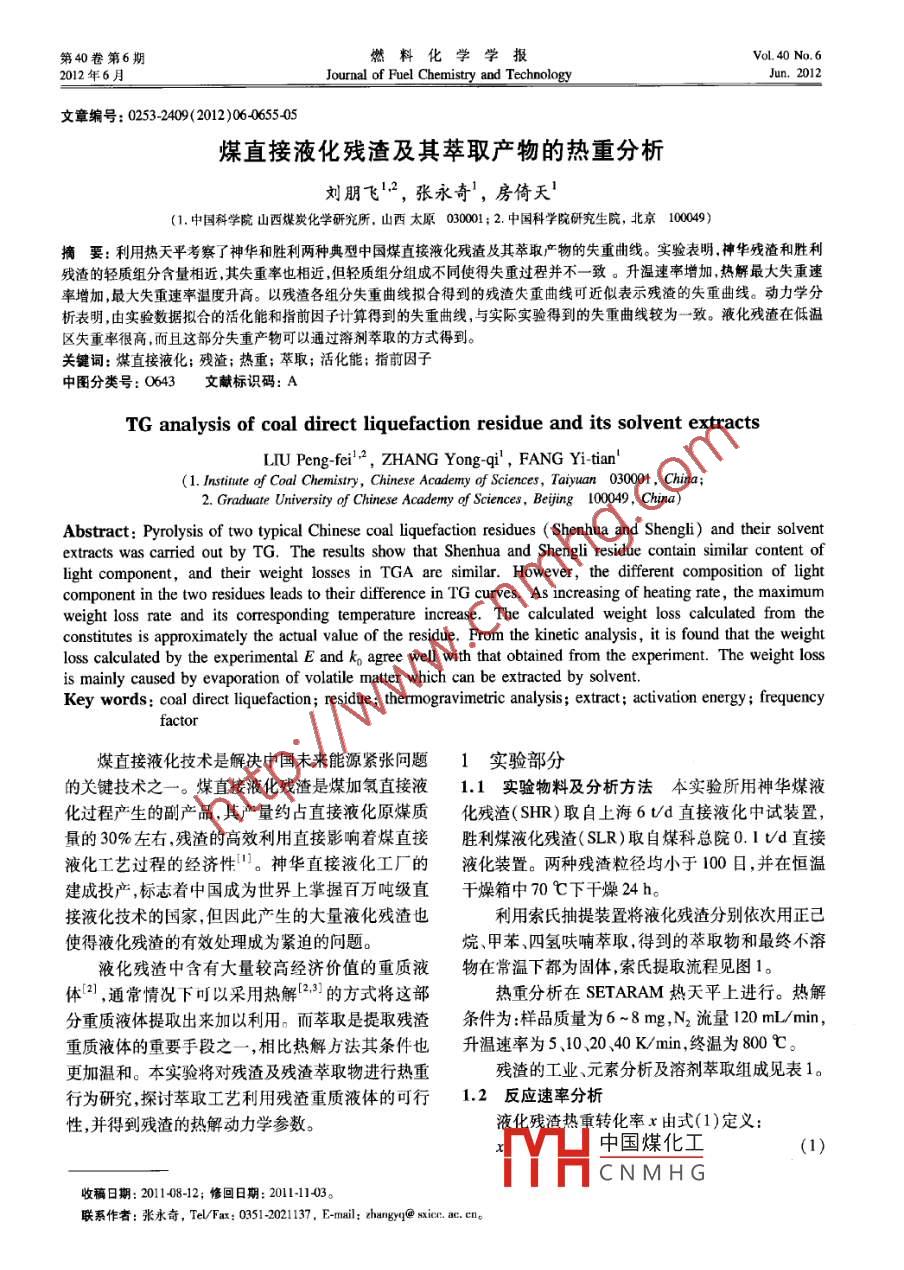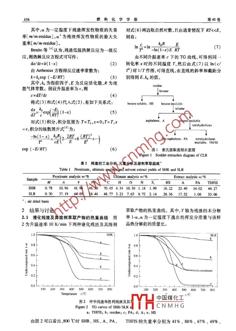 第40卷第6期燃料化學(xué)學(xué)報(bào)Vol 40 No 6ournal of Fuel Chemistry and TechnologyJun,2012文章編號(hào):0253-2409(2012)060655405煤直接液化殘?jiān)捌漭腿‘a(chǎn)物的熱重分析劉朋飛12,張永奇,房倚天(1.中國科學(xué)院山西煤炭化學(xué)研究所,山西太原03001;2.中國科學(xué)院研究生院,北京10009)摘要:利用熱天平考察了神華和勝利兩種典型中國煤直接液化殘?jiān)捌漭腿‘a(chǎn)物的失重曲線。實(shí)驗(yàn)表明神華殘?jiān)蛣倮麣堅(jiān)妮p質(zhì)組分含量相近其失重率也相近但輕質(zhì)組分組成不同使得失重過程并不一致。升溫速率增加熱解最大失重速率增加,最大失重速率溫度升高。以殘?jiān)鹘M分失重曲線擬合得到的殘?jiān)е厍€可近似表示殘?jiān)氖е厍€。動(dòng)力學(xué)分析表明,由實(shí)驗(yàn)數(shù)據(jù)擬合的活化能和指前因子計(jì)算得到的失重曲線,與實(shí)際實(shí)驗(yàn)得到的失重曲線較為一致。液化殘?jiān)诘蜏貐^(qū)失重率很高,而且這部分失重產(chǎn)物可以通過溶劑萃取的方式得到。關(guān)鍵詞:煤直接液化;殘?jiān)?熱重;萃取;活化能;指前因子中圖分類號(hào):0643文獻(xiàn)標(biāo)識(shí)碼:ATG analysis of coal direct liquefaction residue and its solvent extractsLIU Peng-fei, ZHANG Yong-qi, FANG Yi-tian(1. Institute of Coal Chemistry, Chinese Academy of Sciences, Taiyuan 030001, China;2. Graduate University of Chinese Academy of Sciences, Bejing 100049, China)Abstract: Pyrolysis of two typical Chinese coal liquefaction residues( Shenhua and Shengli)and their solventextracts was carried out by TG. The results show that Shenhua and Shengli residue contain similar content oflight component, and their weight losses in TGA are similar. However, the different composition of lightcomponent in the two residues leads to their difference in TG curves. As increasing of heating rate, the maximumweight loss rate and its corresponding temperature increase. The calculated weight loss calculated from theconstitutes is approximately the actual value of the residue. From the kinetic analysis, it is found that the weightloss calculated by the experimental E and k, agree well with that obtained from the experiment. The weight lossis mainly caused by evaporation of volatile matter which can be extracted by solventKey words: coal direct liquefaction; residue; thermogravimetric analysis; extract; activation energy; frequency煤直接液化技術(shù)是解決中國未來能源緊張問題1實(shí)驗(yàn)部分的關(guān)鍵技術(shù)之一。煤直接液化殘?jiān)敲杭託渲苯右?.1實(shí)驗(yàn)物料及分析方法本實(shí)驗(yàn)所用神華煤液化過程產(chǎn)生的副產(chǎn)品,其產(chǎn)量約占直接液化原煤質(zhì)化殘?jiān)?SHR)取自上海6t/d直接液化中試裝置量的30%左右,殘?jiān)母咝Ю弥苯佑绊懼褐苯觿倮阂夯瘹堅(jiān)?SLR)取自煤科總院0.ItUd直接液化工藝過程的經(jīng)濟(jì)性。神華直接液化工廠的液化裝置。兩種殘?jiān)骄∮?00目,并在恒溫建成投產(chǎn),標(biāo)志著中國成為世界上掌握百萬噸級直干燥箱中70℃下干燥24h。接液化技術(shù)的國家,但因此產(chǎn)生的大量液化殘?jiān)怖盟魇铣樘嵫b置將液化殘?jiān)謩e依次用正己使得液化殘?jiān)挠行幚沓蔀榫o迫的問題。烷、甲苯、四氫呋喃萃取,得到的萃取物和最終不溶液化殘?jiān)泻写罅枯^高經(jīng)濟(jì)價(jià)值的重質(zhì)液物在常溫下都為固體索氏提取流程見圖體(2),通常情況下可以采用熱解23的方式將這部熱重分析在 SETARAM熱天平上進(jìn)行。熱解分重質(zhì)液體提取出來加以利用。而萃取是提取殘?jiān)鼦l件為樣品質(zhì)量為6~8mg,N2流量120mL/min重質(zhì)液體的重要手段之一,相比熱解方法其條件也升溫速率為5、10、20、40K/min,終溫為80℃。更加溫和。本實(shí)驗(yàn)將對殘?jiān)皻堅(jiān)腿∥镞M(jìn)行熱重殘?jiān)墓I(yè)、元素分析及溶劑萃取組成見表1。行為研究探討萃取工藝?yán)脷堅(jiān)刭|(zhì)液體的可行1.2反應(yīng)速率分析性,并得到殘?jiān)臒峤鈩?dòng)力學(xué)參數(shù)。E熱重轉(zhuǎn)化率x由式(1)定義中國煤化工CNMHG收稿日期:201140812;修回日期:201114聯(lián)系作者:張永奇,Tel/Fax:0351-2021137,E-mal:zhangye@sice.ac.cn。燃料化學(xué)學(xué)報(bào)第40卷其中,α為一定溫度下殘?jiān)鼡]發(fā)性物質(zhì)的失重對式(6)兩邊取自然對數(shù),且由通常情況下RT