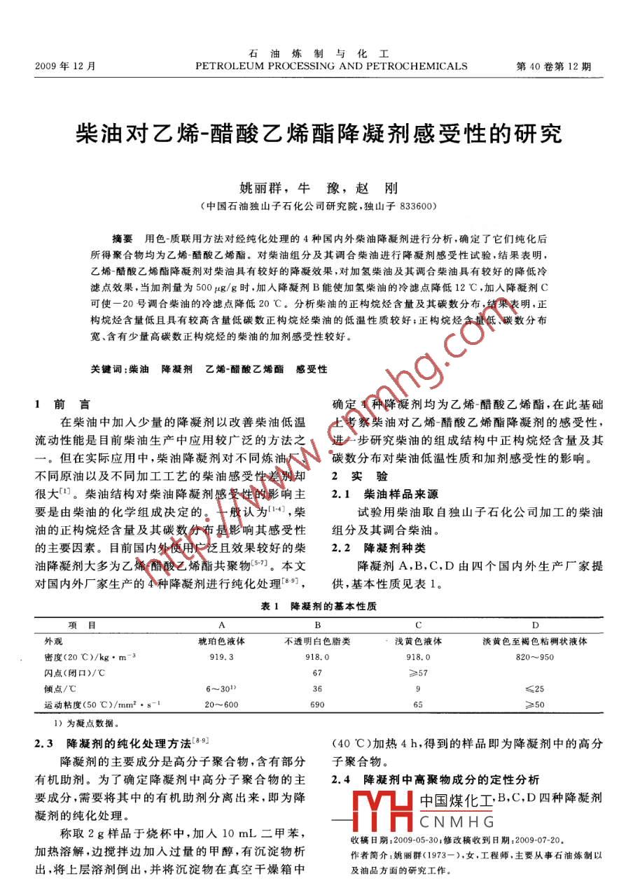 柴油對乙烯-醋酸乙烯酯降凝劑感受性的研究