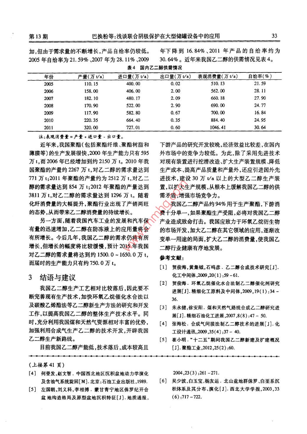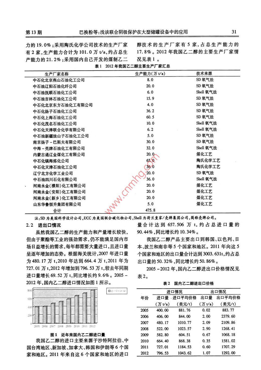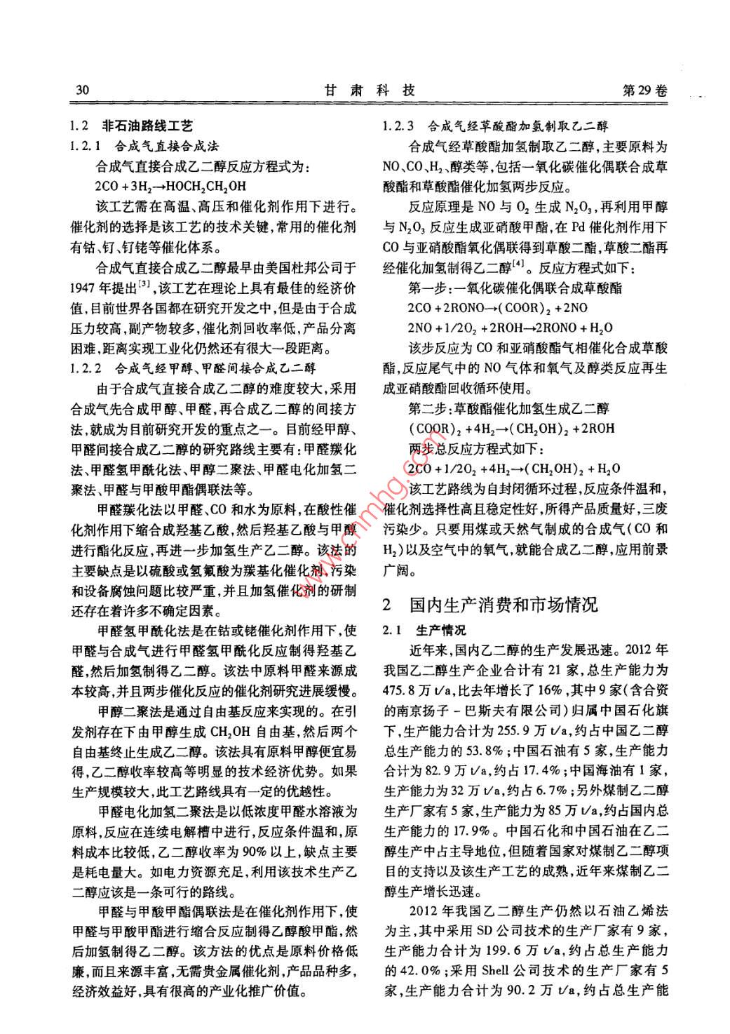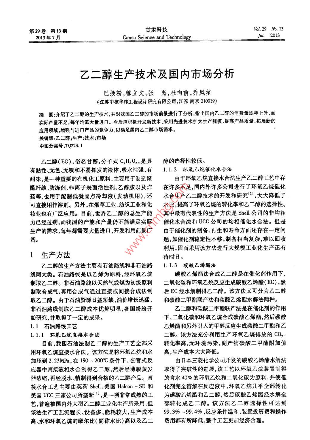 第29卷第13期甘肅科技vol 29 No. 132013年7月Gansu Science and TechnologJ.2013乙二醇生產(chǎn)技術(shù)及國(guó)內(nèi)市場(chǎng)分析巴換粉,穆立文,張崗,杜向前,喬鳳笙(江蘇中核華緯工程設(shè)計(jì)研究有限公司,江蘇南京210019)摘要:介紹了乙二醇的生產(chǎn)技術(shù),并對(duì)我國(guó)乙二醇的市場(chǎng)前景進(jìn)行了分析指出國(guó)內(nèi)乙二醇的消費(fèi)量逐年上升,而實(shí)際產(chǎn)量不足,每年均需大量進(jìn)口。今后應(yīng)積極開(kāi)發(fā)新技術(shù),采用先進(jìn)技術(shù)擴(kuò)大生產(chǎn)規(guī)模,提高產(chǎn)品質(zhì)量拓展新的應(yīng)用領(lǐng)域增強(qiáng)與進(jìn)口產(chǎn)品的競(jìng)爭(zhēng)力以滿(mǎn)足國(guó)內(nèi)乙二醇市場(chǎng)需求。關(guān)鍵詞:乙二醇;生產(chǎn);技術(shù);市場(chǎng)中圖分類(lèi)號(hào):TQ223.1乙二醇(EG),俗名甘醇,分子式C2HO2,是具醇的選擇性較低。有黏性、無(wú)色、無(wú)嗅和不易揮發(fā)的液體吸水性強(qiáng),有1.1.2環(huán)氧乙烷催化水合法甜味是一種重要的有機(jī)化工原料,主要用于制造聚由于環(huán)氧乙烷直接水合法生產(chǎn)乙二醇工藝中存酯纖維、防凍劑、非離子表面活性劑、乙醇胺以及炸在許多不足,國(guó)內(nèi)外許多公司進(jìn)行了環(huán)氧乙烷催化藥等,也用于配制低凝固點(diǎn)冷卻液(發(fā)動(dòng)機(jī)用),還水合生產(chǎn)乙二醇技術(shù)的開(kāi)發(fā)和研究),大大降低了可直接用作溶劑。另外,在煙草工業(yè)、紡織工業(yè)和化水比,提高了環(huán)氧乙烷的轉(zhuǎn)化率和乙二醇的選擇性。妝業(yè)也有廣泛應(yīng)用。目前,世界乙二醇的總生產(chǎn)能其中最有代表性的生產(chǎn)方法是Shel公司的非均相力已經(jīng)過(guò)剩,而我國(guó)的產(chǎn)能和產(chǎn)量仍不能滿(mǎn)足實(shí)際催化水合法和UCC公司的均相催化水合法。但是生產(chǎn)的需求,每年都需要大量進(jìn)口,開(kāi)發(fā)利用前景廣由于催化劑的制備、再生和壽命方面還存在一定問(wèn)闊題,如催化劑穩(wěn)定性不夠制備相當(dāng)復(fù)雜,難以回收利用,因而采用該方法進(jìn)行大規(guī)模工業(yè)化生產(chǎn)還有生產(chǎn)方法待時(shí)日。乙二醇的生產(chǎn)方法主要有石油路線(xiàn)和非石油路1.1.3碳酸乙烯酯法線(xiàn)兩大類(lèi)。石油路線(xiàn)是以乙烯為原料,經(jīng)環(huán)氧乙烷碳酸乙烯酯法合成乙二醇是在催化劑作用下制取乙二醇。非石油路線(xiàn)以天然氣或煤為初級(jí)原料二氧化碳和環(huán)氧乙烷反應(yīng)生成碳酸乙烯酯(EC),然制取合成氣,再用合成氣通過(guò)直接或間接合成法制后EC經(jīng)水解制得乙二醇。該方法又可分為乙二醇取乙二醇。由于石油資源日益短缺油價(jià)增長(zhǎng)迅猛,和碳酸二甲酯聯(lián)產(chǎn)法和碳酸乙烯酯水解法兩種。非石油路線(xiàn)制取乙二醇成本優(yōu)勢(shì)明顯,各國(guó)紛紛開(kāi)乙二醇和碳酸二甲酯聯(lián)產(chǎn)法是在催化劑的作用始研究,并取得了一定的成果。下,二氧化碳和環(huán)氧乙烷合成碳酸乙烯酯然后碳酸1.1石油路線(xiàn)工藝乙烯酯和另外引入的甲醇反應(yīng)生成碳酸二甲酯和乙1.1.1環(huán)氧乙烷直接水合法二醇。該方法充分利用生產(chǎn)環(huán)氧乙烷排放的CO2,目前,我國(guó)石油法制乙二醇的生產(chǎn)工藝全部采轉(zhuǎn)化率高,無(wú)環(huán)境污染,副產(chǎn)物碳酸二甲酯附加值用環(huán)氧乙烷直接水合法。該方法是將環(huán)氧乙烷和水高,生產(chǎn)成本大大降低。加壓到223MPa,在190~200℃條件下,在管式反由日本三菱化學(xué)公司開(kāi)發(fā)的碳酸乙烯酯水解法應(yīng)器中直接液相水合制得乙二醇,然后經(jīng)薄膜蒸發(fā)取得了突破性的進(jìn)展,該工藝以環(huán)氧乙烷裝置制得器濃縮,再經(jīng)脫水、精制得到合格的乙二醇產(chǎn)品。直的含水40%的環(huán)氧乙烷和二氧化碳為原料,并使催接水合工藝主要由英荷 Shell美國(guó)Hlon-SD和化劑完全溶解在反應(yīng)液中,環(huán)氧乙烷幾乎全部轉(zhuǎn)化美國(guó)UCC三家公司所壟斷,是一項(xiàng)非常成熟的工為碳酸乙烯酯和乙二醇然后碳酸乙烯酯經(jīng)水解全藝,普遍被國(guó)內(nèi)外大型乙二醇工業(yè)化生產(chǎn)所釆用,但部轉(zhuǎn)化成乙二醇。該方法乙二醇選擇性可達(dá)到該法生產(chǎn)工藝流程長(zhǎng)、設(shè)備多、能耗較大,生產(chǎn)成本99.3%-9.4%,反應(yīng)條件溫和裝置投資費(fèi)和操作高、水和環(huán)氧乙烷的摩爾比(簡(jiǎn)稱(chēng)水比)高以及乙二費(fèi)用都有所降低,整個(gè)工藝更加經(jīng)濟(jì)合理。甘肅科技第29卷1.2非石油路線(xiàn)工藝1.2.3合成氣經(jīng)草酸酯加氫制取乙二醇1.2.1合成氣直接合成法合成氣經(jīng)草酸酯加氫制取乙二醇,主要原料為合成氣直接合成乙二醇反應(yīng)方程式為:NO、CO、H2、醇類(lèi)等,包括一氧化碳催化偶聯(lián)合成草2C0+3H2→HOCH2CH,OH酸酯和草酸酯催化加氫兩步反應(yīng)。該工藝需在高溫、高壓和催化劑作用下進(jìn)行。反應(yīng)原理是NO與O2生成N2O3,再利用甲醇催化劑的選擇是該工藝的技術(shù)關(guān)鍵,常用的催化劑與N2O3反應(yīng)生成亞硝酸甲酯在Pd催化劑作用下有鈷釕、釕銠等催化體系。CO與亞硝酸酯氧化偶聯(lián)得到草酸二酯,草酸二酯再合成氣直接合成乙二醇最早由美國