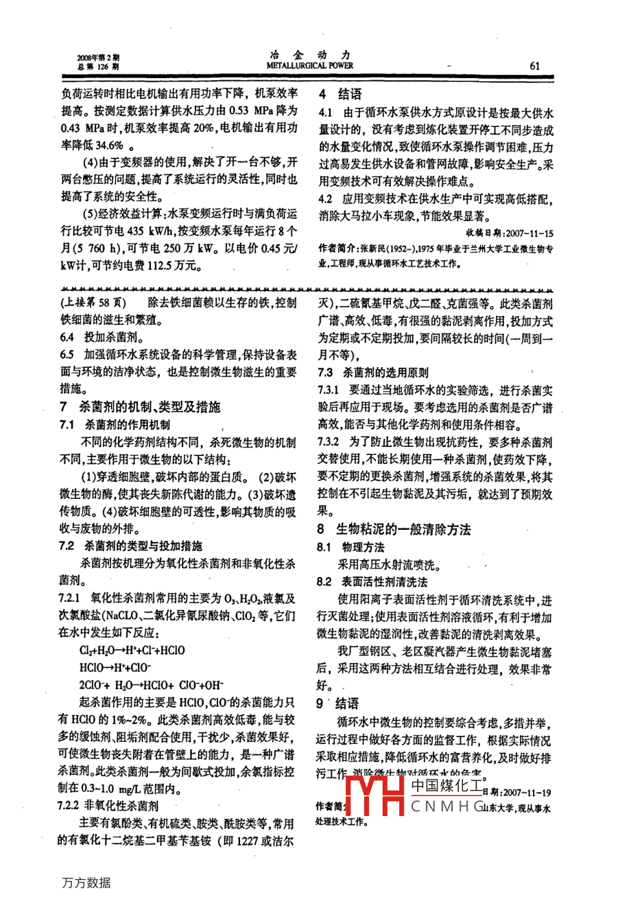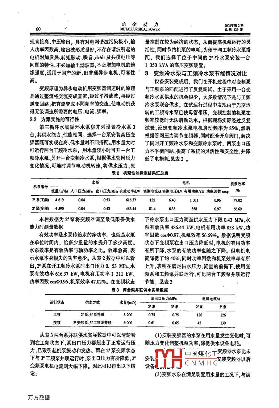 2008年第2期冶金動力總第126期METALLURGICAL POWER高壓變頻器在循環(huán)水泵上的應用張新民(蘭州石化公司動力廠供水部甘肅蘭州70060【摘要】通過分析循環(huán)水泵實際運行狀況提出了采用高壓變頻器對循環(huán)水泵進行變頻調速控制以滿足生產實際需求并對其節(jié)能效果和由此獲得的經濟效益進行了分析?!娟P鍵詞】循環(huán)水泵變頻調速供水壓力【中圖分類號】TH3【文獻標識碼】B【文章編號】1006764(2008)02-005903Application of High Voltage Frequency Converter in CirculationWater PumpZHANG Xin-minWAer Supply Department, Power Hant, Lahou Chemistry Company, Lanzhou, Ganu 730060, China)(Abstract)Actual operation status of circulation water pump was analyzed. A high volt-age frequency converter should be used to carry out frequency control so as to meet theneeds of production. The energy saving effects and economic benefits were analyzed.Key words]circulation water pump; frequency control; water supply pressure1循環(huán)水泵運行概況工裝置少時開兩臺工頻泵運行時壓力過高出口閥蘭州石化公司動力廠第三循環(huán)水場設計供水能門處于半開狀態(tài)時裝置能耗居高不下,導致冷水泵力為7500mh擔負著7套煉化裝置循環(huán)冷卻水的憋壓甚至引起機泵振動和發(fā)熱,使供水能耗升高同供應。流程是從煉化裝置返回的壓力回水經DN900時容易使供水設備損壞。究其原因是三臺冷水泵性線回到循環(huán)水場,沿冷卻塔DN800上水立管上塔,能相同供水能力相等見表1在用水量小時沒有調經過配水和淋水裝置進行通風冷卻冷卻后的水匯節(jié)手段。在生產用水量不是很大的時候開一臺冷水入塔下集水池再通過聯(lián)通管流入冷水池循環(huán)水泵泵水壓偏低不能滿足生產要求,開兩臺冷水泵又造房設置冷水泵三臺。冷水泵從冷水池吸取冷水后加成“大馬拉小車”現(xiàn)象。因此為了適應煉化生產的變壓外供,沿DN∞00管線雙路進入循環(huán)水管網供生化,降低供水系統(tǒng)能耗,改變供水系統(tǒng)的被動局面產裝置冷卻使用。按照生產要求供水壓力一般保持采用高壓變頻器根據水壓變化控制循環(huán)水泵轉速以在0407MPa之間但在實際運行中發(fā)現(xiàn),由于各達到經濟合理運行的目的。煉化裝置開停工時間不一致,造成循環(huán)冷卻水供水第三循環(huán)水場裝置主要設備為雙吸式離心泵。壓力忽高忽低用水量大時冷水泵效率較高,而在開衰1設備性能參數(shù)機泵性能電機性能水泵編號流量(mb)揚程/功率/W電流A電壓N轉數(shù)rmin)Y630614328SA-10CY630628SA-10C3750Y6306中國煤化工2循環(huán)水泵變頻器的選用和方案的可行性了美CNMHG產品該公司生21變頻器的選用產的完美無增飯殺( (Perfect-- Harmony)變頻器采用由于我廠首次采用高壓變頻器經過調研選用世界上由羅賓康首創(chuàng)的功率單元直接串聯(lián)的方式實冶金動力2008年第2METALLURGICAL POWER總第126現(xiàn)直接高、中壓輸出。具有對電網諧波污染極小,輸量控制在較為經濟的狀態(tài)。從而提高機泵運行的靈入功率因數(shù)高輸出波形質量好,不存在諧波引起的活性同時節(jié)約機泵的電耗。為便于與工頻冷水泵搭電機附加發(fā)熱、轉矩脈動、噪音、dl及共模電壓等配,我們選擇了位于中間的2冷水泵安裝一臺問題的特性,不必加輸出濾波器不必增加電機的絕1350kVA的高壓變頻裝置。緣強度適用于國產的新舊普通異步電機可靠性3變頻冷水泵與工頻冷水泵節(jié)能情況對比高設備安裝完成后,我們在開機過程中對變頻泵變頻原理為異步電動機用變頻器調速時的原理與工頻泵的匹配進行了反復調試。由于采用一臺變是通過整流將交流變成直流經過平滑濾波,再經過頻冷水泵供水的機會很少,大多數(shù)情況下是與工頻逆變回路把直流變成不同頻率的交流使電動機獲冷水泵聯(lián)合供水,在試運行過程中發(fā)現(xiàn)由于先期運得無級調速所需要的電壓、電流頻率。轉的工頻冷水泵已使母管帶壓,變頻控制的機泵在22方案實施的可行性頻率較低時無法啟動送水。根據現(xiàn)場實際經過反復第三循環(huán)水場循環(huán)水泵房并列設置冷水泵3試驗設定變頻冷水泵電機啟動頻率為85%,然后臺其供水能力性能相同。選擇一臺泵安裝高壓變根據管網壓力調節(jié)變頻器同時配合開啟閥門,解決頻器既可實現(xiàn)在高低水量時不同搭配用水量大時了同時開工頻冷水泵和變頻冷水泵時,兩泵出口壓可運行兩臺工頻冷水泵,用水量較小時可開一臺工力不平衡問題提高了系統(tǒng)的靈活性和安全性并降頻冷水泵、另開一臺變頻冷水泵根據供水管網壓力低了電損耗見表2。變化情況,可隨時調節(jié)電動機轉速,將供水壓力流表2機泵性能標定結果匯總表水泵電機機泵編號機泵效率流量(mb)人口壓力MPa出口壓力MPa有效功率/W實測電流A實測電壓/V有用功率/W功率因數(shù)∞瞬p陽%2泵江工頻46196163713112泵(變頻4590486448145669本欄數(shù)據為2泵將變頻器調至最低限保供水下冷水泵出口壓力調至供水壓力下限043MPa、水能力時測量數(shù)據泵有效功率48644kW電機有用功率858kW功有效功率是水泵傳給水的凈功率。也就是水泵率因數(shù)cos097機泵效率5669%。數(shù)據說明變頻在單位時間內,給多少重量的水提升了多少高度。狀態(tài)下變頻泵在出口壓力降低時,電機的有用功率水泵效率是有效功率與軸功率之比。效率愈高,表有所下降,水泵的有效功