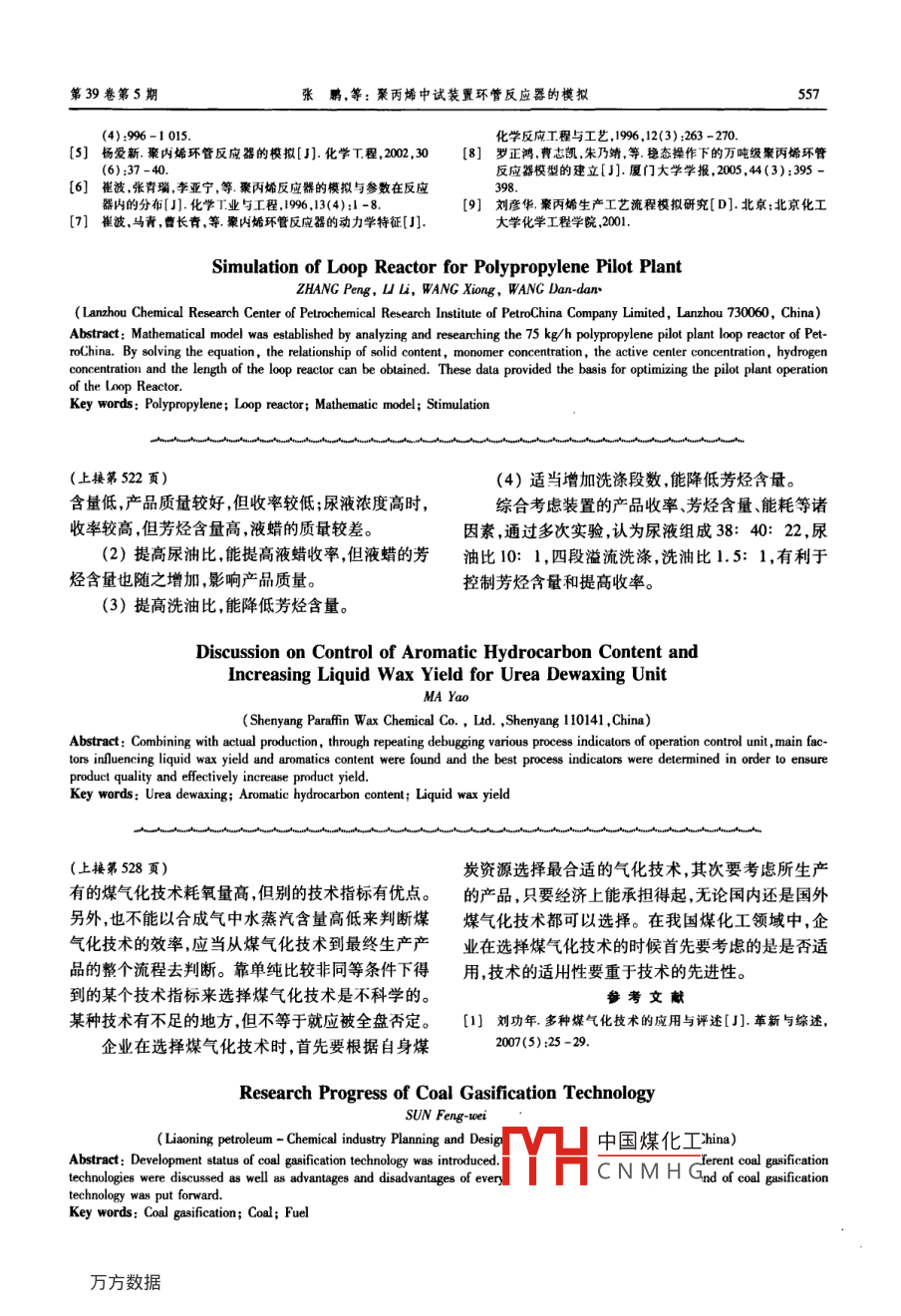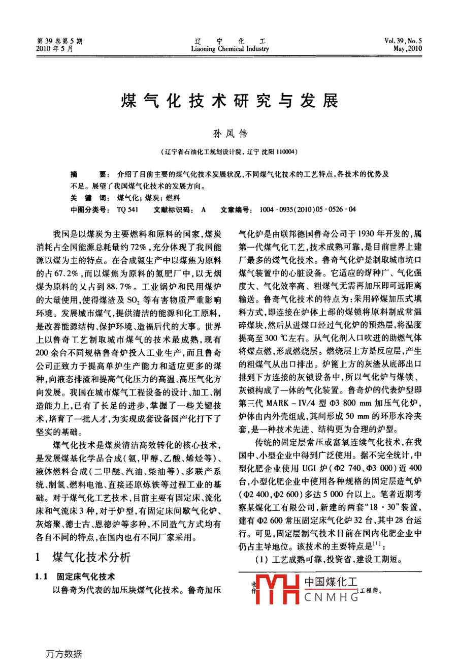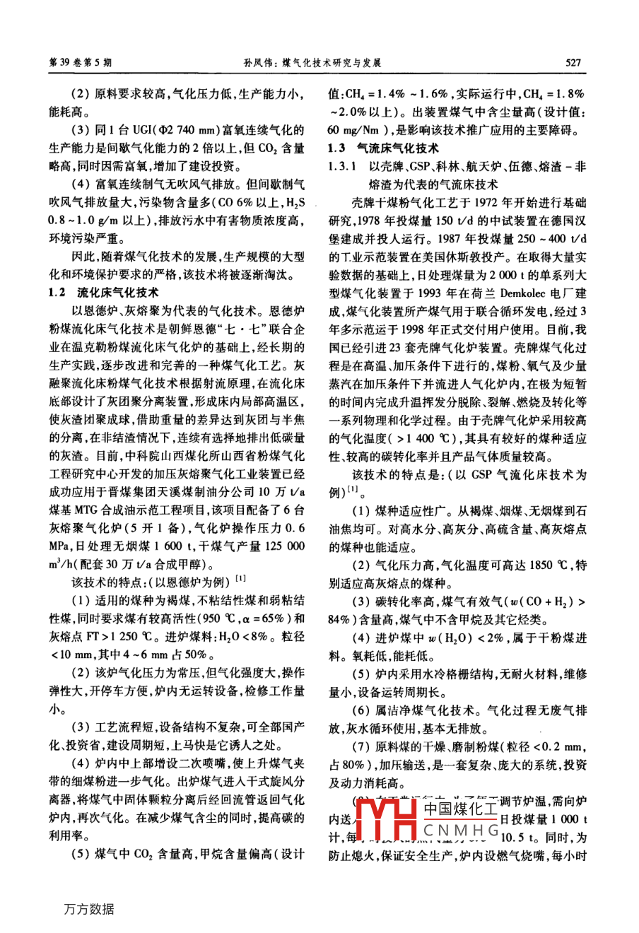 第39卷第5期遼寧化工Vol 39. No 52010年5月Liaoning Chemical IndustryMay,2010煤氣化技術(shù)研究與發(fā)展孫鳳偉(遼寧省石油化工規(guī)劃設(shè)計院,遼寧沈陽10004)摘要:介紹了目前主要的煤氣化技術(shù)發(fā)展狀況,不同煤氣化技術(shù)的工藝特點,各技術(shù)的優(yōu)勢及不足。展望了我國煤氣化技術(shù)的發(fā)展方向。關(guān)鍵煤氣化;煤炭;燃料中圖分類號:TQ541文獻標識碼:A文章編號:1004-0935(2010)050526-04我是以煤炭為主要燃料和原料的國家,煤炭氣化爐是由聯(lián)邦德國魯奇公司于1930年開發(fā)的,屬消耗占全國能源總耗量約72%,充分體現(xiàn)了我國能第一代煤氣化T藝,技術(shù)成熟可靠是目前世界上建源以煤為主的特點。在合成氨生產(chǎn)中以煤焦為原料廠最多的煤氣化技術(shù)。魯奇氣化爐是制取城市坑口的占67.2%,而以煤焦為原料的氮肥廠中,以無煙煤氣裝置中的心臟設(shè)備。它適應(yīng)的煤種廣、氣化強煤為原料的又占到88.7%。工業(yè)鍋爐和民用煤爐度大、氣化效率高、粗煤氣無需再加壓即可遠距離的大量使用,使得煤渣及SO2等有害物質(zhì)嚴重影響輸送。魯奇氣化技術(shù)的特點為:采用碎煤加壓式填環(huán)境。發(fā)展城市煤氣,提供清潔的能源和化工原料,料方式,即連接在爐體上部的煤鎖將原料制成常溫是改善能源結(jié)構(gòu)、保護環(huán)境、造福后代的大事。世界碎煤塊,然后從進煤口經(jīng)過氣化爐的預(yù)熱層,將溫度上以魯奇工藝制取城市煤氣的技術(shù)最成熟,現(xiàn)有提高至300℃左右。從氣化劑入口吹進的助燃氣體200余臺不同規(guī)格魯奇爐投入工業(yè)生產(chǎn),而且魯奇將煤點燃,形成燃燒層。燃燒層上方是反應(yīng)層,產(chǎn)生公司正致力于提高單爐生產(chǎn)能力和適應(yīng)更多的煤的粗煤氣從出口排出。爐篦上方的灰渣從底部出口種,向液態(tài)排渣和提高氣化壓力的高溫、高壓氣化方排到下方連接的灰鎖設(shè)備中,所以氣化爐與煤鎖、向發(fā)展。我國在城市煤氣工程設(shè)備的設(shè)計加工、制灰鎖構(gòu)成了一體的氣化裝置。魯奇爐的代表爐型即造能力上,已有了長足的進步,掌握了一些關(guān)鍵技第三代 MARK -.4型d3800m加壓氣化爐,術(shù),培育了一批人才,為實現(xiàn)成套設(shè)備國產(chǎn)化打下了爐體由內(nèi)外殼組成其間形成50mm的環(huán)形水冷夾堅實的基礎(chǔ)。套,是一種技術(shù)先進、結(jié)構(gòu)更為合理的爐型。煤氣化技術(shù)是煤炭清潔高效轉(zhuǎn)化的核心技術(shù)傳統(tǒng)的固定層常壓或富氧連續(xù)氣化技術(shù),在我是發(fā)展煤基化學(xué)品合成(氨,甲醇、乙酸、烯烴等國中、小型企業(yè)中得到廣泛使用。據(jù)不完全統(tǒng)計,中液體燃料合成(二甲醚、汽油、柴油等)、多聯(lián)產(chǎn)系型化肥企業(yè)使用UG爐(c2140、00)近400統(tǒng)制氫、燃料電池、直接還原煉鐵等過程工業(yè)的基臺,小型化肥企業(yè)中使用各種規(guī)格的固定層造氣爐礎(chǔ)。對于煤氣化工藝技術(shù)目前主要有固定床、流化(2400,c2600)多達5000臺以上。筆者近期考床和氣流床3種,對于爐型,有固定床間歇氣化爐、察某煤化工有限公司,新建的兩套“18·30”裝置灰熔聚、德土古恩德爐等多種,不同造氣方式均有建有c2600常壓固定床氣化爐32臺,其中28臺運各自不同的特點,在國內(nèi)也有不同廠家采用行??梢?固定層制氣技術(shù)目前在國內(nèi)化肥企業(yè)中仍占主導(dǎo)地位。該技術(shù)的主要特點是:1煤氣化技術(shù)分析(1)工藝成熟可靠,投資省,建設(shè)工期短11固定床氣化技術(shù)中國煤化工以魯奇為代表的加壓塊煤氣化技術(shù)。魯奇加壓dH工程師。CNMHG第39卷第5期孫鳳偉:煤氣化技術(shù)研究與發(fā)展5272)原料要求較高,氣化壓力低,生產(chǎn)能力小,值:CH4=1.4%-1.6%,實際運行中,CH4=1.8%能耗高。2.0%以上)。出裝置煤氣中含塵量高(設(shè)計值:3)同1臺UGI(φ2740mm)富氧連續(xù)氣化的60mg/Nm),是影響該技術(shù)推廣應(yīng)用的主要障礙。生產(chǎn)能力是間歇氣化能力的2倍以上,但CO2含量1.3氣流床氣化技術(shù)略高,同時因需富氧,增加了建設(shè)投資。1.3.1以殼牌、CSP、科林、航天爐、伍德、熔渣-非(4)富氧連續(xù)制氣無吹風氣排放。但間歇制氣熔渣為代表的氣流床技術(shù)吹風氣排放量大,污染物含量多(CO6%以上,H2S殼牌干煤粉氣化工藝于1972年開始進行基礎(chǔ)0.8~1.0g/m以上),排放污水中有害物質(zhì)濃度高,研究,1978年投煤量150U/d的中試裝置在德國漢環(huán)境污染嚴重。堡建成并投人運行。1987年投煤量250~400t/d因此,隨著煤氣化技術(shù)的發(fā)展,生產(chǎn)規(guī)模的大型的T業(yè)示范裝置在美國休斯敦投產(chǎn)。在取得大量實化和環(huán)境保護要求的嚴格,該技術(shù)將被逐漸淘汰。驗數(shù)據(jù)的基礎(chǔ)上,日處理煤量為2000t的單系列大12流化床氣化技術(shù)型煤氣化裝置于1993年在荷蘭 Demkolec電廠建以恩德爐、灰熔聚為代表的氣化技術(shù)。恩德爐成煤氣化裝置所產(chǎn)煤氣用于聯(lián)合循環(huán)發(fā)電,經(jīng)過3粉煤流化床氣化技術(shù)是朝鮮恩德“七·七”聯(lián)合企年多示范運于1998年正式交付用戶使用。目前,我業(yè)在溫克勒粉煤流化床氣化爐的基礎(chǔ)上,經(jīng)長期的國已經(jīng)引進23套殼牌氣化爐裝置。殼牌煤氣化過生產(chǎn)實踐逐步改進