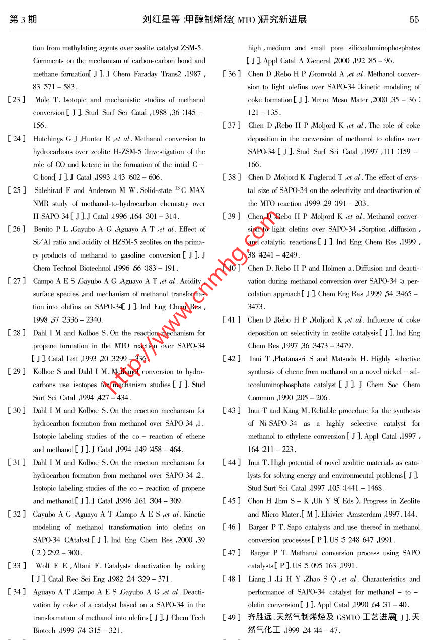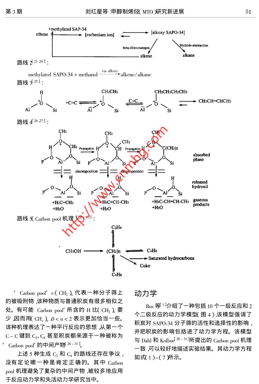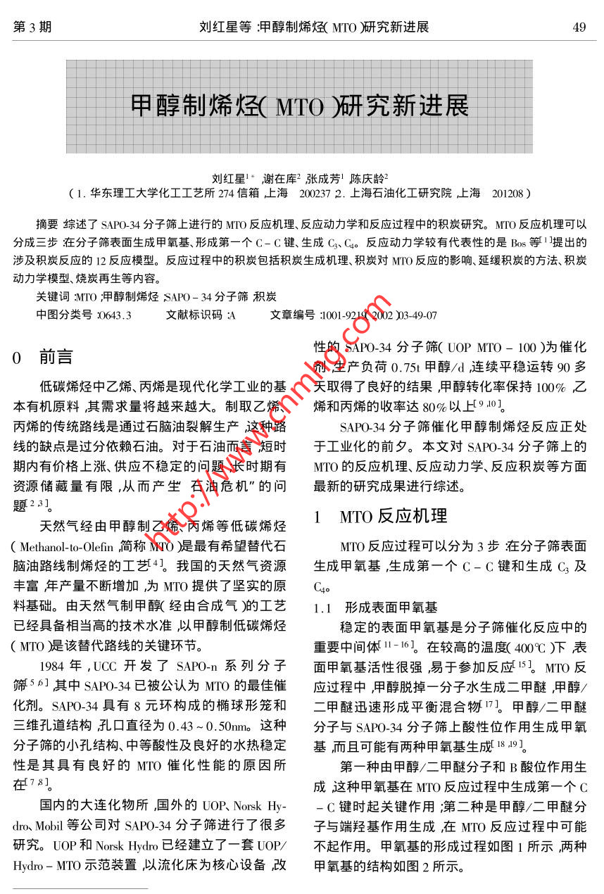 第3期劉紅星等:甲醇制烯烴( MTO )研究新進展甲醇制烯烴(MTO)研究新進展劉紅星'”謝在庫2張成芳'陳慶齡?( 1.華東理工大學(xué)化工工藝所274信箱上海200237 2.上海石油化工研究院上海201208 )摘要綜述了SAP0-34分子篩上進行的MTO反應(yīng)機理、反應(yīng)動力學(xué)和反應(yīng)過程中的積炭研究。MTO 反應(yīng)機理可以分成三步在分子篩表面生成甲氧基、形成第一個C-C鍵、生成C、C。反應(yīng)動力學(xué)較有代表性的是Bos等I ]提出的涉及積炭反應(yīng)的12反應(yīng)模型。反應(yīng)過程中的積炭包括積炭生成機理、積炭對MTO反應(yīng)的影響、延緩積炭的方法、積炭動力學(xué)模型、燒炭再生等內(nèi)容。關(guān)鍵詞:MTO ;甲醇制烯烴SAPO- 34分子篩積炭中圖分類號:0643.3文獻標(biāo)識碼:A .文章編號:1001-9219 2002 )03-49-07性的SAP0-34分子篩(UOPMTO-100)為催化0前言劑生產(chǎn)負(fù)荷0.75t甲醇/d ,連續(xù)平穩(wěn)運轉(zhuǎn)90多低碳烯烴中乙烯、丙烯是現(xiàn)代化學(xué)工業(yè)的基天取得了良好的結(jié)果,甲醇轉(zhuǎn)化率保持100% ,乙本有機原料其需求量將越來越大。制取乙烯、烯和丙烯的收率達80%以上9 ,10]。丙烯的傳統(tǒng)路線是通過石腦油裂解生產(chǎn)這種路SAPO-34分子篩催化甲醇制烯烴反應(yīng)正處線的缺點是過分依賴石油。對于石油而言短時于工業(yè)化的前夕。本文對SAPO-34分子篩上的期內(nèi)有價格上漲、供應(yīng)不穩(wěn)定的問題;長時期有MTO的反應(yīng)機理、反應(yīng)動力學(xué)、反應(yīng)積炭等方面資源儲藏量有限,從而產(chǎn)生石油危機”的問最新的研究成果進行綜述。題23]。天然氣經(jīng)由甲醇制乙烯、丙烯等低碳烯烴1 MTO反應(yīng)機理( Methanol-to-0lefin簡稱MTO )是最有希望替代石MTO反應(yīng)過程可以分為3步在分子篩表面腦油路線制烯烴的工藝4。我國的天然氣資源生成甲氧基,生成第一個C- C鍵和生成C3及豐富年產(chǎn)量不斷增加,為MTO提供了堅實的原C4。料基礎(chǔ)。由天然氣制甲醇(經(jīng)由合成氣)的工藝1.1形成表面甲氧基已經(jīng)具備相當(dāng)高的技術(shù)水準(zhǔn)以甲醇制低碳烯烴穩(wěn)定的表面甲氧基是分子篩催化反應(yīng)中的( MTO )是該替代路線的關(guān)鍵環(huán)節(jié)。重要中間體11-16]。在較高的溫度( 400C)下表1984年,UCC開發(fā)了SAPO-n系列分子面甲氧基活性很強易于參加反應(yīng)15]。MTO反篩56]其中SAP0-34已被公認(rèn)為MTO的最佳催應(yīng)過程中,甲醇脫掉一分 子水生成二甲醚,甲醇/化劑。SAP0-34具有8元環(huán)構(gòu)成的橢球形籠和二甲醚迅速形成平衡混合物[17]。甲醇/二甲醚三維孔道結(jié)構(gòu)孔口直徑為0.43 ~0.50nmo這種.分子與SAP0-34分子篩上酸性位作用生成甲氧分子篩的小孔結(jié)構(gòu)、中等酸性及良好的水熱穩(wěn)定基,而且可能有兩種甲氧基生成[ 18.19。性是其具有良好的MTO催化性能的原因所第一種由甲醇/二甲醚分子和B酸位作用生在78。成這種甲氧基在MTO反應(yīng)過程中生成第一個C國內(nèi)的大連化物所國外的UOP、Nosk Hy--C鍵時起關(guān)鍵作用;第二種是甲醇/二甲醚分dro、Mobil等公司對SAP0-34分子篩進行了很多子與端羥基作用生成在MTO反應(yīng)過程中可能研究。UOP 和Norsk Hydro已經(jīng)建立了一套UOP/不起作用。甲氧基的形成過程如圖1所示兩種Hydro- MTO示范裝置,以流化床為核心設(shè)備改甲氧基的結(jié)構(gòu)如圖2所示。修改稿日期2003-05-08 ;作者簡介:劉紅星( 1976- ),男,碩土;*通氣聯(lián)教據(jù)e-mail :hx-hx @ 2len. como50天然氣化工2002年第27卷CHsOHz0HCHzOH, AISi~HzOCH3AISi 、SCHOCHCH3OHCH3-CHsOHsi圖1 SAP0-34 分子篩上表面甲氧基的形成過程1415]Fig. 1 Formation of surface methoxy1 groups on the SAPO-34 14.15]cHsotype ItypeIT圖2 SAP0-34 分子篩上的兩種甲氧基Fig.2 Two types of methoxy groups on SAPO-34. 1.2 生成第一個C-C鍵和Rake機理等20]。以O(shè)xium ylide機理為例:甲.甲氧基生成后,如何生成第- -個C-C鍵眾氧基中一個C-H質(zhì)子化生成C-H+與甲醇分說紛紜相關(guān)機理有20余種之多。但基本上可子中- OH作用形成氫鍵然后生成乙基氧C ]進以歸為以下幾類:0xium ylide機理、Carbene機理、而生成第一個C- C鍵,詳細(xì)過程如圖3所示。Carbocationic機理、自由基機理、Carbon pool 機理HO,HCHz+H2C-CH2+H2O圖3表面 甲氧基和甲醇作用生成第一個C- C鍵的過程21]Fig.3 Formation of the first C- C bond via a concerted reaction of thesurface methoxy group with a methanol molecule 21]1.3 C3、C4的生成過程沒有Cs以上的產(chǎn)物。C3、C4 的生成有以下5種SAPO-34分子篩催化MTO反應(yīng)時產(chǎn)物分布路線:較簡單,以C2~C4特別是乙烯、丙烯為主幾乎路線122232]:51劉紅星等:甲醇制烯烴( MITO研究新進展第3期+methylated SAP-34etheneHydride abstrctionbeta-elimonatopmn/alkanealkene路線21241:methylated SAP0-34 + methanolvi ako alkene/ alkane路線3-25]:CH2CH3CHzCH2CHzCH3H一+ CH:CH=CHCH+C=C一一toE三Al~sAI'~SAI~Si路線42627]:CH3CHCH2 Prpeatin H/9C(CH)2absorbedpbaseAl-siA1-deompxstion==..oomopstion = ==releasedbydroxil+HxC=CH-CH3+HCCH=CH-CHs Besousproducts+H:C=CH2+HzO+H2O路線s( Carbon pol機理S38-31:CzH4C3H6CHOH一