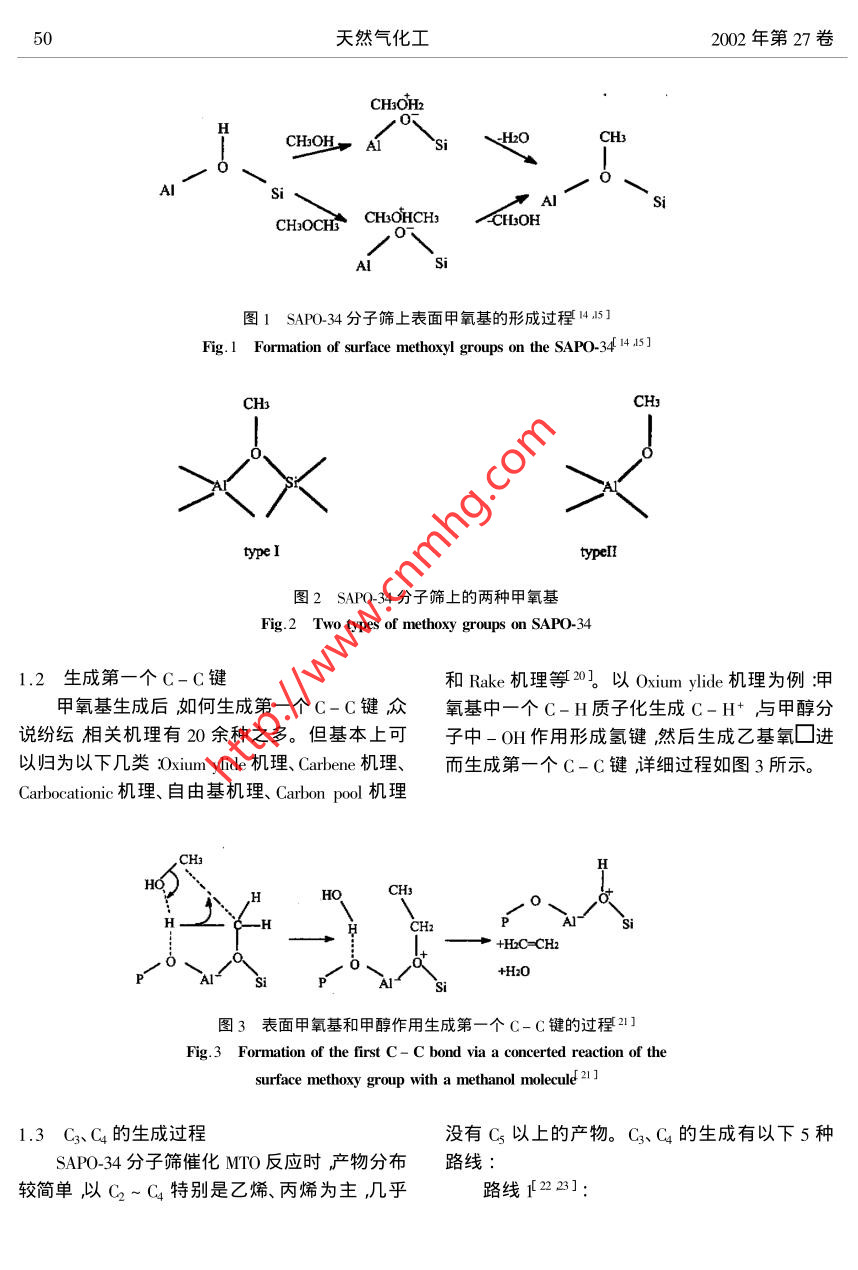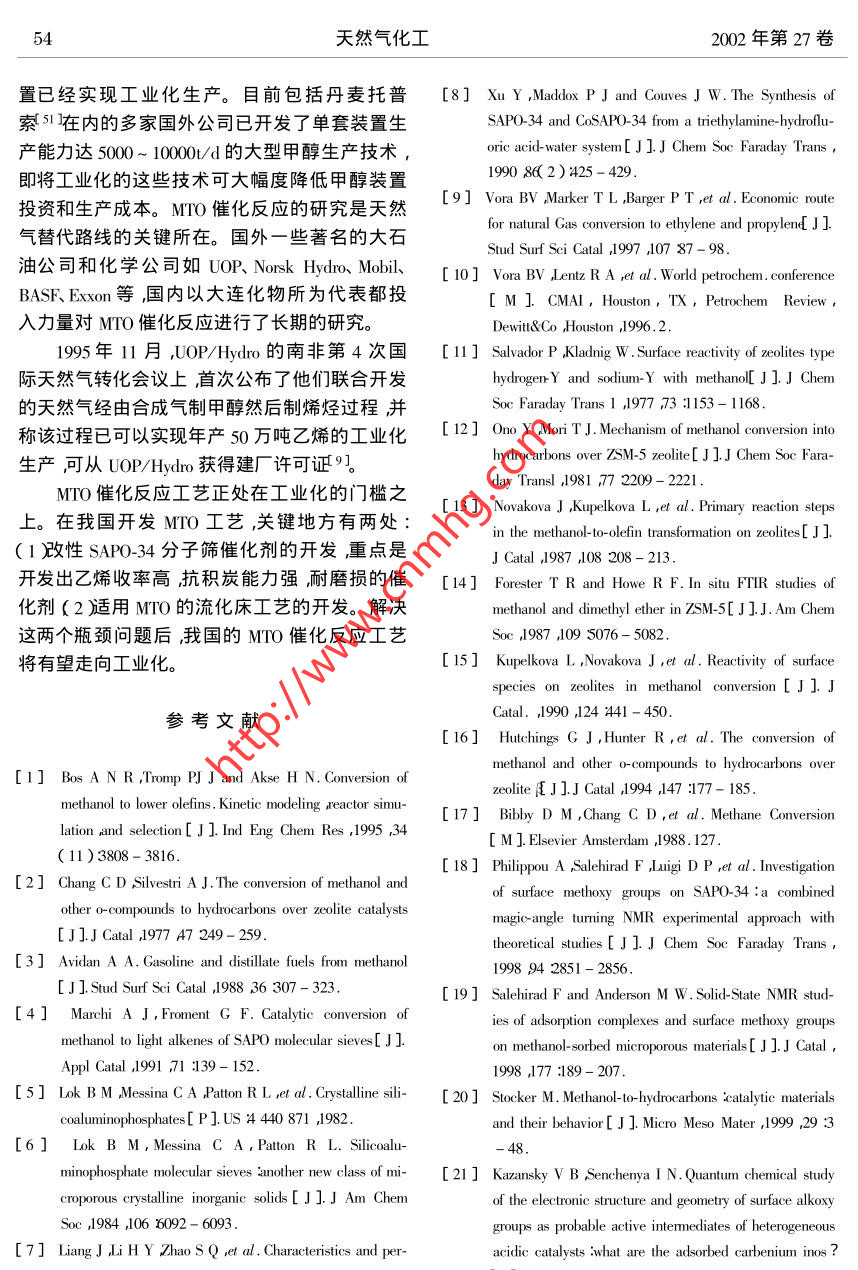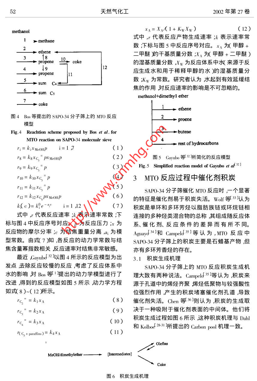 第3期劉紅星等:甲醇制烯烴( MTO )研究新進展甲醇制烯烴(MTO)研究新進展劉紅星'”謝在庫2張成芳'陳慶齡?( 1.華東理工大學(xué)化工工藝所274信箱上海200237 2.上海石油化工研究院上海201208 )摘要綜述了SAP0-34分子篩上進行的MTO反應(yīng)機理、反應(yīng)動力學(xué)和反應(yīng)過程中的積炭研究。MTO 反應(yīng)機理可以分成三步在分子篩表面生成甲氧基、形成第一個C-C鍵、生成C、C。反應(yīng)動力學(xué)較有代表性的是Bos等I ]提出的涉及積炭反應(yīng)的12反應(yīng)模型。反應(yīng)過程中的積炭包括積炭生成機理、積炭對MTO反應(yīng)的影響、延緩積炭的方法、積炭動力學(xué)模型、燒炭再生等內(nèi)容。關(guān)鍵詞:MTO ;甲醇制烯烴SAPO- 34分子篩積炭中圖分類號:0643.3文獻標(biāo)識碼:A .文章編號:1001-9219 2002 )03-49-07性的SAP0-34分子篩(UOPMTO-100)為催化0前言劑生產(chǎn)負(fù)荷0.75t甲醇/d ,連續(xù)平穩(wěn)運轉(zhuǎn)90多低碳烯烴中乙烯、丙烯是現(xiàn)代化學(xué)工業(yè)的基天取得了良好的結(jié)果,甲醇轉(zhuǎn)化率保持100% ,乙本有機原料其需求量將越來越大。制取乙烯、烯和丙烯的收率達80%以上9 ,10]。丙烯的傳統(tǒng)路線是通過石腦油裂解生產(chǎn)這種路SAPO-34分子篩催化甲醇制烯烴反應(yīng)正處線的缺點是過分依賴石油。對于石油而言短時于工業(yè)化的前夕。本文對SAPO-34分子篩上的期內(nèi)有價格上漲、供應(yīng)不穩(wěn)定的問題;長時期有MTO的反應(yīng)機理、反應(yīng)動力學(xué)、反應(yīng)積炭等方面資源儲藏量有限,從而產(chǎn)生石油危機”的問最新的研究成果進行綜述。題23]。天然氣經(jīng)由甲醇制乙烯、丙烯等低碳烯烴1 MTO反應(yīng)機理( Methanol-to-0lefin簡稱MTO )是最有希望替代石MTO反應(yīng)過程可以分為3步在分子篩表面腦油路線制烯烴的工藝4。我國的天然氣資源生成甲氧基,生成第一個C- C鍵和生成C3及豐富年產(chǎn)量不斷增加,為MTO提供了堅實的原C4。料基礎(chǔ)。由天然氣制甲醇(經(jīng)由合成氣)的工藝1.1形成表面甲氧基已經(jīng)具備相當(dāng)高的技術(shù)水準(zhǔn)以甲醇制低碳烯烴穩(wěn)定的表面甲氧基是分子篩催化反應(yīng)中的( MTO )是該替代路線的關(guān)鍵環(huán)節(jié)。重要中間體11-16]。在較高的溫度( 400C)下表1984年,UCC開發(fā)了SAPO-n系列分子面甲氧基活性很強易于參加反應(yīng)15]。MTO反篩56]其中SAP0-34已被公認(rèn)為MTO的最佳催應(yīng)過程中,甲醇脫掉一分 子水生成二甲醚,甲醇/化劑。SAP0-34具有8元環(huán)構(gòu)成的橢球形籠和二甲醚迅速形成平衡混合物[17]。甲醇/二甲醚三維孔道結(jié)構(gòu)孔口直徑為0.43 ~0.50nmo這種.分子與SAP0-34分子篩上酸性位作用生成甲氧分子篩的小孔結(jié)構(gòu)、中等酸性及良好的水熱穩(wěn)定基,而且可能有兩種甲氧基生成[ 18.19。性是其具有良好的MTO催化性能的原因所第一種由甲醇/二甲醚分子和B酸位作用生在78。成這種甲氧基在MTO反應(yīng)過程中生成第一個C國內(nèi)的大連化物所國外的UOP、Nosk Hy--C鍵時起關(guān)鍵作用;第二種是甲醇/二甲醚分dro、Mobil等公司對SAP0-34分子篩進行了很多子與端羥基作用生成在MTO反應(yīng)過程中可能研究。UOP 和Norsk Hydro已經(jīng)建立了一套UOP/不起作用。甲氧基的形成過程如圖1所示兩種Hydro- MTO示范裝置,以流化床為核心設(shè)備改甲氧基的結(jié)構(gòu)如圖2所示。修改稿日期2003-05-08 ;作者簡介:劉紅星( 1976- ),男,碩土;*通氣聯(lián)教據(jù)e-mail :hx-hx @ 2len. como50天然氣化工2002年第27卷CHsOHz0HCHzOH, AISi~HzOCH3AISi 、SCHOCHCH3OHCH3-CHsOHsi圖1 SAP0-34 分子篩上表面甲氧基的形成過程1415]Fig. 1 Formation of surface methoxy1 groups on the SAPO-34 14.15]cHsotype ItypeIT圖2 SAP0-34 分子篩上的兩種甲氧基Fig.2 Two types of methoxy groups on SAPO-34. 1.2 生成第一個C-C鍵和Rake機理等20]。以O(shè)xium ylide機理為例:甲.甲氧基生成后,如何生成第- -個C-C鍵眾氧基中一個C-H質(zhì)子化生成C-H+與甲醇分說紛紜相關(guān)機理有20余種之多。但基本上可子中- OH作用形成氫鍵然后生成乙基氧C ]進以歸為以下幾類:0xium ylide機理、Carbene機理、而生成第一個C- C鍵,詳細(xì)過程如圖3所示。Carbocationic機理、自由基機理、Carbon pool 機理HO,HCHz+H2C-CH2+H2O圖3表面 甲氧基和甲醇作用生成第一個C- C鍵的過程21]Fig.3 Formation of the first C- C bond via a concerted reaction of thesurface methoxy group with a methanol molecule 21]1.3 C3、C4的生成過程沒有Cs以上的產(chǎn)物。C3、C4 的生成有以下5種SAPO-34分子篩催化MTO反應(yīng)時產(chǎn)物分布路線:較簡單,以C2~C4特別是乙烯、丙烯為主幾乎路線122232]:51劉紅星等:甲醇制烯烴( MITO研究新進展第3期+methylated SAP-34etheneHydride abstrctionbeta-elimonatopmn/alkanealkene路線21241:methylated SAP0-34 + methanolvi ako alkene/ alkane路線3-25]:CH2CH3CHzCH2CHzCH3H一+ CH:CH=CHCH+C=C一一toE三Al~sAI'~SAI~Si路線42627]:CH3CHCH2 Prpeatin H/9C(CH)2absorbedpbaseAl-siA1-deompxstion==..oomopstion = ==releasedbydroxil+HxC=CH-CH3+HCCH=CH-CHs Besousproducts+H:C=CH2+HzO+H2O路線s( Carbon pol機理S38-31:CzH4C3H6CHOH一