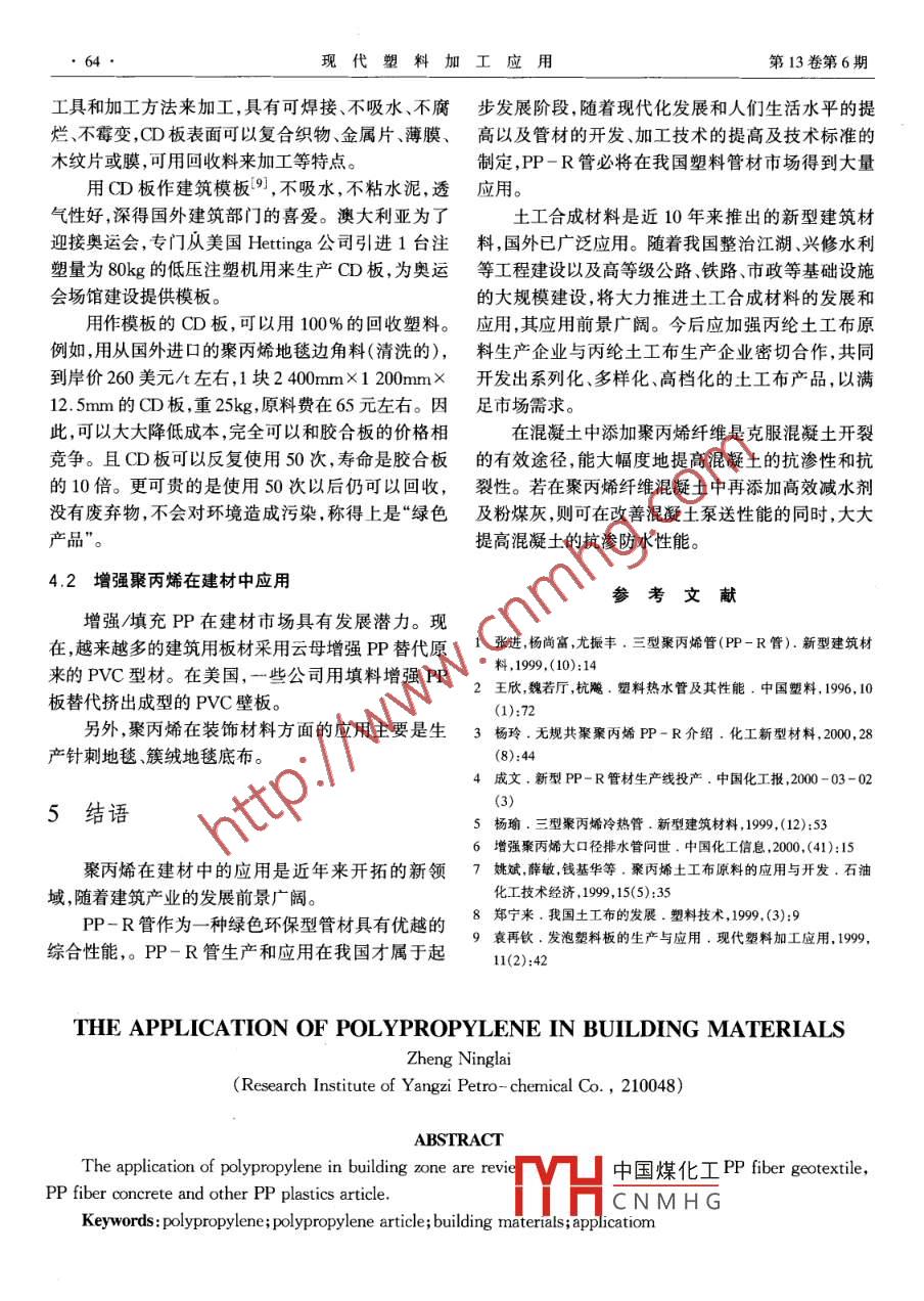 現(xiàn)代塑料加工應(yīng)用Modern Plastics Processing and Applications第13卷第6期聚丙烯在建材中的應(yīng)用鄭寧來(lái)(揚(yáng)子石化股份有限公司研究院,南京,210048)摘要:綜述了聚丙烯在建筑領(lǐng)域中應(yīng)用,包括聚丙烯管材、聚丙烯土工布、聚丙烯纖維混凝土及其他制品在建筑材料中應(yīng)用情況關(guān)鍵詞:聚丙烯聚丙烯制品建筑材料應(yīng)用聚內(nèi)烯(PP)以其優(yōu)異的性能已廣泛應(yīng)用于眾多產(chǎn)業(yè)部門(mén)。近年來(lái),隨著PP新產(chǎn)品開(kāi)發(fā)、PP改表2各種材質(zhì)管材性能比較性及加工技術(shù)的發(fā)展,拓展了PP的應(yīng)用領(lǐng)域,開(kāi)拓材質(zhì)鍍鋅鋼材 PVC PEX鋁塑PP-R了PP在建筑材料中的應(yīng)用,并正以較快速度發(fā)展。有無(wú)結(jié)垢、生銹有無(wú)無(wú)無(wú)衛(wèi)生程度差有C1、Cr、Pb離子好1聚丙烯管材保溫性好差好好耐溫性耐溫不耐溫耐溫不耐溫耐溫由于丙烯共聚物管材性能優(yōu)越,市場(chǎng)前景光明,耐壓程度低較高較高較高世界各國(guó)均在研制及生產(chǎn)聚丙烯共聚物管材。線膨脹性致不一致一致連續(xù)方式受壓粘接受壓受壓熱熔1.1丙烯共聚物管材的性能廢品的回收利用可以不能困難可以聚丙烯管分為均聚聚丙烯(PP-H,一型)嵌段1.2聚丙烯管材市場(chǎng)前景共聚聚丙烯(PP-B,二型)和無(wú)規(guī)共聚聚丙烯(PPR,三型),其中PP-R管性能最佳,發(fā)展較快聚丙烯由于具有突出的優(yōu)良性能,丙烯共聚物PP-R管作為一種新型管材具有以下性能特點(diǎn):管材在化學(xué)建材中得到了廣泛應(yīng)用??捎糜谛l(wèi)生用(1)節(jié)能:(2)耐腐蝕、不結(jié)垢、衛(wèi)生、無(wú)毒;(3)耐熱、管材、飲用給水及熱水采暖系統(tǒng)管材、工業(yè)用管材耐壓、使用壽命長(zhǎng);(4)輕質(zhì)高強(qiáng),流體阻力小;(5)管動(dòng)植物園用管材溫泉水管材和太陽(yáng)能住宅溫水管道系統(tǒng)的連接安裝方便,可靠;(6)原料可回收性好等。還可用于醫(yī)療、食品、飲料、釀造、化工、船舶、農(nóng)丙烯共聚物管材和管件的產(chǎn)品性能見(jiàn)表1,幾種材業(yè)園林、養(yǎng)殖、太陽(yáng)能等各個(gè)領(lǐng)域。PP=R管自20質(zhì)管材性能比較見(jiàn)表2世紀(jì)90年代生產(chǎn)和應(yīng)用以來(lái)得到較大發(fā)展,產(chǎn)品主要用于建筑物冷、熱水系統(tǒng),飲用水系統(tǒng)及板式(包表1丙烯共聚物管材及管件的產(chǎn)品性能括地板)采暖系統(tǒng)2。1993~1996年歐洲PP-R管的使用量由項(xiàng)目管材3kt/a發(fā)展到44kt/a,平均每年遞增15%以上。目管件縱向回縮率,%前歐洲室內(nèi)自來(lái)水管道已經(jīng)有80%以上使用PPR管材。應(yīng)用量較大國(guó)家有意大利、德國(guó)、丹麥、土沖擊試驗(yàn)破損率,%烘箱試驗(yàn)無(wú)滲漏耳其、捷克等,其中意大利年使用PP-R管達(dá)到液壓試驗(yàn)中國(guó)煤化工20℃,1h,環(huán)應(yīng)力16MPa無(wú)滲漏無(wú)滲漏CNMHG屴,簡(jiǎn)級(jí)L程卿。1963年畢業(yè)于復(fù)旦大學(xué)化95℃,1000h,環(huán)應(yīng)力2.6MPa無(wú)滲漏無(wú)滲漏學(xué)系高分子專業(yè),一直從事有關(guān)石油化工、高分子合成及信息研究工110℃,8760h,環(huán)應(yīng)力14MPa無(wú)滲漏作。已發(fā)表論文40余篇。鄭寧來(lái).聚丙烯在建材中的應(yīng)用613×107km,約占?xì)W洲總量的22%。1998~1996年,揚(yáng)子石化股份有限公司研究院研制成功無(wú)規(guī)共德國(guó)塑料管材用量在建筑內(nèi)飲水和熱水系統(tǒng)中應(yīng)用聚聚丙烯管材專用料,并以低于進(jìn)口同類(lèi)產(chǎn)品的價(jià)由5%增至37%,而不同種類(lèi)塑料管材在飲用水和格在國(guó)內(nèi)銷(xiāo)售。在該專用料基礎(chǔ)上又開(kāi)發(fā)成功無(wú)規(guī)熱水系統(tǒng)中,丙烯共聚物管材占28%。從1996年共聚聚丙烯給水管,并能加工直徑從20~160mm的起,德國(guó)新建筑室內(nèi)排水管全部采用丙烯共聚物管材。經(jīng)有關(guān)單位使用表明,產(chǎn)品性能良好,達(dá)到國(guó)管材。外同類(lèi)管材的技術(shù)標(biāo)準(zhǔn),產(chǎn)品性能達(dá)國(guó)內(nèi)先進(jìn)水平。上海建筑材料廠于1997年從德國(guó)引進(jìn)生產(chǎn)技青島德意利機(jī)械有限公司開(kāi)發(fā)成功新型的術(shù)和設(shè)備,建成我國(guó)最早生產(chǎn)PP-R管材和管件的PP-R管材生產(chǎn)線4,每分鐘可生產(chǎn)20mPP-R生產(chǎn)線,其生產(chǎn)能力為500t/a。1999年,我國(guó)山東管材。建成第一條丙烯共聚物管材國(guó)產(chǎn)化生產(chǎn)線。如今武漢石化廠研制成功聚丙烯雙壁波紋管。該雙我國(guó)PP-R管材生產(chǎn)線有30余條,總生產(chǎn)能力達(dá)壁波紋管可用于節(jié)水農(nóng)業(yè)滴灌、噴灌用水管,通訊電到15kt/a。目前,國(guó)內(nèi)PP-R管主要用于純凈水和纜、光纜套管,城市建設(shè)中的給排水工程熱水系統(tǒng),如上海市的純凈水系統(tǒng)就使用了相當(dāng)數(shù)浙江省寧波市波爾新型建材開(kāi)發(fā)公司研制生產(chǎn)量的PPR管。丙烯共聚物管材已被選用在中國(guó)南出三型聚丙烯PP-R水管的管件S,采用了國(guó)際上極中心站給水工程,經(jīng)使用證明,該管在南極惡劣的最新的超細(xì)粒子增強(qiáng)技術(shù),由耐熱聚丙烯經(jīng)高分子自然條件下使用正常。繼南極中心站給水工程采用彈性體改性而成,其性能見(jià