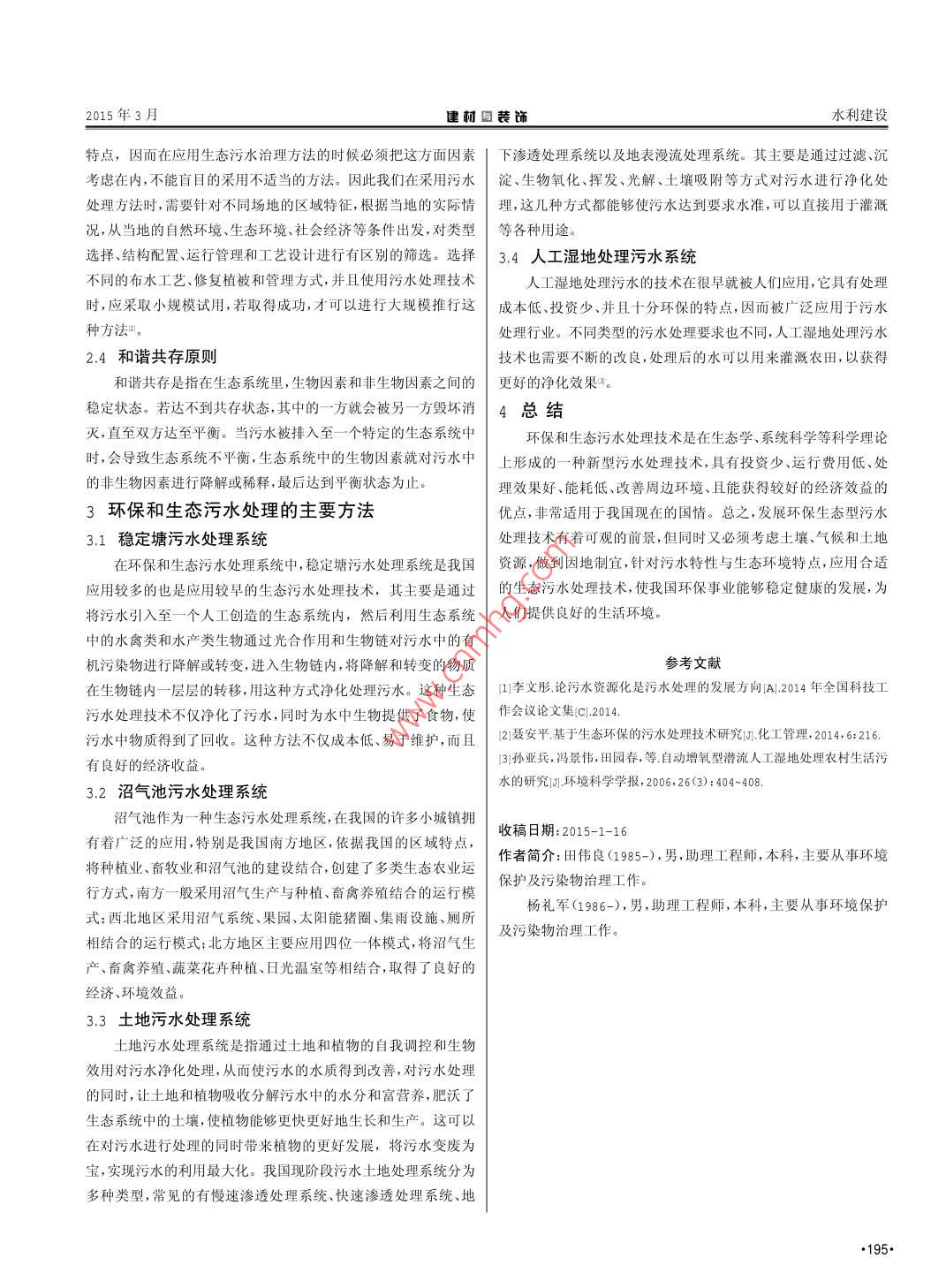 水利建設(shè)建前與裝飾015年3月環(huán)保和生態(tài)污水處理技術(shù)的分析田偉良楊禮軍(桂林市天馬水務(wù)環(huán)境有限公司廣西桂林541000摘要:隨著我國社會經(jīng)濟的快速穩(wěn)定發(fā)展,生活和生產(chǎn)污水引起的環(huán)境污染問題日趨嚴重。環(huán)保和生態(tài)污水處理技術(shù)有成本低糜、操作簡便等特點,因而這項技術(shù)受到較多的關(guān)注。本文系統(tǒng)的分析了環(huán)保和生態(tài)污水處理的技術(shù)特點、環(huán)保和生態(tài)污水處理的技術(shù)所需要遵循的原則以及水處理技術(shù)的方法等三個方面。闡述了通過環(huán)保和生態(tài)污水處理技術(shù)改善了污水處理效果,并且把污水資源化、污水治理和生態(tài)環(huán)境的改良三個方面有效結(jié)合的特點關(guān)鍵詞:環(huán)保;生態(tài);污水處理;生態(tài)環(huán)境中圖分類號:X703.1文章編號:1673-0038(2015)11-0194-02引言較小、操作簡便、無副污染物,并且能夠使整體達到優(yōu)化。近年來,國家對環(huán)境間題的重視程度達到一個新的高度,生2環(huán)保和生態(tài)污水處理的技術(shù)所需要遵循的原則態(tài)環(huán)保的問題在人們的意識中越來越重要,環(huán)保和生態(tài)影響著2.1整體優(yōu)化原則每個人的生活。在環(huán)保和生態(tài)問題中,水污染問題是最嚴重的問利用生態(tài)學方法對污水進行處理是一個非常簡單的過程,但題之一,隨著我國工業(yè)進程的加快和國內(nèi)各種工業(yè)產(chǎn)業(yè)需要,很完整的生春處理系統(tǒng)是一個有機的個體,必須擁有自身的調(diào)節(jié)多企業(yè)未經(jīng)檢驗合格或水未經(jīng)處理就將污水排入到河流湖泊等功能和應(yīng)變能力。在生態(tài)系統(tǒng)的處理過程中有很多環(huán)節(jié),主要包水系中,致使自然水系被破壞,水污染問題加重,進而影響了人括:污水源的控制、污水的傳輸選擇修復污水生態(tài)系統(tǒng)生態(tài)污們的日常生活。為解決水污染問題,我國推行各種政策要求企業(yè)水的處理、配置生態(tài)結(jié)構(gòu)、再生水利用等環(huán)節(jié)。生態(tài)區(qū)內(nèi)的物質(zhì)進行污水處理,在污水處理過程中發(fā)現(xiàn),傳統(tǒng)污水處理技術(shù)不但能量傳輸及循環(huán)利用、對外聯(lián)通生態(tài)區(qū)域等環(huán)節(jié),這些環(huán)節(jié)都是成本較高、操作復雜,而且污水處理往往也達不到國家要求標生態(tài)處理系統(tǒng)中必不可缺的部分,對污水處理過程有著非常重準,所以通過一種環(huán)保和生態(tài)的污水處理技術(shù)是我們解決水污要的作用,不可以將這些環(huán)節(jié)單獨考慮,而應(yīng)將其作為一個整體染問題的關(guān)鍵方式優(yōu)化的過程。最后達到充分發(fā)揮系統(tǒng)的污水凈化的功能、有效利1環(huán)保和生態(tài)污水處理的技術(shù)特點用水肥資源、恢復已被損壞的生態(tài)環(huán)境、最終實現(xiàn)承受水體達到傳統(tǒng)污水處理技術(shù)是利用物理和化學原理對污水進行處理國家標準,同時對污水中的可利用資源加以循環(huán)利用,使這些資凈化,物理方法是通過物理特性將不達標物質(zhì)進行吸附,化學方源變廢為寶,進而創(chuàng)造可觀的效益,形成一個整體優(yōu)化的良好生法是利用不同物質(zhì)的化學反應(yīng)將有害物質(zhì)反應(yīng)掉或者轉(zhuǎn)化成為態(tài)系統(tǒng)叫無害的物質(zhì)。22動態(tài)循環(huán)再生原則與傳統(tǒng)污水處理方法相比,環(huán)保和生態(tài)污水處理技術(shù)是利用環(huán)保和生態(tài)污水處理技術(shù)是要求我們能夠做到污水的處理生態(tài)經(jīng)濟學、系統(tǒng)科學、生態(tài)學的原理以及工程學的方法,然后和污水的再利用兩個方面的實現(xiàn)。在生物學中,循環(huán)再生是指通綜合穩(wěn)定處理技術(shù)與污水士地處理技術(shù)形成的一系列污水處理過特定生態(tài)系統(tǒng)中的生物組成部分,將生態(tài)系統(tǒng)中的非生物組處理技術(shù)。環(huán)保和生態(tài)污水處理技術(shù),是通過生物原理將我們產(chǎn)成部分合成新的物質(zhì),然后將其降解為其他成分的過程,在此過生的污水有控制性的、有目的的投入到特定的生態(tài)系統(tǒng)中,然后程中,利用生物的生物的生成和降解循環(huán)過程,從而保持生態(tài)系通過這個特殊生態(tài)系統(tǒng)中的動物、植物、土壤以及空氣、水、土壤|統(tǒng)的穩(wěn)定和平衡。在環(huán)保和生態(tài)污水處理技術(shù)中,也主要是通過中的微生物等各種生物的復合作用,對污水中有害物質(zhì)和超標循環(huán)再生原理,將污水在特定生態(tài)系統(tǒng)中處理,通過生態(tài)系統(tǒng)中物質(zhì)吸收利用,使污水中含有的有害物質(zhì)降解成對生態(tài)環(huán)境沒的生物組成部分將污水中的非生物組成部分處理和利用,加大有危害的物質(zhì),從而使水質(zhì)達到標準。其特點為以風能太陽能循環(huán)再生速度和進程,將外部的污水通過生態(tài)系統(tǒng)變成能夠供等可循環(huán)再生的資源為初始能源,然后利用動植物和微生物將人類生活生產(chǎn)所需的物質(zhì),這是一個需要動態(tài)循環(huán)再生的過程處理系統(tǒng)中污水有機物污染物質(zhì)轉(zhuǎn)化和降解,這不僅達到了除2.3區(qū)域分