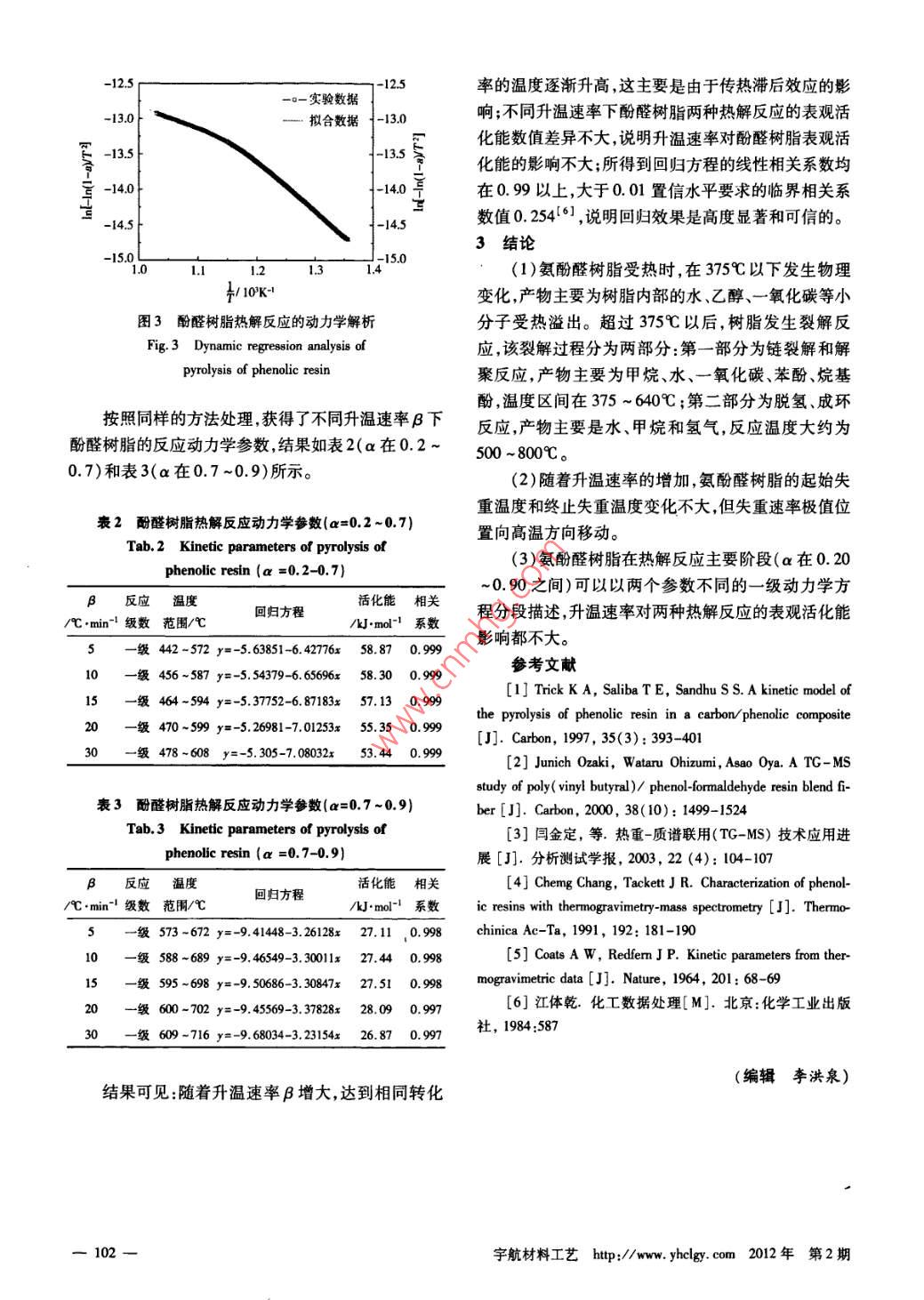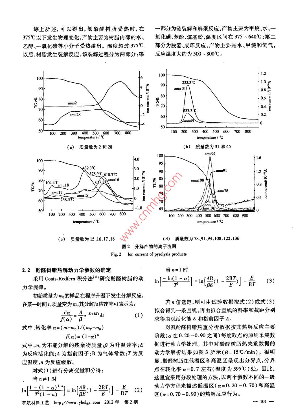 測(cè)試分析●熱重質(zhì)譜聯(lián)用技術(shù)對(duì)酚醛樹(shù)脂熱解行為及動(dòng)力學(xué)研究黃娜劉亮王曉葉(航天材料及工藝研究所,先進(jìn)功能復(fù)合材料技術(shù)重點(diǎn)實(shí)驗(yàn)室,北京100076)文摘采用熱重分析法和熱重質(zhì)譜聯(lián)用技術(shù)考察了氨酚醛樹(shù)脂的熱解反應(yīng)行為,以Cots-Redferm積分法對(duì)實(shí)驗(yàn)數(shù)據(jù)進(jìn)行動(dòng)力學(xué)解析得到了氨酚醛樹(shù)脂熱解反應(yīng)的動(dòng)力學(xué)參數(shù)。結(jié)果表明,氨酚醛樹(shù)脂的熱解反應(yīng)分為兩種:在600C以下的低溫區(qū),以鏈斷裂反應(yīng)為主;在600~800C的高溫區(qū),以脫氫反應(yīng)為主。氨酚醛樹(shù)脂熱解反應(yīng)可以用兩個(gè)分段一級(jí)動(dòng)力學(xué)方程來(lái)描述,升溫速率對(duì)兩種熱解反應(yīng)的表觀活化能影響都不大。關(guān)鍵詞酚醛樹(shù)脂,熱解,TG-MS法,動(dòng)力學(xué)Pyrolysis and Kinetics of Phenolic Resin by TG- MS AnalysisHuang NaLiu LiangWang Xiaoye( Science and Technology on Advanced Functional Composites Laboratory, Aerospace Research Institute of Materials &Processing Technology, Beijing 100076)Abstract The pyrolysis characteristic of phenolic resin has been investigated by means of thermogravimetric a-nalysis and TG-MS analysis. Models of the pyrolysis kinetics were derived using the coats- redfem integral method.The results show that the pyrolyis reactions of phenolic resin have two types: reaction of chain breaking (<600 inthe low temperature region) and reaction of dehydrogenation ( 600 to 8009 in the high temperature region). The py-rolysis of phenolic resin can be described by first-order kinetics equations in both temperature regions. Different heat-ing rates do not show evident influence on the active energy of two pyrolysis reactions.Key words Phenolic resin, Pyrolysis, TG -MS, Kinetics0引言研究酚醛樹(shù)脂受熱分解時(shí)的熱解行為和動(dòng)力學(xué),以期熱固性酚醛樹(shù)脂在無(wú)氧條件下受熱后,會(huì)發(fā)生分進(jìn)一步了解樹(shù)脂的熱解反應(yīng)實(shí)質(zhì)。解,放出大量的氣體。該熱解反應(yīng)十分復(fù)雜,放出的1實(shí)驗(yàn)氣體中既有酚醛樹(shù)脂的單體,也有水、甲烷等小分子1.1 樣品氣體,其分解反應(yīng)受固化后的樹(shù)脂化學(xué)結(jié)構(gòu)和熱環(huán)境中國(guó)科學(xué)院化學(xué)所提供的氨酚醛樹(shù)脂,樣品經(jīng)研的影響-21。磨過(guò)100目篩子。20世紀(jì)90年代發(fā)展的熱分析與質(zhì)譜聯(lián)用分析1.2實(shí)驗(yàn)儀器及 實(shí)驗(yàn)條件技術(shù)[3],通過(guò)熱重分析儀(TC)和有機(jī)質(zhì)譜分析儀熱失重分析(TGA):在德國(guó)NETZSCH STA 409(MS)耦合聯(lián)用,使研究者在研究材料熱分解過(guò)程中型熱重分析儀上進(jìn)行,氮?dú)鈿夥?流量30 mL/min,測(cè)質(zhì)量、能量變化的同時(shí),監(jiān)測(cè)熱分解過(guò)程中逸出氣體試溫度為室溫~1 100C ,采用的升溫速率β分別為產(chǎn)物,推測(cè)材料的微觀熱反應(yīng)過(guò)程“]。5、10、15、20、30C/min,每組實(shí)驗(yàn)均平行進(jìn)行2次,以本研究利用TG -MS(熱重-質(zhì)譜聯(lián)用儀)的手段確保數(shù)據(jù)的可靠性。收稿日期:2011-09-30作者簡(jiǎn)介:黃娜,1981年出生。碩士,主要從事化學(xué)分析測(cè)試工作。E -mail: huangnlqw@ 163. com字航材料工藝htp://www. yhclgy. com 2012年 第2期一99-裂解氣相色譜質(zhì)譜聯(lián)用儀( Py-GC-MS):美國(guó)2結(jié)果與討論CDS2000裂解器,美國(guó)THERMO-FINNIGAN TRACE2.1酚醛樹(shù)脂的熱解特性MS氣相色譜質(zhì)譜聯(lián)用儀。質(zhì)譜條件:電子轟擊離子圖1為氨酚醛樹(shù)脂在不同升溫速率下的熱失重源,源溫2009,電離電壓70eV,裂解溫度575C,裂和失重速率曲線。由圖1(a)可見(jiàn),酚醛樹(shù)脂的主要解時(shí)間5 s;色譜條件:DB-35石英毛細(xì)管柱,30 m,失重溫度區(qū)間為375~800C,其失重約為總失重的中0.25mm,進(jìn)樣口溫度300C,柱溫50~300C,程序85%左右。盡管不同升溫速率下的熱失重曲線相類升溫10C/ min,分流比為1:10。似,且酚醛樹(shù)脂起始失重溫度和終止溫度差異不大,熱重質(zhì)譜聯(lián)用儀(TG -MS) :德國(guó)NETZSCH STA但隨著升溫速率的增大,由于傳熱滯后效應(yīng)的影響,409-MS- Skimmer連接熱重質(zhì)譜聯(lián)用系統(tǒng),氦氣氣圖1(b)中酚醛樹(shù)脂失重速率極值位置向高溫區(qū)移氛,測(cè)試溫度為室溫~1 100C ,升溫速率β為20C/動(dòng) ,當(dāng)升溫速率由5C/min增大至30C/min時(shí),失重min,選擇離子掃描模式。速率極值位置由532C升高到了551C。100①5C/min0④②10C/minato③15C/min①532C,5C/min③④20C/min30③一②533 C.10C/min⑤30C/min③540C,15C/min7o t④544C.209C/min60⑤⑤551 C 30C/min0 200 400 600 800 1000 1200temperature/ C(a)熱失重 曲線(b)失重速率曲線圖酚醛樹(shù)脂在不同升溫速率下的熱失重和失重速率曲線Fig, 1 TG and DTG curves of phenolic resin with different heating rates對(duì)氨酚醛樹(shù)脂樣品利用Py-GC-MS進(jìn)行全離子質(zhì)譜峰的離子流圖,可以看出:在室溫~375C為失重和選擇離子掃描模式分析,得到了氨酚醛樹(shù)脂裂解產(chǎn)的第-個(gè)階段,失重約為2.90%;在375C以后氨酚物主要是:氫氣、水、甲烷、乙醇、一氧化碳、苯、苯酚、2醛樹(shù)脂逐漸開(kāi)始裂解,隨著反應(yīng)溫度進(jìn)一步的升高,-甲基苯酚.4-甲基苯酚、2,6-二甲基苯酚、2,4-二甲其裂解程度加劇,在550C左右達(dá)到其最