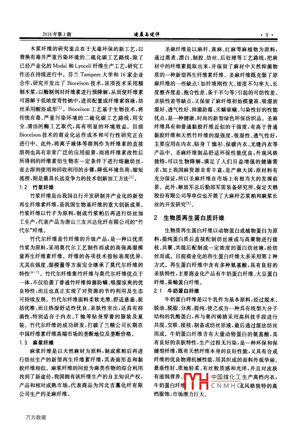 紡織科軾邊晨2016年第3期生物質纖維在針織行業(yè)的應用張艷明(五邑大學紡織服裝學院,廣東江門529020)摘要:介紹了可用于針織服裝面料開發(fā)的幾種生物質再生纖維素纖維、生物質再生蛋白質纖維和生物質合成纖維的生產過程、基本性能及研究現(xiàn)狀,指出生物質化學纖維的發(fā)展要加強基礎應用研究和關鍵核心技術的研究關鍵詞:生物質化學纖維;生物質再生纖維素纖維;生物質再生蛋白質纖維;面料開發(fā)圖分類號:TS102.51文獻標識碼:A文章編號:1673-0356(2016)03-0008-05由于石油資源的日益緊張及石油基合成纖維生產藝生產,代表產品有 Modal(莫代爾)、 Tencel(天絲)過程對環(huán)境的污染,化學纖維從生物質途徑取得原料等,其中 Modal屬于變化型高濕模量黏膠纖維, Tencel的趨勢在全球日益明顯。生物質是世界上最豐富的可則屬于 Lyocell sf維再生資源,包括所有動物、植物和微生物,以及由這些變化型高濕模量黏膠纖維是第二代再生纖維素纖生命體排泄和代謝的有機物。根據(jù)歐盟標準定義,含維,其代表商品為奧地利蘭精公司的 Modal纖維有20%及以上生物質材料的纖維可稱為生物質纖 Modal是種以歐洲櫸木漿粕為原料用專門的機械維口。從生產過程看,生物質纖維可分為生物質再生及特殊加工處理方法生產的再生纖維素纖維,生產過纖維(包括再生纖維素纖維、再生多糖纖維、再生蛋白程不產生類似普通黏膠纖維的嚴重污染環(huán)境問題,其纖維等)和生物質合成纖維(包括生物質聚酯纖維、生殘液的排放對環(huán)境無害具有良好的環(huán)保性能被稱為物質聚酰胺纖維、生物質聚氨酯生物質聚乙烯等)兩綠色纖維,通過歐洲 OKO-TEX10 Standard標準(2]。大類。隨著材料研發(fā)工作的進展,生物質纖維在性能莫代爾面料具有生物降解性使用后的廢棄物可在大上已經(jīng)具備了對常規(guī)化學纖維廣泛的替代性能夠用自然中自行進行生物降解不會對環(huán)境造成二次污染于針織服裝面料開發(fā)的主要有木漿纖維、竹漿纖維、麻 Modal纖維柔軟、光澤好,兼具絲的光澤、棉的柔軟、麻漿纖維、蛋白纖維等生物質再生纖維和PDT(生物基的滑爽,吸濕透氣比棉好,濕強要比普通黏膠高,故其聚對苯二甲酸乙二醇酯)纖維、PTT(生物基聚對苯二制品外觀性能好舒適性佳常用于內衣T恤等產品甲酸丙二醇酯)纖維、PBT(生物基聚對苯二甲酸丁二國內采用日本東洋紡專有特種工藝紡絲技術生產的麗醇酯)纖維等生物質合成纖維。賽( Richcel)纖維也屬于此種纖維1生物質再生纖維素纖維Lyocell 9維是第3代再生纖維素纖維,以針葉樹為主的木漿為原料,經(jīng)NMMO( N-Methyl Morpholine再生纖維素纖維從原料上可分為木漿纖維、竹漿纖Oxde,N甲基嗎啉氧化物)溶劑紡絲工藝生產。該纖維麻漿纖維等從工藝路線上可分為嚴重污染環(huán)境的傳維名稱由 BISFA國際人造纖維及合成纖維標準局)命統(tǒng)黏膠工藝和較為環(huán)保的新型紡絲工藝。黏膠從本質上名,美國聯(lián)邦貿易委員會也確認通過。 Lyocell生產講是生物質纖維但目前提到的生物質再生纖維素纖維通藝的溶劑回收率達9%以上,并可循環(huán)使用整個生常不包含普通黏膠纖維(以棉短絨等為原料,使用有毒并產系統(tǒng)中廢排放為零產品也可生物降解對環(huán)境幾乎嚴重污染環(huán)境的二硫化碳工藝路線),而是特指使用了新沒有任何污染,是一種綠色環(huán)保纖維。 Lyocell纖維具原料或新工藝的新型再生纖維素纖維。有較高的干強、濕強和濕模量、優(yōu)良的尺寸穩(wěn)定性,棉1.1木漿纖維纖維的舒適性、黏膠纖維的懸垂性和色彩鮮艷性、真絲木漿纖維主要以木漿為原料,采用非傳統(tǒng)黏膠工的柔軟手感和優(yōu)雅光澤,主要用于內衣T恤等。代表商品有 Tence收稿日期:2015-1216;修回日期:2015-1224作者簡介:張艷明(1973),女,講師博士,主要從事針織新產品開發(fā)研究長絲產品)。YH中國煤化工vCel(紐賽爾,CNMHG1纖維貴,市場工作, E-mail: yanming_ zh@126cm?;潭纫膊蝗?Modal纖維。2016年第3期繾展與逑評木漿纖維的研究重點在于無毒環(huán)保的新工藝,以圣麻纖維是以麻稈、黃麻、紅麻等麻植物為原料,替換有毒并嚴重污染環(huán)境的二硫化碳工藝路線,除了通過蒸煮、漂白、制膠、紡絲、后處理等工藝路線,把麻已經(jīng)產業(yè)化的 Modal和 lyocell:纖維生產工藝,研究工材中的纖維素提取出來,并保留了麻材中天然抑菌物作還在持續(xù)進行中。芬蘭 Tampere大學和16家企業(yè)質的一種新型再生纖維素纖維。圣麻纖維既克服了原合作研究開發(fā)出了 Biocelson技術,該項技術采用精麻纖維的一些缺點(如纖維剛性大細度不勻率大、長制木漿,以酶制劑對纖維素進行預降解從而使纖維素度整齊度差抱合性差條干不勻等)引起的可紡性差、可溶解于低濃度苛性鈉中,進而配置成纖維素溶液,紡親膚性差等缺點,又保留了麻纖維初始模量高、吸濕放絲釆用酸浴成形。 Biocelson工藝基于生物技術,將濕好、透氣性好、抑菌防霉、滅螨驅螨、勻染性好的性能傳統(tǒng)有毒、嚴重污染環(huán)境的二硫化碳工藝路線,用安優(yōu)點,是一種健康、時尚的新型綠色環(huán)保紡織品。圣麻全、清潔的酶工藝取代,具有明顯的環(huán)境效益。目前纖維具有和普通黏膠纖維近似的干強度,有高于普通Biocelson技術的商業(yè)化運作成本和可行性研究正在黏膠纖維和天然竹纖