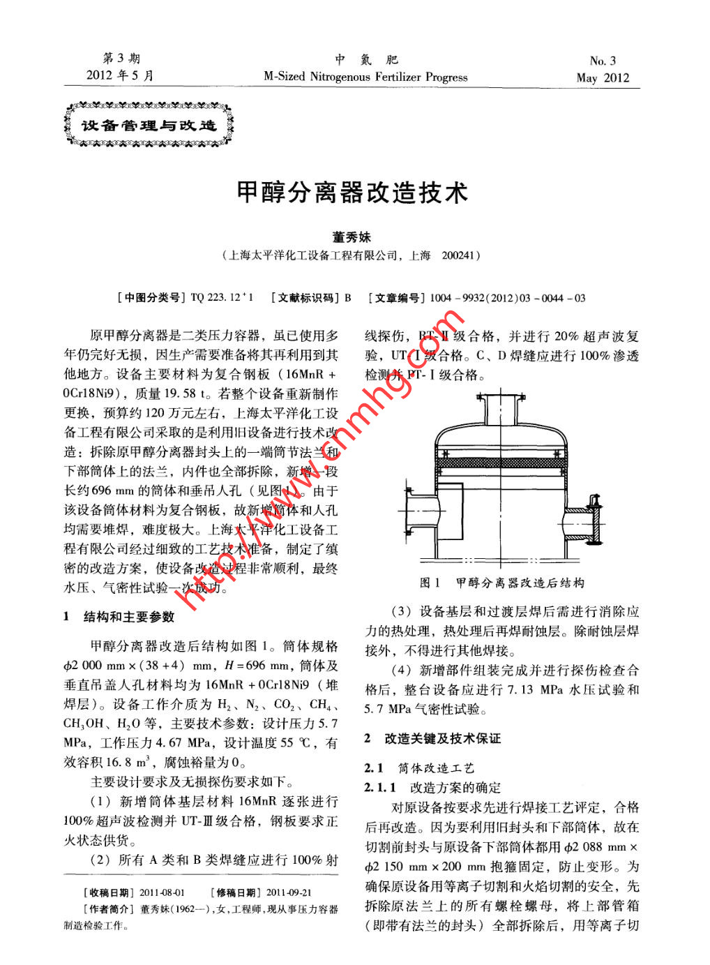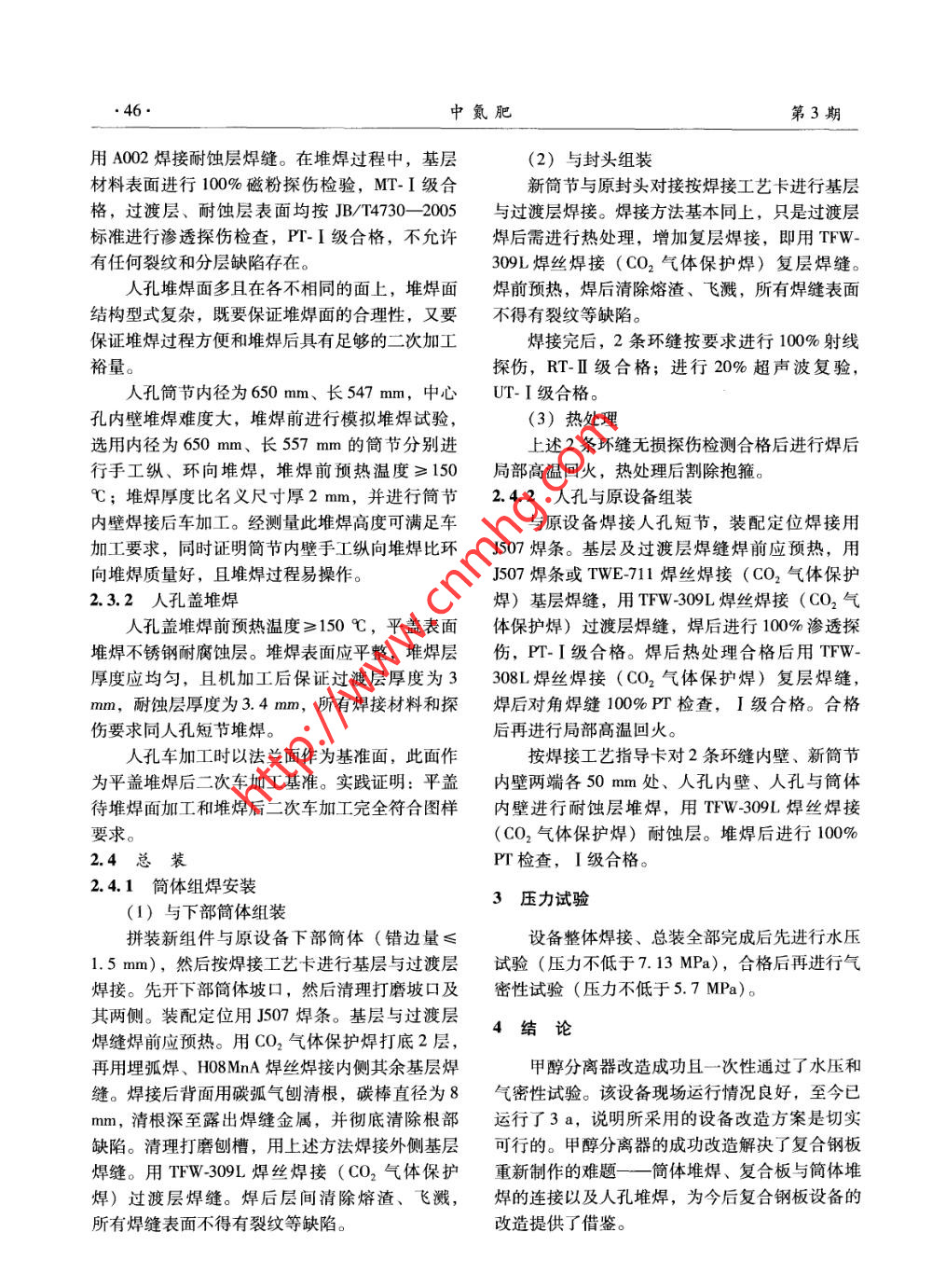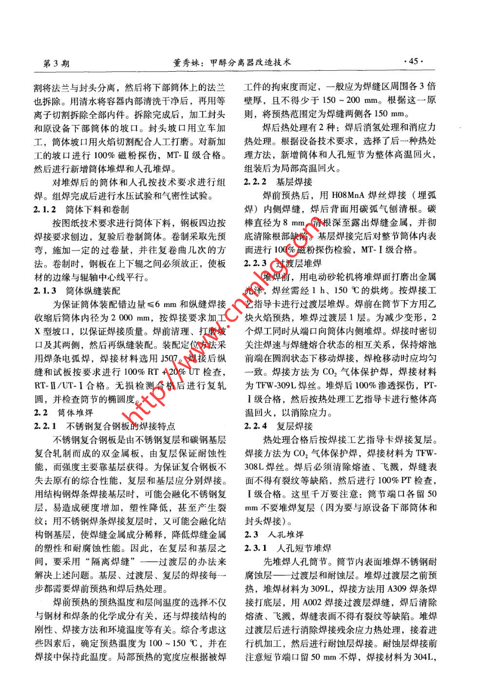 第3期中氮肥No.32012年5月M-Sized Nitrogenous Fertilizer ProgressMay 2012設(shè)備管理與改造茶甲醇分離器改造技術(shù)董秀妹(上海太平洋化工設(shè)備工程有限公司,上海200241)[中圖分類號] TQ 223.12*1 [文獻標(biāo)識碼] B [文章編號] 1004 -9932(2012)03 - 0044 -03原甲醇分離器是二類壓力容器,雖已使用多線探傷,RT-II 級合格,并進行20%超聲波復(fù)年仍完好無損,因生產(chǎn)需要準(zhǔn)備將其再利用到其驗,UT-I級合格。C、D焊縫應(yīng)進行100%滲透他地方。設(shè)備主要材料為復(fù)合鋼板(16MnR +檢測并 PT- I級合格。0Cr18Ni9),質(zhì)量19.58 t。若整個設(shè)備重新制作更換,預(yù)算約120萬元左右,上海太平洋化工設(shè)備工程有限公司采取的是利用舊設(shè)備進行技術(shù)改造:拆除原甲醇分離器封頭上的-端筒節(jié)法蘭和下部簡體上的法蘭,內(nèi)件也全部拆除,新增一段長約696 mm的簡體和垂吊人孔( 見圖1)。由于該設(shè)備簡體材料為復(fù)合鋼板,故新增簡體和人孔均需要堆焊,難度極大。上海 太平洋化工設(shè)備工程有限公司經(jīng)過細(xì)致的工藝技術(shù)準(zhǔn)備,制定了縝密的改造方案,使設(shè)備改造過程非常順利,最終水壓、氣密性試驗一次成功。圖1甲醇分離器改造后 結(jié)構(gòu)(3)設(shè)備基層和過渡層焊后需進行消除應(yīng)1結(jié)構(gòu)和主要 參數(shù)力的熱處理,熱處理后再焊耐蝕層。除耐蝕層焊甲醇分離器改造后結(jié)構(gòu)如圖1。筒體規(guī)格接外,不得進行其他焊接。φ2 000 mmx(38 +4) mm,H=696 mm,筒體及(4)新增部件組裝完成并進行探傷檢查合垂直吊蓋人孔材料均為16MnR + 0Crl8Ni9 ( 堆格后,整臺設(shè)備應(yīng)進行7.13 MPa水壓試驗和焊層)。設(shè)備工作介質(zhì)為H2、N2、 CO2、 CH4、5. 7 MPa氣密性試驗。CH,OH、H20等,主要技術(shù)參數(shù):設(shè)計壓力5.7MPa,工作壓力4.67 MPa,設(shè)計溫度55 C,有2改造關(guān)鍵及技術(shù)保證效容積16.8 m',腐蝕裕量為0。2.1筒體改造工藝主要設(shè)計要求及無損探傷要求如下。2.1.1改造方案的確定(1) 新增簡體基層材料16MnR逐張進行對原設(shè)備按要求先進行焊接工藝評定,合格100%超聲波檢測并UT-HI級合格,鋼板要求正后再改造。因為要利用舊封頭和下部簡體,故在火狀態(tài)供貨。切割前封頭與原設(shè)備下部筒體都用φ2088mmx(2)所有A類和B類焊縫應(yīng)進行100%射φ2150mmx200mm抱箍固定,防止變形。為[收稿日期] 2011-08-01[修稿日期] 201109-21確保原設(shè)備用等離子切割和火焰切割的安全,先[作者簡介]董秀妹( 1962-),女,工程師,現(xiàn)從事壓力容器拆除原法蘭上的所有螺栓螺母,將上部管箱制造檢驗工作。(即帶有法蘭的封頭)全部拆除后,用等離子切.第3期董秀妹:甲醇分離器改造技術(shù).,.45●割將法蘭與封頭分離,然后將下部簡體上的法蘭工件的拘束度而定, - 般應(yīng)為焊縫區(qū)周圍各3倍也拆除。用清水將容器內(nèi)部清洗干凈后,再用等璧厚,且不得少于150 ~200 mm。根據(jù)這一原離子切割拆除全部內(nèi)件。拆除完成后,加工封頭則,將預(yù)熱范圍定為焊縫兩側(cè)各150 mm。.和原設(shè)備下部簡體的坡口。封頭坡口用立車加焊后熱處理有2種:焊后消氫處理和消應(yīng)力工,簡體坡口用火焰切割配合人工打磨。對新加熱處理。根據(jù)設(shè)備技術(shù)要求,選擇了后一種熱處工的坡口進行100%磁粉探傷,MT-I 級合格。理方法,新增簡體和人孔短節(jié)為整體高溫回火,然后進行新增簡體堆焊和人孔堆焊。組裝后為局部高溫回火。對堆焊后的簡體和人孔按技術(shù)要求進行組2.2.2基層焊接焊。組焊完成后進行水壓試驗和氣密性試驗。焊前預(yù)熱后,用H08MnA焊絲焊接(埋弧2.1.2簡體下料和卷制焊)內(nèi)側(cè)焊縫,焊后背面用碳弧氣刨清根。碳按圖紙技術(shù)要求進行簡體下料,鋼板四邊按棒直徑為8 mm,清根深至露出焊縫金屬,并徹焊接要求刨邊,復(fù)驗后卷制簡體。卷制采取先預(yù)底清除根部缺陷?;鶎雍附油旰髮φ?jié)簡體內(nèi)表彎,施加一定的過卷量,并往復(fù)卷曲幾次的方面進行100%磁粉探傷檢驗,MT- I級合格。法。卷制時,鋼板在上下輥之間必須放正,使板2.2.3過渡層堆焊材的邊緣與輥軸中心線平行。堆焊前,用電動砂輪機將堆焊面打磨出金屬2.1.3簡體縱縫裝配光澤,焊絲需經(jīng)1 h、150 C的烘烤。按焊接工為保證簡體裝配錯邊量≤6 mm和縱縫焊接藝指導(dǎo)卡進行過渡層堆焊。焊前在簡節(jié)下方用乙收縮后簡體內(nèi)徑為2 000 mm,按焊接要求加工炔火焰預(yù)熱,堆焊過渡層1層。為減少變形,2X型坡口,以保證焊接質(zhì)量。焊前清理、打磨坡個焊工同時從端口向簡體內(nèi)側(cè)堆焊。焊接時密切口及其兩側(cè),然后再縱縫裝配。裝配定位方法采關(guān)注焊速與焊縫熔合狀態(tài)的相互關(guān)系,保持熔池用焊條電弧焊,焊接材料選用J507。焊接后縱前端在圓潤狀態(tài)下移動焊接,焊槍移動時應(yīng)均勻縫和試板按要求進行100% RT +20% UT檢查,一致。 焊接方法為CO2氣體保護焊,焊接材料RT-II/UT-I合格。無損檢測合格后進行復(fù)軋為TFW -309L焊絲。堆焊后100%滲透探傷,PT-圓,并檢查簡節(jié)的橢圓度。I級合格,然后按熱處理工藝指導(dǎo)卡進行整體高2.2筒體堆焊溫回火,以消除應(yīng)力。2.2.1不銹鋼復(fù) 合鋼板的焊接特點2.2.4復(fù)層焊接不銹鋼復(fù)合鋼板是由不銹鋼復(fù)層和碳鋼基層熱處理合格后按焊