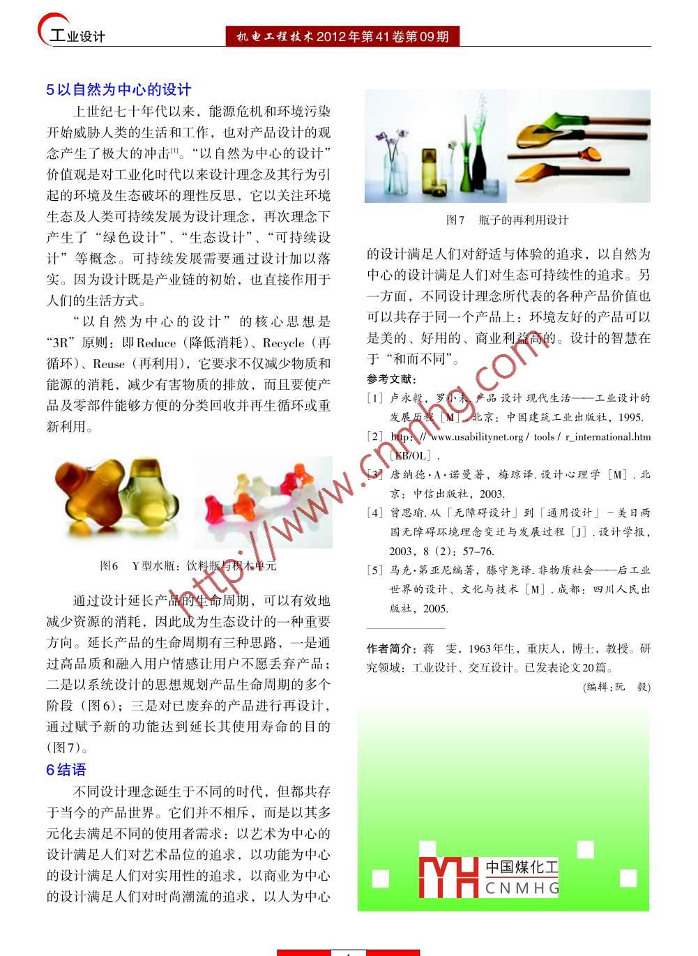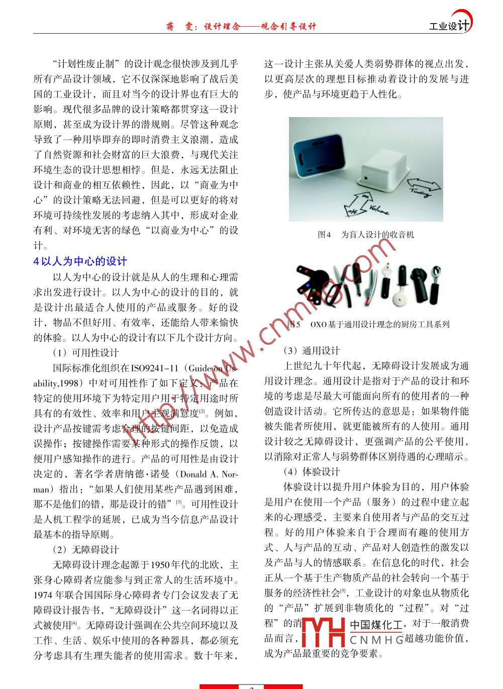 機電工程技術(shù)2012年第41卷第09期工業(yè)設(shè)計)DOI: 10. 3969 /j. issn. 1009- -9492. 2012. 09. 001設(shè)計理念一-觀念引導(dǎo)設(shè)計蔣雯(廣東工業(yè)大學藝術(shù)設(shè)計學院,廣東廣州 510090)摘要:將工業(yè)設(shè)計的價值觀念歸納為以藝術(shù)為中心、以功能為中心、以商業(yè)為中心、以人為中心和一自然為中心五種設(shè)計理念,闡述了這五種設(shè)計理念的基本思想和構(gòu)成,并通過實例說明其特征。關(guān)鍵詞:工業(yè)設(shè)計;設(shè)計理念;產(chǎn)品價值中圖分類號: TB47文獻標識碼: A文章編號: 1009- 9492 (2012) 09- 00 -03Design Ideology: Thought Guide DesignJIANG Wen(Guangdong University of Technology,Guangzhou5 10090,China)Abstract: The values of industrial design were boiled down to five different types of design ideology: art-centered design,function- -centered design, business- -centered design, human- centered design and nature- -centered design. This article explained thebasic idea and the constitution of these five ideologies,and used examples to describe the features of them.Key words: industrial design; design ideology ; product value0前言的核心和精華。發(fā)展到今天,藝術(shù)已成為人類生麥金托什設(shè)計的高背椅是設(shè)計史.上的經(jīng)典,活不可分割的部分。但若從人機工程學的角度去評價,卻又乏善可“以藝術(shù)為中心”的設(shè)計,更多的強調(diào)產(chǎn)品的陳,然而,人機關(guān)系上的缺陷并不能削弱其藝術(shù)藝術(shù)風格和形式感。設(shè)計從美學出發(fā),體現(xiàn)幽風格上的成就。一個產(chǎn)品的價值,是由多個層面默、美感或者語義。美是人類的永恒追求,追求構(gòu)成的,包括藝術(shù)層面、功能層面、商業(yè)層面、藝術(shù)價值的設(shè)計,會讓人們走向藝術(shù)化的、充滿使用層面和生態(tài)層面,對產(chǎn)品的評價,并非- -定詩意的生活。要面面俱到,好看的未必好用,好用的未必有設(shè)計對于藝術(shù)的追求從來沒有停止過,不同趣。設(shè)計往往是從一個層面出發(fā),兼顧其他層時期有不同的美學形式。傳統(tǒng)的美學形式注重細面,設(shè)計的出發(fā)點不同,設(shè)計的價值體現(xiàn)也不部的裝飾,追求精雕細琢(圖1 (a) ); 現(xiàn)代設(shè)計同。工業(yè)設(shè)計在其發(fā)展歷程中產(chǎn)生了以藝術(shù)為中則更強調(diào)形態(tài)對功能的反映,追求簡潔的輪廓心、以功能為中心、以商業(yè)為中心、以人為中(圖1(b));上世紀六、七十年代出現(xiàn)的波普心、以及以自然為中心五種設(shè)計理念,不同的設(shè)風潮和后現(xiàn)代主義,則表現(xiàn)為通俗的趣味性.計理念代表了不同的產(chǎn)品價值觀,由此產(chǎn)生出豐(圖1 (c) )和強調(diào)形態(tài)的隱喻(圖1 (d) )。富多彩的產(chǎn)品世界。2以功能為中心的設(shè)計1以藝術(shù)為中心的設(shè)計功能是產(chǎn)品存在的基礎(chǔ),按滿足人類不同需藝術(shù)是人類的-.種基本的和經(jīng)常的精神活求層面,盲Vf中國煤化蘭能和精神功能,動,也是使人類區(qū)別于其他物種的最重要的因素以功能為FHCNMHG滿足人對產(chǎn)品物之一。藝術(shù)促進人類文化的形成,同時也是文化質(zhì)功能需水而進仃的設(shè)計,是現(xiàn)代主義設(shè)計的特收稿日期: 2012- 08 -01(工業(yè)設(shè)計機電工程技術(shù)2012年第41卷第09期(圖2 (b) )是功能主義設(shè)計的典范,歷經(jīng)數(shù)十年,依然在生產(chǎn)銷售?;诠δ苤髁x美學觀發(fā)展而來的極簡主義是現(xiàn)今許多著名品牌產(chǎn)品所采用的設(shè)計風格,這種簡單純粹的審美觀念已經(jīng)深人人心(圖3)。(a)路易十五椅子( 十八世紀)(b) 飄帶椅(1966)(a)蘋果鼠標(b)無印良品的CD播放機圖3極簡設(shè)計以功能為中心的設(shè)計需要避免的兩個誤區(qū),.是對裝飾的絕對排斥,忽視產(chǎn)品的情感價值;(e) 吹氣椅(1969)(d)后現(xiàn)代風格椅子( 1984)二是讓一個產(chǎn)品盲目擠進很多功能,導(dǎo)致產(chǎn)品的過度復(fù)雜化。圖1設(shè)計風格變遷3以商業(yè)為中心的設(shè)計征之--。現(xiàn)代主義是主張設(shè)計要適應(yīng)現(xiàn)代大工業(yè)20世紀50年代,迅速上升的經(jīng)濟使美國進人生產(chǎn)和生活需要,以講求設(shè)計功能、技術(shù)和經(jīng)濟了富裕社會,為了在激烈的競爭中占領(lǐng)市場和迎效益為特征的學派,其最為重要的理念便是功能合不斷求新求異的消費者的需求,通用汽車公司主義。功能主義就是要在設(shè)計中注重產(chǎn)品的功能推出了“計劃性廢止制”(Planned obsoles-性與實用性,與實用功能無關(guān)的裝飾被認為是多cence),即在設(shè)計新的汽車式樣時,必須有計劃余的。地考慮以后幾年間不斷更換部分設(shè)計,使汽車最功能主.義并非排斥藝術(shù),它拒絕的只是表面少每2年有一次小的變化,每3- 4年有一次大的的裝飾,事實上它建立了新的崇尚簡潔的美學.變化,造成有計劃的“式樣”老化過程。其目的觀,追求“一種由適用性和簡潔性而來的干干凈是促使消費者追隨新的潮流,放棄老的式樣,促凈的有沒和雅致”"。馬歇. 布勞耶(Marcel進市場銷售額上升。這是“設(shè)計追隨銷售”的一Breuer)設(shè)計的瓦西里鋼管椅(圖2 (a) )和種體現(xiàn),也是一種典型的 “以商業(yè)為中心”的設(shè)保羅●漢寧森( Paul Henningsen)設(shè)計的PH燈計策略。就其特征而言,所謂“計劃性廢止制
