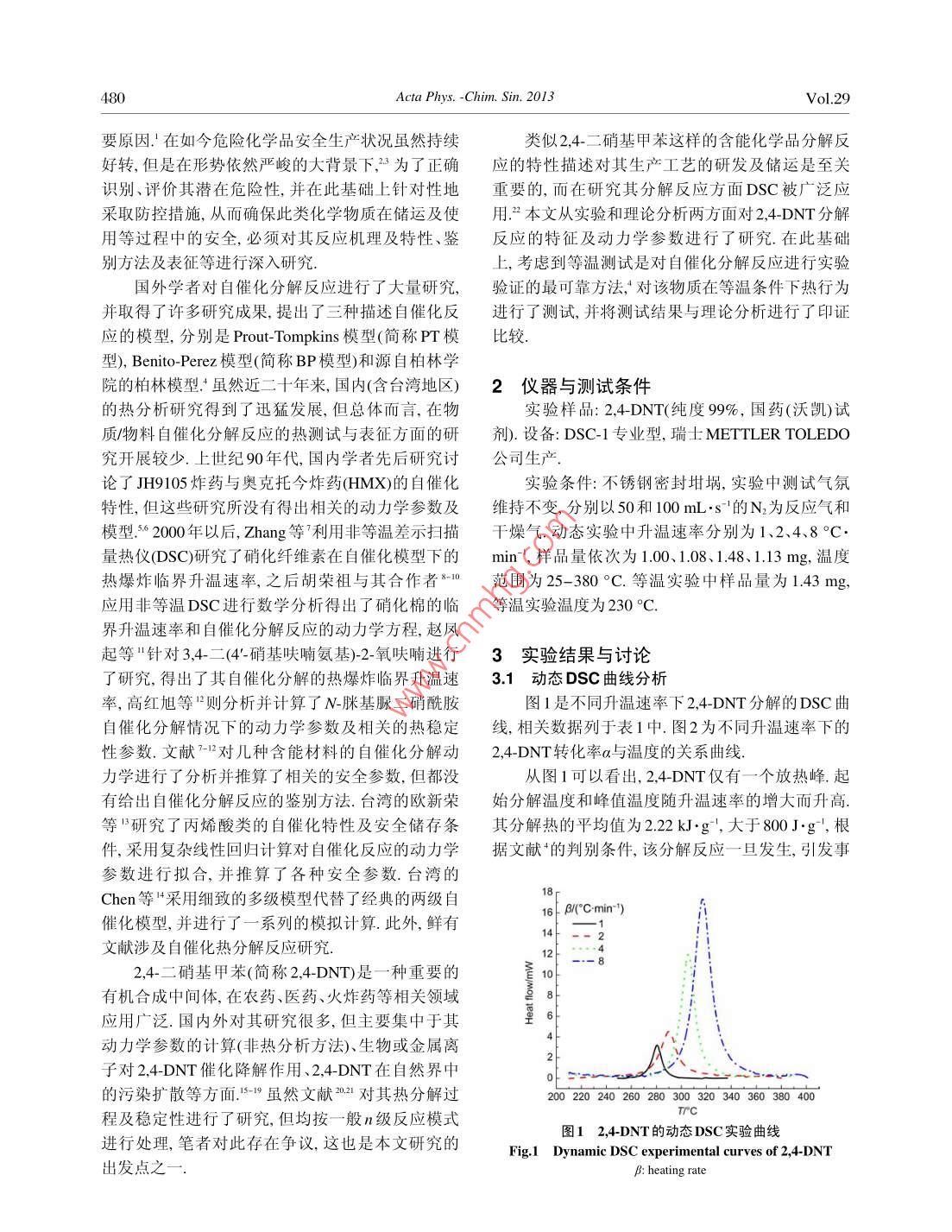 物理化學(xué)學(xué)報( Wuli Huaxue Xuebao)MarchActa Phys. -Chim. Sin. 2013, 29 (3), 479- -485479[Article]doi: 10.3866/PKU.WHXB201212141www.whxb.pku.edu.cn2,4-二硝基甲苯熱解自催化特性鑒別及其熱解動力學(xué)鮑士龍.陳網(wǎng)樺“陳利平高海素呂家育(南京理工大學(xué)化工學(xué)院安全工程系,南京210094)摘要:為研究2,4-二硝基 甲苯(2,4-DNT)的熱危險性及其分解反應(yīng)的特征,利用差示掃描量熱儀(DSC)對該物質(zhì)進行了動態(tài)掃描測試,得到其起始分解溫度To范圍為272.4-303.5。C,分解熱OH約為2.22 kJ.g*.在此基礎(chǔ)上,采用瑞士安全技術(shù)與保障研究所提出的快速鑒別法(瑞士方法)及數(shù)值模擬技術(shù),對其分解反應(yīng)的特性參數(shù)進行了推算,結(jié)果表明其分解具有自催化性.采用Malek法分析了該物質(zhì)分解反應(yīng)的最概然機理函數(shù)并得出了相關(guān)動力學(xué)參數(shù),表明其分解具有自催化性且符合SestakBerggren雙參數(shù)自催化模型(SB模型),這與瑞士方法所得結(jié)論一致.采用等溫DSC測試獲得了該物質(zhì)的‘鐘形’熱解曲線,從而驗證了兩種方法的結(jié)論.關(guān)鍵詞:自 催化分解反應(yīng);差示掃描量熱儀; 快速鑒別; Malek法; 分解反應(yīng)動力學(xué)中圖分類號: 0642; 0643ldentification and Thermokinetics of Autocatalytic ExothermicDecomposition of 2,4-DinitrotolueneBAO Shi-LongCHEN Wang-Hua°CHEN Li-PingGAO Hai-SuLU Jia-Yu(Department of Safety Engineering, Institute of Chemical Technology, Nanjing University of Technology and Science,Nanjing 210094, P R. China)Abstract: The thermal stability and autocatalytic decomposition of 2,4-dinitrotoluene (2,4-DNT) isinvestigated under dynamic and isothermal conditions using difterential scanning calorimetry (DSC). Thetemperature range of initial exothermic temperature (To) is 272.4-303.5。C, and its decomposition enthalpy(OH) is about 2.22 kJ . g'. An identification method based on a numerical simulation technique from theSwiss Institute for the Promotion of Safety and Security (Swiss method) is used to determine thecharacteristic parameters of the decomposition reaction, revealing that the decomposition of 2,4-DNT ispotentially autocatalytic. The Malek method is used to determine the most probable mechanism functionand kinetic parameters of 2,4-DNT decomposition. The Sestak-Berggren model with two parameters issuitable to describe the autocatalytic decomposition of 2,4-DNT, which is consistent with the results of theSwiss method and isothermal experimental results. Isothermal DSC experiments confirmed that thedecomposition of 2,4-DNT is autocatalytic.Key Words: Autocatalytic decomposition reaction; Differential scanning calorimeter; Rapididentification; Malek method; Decomposition kinetics1引言很長--段時間內(nèi)都不會出現(xiàn)明顯的溫升現(xiàn)象,而一自催化分解反應(yīng)是指分解產(chǎn)物在反應(yīng)過程中旦產(chǎn)生明顯溫升,則迅速發(fā)展為熱爆炸.這是導(dǎo)致充當(dāng)催化劑的反應(yīng).與一般的具有n級動力學(xué)分解具有自反應(yīng)性的化學(xué)物質(zhì)(如爆炸性物質(zhì)、有機過氧反應(yīng)不同,自催化分解反應(yīng)在發(fā)生熱自燃熱爆炸前化物、自反應(yīng)性物質(zhì)等)易發(fā)生熱自燃與熱爆炸的重Reccived: September 28. 2012; Revised: December 13, 2012; Published on Web: December 14, 2012.'Corresponding author. Email: chenwh_ nust@ 163.com; Tel: +86-25-843 15526- 8005.The project was supported by the National Natural Science Foundation of China (51204099.國家自然科學(xué)基金(51204099)資助項目C Editorial office of Acta Physico Chimica Sinica480Acta Phys. -Chim. Sin. 2013Vol.29要原因.'在如今危險化學(xué)品安全生產(chǎn)狀況雖然持續(xù)類似2,4二硝基甲苯這樣的含能化學(xué)品分解反好轉(zhuǎn),但是在形勢依然嚴峻的大背景下,3為了正確應(yīng)的特性描述對其生產(chǎn)工藝的研發(fā)及儲運是至關(guān)識別、評價其潛在危險性,并在此基礎(chǔ)上針對性地重要的,而在研究其分解反應(yīng)方面DSC被廣泛應(yīng)采取防控措施,從而確保此類化學(xué)物質(zhì)在儲運及使用.”本文從實驗和理論分析兩方面對2,4-DNT分解用等過程中的安全,必須對其反應(yīng)機理及特性、鑒反應(yīng)的特征及動力學(xué)參數(shù)進行了研究.在此基礎(chǔ)別方法及表征等進行深入研究.上,考慮到等溫測試是對自催化分解反應(yīng)進行實驗國外學(xué)者對自催化分解反應(yīng)進行了大量研究,驗證的最可靠方法,對該物質(zhì)在等溫條件下熱行為并取得了許多研究成果,提出了三種描述自催化反進行了測試,并將測試結(jié)果與理論分析進行了印證應(yīng)的模型,分別是Prout-Tompkins模型(簡稱PT模比較.型), Benito-Perez模型(簡稱BP模型)和源自柏林學(xué)院的柏林模型:雖然近二十年來,國內(nèi)(含臺灣地區(qū))2儀器與測試條件的熱分析研究得到了迅猛發(fā)展,但總體而言,在物實驗樣品:2,4-DNT(純度9%,國藥(沃凱)試質(zhì)1物料自催化分解反應(yīng)的熱測試與表征方面的研劑).設(shè)備: DSC-1專業(yè)型,瑞士METTLER TOLEDO究開展較少.上世紀90年代,國內(nèi)學(xué)者先后研究討公司生產(chǎn).論了JH9105炸藥與奧克托今炸藥(HMX)的自催化實驗條件:不銹鋼密封坩堝,實驗中測試氣氛特性,但這些研究所沒有得出相關(guān)的動力學(xué)參數(shù)及維持不變,分別以50和100 mL.s'的N2為反應(yīng)氣和模型.502000年以后,Zhang等利用非等溫差示掃描干燥氣.動態(tài)實驗中升溫速率分別為1.2.4、8 °C.量熱儀(DS