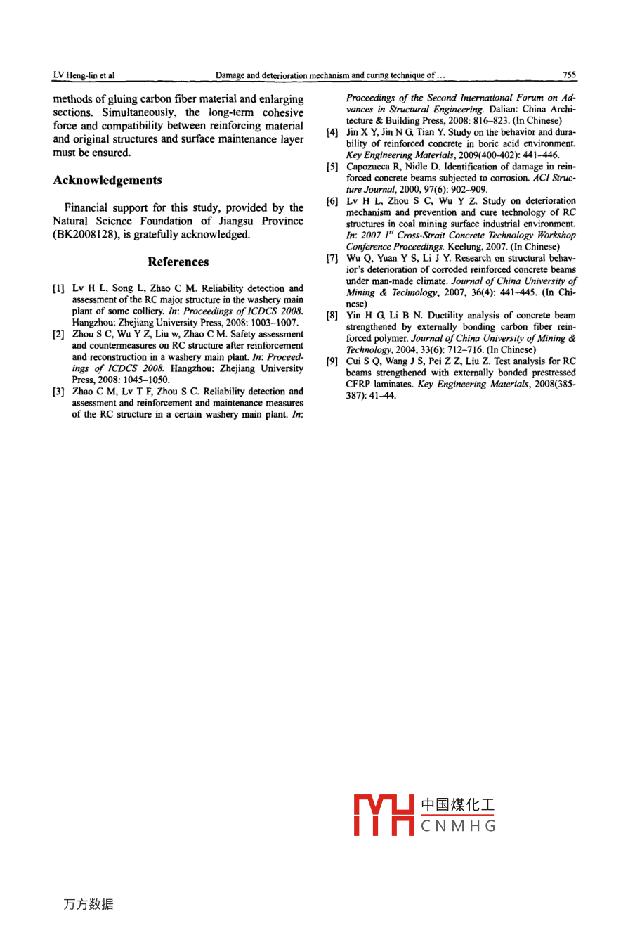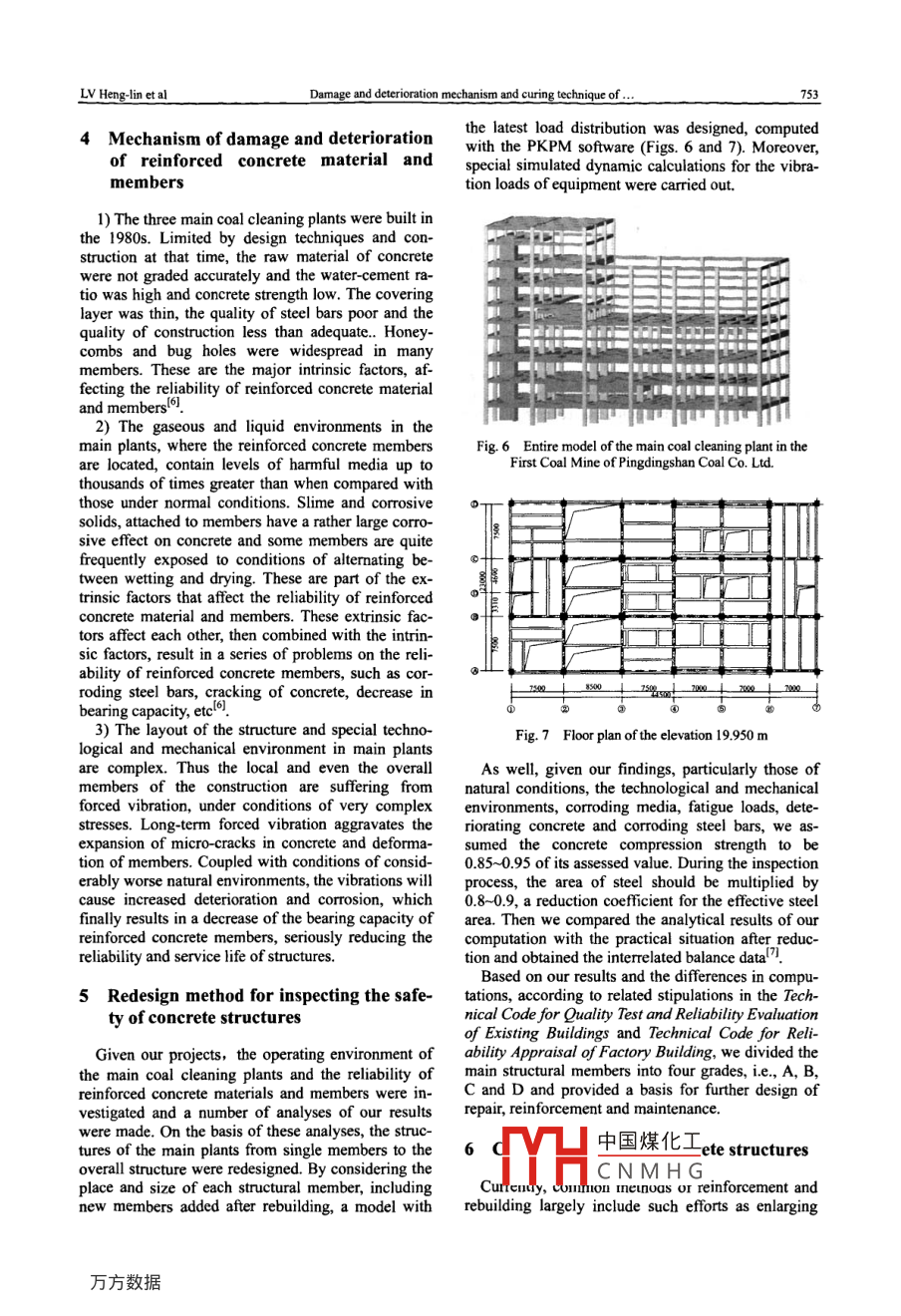 Availableonlineatwww.sciencedirect.comMINING. Science DirectSCIENCE ANDTECHNOLOGYELSEVIERMining Science and Technology 19(2009)0750-0755www.elsevier.com/locate/jcumtDamage and deterioration mechanism and curing technique ofconcrete structure in main coal cleaning plantsLV Heng-lin", ZHAO Cheng-ming, SONG Lei, MA Ying, XU Chun-huaSchool of Architecture and Civil Engineering, China University of Mining Technology, Xuzhou, Jiangsu 221116, China2State Key Laboratory for Geomechanics and Deep Underground Engineering, Xuzhou, Jiangsu 221008, chinaWuhan Design& Research Institute of Sinocoal International Engineering Group, Wuhan, Hubei 430064, ChinaAbstract: Concrete structures in main coal cleaning plants have been rebuilt and reinforced in the coal mines of the Shanghai Da-nun Energy Sources Co. Ltd, the first colliery of the Pingdingshan Coal Co. Ltd. and the Sanhejian mine of the Xuzhou MiningGroup Co. Ltd. In these projects, the operating environment and reliability of concrete structures in the main plants of the threeompanies were investigated and the safety of the structures inspected. Qualitative and quantitative analyses were made on the spe-cial natural, technological and mechanical environments around the structures. On the basis of these analyses, we discuss thelong-term, combined actions of the harsh natural (corrosive gases, liquids and solids) and mechanical environments on concretestructures and further investigated the damage and deteriorating mechanisms and curing techniques of concrete structures in thmain coal cleaning plants. Our study can provide a theoretical basis for ensuring the reliability of concrete structures in main coalcleaning plantsKeywords: main coal cleaning plants; concrete structure; operating environment; reliability detection and inspection; damage anddeteriorating mechanisms; curing technique1 Introductioncontent have improved or modified some large-scalevibration equipment in the main plants of the threeThe main coal cleaning plants of the Shanghai Da- companies, where partial members needed to be re-n Energy Sources Co. Ltd, the first coal mine of built. To ensure that the plants can meet their re-the Pingdingshan Coal Co. Ltd. and the Sanhejian quirements in terms of function and durability aftercoal mine of the Xuzhou Mining Group Co. Ltd, the improvements, we have carried out a comprehenbuilt during the 1980s have served for more than 20 sive study of the natural environments, the technolyears( Fig. I). The special uses and processes of main ogy used and the mechanical environment and thecleaning plants worsen their intemal environment. reliability of reinforced concrete members in threeThey result in increases in the amounts of corrosive main plants between 2005 to 2008. Based onases and liquids and solids accumulate on member these studies and assessments, structures were redes-surfaces with the frequent alternation of wetting and igned for checking the safety of relevant membersdrying( Fig. 2). Simultaneously, vibration loads from and overall structures. Further improvements for re-power equipment have serious consequences. Thus pair, reinforcement and maintenance were designedmost reinforced concrete members exhibit serious separately. The damage and deteriorating mechanismdamage and deterioration phenomena, such as con- of concrete structures in the main plants, which showcrete spalling, clouds of micro-cracks, crack propaga- the worst natural and special mechanical environ-tion, exposed steel corrosion etc( Fig. 3). Many hid- ments were studied and effective reinforcement andden dangers already exist in normal production and maintenance techniquesdiscussedthe safety of concrete members.structures which had been damaged or allowed toIn order to meet the requirements of transforming deteriorate. Thus the long-term safety and durabilitycoal prepararation processes, recent improvements in of the structures can now be ensuredthe yield and quality of coal and reductions in slime中國煤化工Received 1I February 2009: accepted 26 May 2009CNMHGProject BK2008128 supported by the Natural Science Foundation of Jiangsu ProvinceCorrespondingauthor.Tel:+86-516-83590601;E-mailaddress:henglinlv@cumt.edu.cnFig. I Picture of main coal cleaning plantFig 2 Accumulation of corrosive media in main coal cleaning plantFig 3 Serious damage and deterioration of reinforced concrete membersTable 1 Results of gases discovered in the environmentLocation00141Outside Sanhejian main plant00191Inside Datun main plant00181Outside Datun main pla00152021130.05620.0824Table 2 Results of liquids discovered in the environmentLocationSO4H valueInside Sanhejian main plant1319Outside Sanhejian main plantOutside Pingdingshan main plant16233Inside Datun main plant2 Major results and analyses of operating structures of the main coal cleaning plants are locatedenvironmentsis the worst. The levels of many corrosive gaseousmedia such as H,S, HCl, SO, Cl and others areCompared with more general buildings, the main dozens to hundreds times higher than under normalcoal cleaning plants have a unique operating envi- conditions. According to the Code for Anticorrosionronment which entail the worst natural. as well as花- nd judging by thecomplex technological and mechanical environments. corro中國煤lbers, the levelsThe results discovered and analyses of the operating of theCNMHGnsidered moderateenvironments are as followsI)The gaseous environment in which the concrete2)The liquid environment of the main plants752Mining Science and TechnologVol 19 No 6rather severe Levels of some corrosive ions such as1)Honeycombs and bug holes are universalCl, NO3, SO4, F and so on are several, hundreds many reinforced concrete members with manyor even thousands of times higher than under normal anomalous microscopic cracks and corroding expanconditions. According to the Code for Anticorrosion sion cracks along steel bars with a maximum width ofDesign of Industrial Constructions, the levels of cor- 5 mm( Fi