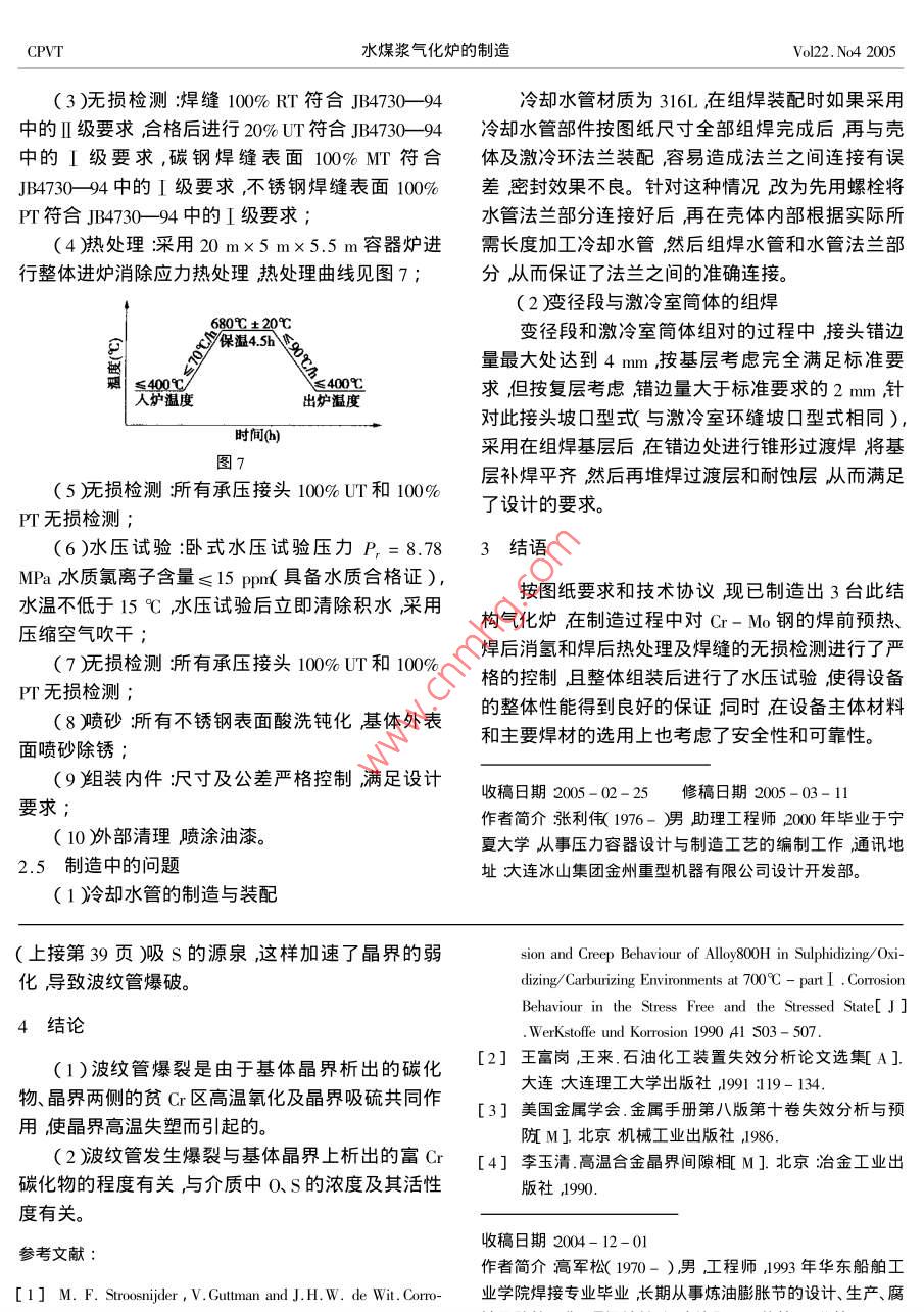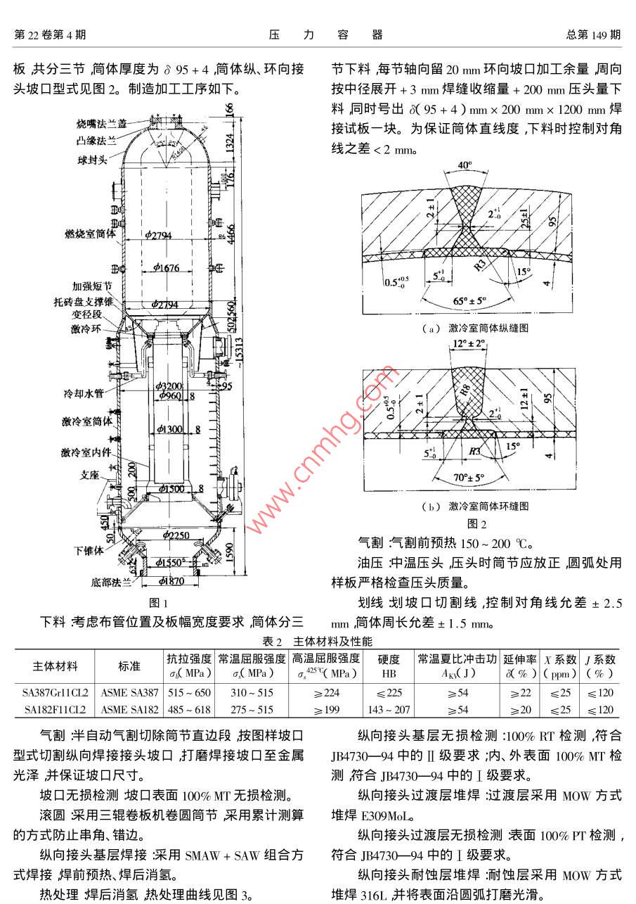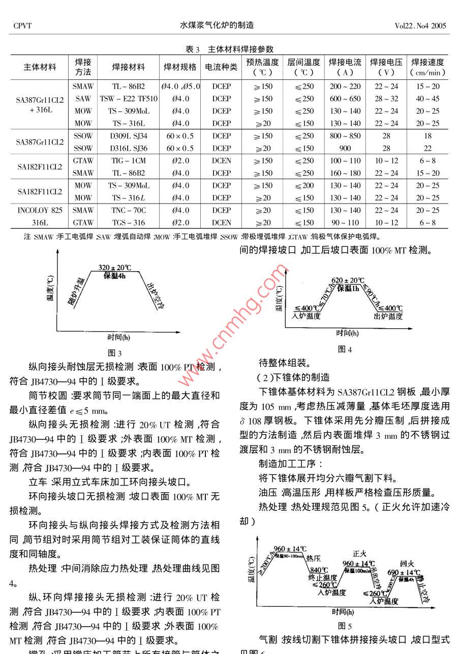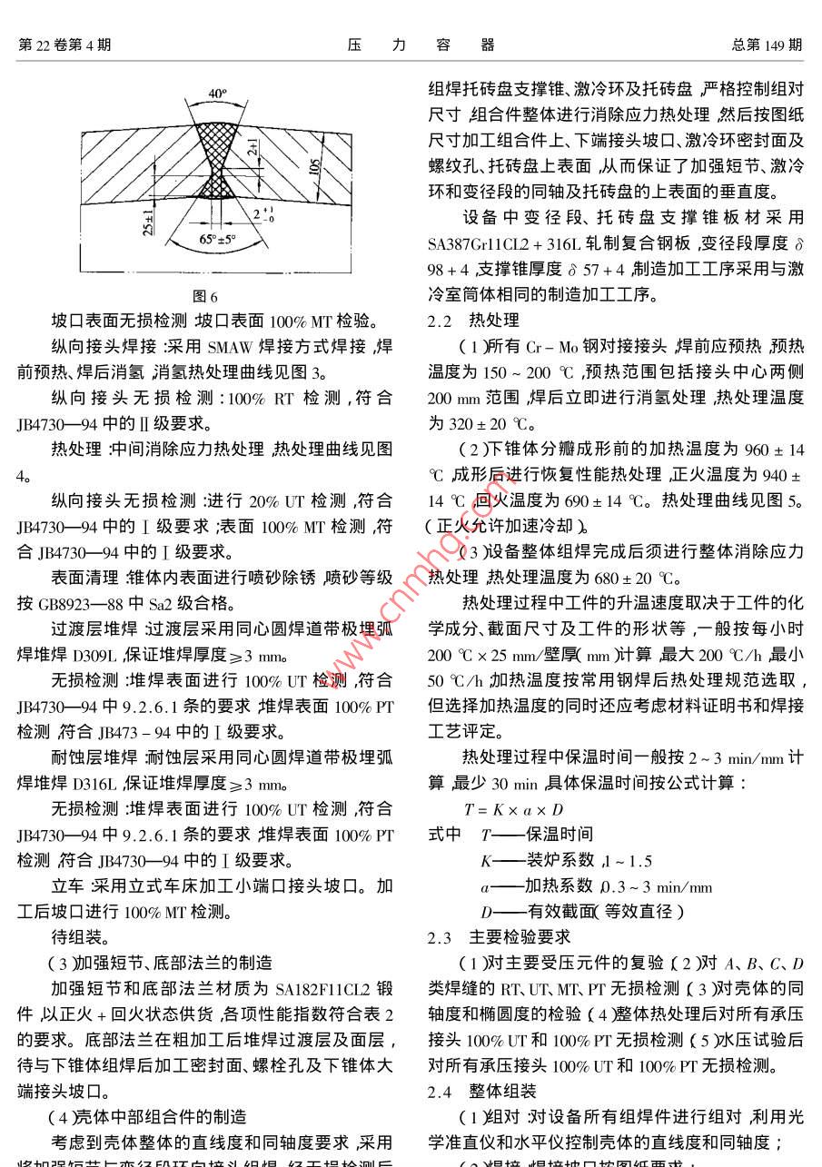 制造與安裝水煤漿氣化爐的制造張利偉都吉哲張暉李玉虎(大連冰山集團金州重型機器有限公司遼寧大連116100)摘要介紹了氣化爐的制造過程和特點從而闡述了加工、焊接和熱處理在Cr-Mo鋼設(shè)備制造過程中的重要性。關(guān)鍵詞制造組裝焊接熱處理中圖分類號:TQ054文獻標識碼 :B文章編號:1001 - 4837( 2005 )04 - 0026- 05Manufacture of Water GasifierZHANG Li- wei ,DU Ji- zhe ZHANG Hui LI Yu- hu( Dalian Bingshan Group Jinzhou Heavy Machinery Co. ,Ltd. , Dalian 116100 China )Abstract :This article introduced the gasifiter' s procedures and specialties of manufacture . Consequently exati-ated the importent of the processing ,welding and heat treatment in the procedures of manufacture of the Cr -Mo steal equipment.Key words fabrication ;血together iwelding heat treatment心線同軸度偏差不大于3 mm托磚盤水平度公差為前言土2 mm;設(shè)備制造完畢不銹鋼表面須按照水煤漿氣化爐是陜西渭河煤化工集團有限公司HG20584- 1998 中的10. 1.4條進行酸洗鈍化處理。年產(chǎn)20萬t甲醇裝置中的關(guān)鍵設(shè)備,該設(shè)備總高表1設(shè)計參數(shù)15.3m設(shè)備有內(nèi)件結(jié)構(gòu)如圖1所示。設(shè)備操作溫項目參數(shù)度較高燃燒室殼體和激冷室殼體基層材料均采用操作壓力( MPa)6.5ASME規(guī)范材料SA387Gr11CL2激冷室部分采用復(fù)設(shè)計壓力( MPa)6.9操作溫度( C)252合鋼板復(fù)層材料為SA - 240- 316L,下錐體和底部設(shè)計溫度( C )大直徑法蘭采用堆焊結(jié)構(gòu),過渡層帶極堆焊腐蝕裕度( mm)6/3/0309MoL耐蝕層堆焊316L堆焊總厚度不小于6 mm ,焊縫系數(shù)耐蝕層厚度不小于3 mm相關(guān)參數(shù)見表1~3。水壓試驗壓力( MPa)8.63( 立式)介質(zhì)H2、Co. C02、H20、HS. N2、爐渣1制造技術(shù)要求設(shè)備主體上所有承壓焊縫均采用全焊透結(jié)構(gòu);2主要制造工藝及檢驗水壓試驗用水的氯離子含量小于15 ppm,水溫不低2.1主要零 部件的制造于15C燃燒室筒體和激冷室筒體圓度公差為土5(1)激冷室筒體的制造mm直線度公差在3 m范圍內(nèi)為土3 mm殼體長度筒體板材采用SA387Gr11CL2 + 316L軋制復(fù)合第22卷第4期玉力容器總第149期板共分三節(jié)筒體厚度為δ 95+4筒體縱、環(huán)向接節(jié)下料每節(jié)軸向留20 mm環(huán)向坡口加工余量周向頭坡口型式見圖2。制造加工工序如下。按中徑展開+3 mm焊縫收縮量+ 200 mm壓頭量下料同時號出8(95+4)mmx200mmx1200mm悍燒嘴法蘭蓋接試板一塊。為保證筒體直線度,下料時控制對角凸緣法蘭線之差<2mmo球封頭40°20/王燃燒室簡體.中2794e中16762X150l0.5105加強短節(jié)托磚盤支撐錐中279465°士5°變徑段激冷環(huán)(a)激冷室簡體縱縫圖DH自12°+2°3200冷卻水管中960QJ8、H激冷室簡體l 1300.815°激冷室內(nèi)件寸支座_70°士5°a大1500.8(b)激冷室筒體環(huán)縫圖圖2中2250氣割氣割前預(yù)熱150~200 C。下錐體150-0003油壓:中溫壓頭,壓頭時筒節(jié)應(yīng)放正圓弧處用底部法蘭01870↓樣板嚴格檢查壓頭質(zhì)量。圖1劃線劃坡口切割線,控制對角線允差土2.5下料考慮布管位置及板幅寬度要求簡體分三mm筒體周長允差士1.5 mm。表2主體材料及性能主體材料標準|抗拉強度常溫屈服強度高溫屈服強度硬度|常溫夏比沖擊功延伸率x系數(shù)|J系數(shù)o6 MPa)o( MPa)σ45"( MPa)HBAx(J)&% )|(ppm)(% )SA387Gr11CL2| ASME SA387 515~ 650310~ 515≥224≤225≥54≥22≤25≤120SA182F11CI2| ASME SA182| 485~ 618275 ~ 515≥199143 ~ 207≥20氣割半自動氣割切除筒節(jié)直邊段按圖樣坡口縱向接頭基層無損檢測:100% RT檢測,符合型式切割縱向焊接接頭坡口打磨焊接坡口至金屬JB4730- -94 中的I級要求;內(nèi)、 外表面100% MT檢光澤并保證坡口尺寸。測符合JB4730- -94 中的I級要求。坡口無損檢測坡口表面100% MT無損檢測??v向接頭過渡層堆焊:過渡層采用MOW方式滾圓采用三輥卷板機卷圓筒節(jié)采用累計測算堆焊E309MoL。的方式防止串角、錯邊。縱向接頭過渡層無損檢測表面100% PT檢測,縱向接頭基層焊接:采用SMAW + SAW組合方符合JB4730- -94 中的I級要求。式焊接焊前預(yù)熱、焊后消氫??v向接頭耐蝕層堆焊:耐蝕層采用MOW方式熱處理焊后消氫熱處理曲線見圖3。堆焊316L并將表面沿圓弧打磨光滑。CPVT水煤漿氣化爐的制造Vol22. No42005表3主體材料焊接參 數(shù)主體材料焊接焊接材料焊材規(guī)格電流種類預(yù)熱溫度|層間溫度 焊接電流| 焊接電壓| 焊接速度方法(C)(A)(V)(cm/min)SMAWTL- 86B204.0 ,05.0 DCEP≥150 .≤250200 ~ 22022~2415~20SA387Gr11C12| SAW TSW- F22 TF510|04.0DCEP≥150600~ 65028~3240~45+ 316LMOWTS - 309MoL130~ 14022~ 2420~25TS- 316L≥20≤150SsOwD309L SI3460x0.5800~ 850288SA387Gr11CI2sSowD316L SJ36900GTAWTIG- 1CM02.0DCEN100~ 11010~ 126~8SA182F11CI2160~ 18015~ 20TS- 309MoL0)4.0≤20020~ 2:≤150 .INCOLOY 825 SMAWTNC- 70C316LTGS- 31690~ 110注SMAW手工電弧焊SAW埋弧自動焊;Mow手工電弧堆焊ssow帶極埋弧堆焊;GTAW :鎢極氣體保護電弧焊。間的焊接坡口加工后坡口表面100% MT檢測。320去20C保溫4h色620主20C臣y保溫Ih第≤400C≤400C人爐溫度出爐溫度一時間(h)圖4圖3縱向接頭耐蝕層無損檢測表面100% PT檢測,待整體組裝。(2)下錐體的制造符合JB4730- -94 中的I級要求。筒節(jié)校圓:要求筒節(jié)同-端面上的最大直徑和下錐體基體材料為SA387Gr11CL2鋼板,最小厚度為105mm考慮熱壓減薄量基體毛坯厚度選用最小直徑差值e≤5 mm。.縱向接頭無損檢測:進行20%UT檢測,符合.δ108厚鋼板。下錐體采用先分瓣壓制后拼接成JB4730- 94中的I級要求;外表面100% MT