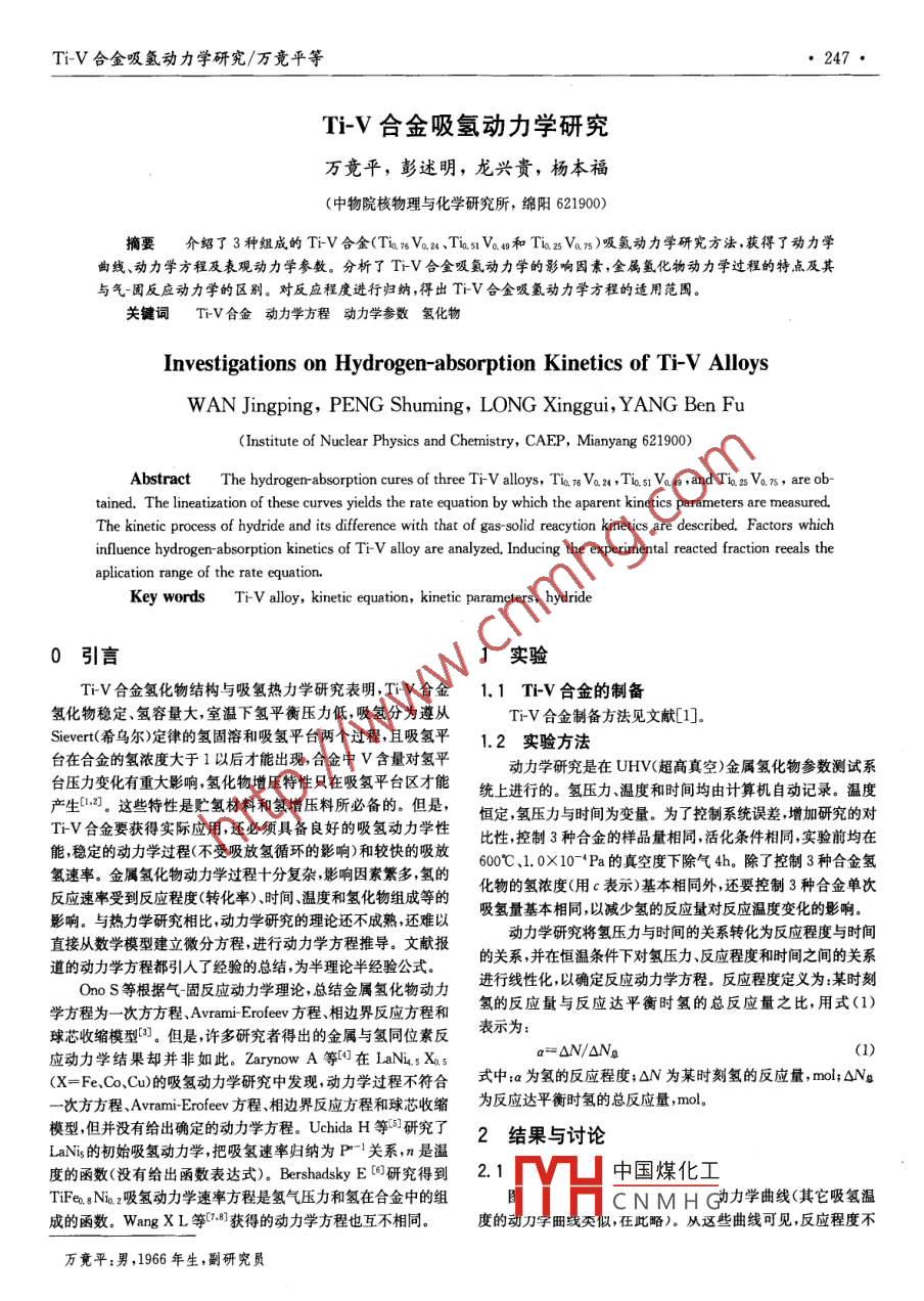 TiV合金吸氫動(dòng)力學(xué)研究/萬(wàn)竟平等·247Ti-V合金吸氫動(dòng)力學(xué)研究萬(wàn)竟平,彭述明,龍興貴,楊本福(中物院核物理與化學(xué)研究所,綿陽(yáng)621900摘要介紹了3種組成的TiV合金(TnVa、TasV和TVn)吸氬動(dòng)力學(xué)研究方法,獲得了動(dòng)力學(xué)曲線、動(dòng)力學(xué)方程及表觀動(dòng)力學(xué)參數(shù)。分析了TV合金吸動(dòng)力學(xué)的影響因素,金屬氫化物動(dòng)力學(xué)過(guò)程的特點(diǎn)及其與氣固反應(yīng)動(dòng)力學(xué)的區(qū)別。對(duì)反應(yīng)程度進(jìn)行歸納,得出TV合金吸氫動(dòng)力學(xué)方程的適用范圍關(guān)鍵詞TV合金動(dòng)力學(xué)方程動(dòng)力學(xué)參數(shù)氫化物Investigations on Hydrogen-absorption Kinetics of TiV AlloysWAN Jingping, PENG Shuming, LONG Xinggui, YANG Ben Fu( Institute of Nuclear Physics and Chemistry, CAEP, Mianyang 621900)Abstract The hydrogenrabsorption cures of three Tiv alloys, Ti, 7 Vo. 24, Tio s1 va 4s, and Tio. s Vo 7s, are obned. The lineatization of these curves yields the rate equation by which the aparent kinetics parameters are measuredThe kinetic process of hydride and its difference with that of gas-solid reaction kinetics are described. Factors whichinfluence hydrogen-absorption kinetics of Ti-v alloy are analyzed. Inducing the experimental reacted fraction reeals theaplication range of the rate equation.Key words Ti-V alloy, kinetic equation, kinetic parameters, hydride0引言1實(shí)驗(yàn)TiV合金氫化物結(jié)構(gòu)與吸氫熱力學(xué)研究表明,Ti合金1.1TV合金的制備氫化物穩(wěn)定、氫容量大,室溫下氫平衡壓力低,吸氫分為遵從TV合金制備方法見文獻(xiàn)[1]。Sievert(希烏爾)定律的氫固溶和吸氫平臺(tái)兩個(gè)過(guò)程,且吸氫平1.2實(shí)驗(yàn)方法臺(tái)在合金的氫濃度大于1以后才能出現(xiàn),合金中V含量對(duì)氫平動(dòng)力學(xué)研究是在UHv(超高真空)金屬氫化物參數(shù)測(cè)試系臺(tái)壓力變化有重大影響氫化物增壓特性只在吸氫平臺(tái)區(qū)才能統(tǒng)上進(jìn)行的。氫壓力溫度和時(shí)間均由計(jì)算機(jī)自動(dòng)記錄。溫度產(chǎn)生2。這些特性是貯氫材料和氫增壓料所必備的。但是,恒定氫壓力與時(shí)間為變量。為了控制系統(tǒng)誤差增加研究的對(duì)TV合金要獲得實(shí)際應(yīng)用,還必須具備良好的吸氫動(dòng)力學(xué)性比性控制3種合金的樣品量相同,活化條件相同實(shí)驗(yàn)前均在能穩(wěn)定的動(dòng)力學(xué)過(guò)程(不受吸放氫循環(huán)的影響)和較快的吸放屬氫化物動(dòng)力學(xué)過(guò)程十分復(fù)雜影響因素繁多,氫的600℃、1.0×10-Pa的真空度下除氣4h。除了控制3種合金氫反應(yīng)速率受到反應(yīng)程度(轉(zhuǎn)化率)、時(shí)間溫度和氫化物組成等的化物的氫濃度(用c表示)基本相同外,還要控制3種合金單次吸氫量基本相同,以減少氫的反應(yīng)量對(duì)反應(yīng)溫度變化的影響影響。與熱力學(xué)研究相比,動(dòng)力學(xué)研究的理論還不成熟,還難以動(dòng)力學(xué)研究將氫壓力與時(shí)間的關(guān)系轉(zhuǎn)化為反應(yīng)程度與時(shí)間直接從數(shù)學(xué)模型建立微分方程,進(jìn)行動(dòng)力學(xué)方程推導(dǎo)。文獻(xiàn)報(bào)道的動(dòng)力學(xué)方程都引入了經(jīng)驗(yàn)的總結(jié),為半理論半經(jīng)驗(yàn)公式的關(guān)系,并在恒溫條件下對(duì)氫壓力反應(yīng)程度和時(shí)間之間的關(guān)系OoS等根據(jù)氣固反應(yīng)動(dòng)力學(xué)理論,總結(jié)金屬氫化物動(dòng)力進(jìn)行線性化以確定反應(yīng)動(dòng)力學(xué)方程,反應(yīng)程度定義為:某時(shí)刻學(xué)方程為一次方方程, Avrami-erofeey方程相邊界反應(yīng)方程和氫的反應(yīng)量與反應(yīng)達(dá)平衡時(shí)氫的總反應(yīng)量之比,用式(l)球芯收縮模型。但是許多研究者得出的金屬與氫同位素反表示為:應(yīng)動(dòng)力學(xué)結(jié)果卻并非如此。 Zarynow A等在IaNi5X5=△N/(X=FeCo、Cu)的吸氫動(dòng)力學(xué)研究中發(fā)現(xiàn),動(dòng)力學(xué)過(guò)程不符合式中:a為氫的反應(yīng)程度;△N為某時(shí)刻氫的反應(yīng)量,mo△Na一次方方程、 Avrami-erofeey方程相邊界反應(yīng)方程和球芯收縮為反應(yīng)達(dá)平衡時(shí)氫的總反應(yīng)量,mol模型,但并沒(méi)有給出確定的動(dòng)力學(xué)方程。UhdH等研究了2結(jié)果與討論Lanis的初始吸氫動(dòng)力學(xué)把吸氫速率歸納為P關(guān)系,n是溫度的函數(shù)(沒(méi)有給出函數(shù)表達(dá)式)。 Bershadsky E回研究得到2.1中國(guó)煤化工TFe8N12吸氫動(dòng)力學(xué)速率方程是氫氣壓力和氫在合金中的組CNMH力學(xué)曲線(其它吸氫溫成的函數(shù)。 Wang X L等閭獲得的動(dòng)力學(xué)方程也互不相同。度的動(dòng)刀學(xué)田線類似,在此略)。從這些曲線可見,反應(yīng)程度不萬(wàn)竟平:男,1966年生,副研究員·248材料導(dǎo)報(bào)2007年5月第21卷專輯Ⅷ僅是時(shí)間的函數(shù),而且也是c值的函數(shù)所有低c值的動(dòng)力學(xué)曲 Tio 2s Vo.75的吸氫速率最慢。但是,還要考慮c值的影響。實(shí)驗(yàn)線均位于較高c值的動(dòng)力學(xué)曲線之上,表明隨著TiV合金吸氫時(shí)盡管力求把c值控制成一致,但實(shí)際操作難度大,原因是3種量的增加,吸氫的速率逐漸減慢。3種合金均具有很高的吸氫合金在同一溫度和c值下的H2平衡壓力