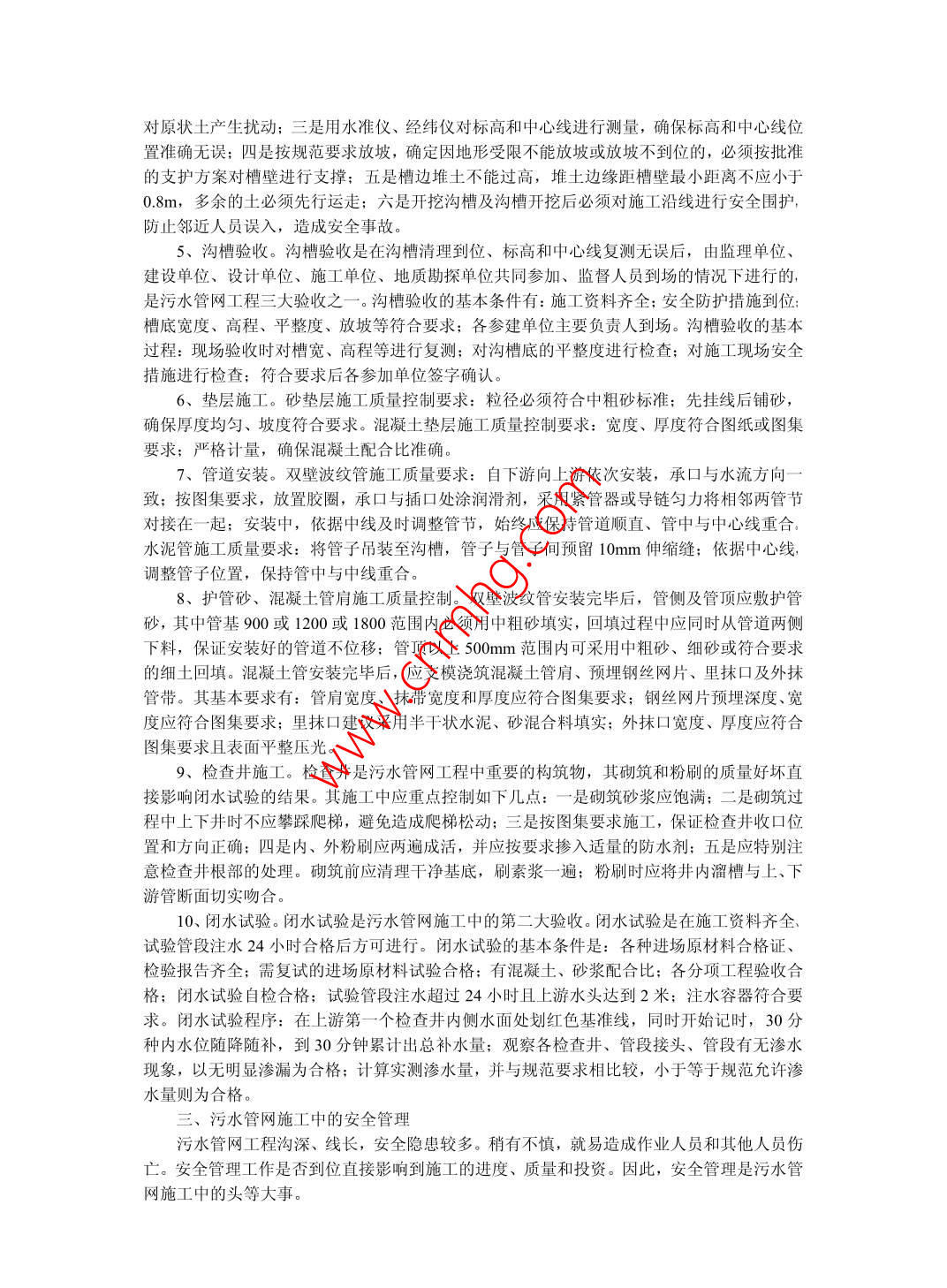 市政污水處理管網(wǎng)的施工趙鵬廣州市污水治理有限責(zé)任公司廣 東廣州510655摘要:市政污水管網(wǎng)工程作為城市公用工程的重要組成部分,是一個(gè)城市功能的基本構(gòu)成要素,通過污水管網(wǎng)收集污水,處理后達(dá)標(biāo)排放,避免污水亂排亂放,保護(hù)了生存環(huán)境。關(guān)鍵詞:施工管理;污水管網(wǎng);安全管理;質(zhì)量控制前言市政污水管網(wǎng)工程作為城市公用工程的重要組成部分,是一個(gè)城市功能的基本構(gòu)成要素,通過污水管網(wǎng)收集污水,處理后達(dá)標(biāo)排放,避免污水亂排亂放,保護(hù)了生存環(huán)境。因此,.控制好污水管網(wǎng)工程的施工質(zhì)量直接關(guān)系到一一個(gè)城市的形象和環(huán)境,直接影響著城市居民的生活??刂剖┕べ|(zhì)量、抓好施工管理,首先應(yīng)做好施工前的準(zhǔn)備工作,通過各分項(xiàng)工程質(zhì)量的層層把關(guān),最終完成三大驗(yàn)收。一、市政污水管網(wǎng)工程的特點(diǎn)一是位于城市道路兩側(cè),靠近各類建筑物,過往人員較多;二是地面障礙物較多,地下各種管線交錯(cuò),協(xié)調(diào)工作量較大;三是污水是自流排水,對(duì)污水管網(wǎng)的標(biāo)高要求較高;四是污水管網(wǎng)溝槽較深,安全隱患較多;五是污水中含有各種有害物質(zhì),為避免對(duì)地下水造成污染,對(duì)管網(wǎng)的嚴(yán)密性要求較高;六是污水管網(wǎng)工程很多時(shí)候需拆除原人行道或位于新建人行道下,為避免以后地面凹陷,施工中對(duì)回填土要求較高。二、市政污水管網(wǎng)工程的施工管理要點(diǎn)市政污水管網(wǎng)從現(xiàn)場(chǎng)交樁開始,先后經(jīng)過現(xiàn)場(chǎng)踏勘、溝槽放線、溝槽開挖、溝槽驗(yàn)收、墊層施工、管道安裝、護(hù)管砂或混凝土管肩施工、檢查井砌筑、閉水試驗(yàn)、溝槽回填、竣工驗(yàn)收等11個(gè)環(huán)節(jié)。各環(huán)節(jié)的施工內(nèi)容如下。1、現(xiàn)場(chǎng)交樁?,F(xiàn)場(chǎng)交樁是由建設(shè)單位向施工單位交付標(biāo)高點(diǎn)和中心點(diǎn)的位置及數(shù)據(jù)工作?,F(xiàn)場(chǎng)交樁是污水管網(wǎng)工程施工前的重要準(zhǔn)備工作之-一, 其標(biāo)高點(diǎn)和中心點(diǎn)是指導(dǎo)工程施工的基本要素,施工中必須努力做到:一是現(xiàn)場(chǎng)交 樁點(diǎn)必須是經(jīng)規(guī)劃部門測(cè)定確認(rèn)的:二是對(duì)現(xiàn)場(chǎng)交樁點(diǎn)必須進(jìn)行復(fù)測(cè),其閉合差必須在規(guī)定的誤差范圍內(nèi);三是對(duì)現(xiàn)場(chǎng)交樁點(diǎn)必須進(jìn)行保護(hù),必要時(shí)可將其引至隱蔽處加以保護(hù)。2、現(xiàn)場(chǎng)踏勘?,F(xiàn)場(chǎng)踏勘即為對(duì)污水管網(wǎng)沿線的地形進(jìn)行實(shí)地查看,探明地表物體、地下管線,為施工方案的擬定積累充分的資料?,F(xiàn)場(chǎng)踏勘應(yīng)主要做好如下工作:一是對(duì)地表的地形進(jìn)行復(fù)測(cè),并繪制成圖,為竣工結(jié)算積累資料:二是對(duì)影響管網(wǎng)施工的圍墻、建筑物、樹木等障礙物進(jìn)行測(cè)量或數(shù)量清點(diǎn),及時(shí)報(bào)建設(shè)單位及相關(guān)部門認(rèn)可,對(duì)增加的工程量登記確認(rèn)后,應(yīng)抓緊做好各項(xiàng)協(xié)調(diào)、拆移工作。3、溝槽放線。溝槽放線就是按照?qǐng)D紙、現(xiàn)場(chǎng)交樁點(diǎn)由施工單位將管網(wǎng)中心線、溝槽底寬、溝槽上口寬度用白灰撒出。其質(zhì)量控制要點(diǎn)有:一是嚴(yán)格按照交樁點(diǎn)放出中心線;二是依據(jù)圖紙、圖集和《給水排水管道工程施工及驗(yàn)收規(guī)范》的要求,放出溝槽底寬灰線:三是根據(jù)土質(zhì)情況,按照《給水排水管道工程施工及驗(yàn)收規(guī)范》的要求,計(jì)算放坡寬度后,放出溝槽開挖邊線;四是將放好的中心線、溝槽底寬線、溝槽開挖邊線報(bào)請(qǐng)監(jiān)理單位和建設(shè)單位進(jìn)行驗(yàn)收,無誤后方可進(jìn)行溝槽開挖。4、溝槽開挖。溝槽開挖是污水管網(wǎng)施工中最重要的環(huán)節(jié)之一。溝槽開挖的質(zhì)量好壞直接影響后續(xù)溝槽驗(yàn)收,同時(shí)溝槽較深,安全隱患較多。施工中應(yīng)把握如下幾點(diǎn):一是嚴(yán)格按放好的邊線進(jìn)行開挖;二是機(jī)械開挖時(shí)必須預(yù)留150- 200mm 厚土層,由人工清理,防止對(duì)原狀士產(chǎn)生擾動(dòng);三是用水準(zhǔn)儀、經(jīng)緯儀對(duì)標(biāo)高和中心線進(jìn)行測(cè)量,確保標(biāo)高和中心線位置準(zhǔn)確無誤;四是按規(guī)范要求放坡,確定因地形受限不能放坡或放坡不到位的,必須按批準(zhǔn)的支護(hù)方案對(duì)槽壁進(jìn)行支撐;五是槽邊堆土不能過高,堆土邊緣距槽壁最小距離不應(yīng)小于0.8m,多余的土必須先行運(yùn)走;六是開挖溝槽及溝槽開挖后必須對(duì)施工沿線進(jìn)行安全圍護(hù),防止鄰近人員誤入,造成安全事故。5、溝槽驗(yàn)收。溝槽驗(yàn)收是在溝槽清理到位、標(biāo)高和中心線復(fù)測(cè)無誤后,由監(jiān)理單位、建設(shè)單位、設(shè)計(jì)單位、施工單位、地質(zhì)勘探單位共同參加、監(jiān)督人員到場(chǎng)的情況下進(jìn)行的,是污水管網(wǎng)工程三大驗(yàn)收之一。溝槽驗(yàn)收的基本條件有:施工資料齊全;安全防護(hù)措施