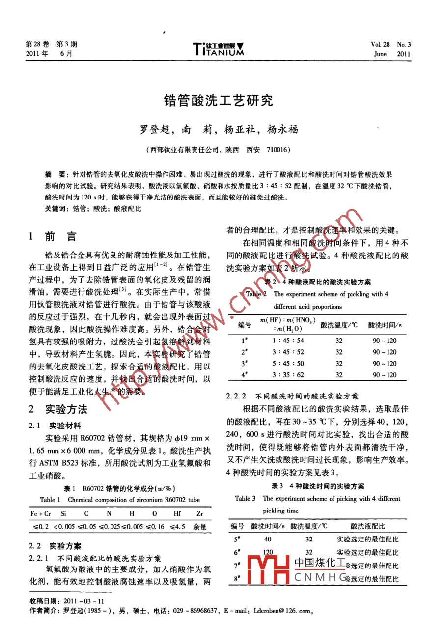 第28卷第3期VoL 28 No. 32011年6月June 2011鋯管酸洗工藝研究羅登超,南莉,楊亞社,楊永福(西部鈦業(yè)有限責任公司,陜西西安710016)摘要:針對鋯管的去氧化皮酸洗中操作困難、易出現過酸洗的現象,進行了酸液配比和酸洗時間對鋯管酸洗效果影響的對比試驗。研究結果表明,酸洗液以氫氟酸、硝酸和水按質量比3:45:52配制,在溫度32℃下酸洗鋯管酸洗時間為120s時,能夠獲得干凈光潔的酸洗表面,而且能較好的避免過酸洗。關鍵詞:鋯管;酸洗;酸液配比1前言者的合理配比,才是控制酸洗速率和效果的關鍵。在相同溫度和相同酸洗時間條件下,用4種不鋯及鋯合金具有優(yōu)良的耐腐蝕性能及加工性能,同的酸液配比進行酸洗試驗。4種酸洗液配比的酸在工業(yè)設備上得到日益廣泛的應用2。在鋯管生洗實驗方案如表2所示產過程中,為了去除鋯管表面的氧化皮及殘留的潤表24種酸液配比的酸洗實驗方案滑油,需要進行酸洗處理。在實際生產中,常借Table 2 Thespeciment scheme of pickling with用鈦管酸洗液對鋯管進行酸洗。由于鋯管與該酸液different acid proportions的反應過于強烈,在十幾秒內,就會出現外表面過m(HF):m(HNO)酸洗現象,因此酸洗操作難度高。另外,鋯合金對m(h,o)氫具有較強的吸附力,過酸洗會引起氫溶解到材料1:45:5490120中,導致材料產生氫脆。因此,本實驗研究了鋯管222290-120的去氧化皮酸洗工藝,探索合適的酸液配比,用以90~120控制酸洗反應的速度,并找出合適的酸洗時間,以3:35:6290-120便于能滿足工業(yè)化大生產的需要2.2.2不同酸洗時間的酸洗實驗方案2實驗方法根據不同酸液配比的酸洗實驗結果,選取最佳2.1實驗材料的酸液配比,再在30~35℃下,分別選擇40,120,實驗采用R6002鋯管材,其規(guī)格為d19mx240,60進行酸洗時間對比實驗,找出合適的酸1.65m×600m,化學成分見表1。酸洗生產執(zhí)洗時間,使得既能夠將鋯管內外表面都清洗干凈,行 ASTM B523標準,所用酸洗試劑為工業(yè)氫氟酸和又不產生欠洗或酸洗時間過長現象,影響生產效率。工業(yè)硝酸。4種酸洗時間的實驗方案見表3。表1R60702錯管的化學成分(m/%)表34種酸洗時間的實驗方案Table 1 Chemical composition of zirconium R60702 tubeTable 3 The experiment scheme of picking with 4 differentFe +Cr Sipickling time≤0.2<0.005≤0.05≤0.025≤0.005≤0.16≤4.5余量編號酸洗時間/s酸洗溫度℃酸洗液配比實驗選定的最佳配比2.2實驗方案5678實驗選定的最佳配比2.2.1不同酸液配比的酸洗實驗方案氫氟酸為酸液中的主要成分,加入硝酸作為氧中國煤化工檢選定的最佳配比化劑,能有效地控制酸液腐蝕速率以及吸氫量,兩HCNMHG檢選定的最佳配比收稿日期:2011-03-11作者簡介:羅登超(1985-),男,碩士,電話:029-86968637,E-mal:Ldcroben@126.com。第3期羅登超等:鋯管酸洗工藝研究3結果和分析3.2酸洗時間對酸洗管材表面質量的影響在氫氟酸、硝酸和水的質量比為3:45:52,酸3.1酸液配比對酸洗速率及管材表面質量的影響洗溫度為32℃的條件下,進行4種不同酸洗時間的在酸洗溫度為32℃、酸洗時間為90-120s的酸洗實驗,其結果如表5所示。由表5可以看出,條件下時,進行4種不同酸液配比的酸洗實驗,其酸洗時間超過120s后,隨著酸洗時間的延長,鋯管結果如表4所示。表面會逐漸出現過酸洗現象。氫氟酸、硝酸和水的表44種不同酸液配比的酸洗實驗結果質量比為3:45:52,酸洗溫度為32℃,酸洗時間Table 4 The experiment result of pickling with 4 different acid為120s時,可獲得干凈光潔的酸洗表面。proportion表54種不同酸洗時間的酸洗實驗結果編號酸洗現象鋯管表面質量Table 5 The experimental result of pickling with 4different pickling time1·反應緩慢,氣泡非常少殘留氧化皮2反應適中,氣泡較多、較密集凈光潔編號m(HF):m(HNO2):酸洗溫度酸洗時間鋯管表面質量m(H,o)/℃3反應劇烈,產生氣泡多、快過洗,麻面4反應較劇烈,產生氣泡多、快輕微過洗3:45:52殘留氧化皮干凈光潔通過表4可以看出,1、2、3·方案中,酸洗液局部過洗中硝酸含量不變,當氫氟酸、硝酸和水的質量比為3:45:52600嚴重過洗麻面45:54時,鋯管在酸液中腐蝕緩慢,120s內無法洗凈氧化皮;而隨著氫氟酸含量的逐漸增大,鋯4結論管在酸液中的反應越來越劇烈,腐蝕速率加快;當氫氟酸、硝酸和水的質量比為3:45:52時,腐蝕速(1)在鋯管去氧化皮酸洗時,酸洗液的較佳配易于控制,也不易出現過洗現比為m(HF);m(HNO2):m(H20)=3:45:52象;當氫氟酸、硝酸和水的質量比達到5:45:50(2)當酸洗液中氫氟酸、硝酸和水的質量比為時,反應很劇烈,產生大量的氣泡,外表面極易出3:45:52,酸洗溫度為32℃,酸洗時間約120s時現過酸洗。通過對比2”、4兩組方案可以看出,氫鋯管的酸洗效果較佳,可獲得干凈光潔的酸洗表面。氟酸含量一定時,硝酸含量降低,鋯管腐蝕速率加快,容易出現局部過洗現象。參考文獻通過實驗結果看到,第2組方案中酸洗液配比[1]李獻軍.鋯及鋯合金概述[冂].鈦工業(yè)進展,2011,28氫氟酸、硝酸和水的質量比為3:45:52)較佳[2]李小寧,劉春光,呂培成,鋯合金管材表面除氟工藝探并且,降低氫氟酸含量或者增大硝酸含量,能有效索[J].鈦工業(yè)進展,2010,37(4):40-42減緩鋯管在酸液中的腐蝕速率,使得操作便于控制,[3]石明華,李中奎,周軍,等.x-Nb系合金堆外腐蝕性不易出現過酸洗能的研究現狀[J].鈦工業(yè)進展,2008,35(5):7-10Study on Pickling Process of Zirconium TubeLuo Dengchao, Nan Li, Yang Yashe, Yang Yongfu(Westerm Titanium Technologies Co, Ltd, Xi'an 710016, ChinAbst