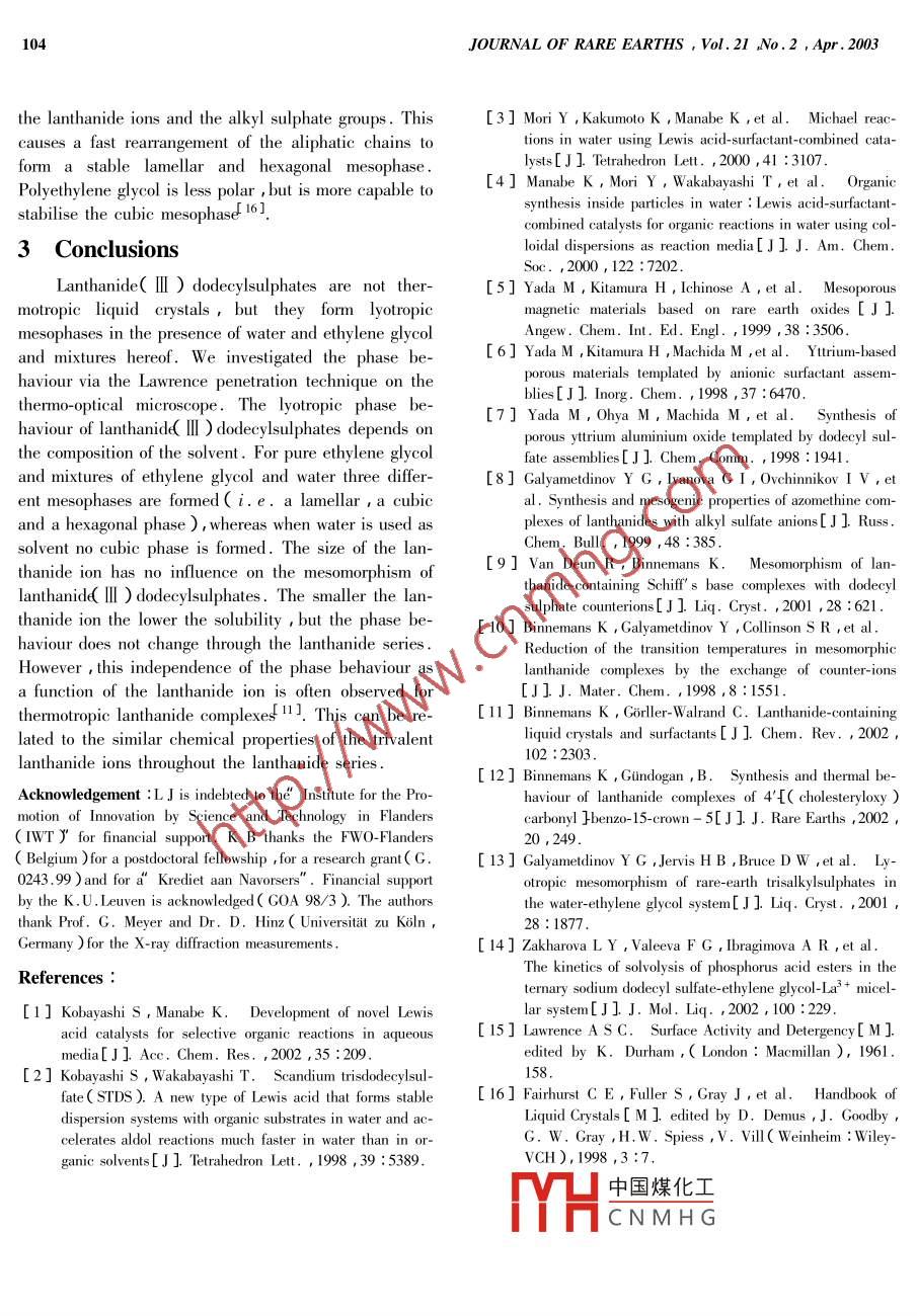 JOURNAL OF RARE EARTHSVol.2I ,No.2 , Apr.2003 ,p. 101Solid State Structure and Lyotropic Mesomorphism of Rare- Earth Trisdode-cylsulphates in the Water-Ethylene Glycol SystemLiesbet Jongen , Koen Binnemans( Katholiehe Universiteit Lewen , Department of Chemistry , Celestijnenlaan 200F , B-3001 Lewen , Belgium )Abstract :The phase behaviour of lanthanide( I ) dodecylsulphates , Ln( C12H2sSO4 ),by thermo-optical microscopy usingLawrence penetration technique was investigated . The lyotropic phase behaviour of lanthanidd II ) dodecylsulphates in ethy-lene glycol water in mixtures hereof , depends on the composition of the solvent. For pure ethylene glycol and mixtures ofethylene glycol and water three different mesophases are formed ri.e. a lamellar a cubic and a hexagonal phase , whereaswhen water is used as solvent no cubic phase is formed . The size of the lanthanide ion has no influence on the mesomorphismof these metallomesogens , although the smaller the lanthanide ion the lower the solubility .Key words :inorgamic chemistry ; lanthanides ; liquid crystals ; lyotropic mesophases ; metallomesogens ; surfactants ; rare earthsCLC number :0641Document code :AArticle ID : 1002 - 0721( 2003 )02 - 0101 -04Rare earth( II ) alkylsulphates are well known forLinkam THMS 600 hot stage and a Linkam TMS 93their catalytic activity in several types of organic reac-programmabletemperature-controller.Thermo-tions 1-4. A large advantage of these so-called Lewisgravimetric curves were obtained using a Polymer Labo-acid-surfactant-combined catalysts is their water stabili-ratories STA 1000-H TG-DTA apparatus. X-ray diffrac-ty. Therefore no harmful organic solvents have to btograms were measured on a STOE Transmission Powderused to carry out these organic reactions. Stable disper-Diffractometer System STADI P , using monochromaticsion systems including the catalyst and organic sub-Cu-Ka( λ = 0.154 nm ) radiation. FT-IR spectra werestrates are formed in water. Lyotropic mesophases inrecorded on a Bruker IFS-66 spectrometer , using thelanthanide II ) alkylsulphates were used for the synthe-KBR pellet method. Reagents and solvents were usedsis of nanostructural polymers , although these scientistsas received without further purification.did not use pure lanthanide( II ) alkysulphates5 5-7].Lanthanide( II ) alkylsulphates have been used in the2Results and Discussionlast few years as counter ions in for example liquidThe lanthanide( ll ) dodecylsulphates were synthe-crystalline lanthanide Schiff's base complexes 8~11] ,orsized via a metathesis reaction between sodium dodecyl-in crown-ether complexe5 12].Moreover,our group .sulphate and a lanthanide nitrate 9. To an aqueous so-found that lanthanide( Il ) dodecylsulphates show lylution of sodium dodecylsulphate the desired lanthanideotropic mesomorphism in the presence of water andion dissolved in water was added dropwise. The lan-ethylene glycof 131 ,and this work has been extended bythanide( II ) alkylsulphate precipitated immediately .Galyametdinov and coworkers 14]. However , no infor-The product was filtered off , washed with deionised wa-mation is available on the structure and thermal beter and dried in vacuum for 24 h. The purity of thehaviour of these complexes. In this paper ,we describethe solid state structure and the lyotropic mesomorphismcompounds was checked by elemental analysis. All theof the lanthanide( II ) dodecylsulphates , Ln( C12 H2scompounds of the series Ld( C12H2sSO4 ) were found toSO4 )XLn=La~Lu , except Pm ).be monohydrates ,which was confirmed by thermo-gravimetry. The analysis results are given in Table 1.1 ExperimentalA typical TG curve shows a first mass loss from 85 ~ 95CH elemental analyses were performed on a CECthe leaving of waterInstruments EA-1110 elemental analyser. Optical texmol中國煤化工,ss loss occurs betweentures of the mesophase were observed with an Olympus150:YHCN M H G. The DTA eurve( whichBX60 polarised optical microscope equipped with ais si-Received date :2002 - 12 - 04 ;revised date :2002 - 12- 30Biogrphy蹬Binnemans( 1970 - ), Male , PrfessrCorresponding uthor( E-mail : Koen. Binnemans @ chem. kuleuven . ac. be )102JOURNAL OF RARE EARTHS , Vol.2l ,No.2 , Apr.2003Table 1 Analysis results of lanthanide( I )dodecylsulphatesCompoundsC/% *H/%*Ld CzHzsS0.) H2045.83(45.37) 8.20(8. 14)C( C2H2SO4) H2045.68(45.31 )8.14(8.13 )P( C2HzS04) H2O45.84(45.27) 8.06(8.13)Nd C2H2S04) H2O45.72(45.11) 8.26(8. 10)Sm( C12H2S04) H2045.33(44.83) 8.05(8.05 )Ed CHrHsS04) H2045. 16(44.75) 8. 15(8.03 )Gd( CnH2sSO4) H2044.81(44.51 )8.14(7.99)1520 25 30'Th( C2H2S04) H2O44.60(44.43) 8.28(7.98)2 0/(° )Dy( Cr2H2sSO4) H2O44.12(44.27) 7. 98(7.95)Hd C2H2sSO4) H2O43. .93(44.16) 8.06(7.93 )Fig.1 X-ray powder difacogram of Nd C12H2sS04號H2OE( C2H2sS04ξ H2O43 .96(44.06) 8.06(7.91 )Tim( C2H2zS04) H2O43.86(43.98) 8. 10(7.89)YI( C2H2sS04) H2O43.36(43.80) 8.08(7.86)Lud Cr2H2SO4) H2043. 70(43.71) 8. 18(7.85)* The calculated values are given in bracketsmultaneously recorded ) shows for both mass losses an昌|endothermic peak. All the compounds from the seriesL( C2H2sSO4); H2O show a loss of water in the TC-DTA measurements , but the water content determined4000 3500 3000 2500 2000 1500 1000 500with this method was a little bit too high in comparisonv /cm-Ito the water amount obtained by elemental analysis .The hygroscopic character of these compounds can ex-Fig.2 Infrared spectrum of Nd C12H2sS04) H20plain this too high water value.For Nd( C12H2sSO4): H2O and for Yb( C12 H2slanthanide complexes . The assignments of the observedSO4 ) H2O room temperature X-ray diffraction analysisbands for Ne( C12H2sSO4 ) , La( C12H2sS04); H2O andwas performed. These compounds show several reflec-Nd C12H2sSO4》H2O are summarized in Table 2. Thetions in the small-angle region. The d values are in thepeak positions do not change significantly from one lan-ratio 1: 1/2: 1/3:.. 1/n ( Fig.1 ). These diffractionthanide ion to another except for a slight shift to higherpe