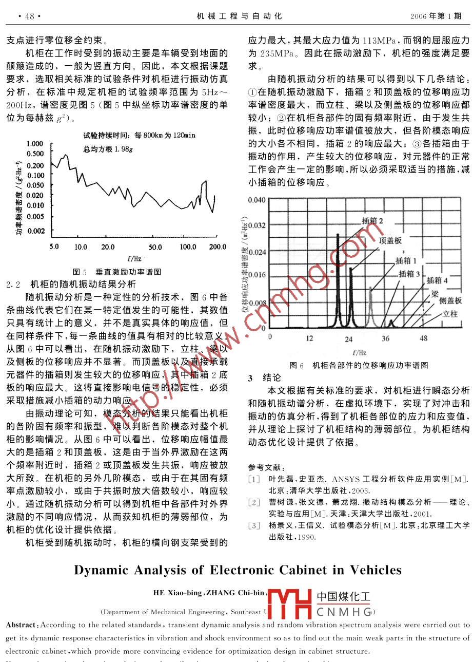 第1期(總第134期)機(jī)械工程與自動(dòng)化2006年2月MECHANICAL enGineerinG & AUTOMATIONFeb文章編號(hào):1672-6413(2006)01-0046-03車載電子機(jī)柜的動(dòng)力學(xué)分析何小兵,張赤斌,顏肖龍(東南大學(xué)機(jī)械工程系,江蘇南京210096)摘要:根據(jù)相關(guān)標(biāo)準(zhǔn)的要求,對(duì)電子機(jī)柜進(jìn)行了瞬態(tài)動(dòng)力學(xué)分析和隨杋振動(dòng)譜分析,模擬實(shí)際要求的激勵(lì)實(shí)現(xiàn)對(duì)沖擊和振動(dòng)的仿真分析,得到了電子機(jī)柜各部位的應(yīng)力和應(yīng)變值,找岀了電子?xùn)i柜結(jié)構(gòu)的薄弱部位,為其結(jié)構(gòu)動(dòng)態(tài)優(yōu)化設(shè)計(jì)提供了依據(jù)關(guān)鍵詞:瞬態(tài)動(dòng)力學(xué)分析;隨機(jī)振動(dòng)譜分析;電子機(jī)柜中圖分類號(hào):TM59文獻(xiàn)標(biāo)識(shí)碼:A0引言力學(xué)仿真。沖擊脈沖波形:半正弦;脈沖加速度:30g;電子機(jī)柜是高集成度電子設(shè)備的支撐基礎(chǔ),其外持續(xù)時(shí)間:0.011s。具體的數(shù)學(xué)描述為形結(jié)構(gòu)見圖1,它主要由立柱、橫梁、外側(cè)板、插箱和Asina,0≤t≤0.011?!?1)蓋板等組成。現(xiàn)代工業(yè)應(yīng)用對(duì)電子設(shè)備的要求越來越式中:x—位移,mm高,電子設(shè)備系統(tǒng)設(shè)計(jì)除了滿足產(chǎn)品的電性能指標(biāo)外,A—振幅,A=30g=294mm/s2;還應(yīng)研究和解決設(shè)備在動(dòng)態(tài)環(huán)境下的工作可靠性以及角頻率,=285.45抵御惡劣環(huán)境的能力。本文從工程應(yīng)用出發(fā),利用軟t—時(shí)間,s。件工具對(duì)機(jī)柜結(jié)構(gòu)進(jìn)行瞬態(tài)動(dòng)力學(xué)仿真和隨機(jī)振動(dòng)譜1·1建立用于機(jī)柜瞬態(tài)分析的模型分析,研究機(jī)柜的動(dòng)態(tài)特性和動(dòng)態(tài)響應(yīng),以便在結(jié)構(gòu)文中分析的機(jī)柜采用了鋁型材框架結(jié)構(gòu),由于鋁的方案論證時(shí)就可預(yù)估機(jī)柜的薄弱環(huán)節(jié),為機(jī)柜結(jié)構(gòu)型材較差的焊接性能,機(jī)柜全部采用了螺栓緊固件聯(lián)動(dòng)態(tài)優(yōu)化設(shè)計(jì)提供依據(jù)。接方式。為了增加立柱與上、下橫梁的聯(lián)接緊固性,設(shè)計(jì)了三面聯(lián)接的聯(lián)接塊。利用有限元分析軟件 ANSYS對(duì)機(jī)柜進(jìn)行仿真。頂蓋板有限元模型采用以梁?jiǎn)卧獮橹鞯慕7绞?對(duì)立柱與支架外側(cè)板梁的螺栓聯(lián)接處采用節(jié)點(diǎn)融合的方式進(jìn)行處理。在求插箱解時(shí)給機(jī)柜底座的各支點(diǎn)施加零位移全約束立柱1.2機(jī)柜瞬態(tài)動(dòng)力學(xué)結(jié)果分析圖2列出了機(jī)柜底座4個(gè)支點(diǎn)的支反力F隨時(shí)橫梁下蓋板間變化的曲線圖。從圖2可以知道4個(gè)支點(diǎn)中第4點(diǎn)的支反力較大,第2點(diǎn)較小,第1點(diǎn)與第3點(diǎn)值接近出現(xiàn)最大支反力的時(shí)間比較靠近,說明結(jié)構(gòu)并不對(duì)稱。圖1電子機(jī)柜外形結(jié)構(gòu)圖般來說,機(jī)柜的4個(gè)支點(diǎn)是通過4個(gè)減震器與底座1電子機(jī)柜瞬態(tài)動(dòng)力學(xué)仿真聯(lián)接V中國(guó)煤化工中,4個(gè)支點(diǎn)的受力情況有關(guān)標(biāo)準(zhǔn)規(guī)定了車載電子機(jī)柜在不同應(yīng)用環(huán)境中對(duì)減CNMH(數(shù)據(jù)為減震器的結(jié)構(gòu)參的沖擊試驗(yàn)強(qiáng)度。為了解和改善機(jī)柜的抗沖擊能力,本數(shù)設(shè)計(jì)、阻尼材料的研制提供了較為詳盡的理論依據(jù)。文根據(jù)相關(guān)規(guī)定,按以下環(huán)境條件對(duì)機(jī)柜進(jìn)行瞬態(tài)動(dòng)插箱是電子元器件的直接承載構(gòu)件,其變形量對(duì)收稿日期:2作者簡(jiǎn)介,何萬有效損,男,安徽湖人,損士研究生,究方向,電子機(jī)械結(jié)構(gòu)動(dòng)態(tài)設(shè)計(jì)2006年第1期何小兵,等:車載電子機(jī)柜的動(dòng)力學(xué)分析47·元器件的影響最大。圖3中的5條曲線為頂蓋板和4的應(yīng)力強(qiáng)度校核可以根據(jù)第四強(qiáng)度理論,選擇Von個(gè)插箱中點(diǎn)受到半正弦沖擊信號(hào)時(shí)的變形圖,頂蓋板Miss等效應(yīng)力來判斷機(jī)柜結(jié)構(gòu)的強(qiáng)度。Ⅴ on miss等的變形量最大,最大值為1.414mm,其次為插箱2。從效應(yīng)力可以表示為圖3中可以看出,由于殘余響應(yīng)的影響,各點(diǎn)響應(yīng)的(a1-02)2+(a2-03)2+(a3-01)2]。最大值都出現(xiàn)在11ms以后,即激勵(lì)結(jié)束以后。為了更清楚地描述各條曲線的情況,表1列出了各點(diǎn)最大值(2)響應(yīng)及其出現(xiàn)的時(shí)間。式中:σ1、σ2、σ3—三向應(yīng)力狀態(tài)下主應(yīng)力強(qiáng)度條件表示為第1點(diǎn)≤[a]式中材料的許用應(yīng)力32.0第2點(diǎn)根據(jù)式(2)求出4個(gè)插箱和頂蓋板的等效應(yīng)力值,其結(jié)果列于表1中。從表1中看,插箱的最大等效應(yīng)24.0第3點(diǎn)力值為37.328MPa,遠(yuǎn)小于材料的許用應(yīng)力值,滿足強(qiáng)度要求6.0第4點(diǎn)立柱是機(jī)柜的主要承載部件,其強(qiáng)度對(duì)整個(gè)機(jī)柜8.0的穩(wěn)定有很大的作用。從仿真的結(jié)果看,當(dāng)機(jī)柜受到?jīng)_擊載荷時(shí),立柱受到的應(yīng)力最大。圖4為立柱應(yīng)力最大點(diǎn)的 Von miss等效應(yīng)力a,變化曲線,等效應(yīng)力8.010.012最大值為47.2MPa,小于鋁的