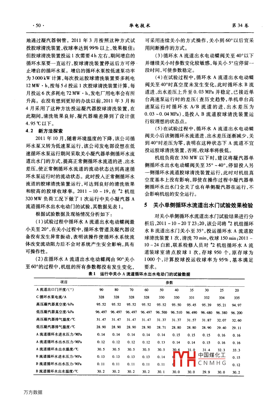 第34卷第10期華電技術(shù)Vol. 34 No. 102012年10月Huadian TechnologyOct. 2012循環(huán)水泵變極后凝汽器膠球清洗裝置存在的問題與對策肖承明(國電黃金埠發(fā)電有限公司,江西余干335101)摘要:國電黃金埠發(fā)電有限公司對循環(huán)水泵電動機(jī)進(jìn)行變極改造后,低速循環(huán)水泵運行時凝汽器膠球清洗裝置的收球率極低(50%以下)。對膠球收球率低的原因進(jìn)行了分析,通過改進(jìn)膠球投運條件,低連循環(huán)水泵運行時收球率達(dá)到95%以上,可滿足凝汽器清洗需要。關(guān)鍵詞:循環(huán)水泵;變極;膠球清洗裝置;收球率;措施中圖分類號:TK 264.11文獻(xiàn)標(biāo)志碼:B文章編號:1674 - 1951 (2012)10 -0049 -03蝕,改善運行條件,延長機(jī)組壽命。1機(jī)組概況主要技術(shù)參數(shù):廠家設(shè)計收球率, 95% ,膠球投國電黃金埠發(fā)電有限公司裝設(shè)2臺650MW發(fā)人系統(tǒng)后1個月內(nèi)不更換;收球網(wǎng),開關(guān)型油缸驅(qū)電機(jī)組,每臺機(jī)組配置了2臺長沙水泵廠生產(chǎn)的動,出、人口管規(guī)格為DN 2 400;收球網(wǎng)網(wǎng)板,隔柵96LKXA- 25型離心式循環(huán)水泵,其設(shè)計流量為型,隔柵間隙為7 mm;運行水阻壓力,<3000 Pa;膠9. 50/13. 72 m'/s,揚程為28. 3/22.1 m,轉(zhuǎn)速為372球泵流量,10~25 kg/s;出口壓力, 110 ~ 140 kPa;膠r/ min,設(shè)計運行方式為冬季1臺機(jī)組配1臺循環(huán)水球規(guī)格,26mm,冬季流量較低時采用B25mm的膠泵運行,夏季2臺機(jī)組配3臺循環(huán)水泵運行。為了球;凝汽器鋼管規(guī)格,B25mmx0.5mm。響應(yīng)國家節(jié)能減排的號召,降低機(jī)組的廠用電率,2008年10月,該公司利用*2機(jī)組大修的機(jī)會,對C3低速循環(huán)水泵運行時膠球裝置收球率低循環(huán)水泵電動機(jī)進(jìn)行了變極改造,2009年3月,利的原因分析用"1機(jī)組大修的機(jī)會,對A,B循環(huán)水泵進(jìn)行了變極改造。該公司循環(huán)水泵電動機(jī)原極數(shù)為16極,經(jīng)由于低速循環(huán)水泵運行時出口壓力只有0. 16改造后極數(shù)變?yōu)?8極,改造完成后,該公司實行循MPa,循環(huán)水流量減少較多,循環(huán)水進(jìn)人凝汽器的環(huán)水泵優(yōu)化運行方案,每年10月開始基本采用單機(jī)進(jìn)、出水差壓下降至0.02MPa,高速循環(huán)水泵運行單臺低速循環(huán)水泵運行的方式,直到次年4月中旬時出口壓力為0.17 MPa,凝汽器循環(huán)水進(jìn)、出水差才轉(zhuǎn)為單機(jī)單臺高速循環(huán)水泵運行方式。低速泵持壓達(dá)到0. 03 MPa。低速泵運行投人凝汽器膠球清續(xù)運行時間約為半年,低速循環(huán)水泵運行時投人凝洗裝置時因進(jìn)、出水差壓偏小,水動力不足以推動膠汽器膠球清洗裝置后,膠球收球率低至50%以下,球進(jìn)入比膠球直徑小1mm的鋼管內(nèi)流動,部分膠球凝汽器得不到有效清洗,凝汽器端差居高不下。不能順暢通過凝汽器鋼管而卡在凝汽器鋼管內(nèi)或停留在凝汽器水室中,順暢通過凝汽器鋼管的膠球數(shù)2膠球清洗裝置量下降。隨著膠球的不斷循環(huán),越來越多的膠球卡該公司"1, *2機(jī)組凝汽器膠球清洗系統(tǒng)由上在鋼管內(nèi)或停留在凝汽器水室中,造成膠球裝置收海達(dá)極水技術(shù)工程有限公司配套、德國達(dá)極公司生球率很低;同時,因部分凝汽器鋼管內(nèi)沒有得到膠球產(chǎn)。主要是借助水流的作用將大于凝汽器鋼管內(nèi)徑的清洗,凝汽器清洗效果達(dá)不到標(biāo)準(zhǔn)要求。的海綿膠球擠進(jìn)凝汽器鋼管,對凝汽器鋼管進(jìn)行擦4提高凝汽器膠球收球率的對策洗,維持凝汽器鋼管內(nèi)壁清潔,保證凝汽器設(shè)計換熱效率不下降,從而保證凝汽器的端差和汽輪機(jī)排汽4.1 對策壓力在規(guī)定的范圍內(nèi);同時避免凝汽器鋼管內(nèi)壁腐投運膠球中國煤化工運行。增啟循環(huán)水泵后循THCN M H MPa,凝汽器收稿日期:2012 -03 -27循環(huán)水進(jìn)、出水差壓達(dá)到u.USMra,膠球應(yīng)能順暢.●50.華電技術(shù)第34卷地通過凝汽器鋼管。2011年3月按照這種方式試可采用連續(xù)關(guān)小的方式操作,關(guān)小到60°以后宜采投膠球清洗裝置,收球率達(dá)到99%以上,效果極佳;用間斷操作的方式。但膠球清洗裝置投運1次需要4h左右,期間增啟的(3)循環(huán)水A流道出水電動蝶閥關(guān)至40°以下循環(huán)水泵要一直運行 ,膠球清洗裝置停運后方可停.并繼續(xù)關(guān)小時參數(shù)變化較敏感,每關(guān)小5°應(yīng)停留-止增啟的循環(huán)水泵。增啟的循環(huán)水泵按低速泵功率段時間,可使參數(shù)穩(wěn)定。為3000kW計算,每次投運膠球清洗裝置要多耗電(4)在試驗過程中,循環(huán)水A流道出水電動蝶12MW . h,按每5d投運1次膠球清洗裝置計算,每閥關(guān)至40°時真空度未發(fā)生變化,此時循環(huán)水B流月投運6次多耗電72MW●h,發(fā)電廠用電率會有所道進(jìn)、出水差壓上升至0. 03 MPa并穩(wěn)定,已接近單升高。在沒有想到更好的辦法以前,2011年3月和臺高速泵運行時的差壓(查歷史趨勢,單機(jī)單臺高.4月采用了這種方法投運凝汽器膠球清洗裝置,在速泵運行時循環(huán)水AB流道的進(jìn)、出水差壓為此期間,清洗效果良好,凝汽器端差降到了設(shè)計值0. 03 ~0.04 MPa) ,是投入B流道膠球清洗裝置運行較理想的狀態(tài)點。4.95 C以下。(5)在試驗過程中,循環(huán)水A流道出水電動蝶4.2
