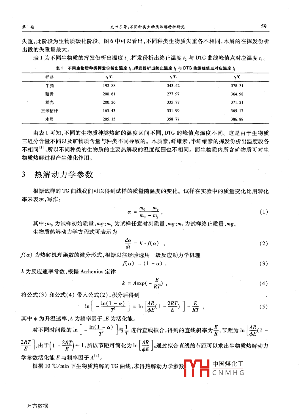 第32卷第1期東北電力大學(xué)學(xué)報Vol 32, No. 12012年2月Journal Of Northeast Dianli UniversityFeb.,2012文章編號:1005-2992(2012)01-0057-04不同種類生物質(zhì)熱解特性研究史長東1,張銳2,車德勇2,賈嘉2(1.吉林市能源測試檢驗所,吉林吉林132013;2東北電力大學(xué)能源與動力工程學(xué)院,吉林吉林132012)摘要:在熱重分析儀上,豬糞、稻殼、玉米秸稈、木屑等五種生物質(zhì)進(jìn)行熱解實驗研究。研究發(fā)現(xiàn),生物質(zhì)的熱解過程可分為干燥預(yù)熱階段、揮發(fā)份析出段、碳化階段。不同種類的生物質(zhì)揮發(fā)份析出溫度、揮發(fā)份析出終止溫度、最大失重速率對應(yīng)溫度均不相同。通過動力學(xué)計算可知玉米秸稈的熱解活化能較小,說明它的熱解過程最容易進(jìn)行。關(guān)鍵詞:生物質(zhì);熱解;熱分析中圖分類號:TK6文獻(xiàn)標(biāo)識碼:A生物質(zhì)能是一種豐富的可再生能源。利用生物質(zhì)能在對于調(diào)整能源結(jié)構(gòu)、緩解能源危機(jī)和控制溫室氣體排放等方面意義重大。生物質(zhì)的熱化學(xué)轉(zhuǎn)換應(yīng)用一直倍受關(guān)注。熱化學(xué)轉(zhuǎn)換可快速將低品質(zhì)的生物質(zhì)能轉(zhuǎn)化成高品位的合成氣、生物油及焦炭。而熱解技術(shù)是生物質(zhì)熱化學(xué)反應(yīng)應(yīng)用的基礎(chǔ),對進(jìn)一步進(jìn)行生物質(zhì)的液化、氣化等研究有著重要的指導(dǎo)意義。依據(jù)來源的不同,將生物質(zhì)分為林業(yè)資源農(nóng)業(yè)資源、生活污水和工業(yè)有機(jī)廢水、城市固體廢物和畜禽糞便等五大類。本文在熱重分析儀上研究了木屑,秸稈、稻殼和牛糞、豬糞的熱解特性,并進(jìn)行了熱動力學(xué)分析,比較其活化能大小關(guān)系,為進(jìn)一步研究生物質(zhì)的熱化學(xué)轉(zhuǎn)化提供基礎(chǔ)數(shù)據(jù)。1實驗材料與物性分析本實驗選用的實驗樣品分別為吉林市養(yǎng)殖場的牛糞與豬糞,吉林市木材加工廠的廢棄物木屑,稻米加工廠的稻殼以及農(nóng)田里的廢棄玉米秸稈。實驗前將樣品充分干燥后研磨至0.2mm以下密封保存。實驗儀器采用TA公司的 SDTQ600型熱重分析儀。試驗采用非等溫法,升溫速率為10℃/min,溫度范圍為室溫到800℃,通入高純氮?dú)庾鳛檩d氣。2實驗結(jié)果及分析圖1-5分別為升溫速率10℃/min下牛糞豬糞、稻殼、玉米秸稈、木屑的TG及DTG曲線。圖6為五種生物質(zhì)的熱解失重曲線比較。中國煤化工收稿日期:2011-11-20CNMHG作者簡介:史長東(1967-),男,吉林省吉林市人,吉林市能源測試檢驗所高級工程師,主要研究方向:能量平衡測試、石油化工分析等東北電力大學(xué)學(xué)報第32驀100.001s800.300005300100200300400500600700800900400500600700800900圖1牛糞在升溫速率10℃/min的熱解曲線圖2豬糞在升溫速率10℃/min的熱解曲線0.11-00.40,100200300400500600700800900圖3稻殼在升溫速率10℃/min的熱解曲線圖4玉米秸稈在升溫速率10℃/min的熱解曲線00一牛糞b-豬糞▲-稻殼V玉米秸稈一木屑60040.8圖5木屑在升溫速率10℃/min的熱解曲線圖6五種生物質(zhì)在升溫速率10℃/min下熱解曲線比較由生物質(zhì)熱解曲線可知,熱解主要分為三個階段:干燥預(yù)熱階段、揮發(fā)份析出段碳化階段。隨著加熱的進(jìn)行,生物質(zhì)中的水分析出,在100℃-120℃左右,干燥基V凵中國煤化工出溫度時,試樣質(zhì)量再次出現(xiàn)下降,DTG曲線開始快速下降,并出現(xiàn)峰值。這CNMHG維素、木質(zhì)素吸收了大量的熱量發(fā)生化學(xué)反應(yīng)并析出揮發(fā)份。當(dāng)揮發(fā)份析出段結(jié)束,DTG曲線恢復(fù)平穩(wěn),物料緩慢第1史長東等:不同種類生物質(zhì)熱解特性研究失重,此階段為生物質(zhì)碳化階段。圖6中可以看出,不同種類生物質(zhì)失重各不相同,木屑的在揮發(fā)份析出段的失重量最大。表1為不同生物質(zhì)的揮發(fā)份析出溫度t1揮發(fā)份析出終止溫度2與DTG曲線峰值點(diǎn)對應(yīng)溫度l3。表1不同生物質(zhì)種類揮發(fā)份析出溫度與、揮發(fā)份析出終止溫度與與DTG曲線峰值點(diǎn)對應(yīng)溫度與樣品℃牛糞192.88343.42378.31豬糞稻殼00.26335.77371.21玉米秸稈65.17木屑05.15358.77由表1可知,不同的生物質(zhì)種類熱解的溫度區(qū)間不同,DTG的峰值點(diǎn)溫度不同。這是由于生物質(zhì)三組分含量不同以及礦物質(zhì)含量與種類不同導(dǎo)致的。木質(zhì)素,纖維素,半纖維素的揮發(fā)份析出溫度段各不相同,所以不同種類的生物質(zhì)的主要熱解段的溫度范圍也不相同。而生物質(zhì)內(nèi)所含礦物質(zhì)可對生物質(zhì)熱解過程產(chǎn)生催化作用。3熱解動力學(xué)參數(shù)根據(jù)試樣的TC曲線我們可以得到試樣的質(zhì)量隨溫度的變化。試樣在實驗中的質(zhì)量變化比用轉(zhuǎn)化率來表示,寫作其中:mo為試樣初始質(zhì)量,mg;m,為試樣任意時刻質(zhì)量,mg;m為試樣終止質(zhì)量,mg生物質(zhì)熱解動力學(xué)方程式可表示為da=k·f(a),dt(2)f(a)為熱解機(jī)理函數(shù)的微分形式,根據(jù)以往經(jīng)驗選用一級反應(yīng)動力學(xué)機(jī)理f(a)=(1-a)k為反應(yīng)速率常數(shù),根據(jù) Arrhenius定律Ek Aexp(-pm)4R將公式(3)和公式(4)帶人公式(2),積分后得到InAR2RTEDE(1E(5)其中φ為升溫速率,A為頻率因子,E為活化能對不同時間段的lnIn(1-a)T進(jìn)行直線擬合得到的直線斜率為,節(jié)距為ln5(12g