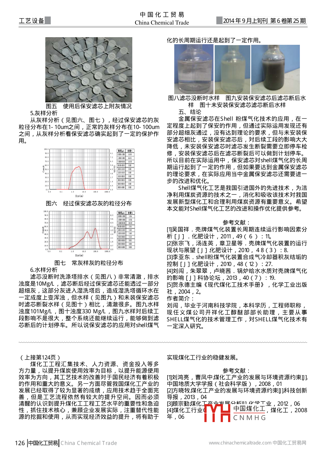 中國(guó)化工貿(mào)易2014年9月上旬刊第6卷第25期China Chemical Trade工藝設(shè)備保安濾芯在shel煤氣化中的應(yīng)用分析劉闖宋景濤馬江濤朱翠翠(河南開祥化工有限公司,河南義馬472300 )摘要:Shell的粉煤氣化技術(shù)在中國(guó)得到了廣泛的應(yīng)用,作為氣化核心裝置的S1501高溫高壓飛灰過濾器陶瓷濾芯斷裂問題,嚴(yán)重影響了系統(tǒng)的長(zhǎng)周期運(yùn)行,保安濾芯的應(yīng)用對(duì)hel煤氣化長(zhǎng)周期運(yùn)行起到了-定的作用,本文對(duì)金屬保安濾芯在Shell粉煤氣化技術(shù)應(yīng)用進(jìn)行了分析。關(guān)鍵詞: shell煤氣化保安濾芯 應(yīng)用分析潔凈煤技術(shù)是充分利用我國(guó)煤炭資源,提高燃燒效從表- -安裝保安濾芯前后控制參數(shù)對(duì)比看,除了反率,減少環(huán)境污染的重大戰(zhàn)略舉措, Shell的粉煤氣化吹時(shí)間間隔發(fā)生 變化,其余都保持不變。技術(shù)在中國(guó)得到了廣泛的應(yīng)用,主要用于合成氨裝置的表一安裝保安濾芯前后控制參 數(shù)對(duì)比油改煤”技術(shù)改造、煤制氫及煤制甲醇。作為氣化核參數(shù)改造前I改造后心裝置的S1501高溫高壓飛灰過濾器陶瓷復(fù)合過濾元件反吹壓降kpa200在運(yùn)行中普遍存在易折斷現(xiàn)象,導(dǎo)致反吹氣系統(tǒng)污染,反吹閥氣源壓力Map0.8控制閥門、儀表?yè)p壞,同時(shí)合成氣被粉塵污染,氣體排放超標(biāo),嚴(yán)重影響了系統(tǒng)的正常運(yùn)行,僅每次停車檢修反吹間隔時(shí)間s5046帶來的經(jīng)濟(jì)損失就近500萬元。即便采用金屬?gòu)?fù)合過濾反吹時(shí)間ms_260元件因規(guī)格的要求也無法完全避免斷裂的可能,為了避2.安裝保安濾芯前后15PDT0002 (濾芯上下壓差)免復(fù)合過濾元件在運(yùn)行操作中突然破裂,污染氣源及下變化分析游系統(tǒng),提高過濾系統(tǒng)的可靠性和穩(wěn)定性, 在每根復(fù)合從圖三可以看出,金屬保安濾芯安裝后沒有上漲,過濾元件上安裝失效保護(hù)過濾元件即保安濾芯,這樣確反而下降。 分析原因是安裝金屬保安濾芯時(shí)對(duì)文丘里反保單根復(fù)合過濾元件損壞單根切出,維持系統(tǒng)不停車,吹管進(jìn)行了改造;改造后反吹氣量增加,這樣造成負(fù)壓實(shí)現(xiàn)裝置長(zhǎng)周期穩(wěn)定運(yùn)行,設(shè)置保安濾芯目的就是防止側(cè)壓 力相對(duì)之前升高,就造成15PDT 00在安裝金屬保未凈化合成氣進(jìn)入反吹氣源及下游系統(tǒng)。采用陶瓷材質(zhì)安濾芯安裝后沒有 上漲,反而下降。的安保濾芯在設(shè)計(jì)和材質(zhì)上同樣存在著抗熱震性較差的根源,金屬材質(zhì)的保安濾芯的使用在一定程度 上延長(zhǎng)了系統(tǒng)的運(yùn)行,實(shí)現(xiàn)了Shell粉煤氣化技術(shù)長(zhǎng)周期運(yùn)行。、 金屬保安濾芯的設(shè)計(jì)優(yōu)點(diǎn)采用復(fù)合強(qiáng)化結(jié)構(gòu)有效的增加了保安濾芯滲透通.口安裝前。安裝后量,使得保安濾芯引起的系統(tǒng)阻力降遠(yuǎn)小于4kpa ,保安濾芯的整體強(qiáng)度較陶瓷濾芯有了質(zhì)的飛躍(尤其在熱抗震性方面) ,大大提高了其承壓能力(抗外壓能力>4MPa) ,確保了高溫高壓飛灰過濾 器運(yùn)行期間的安全性安裝前安裝后和反吹的實(shí)用性。同時(shí),簡(jiǎn)易的連接結(jié)構(gòu)使安裝和拆卸更易于操作。圖三 安裝保安濾芯前后15PDT0002比較二、金屬保安濾芯的性能要求3.濾芯斷裂后15PDT 0002變化分析在S1501設(shè)計(jì)條件下,增加保安濾芯壓阻提高小于本單位某次因反吹閥故障導(dǎo)致一組濾芯發(fā)生斷裂,4kPa。在陶瓷復(fù)合過濾元件折斷情況下,安保濾芯機(jī)械圖四是 濾芯斷裂后15PDT0002-一個(gè)月的變化趨勢(shì),從圖使用壽命為3年。不停車狀態(tài)下,實(shí)現(xiàn)單根陶瓷復(fù)合過中可以看到 ,隨著時(shí)間的增長(zhǎng)15PDT 0002處于上升趨濾元件切除。保安濾芯相對(duì)透氣系數(shù)大于9000m3/h.m2.勢(shì)。 因?yàn)楫?dāng)濾芯斷裂后未過濾合成氣以高速進(jìn)入金屬保kPa;保安濾芯承壓能力不低于4Mpa。安濾芯內(nèi),細(xì)小的粉塵顆粒將深入到保安濾芯材料內(nèi)部,隨著時(shí)間的增長(zhǎng),保安濾芯被逐漸堵塞,這樣造成金屬保安濾芯的安裝需對(duì)文丘里管、小管板等內(nèi)部保安濾芯過 氣性變差或不過氣, 15PDT0002的壓差就會(huì)元件進(jìn)行部分改造(見圖一、圖二)隨之.上漲。改造前改造后圖四濾芯斷裂后15PDT0002變化趨勢(shì)4.保安濾芯過濾效果分析圖五是濾i中國(guó)煤花左打開設(shè)備看保安圖-文丘里管改造前后對(duì)比圖二小管板改造前后對(duì)比濾芯附灰情況=:芯沒有起到理論四、金屬保安濾芯的應(yīng)用分析上的保安效果TMHCNMHG部分超細(xì)灰經(jīng)過1.安裝保安濾芯前后控制參數(shù)對(duì)比了保安濾芯China C hemical Trade |中國(guó)化工貿(mào)易| 125中國(guó)化工貿(mào)易工藝設(shè)備China Chemical Trade2014年9月上旬刊第6卷第25期化的長(zhǎng)周期運(yùn)行還是起到了-定作用。圖八濾芯沒斷時(shí)水樣圖九安裝 保安濾芯后濾芯斷后水圖五使用后保安濾芯上附灰情況樣圖十未安裝保安濾芯濾芯斷后水樣5.灰樣分析五、結(jié)論從灰樣分析(見圖六、圖七),經(jīng)過保安濾芯的灰.金屬保安濾芯在Shell粉煤氣化技術(shù)的應(yīng)用,在一粒徑分布在1- 10um之間,正常的灰樣分布