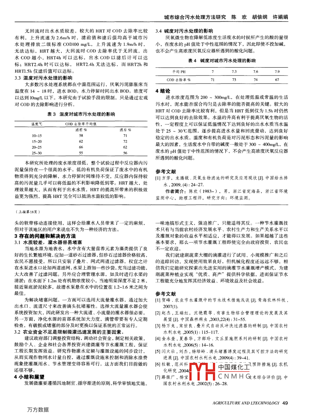 農(nóng)業(yè)與技術(shù)第32卷第1期2012年1 月城市綜合污水處理方法研究陳歡,胡倍綱,許娟娟(浙江省環(huán)境監(jiān)測(cè)中心,浙江杭州310015)摘要:隨著世界人口不斷的增加和工農(nóng)業(yè)生產(chǎn)的發(fā)展,國(guó)家和地方政府非常重視污水處理事業(yè),對(duì)解決和控制水體污染起了重大作用。目前,對(duì)污水生物處理技術(shù)進(jìn)行簡(jiǎn)要介紹,對(duì)這樣的現(xiàn)象采取哪些實(shí)際而經(jīng)濟(jì)的措施,針對(duì)城市污水現(xiàn)狀,簡(jiǎn)單的描述厭氧處理污水工藝及研究意義。關(guān)鍵詞:厭氧處理污水;措施;研究意義中圖分類(lèi)號(hào): TU984.11+5文獻(xiàn)標(biāo)識(shí)碼: A .1我國(guó)城市污水處瑁存在的問(wèn)題表1上升流速對(duì)城市污水處理的影響我國(guó)城鎮(zhèn)污水處理的能力突飛猛進(jìn),在實(shí)際工作中污水處理工況上升流速(m/h) 最大值% COD 去除率最小值%平均值%費(fèi)難收繳,當(dāng)前城市污水處理設(shè)施建設(shè),必然導(dǎo)致已建成的污水.4796771處理廠無(wú)法正常運(yùn)行,運(yùn)行等方面依然存在著不可忽視的問(wèn)題,.63152城市污水處理收費(fèi)制度不健全,制約著我國(guó)城市的健康發(fā)展。使城市污水處理政策執(zhí)行難到位。城市污水處理建設(shè)緩慢,污水處73理的費(fèi)用必然由地方政府承擔(dān),城市污水處理政策執(zhí)行難。城市.832污水處理費(fèi)收繳率普遍偏低,我國(guó)污水處理設(shè)施建設(shè)存在城市污在處理低溫或常溫的生活污水時(shí),膨脹程度有著非常重要的水收集管網(wǎng)與廠區(qū)建設(shè)不配套的問(wèn)題,對(duì)于財(cái)力不足的地方政府作用,從而提高了對(duì)污水中污染物質(zhì)的去除率。反應(yīng)器的底部布而言,國(guó)家雖明確規(guī)定了城市污水處理費(fèi)標(biāo)準(zhǔn),而污水處理是高水裝置對(duì)整個(gè)污泥床中泥水是否混合均勻起著很大的作用,廢水成本零效益的純公益事業(yè)。中COD濃度低于300 ~ 400mg/L時(shí),通過(guò)試驗(yàn)得到的結(jié)論是上升2厭氧處理城市污水工藝簡(jiǎn)述流速1.6-2.2m/h為最佳范圍。厭氧處理城市污水工藝同時(shí)具有去除有機(jī)物、脫氨、除磷的3.2水力停留時(shí)間對(duì)污水處理的影響效果,厭氧處理城市污水法工藝原理是磷在厭氧區(qū)被釋放,處理成本較低,在好氧區(qū)被吸收.對(duì)脫氨除磷也具有較高的去除效果,表2水力停留時(shí)間對(duì)污水處理的影響已積累一定的設(shè)計(jì)和運(yùn)行經(jīng)驗(yàn),具有運(yùn)行費(fèi)用低、占地少,出水進(jìn)水量回流水量水力停留時(shí)間容積負(fù)荷水質(zhì)好等特點(diǎn)。達(dá)到除磷目的,故在國(guó)內(nèi)外大中型城市污水處理(Lh)(Uh)(h)( kgC0D/m2.d)廠常有采用。10003厭氧處理城市污水影響因素分析150001.83.1. 上升流速對(duì)污水處理的影響250ECSB工藝技術(shù)上最大的改進(jìn)就是增加了出水回流裝置。局.000部不斷運(yùn)動(dòng)。在水流的作用下總體呈現(xiàn)懸浮狀態(tài),為了更加簡(jiǎn)明地說(shuō)明ECSB反應(yīng)器的處理效果,讓底部的污泥床膨脹起來(lái),泥300450水的混合程度也就越強(qiáng),僅列出了COD去除率。400504.8復(fù)雜有機(jī)物水解發(fā)酵脂肪酸(>C2)硫酸鹽還原C H,+CO3 K +[產(chǎn)乙酸]→乙酸]產(chǎn)甲烷|產(chǎn)甲烷CH.+CO }[硫酸鹽還原I+[ H,S+CO, ]F中國(guó)煤化工HCNMH G圖1物質(zhì)厭氧生物降解機(jī)理示意圖48 AGRICULTURE AND LTECHNOLOGY.城市綜合污水處理方法研究陳歡胡倍綱許娟娟無(wú)回流時(shí)出水水質(zhì)較差,較大的HRT對(duì)COD去除率比較3.4 堿度對(duì)污水處理的影響有利,上升流速為2.6m/h時(shí),濾前值和濾后值均高于城市污厭氧微生物在降解低濃度生活廢水的時(shí)候所產(chǎn)生的酸的量很水處理排放二級(jí)標(biāo)準(zhǔn)CODI00mg/L,上升流速為1.9m/h時(shí),小,在廢水的pH值處于中性范圍的情況下,因此即使不投加堿,無(wú)法達(dá)標(biāo),HRT 越大,大回流時(shí)COD去除率優(yōu)于無(wú)回流,出也不會(huì)產(chǎn)生高濃度厭 氧反應(yīng)器所遇到的酸化問(wèn)題。水COD越小,HRT4h 可以達(dá)標(biāo),出水COD以濾后計(jì)可以達(dá).表4堿度對(duì)城市污水處理的影響標(biāo); HRT2.4h時(shí)可以達(dá)標(biāo),HRT2.4h 無(wú)法達(dá)標(biāo),而HRT2h和HRTI.5h僅濾后值可以達(dá)標(biāo)。平均PH.37.67.93.3溫度對(duì)污水處理的影響CoD去除率%74大多數(shù)污水處理系統(tǒng)都在中溫范圍運(yùn)行,厭氧污泥膨脹床當(dāng)溫度在14~18時(shí),進(jìn)水BOD。水力停留時(shí)間出水BOD。濃度可4結(jié)論以達(dá)到l0mg/L以下。本研究由于試驗(yàn)手段的限制,只是通過(guò)宏觀進(jìn)水濃度范圍為200~300mg/L.在處理低溫或常溫的生活對(duì)COD的去除影響進(jìn)行分析。污水時(shí),泥水能否混合均勻是去除率的能否提高的關(guān)鍵。較大的HRT對(duì)COD去除率比較有利,但是當(dāng)HRT低到僅為1.5h時(shí)仍然表3溫度對(duì)城市污水處理的影響可以達(dá)到良好的去除效果。水溫的升高有利于提高厭氧生物的活溫度吧COD去除率平均值性,一定程度上可以保證低溫情況下達(dá)到良好的出水水質(zhì)當(dāng)水溫濾前%濾后%處于25~30C范圍,逐步提高進(jìn)水水量和回流量動(dòng),達(dá)到良好10-155871穩(wěn)定的出水水質(z