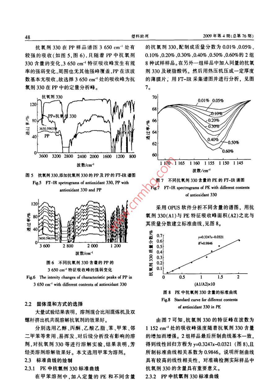 46塑料助削:2009年第4期(總第76期)性能與測(cè)試聚烯烴中抗氧劑330的快速分析方法研究楊素周正亞(中國(guó)石化揚(yáng)子石油化工股份有限公司,南京, 210048)摘要研究了紅外光譜法定性定量分析聚乙烯、聚丙烯中的抗氧劑330。分析了抗氧劑330和PE、PP粉料的FT-IR圖,確定了抗氧劑330在聚乙烯、聚丙烯中的特征吸收峰分別為1152 cm' .3 650 cm",詳細(xì)分析了抗氧劑330分別與定量的PE、PP及硬脂酸鈣所制樣品對(duì)所測(cè)譜圍和所制曲線的影響。抗氧劑330的標(biāo)準(zhǔn)曲線表明,抗氧劑330的含量與其特征峰的吸收強(qiáng)度呈良好的線性關(guān)系,相關(guān)系數(shù)達(dá)0.97以上,相對(duì)百分偏差最大為11.765%。關(guān)鍵詞紅外光譜法 聚烯烴抗氧劑定性分析定量分析Determination of Antioxidants 330 in Polyethylene by Infrared SpectrometryYang Su Zhou Zheng- ya(Yangzi Petrochemical Stock Limited Company, Nanjing, 210048)Abstract: The nature and contents of antioxidant 330 in PE and PP were measured by means of Fouriertransform infrared spectromelry (FT-IR), Suitable solvent commixing method was selecled to mix antioxidantswith PE and PP powders. By comparing FT-IR spectrograms of antioxidant 330, PE and PP, the characteristicpeaks of antioxidant 330 in PE and PP were confirmed at 1 152 cm~' and 3 650 cm", the effect of antioxidant330 with specifically composed PE, PP and calcium stearate respectively on spectrometries test and curvemade by it were analysed in detail respectively. According to standard curves of antioxidant 330,peak areas ofwhich increases linearly and perfectly along with their contents. The correlation cefficient for the test is morethan 0.97. The maximal relatively error is 11.765%.Keywords: infrared spectromelry; antioxidant; polyolefin; qualitative analysis; quantative analysis抗氧劑330屬于多功能抗氧劑類。開(kāi)發(fā)和應(yīng)用效果尤為突出。 抗氧劑的成本高,為了提高聚烯用此類抗氧劑是近期抗氧劑發(fā)展的新動(dòng)向,它集烴的產(chǎn)品質(zhì)量,降低成本,提高經(jīng)濟(jì)效益,有必要多種防老化功能于一身,故其具有一劑多功效的對(duì)聚烯烴中微量抗氧劑進(jìn)行定量研究,而紅外光特性,且常出現(xiàn)自協(xié)同作用,效率高,可從多方面譜法是一種簡(jiǎn)便、快速、準(zhǔn)確的分析方法I-。改善高分子有機(jī)物的抗氧化性能??寡鮿?30適本文研究了用紅外光譜法定性、定量分析聚用于聚烯烴、聚酯、聚苯乙烯、ABS樹(shù)脂和聚氯乙烯烴中微量抗氧劑330,解決了快速測(cè)定聚烯烴中烯等。它是橡膠、聚烯烴、塑料等制品的高效主抗微量抗氧劑330的問(wèn)題,對(duì)分析抗氧劑330在聚氧劑,特別是作為聚乙烯電線電纜料的抗氧劑作烯烴 中的影響和改性有實(shí)際意義。1實(shí)驗(yàn)部分收稿日期:2008-12-19第4期楊素,等. 聚烯烴中抗氨削330的快速分析方法研究471.1 主要儀器與試劑.含量的不同,1152 cm-'特征吸收峰發(fā)生有規(guī)率的德國(guó)BLUCK公司66S型付里葉變換紅外光譜強(qiáng)弱變化,周圍也無(wú)其他強(qiáng)峰覆蓋,PE在該波數(shù)(FI-IR)儀,分束器KBr,檢測(cè)器DTGS,譜圖的波數(shù)處基本無(wú)吸收,故選擇1 152 cm-!處的吸收峰為抗范圍(4 000~400) cm',光源能量>22 000 lm,分辨氧劑330在PE中的定量分析峰。率4.0 cm-,掃描32次,采用OPUS 5.0軟件包采集和處理數(shù)據(jù);SPECAC壓模機(jī)壓力0~15t,溫度0~30060-~C10/聚乙烯(PE)粉料、聚丙烯(PP)粉料,揚(yáng)子石油化工股份有限公司;抗氧劑330,Ciba上海公司;乙發(fā) 20↑醇、丙醇、乙酸乙脂、苯、甲苯,均為分析純;KBr,光3654000300020001000譜純。1.2 試樣的制備波數(shù)/em+用精度為0.000 1 g的電子天平秤取不同量圖2抗氧劑330 的FT-IR譜圖的抗氧劑330,將其充分溶解在溶劑中,然后分別Fig.2 FT-IR spectrogram of antioxidant與PE、PP粉料混合均勻。在通風(fēng)櫥中自然干燥36 h,紅外干燥箱中干燥6 h,直至溶劑完全揮發(fā)。100.00I 抗氧劑330用熱壓機(jī)將此試樣壓成-定厚度的薄膜片,待測(cè)。80.002結(jié)果與討論:盛60.00{PE+抗氧劑3302.1 抗氧劑330特征峰的分析與確定40.002017.392510、152.343967抗氧劑330,化學(xué)名為1,3,5-三甲基-2,4,6-20.002017392510三(3,5-二叔丁基- 4- 羥基苯甲基)苯,含有多種官能團(tuán),分子式CsuH2O3,相對(duì)分子質(zhì)量775,結(jié)構(gòu)式2200 2000 1800 1600 1400 1200 1000 800如圖1,熔點(diǎn)范圍240~260 C,適用于較高溫度加波數(shù)/m"1工的工程塑料和耐候性制品。圖3抗氧劑330.加抗氧劑330的PE及PE的FT-R譜園C(CH)Fig.3 FT-IR spectrograms of antioxidant 330, PE withOHantioxdant 330 and PECH(CH)CCH2100H2C30F(CH)oCC(CH) .i 40圖1抗氧劑330的分子結(jié)構(gòu)式Fig.1 The molecular structrue of antioxidant 3302200180014001000 800紅外光譜譜圖(如圖2)中,較強(qiáng)的特征吸收在波數(shù)/em'1152 cm-及3 650 cm*,分析認(rèn)為1152 cm~|峰是C-C伸縮振動(dòng)的特征吸收峰,3650 cm"|峰是C-0H圖4不同抗氧劑330含量的PE的伸縮振動(dòng)的特征吸收峰。1152em-t特征吸收峰的強(qiáng)弱變化抗氧劑330在PE樣品譜圖1152 cm-'處有較Fig.4 The intersity changes of characteristic peaks in強(qiáng)的吸收(如圖3、圖4),且隨著PE中抗氧劑3301 152 cm-' of PE with diferent contents of antioxidant 33048塑料助刑2009年第4期(總第76期)抗氧劑330在PP樣品譜圖3 650 cm~'處有的抗氧劑330,配制成質(zhì)量分?jǐn)?shù)為0.01%.0.05%、較強(qiáng)的吸收(如圖5,圖6),月隨著PP中抗氧劑0.10% .0.20%、0.30%、0.40%、0.50%、0.60%的2組330含量的變化,3650 cm-'特征吸收峰發(fā
