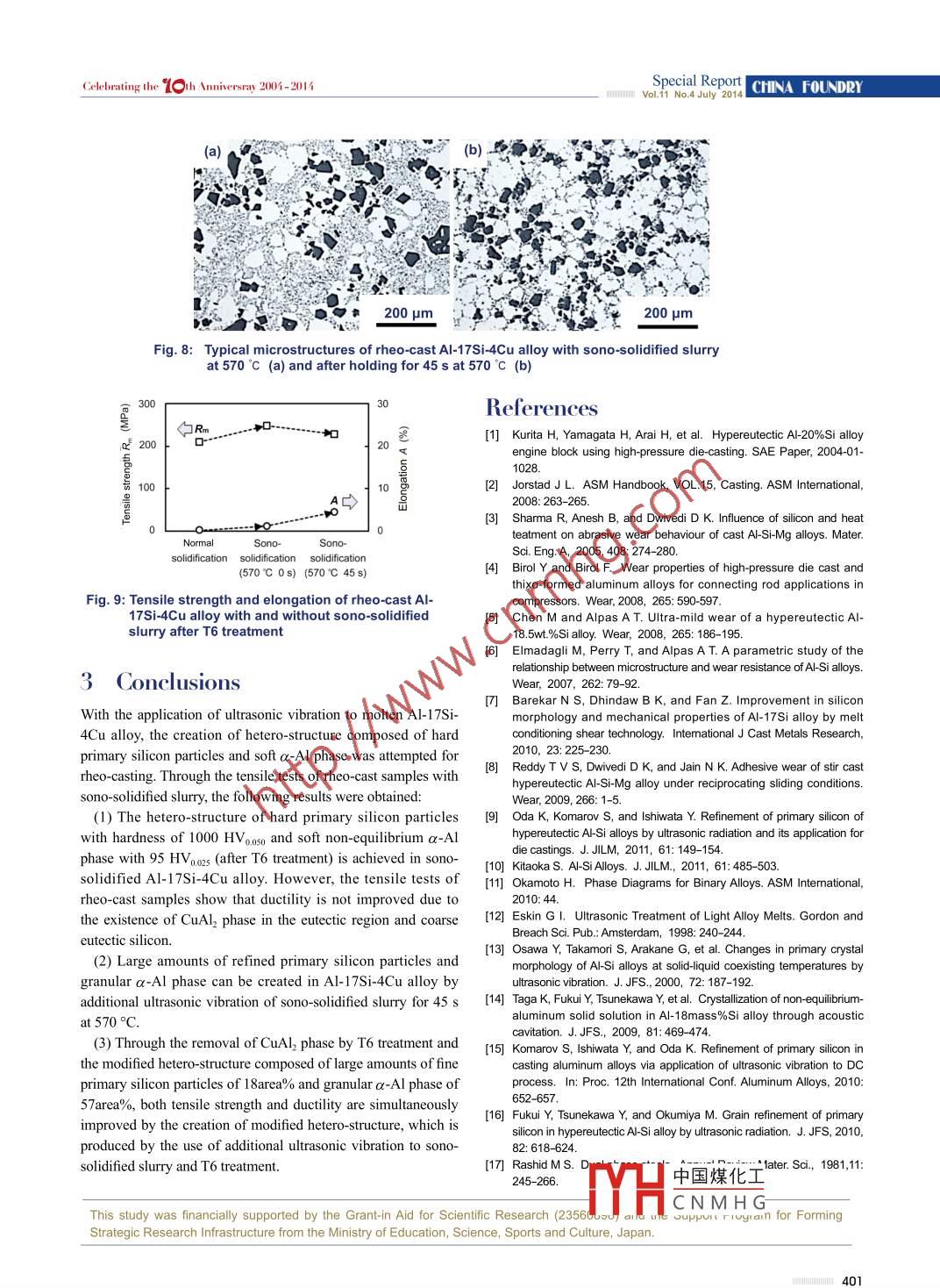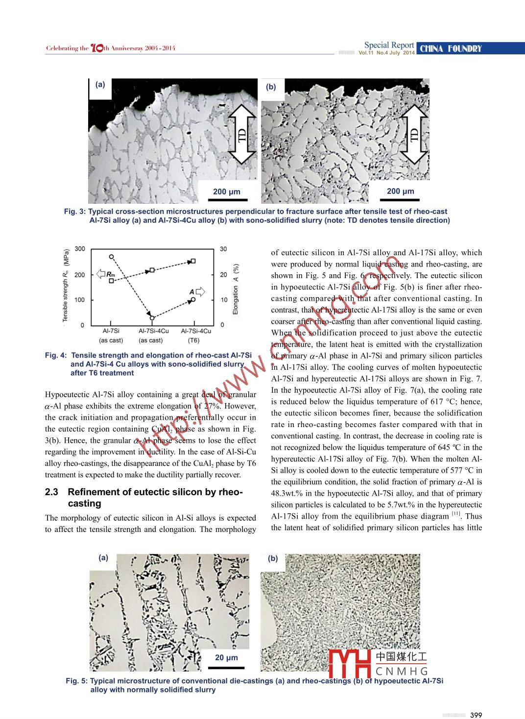 Special ReportCHINA FoUNdRYVol.11 No.4 July 2014 ..Celebrating the 1 G h Anniversray 2004-2014Improvement in mechanical properties ofhy pereutectic Al-Si-Cu alloys through sono-solidified slurry*Yoshiki Tsunekawa', Shinpei Suetsugu', Masahiro Okumiya', Naoki Nishikawa', and Yoshikazu Genma?1. Toyota Technological Institute, Tenpaku, Nagoya 468-8511, Japan;2. Toyota Motor Corporation, Toyota 471-8571, JapanAbstract: For the wider applications, it is necessary to improve theductility as well as the strength and wear-resistance of hypereutectic AI-Si-Cu alloys, which are typical light-weight wear-resistant materials. Anincrease in the amounts of primary silicon particles causes the modifiedwear-resistance of hypereutectic Al-Si-Cu alloys, but leads to the poorstrength and ductility. It is known that dual phase steels composed ofhetero-structure have succeeded in bringing contradictory mechanicalproperties of high strength and dutility concurrntly. In order to applythe idea of hetero-structure to hypereutectic Al-Si-Cu alloys for theachievement of high strength and ductility along with wear resistance,ultrasonic iradiation of the molten metal during the solidification, whichis called sono-solidification, was carried out from its molten state to justabove the eutectic temperature. The sono-solidified AI-17Si4Cu alloy iscomposed of hetero-structure, which are, hard primary silicon particles,soft non-equilibrium a-AI phase and the eutectic region. Rheo-castingwas performed at just above the eutectic temperature with son-olidifedslurry to shape a disk specimen. After the rheo-casting with modified sono-* Yoshiki Tsunekawasolidified slury held for 45 s at 570 °C, the quantitative optical microscopee, borm in 1945, is currentlyobservation exhibits that the microstructure is composed of 18area% ofhard primary silicon particles and 57area% of soft c-AI phase. In contrast,Institute. He has been working inthere exist only 5 area% of primary silicon particles and no a-AI phase inthe fields of casting processes withrheo-cast specimen with normally solidified slurry. Hence the tensile testsultrasonic vibration, wettability inof T6 treated rheo-cast specimens with modified sono-solidified sluryexhibit improved strength and 5% of elongation, regardless of havingphenomenon at the vibrating endmore than 3 times higher amounts of primary silion particles compared tosurface and sono- solidification, asthat of rheo-cast specimen with normally solidified slurry.well as reactive thermal spraying.Key words: semisolid casting; slurry; ultrasonic vibration; sono-publication of more than 150 peer-solidification; hetero-structure; hypereutectic aluminumreviewed papers in interationallyalloy; primary silion; a-Al solid solutionpublished journals. From 2003CLC numbers: TG146.21Document code:APresident of the Japan ThermalArticle ID: 1672-6421(201404-396-06Spray Sociey. He has been a Fellowof ASM International since 2009and President of the Japan FoundryPhe wider applications of aluminum alloy components are expected to achieveEngineeing Society from 2010 toweight reduction of transport equipment such as automobiles. Since hypereutectic2012.Al-Si alloys exhibit high strength at elevated temperatures, good wear resistance and中國(guó)煤化Ioyta-ti.acjpsmall thermal expansion cofficient, they have been applied to compressor and engicomponents ". 21. These outstanding material characteristics are mainly owing to hCNM H25-25primary silicon particles crystallized during the solidification. It is known that highSpecial ReportCelebrating the 16 th Anniversray 2004-2014CHINA FOUNDRYamounts of crystallized primary silicon particles are required temperature and degassed with argon bubbling for 15 min. Afterto improve the wear resistance 8, finer and granular primaryimmersing the ultrasonic radiator in the molten aluminum alloy,silicon particles are moreover necessary to assure high strength the sample was cooled down to a given semisolid temperatureand ductility [9.10. However, the liquidus temperature of with ultrasonic vibration. Additionally, normal solidification washypereutectic Al-Si alloys rapidly increases with an increasealso carried out without ultrasonic vibration to compare with thein silicon content, so that the addition of the alloying element sono-solidified microstructure. Semisolid slurries cooled downsilicon extends the semisolid temperature range composed ofto a given temperature with or without ultrasonic vibration wereliquid alloy and solid silicon . Consequently, the primaryrheo-cast immediately after pouring into a sleeve.silicon particles are ready to grow coarsely during thesolidification, which causes the mechanical properties, plasticdeformability and machinability to deteriorate. As a counterTable 1: Chemical compositions of original ingots formeasure, the generation of heterogeneous nucleus of AlP isrheo-casting with sono-solidified slurryknown to be quite effective in refining primary silicon particlesAlloy No. SiCuFeMnPAIin hyereutectic AI-Si aloys 'Si7.020.0070.14 0.002 0.0004 Bal.Hard primary silicon particles are made finer by ultrasonic0.09 0.010vibration of the molten hypereutectic A1-Si alloys during25Si25.0 0.002 0.047 0.002 0.0002 Bal.the solidification, which is called sono-solidification7Cu0.0727.070.140.001< 0.001Bal.The authors have reported that non-equilibrium a-Al phaseappears in hypereutectic Al-Si alloys in sono-solidification“, in addition to the refinement of primary silicon particles.The rheo-casting apparatus shown in the bottom of Fig. 1In contrast, the usually contradictory mechanical properties of consisted of plunger tip, sleeve and mold. The plunger tip wasstrength and ductility are concurrently improved by creatingdirectly connected with a 20-ton oil cylinder, whose moving ratehetero-structure composed of hard and soft dual phases in steels was set at 0.05 ms' without loading. The preheat temperature ofn. Then the expression of characteristics arising from hetero-the