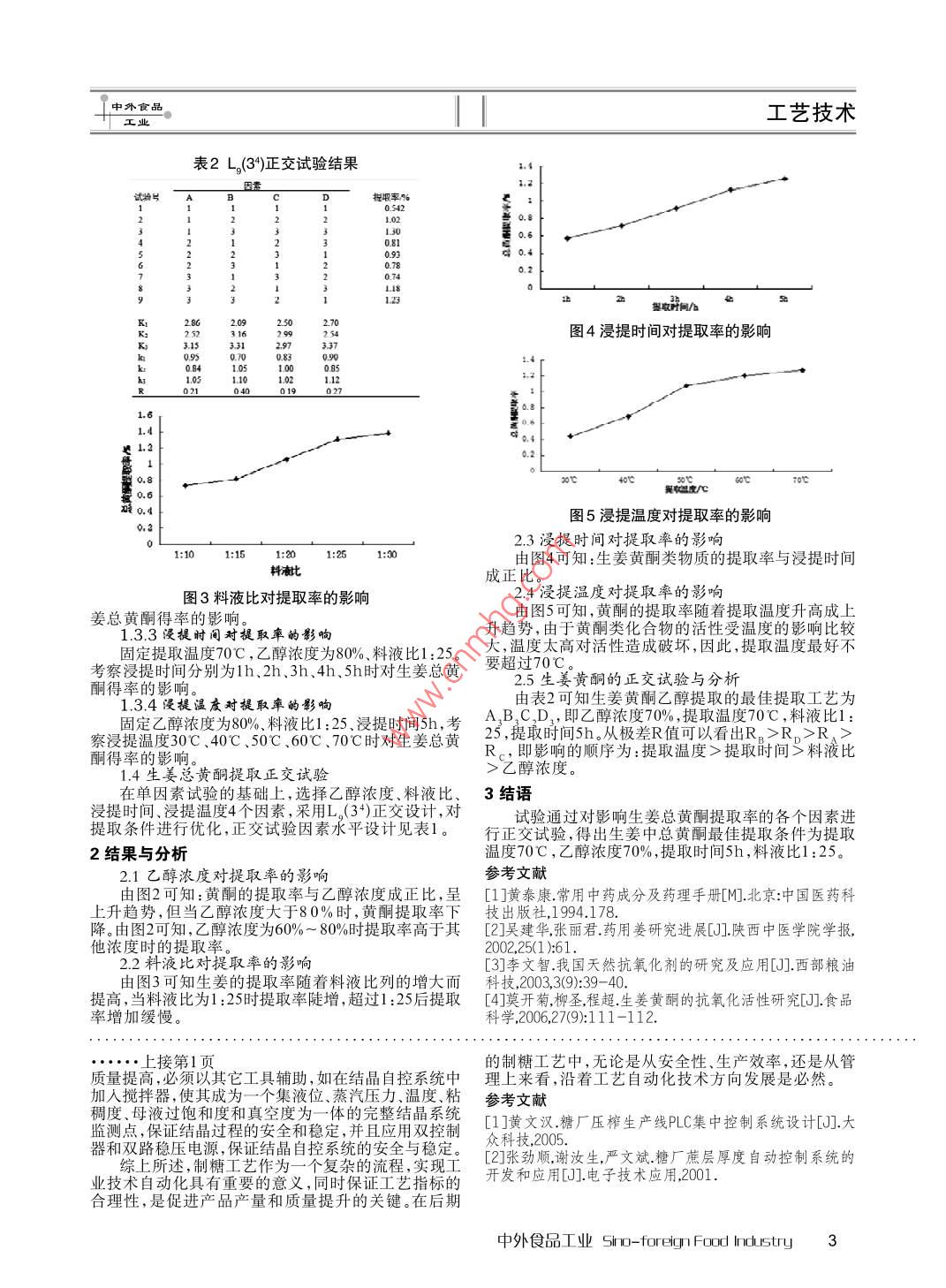 工藝技術(shù)中外宦品工業(yè)生姜黃酮乙醇提取條件的優(yōu)化研究王海燕(金陵科技學(xué)院江蘇南京211159摘要:本文以生姜為原料,采用單因素試驗和正交試驗來確定生姜黃酮乙醇提取的工藝,結(jié)果表明提取溫度70℃,乙醇濃度70%,提取時間5h,料液比1:25為最佳提取工藝。關(guān)鍵詞:生姜黃酮乙醇提取中圖分類號R284.1文獻(xiàn)標(biāo)識碼:A文章編號:1672-53362014)04-0002-02姜屬姜科,為植物姜的干燥根莖或鮮根莖,多年生試劑:蘆丁生化試劑,上?;瘜W(xué)試劑公司,氫氧化草本植物。具有散寒解表,溫中止吐,回陽通脈,燥濕消鈉、硝酸鋁ξ醇、無水乙醇、亞硝酸鈉均為分析純痰的功效除含有姜油酮姜酚等主要生理活性物質(zhì)儀器:鼓風(fēng)干燥箱(DHG-9240A型)、高速萬能粉外,還含有蛋白質(zhì)、多甙、維生素和多種微量元素,集營碎機(jī)(XL-400型)、精密電子天平(FA1204N型)、數(shù)控養(yǎng)、調(diào)味、保健于一身。近年來一些研究表明:生姜中還超聲波清洗器(KQ-500DB型)、旋轉(zhuǎn)蒸發(fā)器(EV351含有大量的黃酮類化合物黃酮類化合物是一大類天型)、循環(huán)水多用真空泵(SHB-)、紫外可見分光光度然產(chǎn)物,廣泛存在于植物界,是許多中草藥的有效成計(UV752型)、試管、l0mL離心管、移液搶等分。李文智3發(fā)現(xiàn)將粗姜汁離心分離得到的上清液比1.2生姜總黃酮測定方法沉淀物的抗氧化性能要大得多,造成這種差異的原因12.1樣品的制備生姜洗凈晾干,切成5mm厚的姜片,于70℃烘干,醇作為提取劑,通過正交實驗硏究生姜黃酮的最佳提用萬能粉碎機(jī)粉碎,存放4℃冰箱中待用取條件,為開發(fā)利用生姜提供一定的科學(xué)依據(jù)1.2.2蘆丁標(biāo)準(zhǔn)曲線的繪制1材料與方法稱取蘆丁0.02g,用60%乙醇溶解并定容至100mL,材料、試劑和儀器得濃度為0.2mg/ml蘆丁標(biāo)準(zhǔn)溶液。采用NaNO,-Al(NO3)3-NaOH絡(luò)合一分光光度計法,以蘆丁為標(biāo)準(zhǔn)樣測材料:生姜購于南京蘇果超市定生姜提取物總黃酮含量。吸取蘆丁標(biāo)準(zhǔn)溶0.5mL1.0mL、1.5mL、2.0mL、2.5mL、3.0mL于6個25ml容量y209瓶中,加30%乙醇至5m1,加5%NaNO,溶液1ml,搖勻放置6min,加10%A(NO)2溶液lml,搖勻放置6min后加lmol/ NAoh溶液10ml,加70%乙醇至刻度,搖勻放置15分鐘。以試劑作為空白,于510nm波長處測定吸光度,繪制標(biāo)準(zhǔn)曲線,得回歸方程:y=12.300x+0.0200R2=0.9988,見圖1由圖1可知,在0.02~0.lmg/ml范圍內(nèi)有良好線性關(guān)系質(zhì)量濃度《m/11.2.3生姜總黃酮含量的測定稱取生姜粉2g,用70%乙醇溶液50ml溶解,70℃水圖1蘆丁標(biāo)準(zhǔn)曲線浴下回流提取3h,趁熱過濾,濾渣進(jìn)行二次提取,合并濾液用乙醇定容至100mL,得生姜提取液。取提取液1.0ml按照標(biāo)準(zhǔn)曲線反應(yīng)方法,測得吸光值,帶入回歸方程,計算出黃酮質(zhì)量濃度C。提取率按此公式計算Y=(m×V×100)/M×100%Y為總黃酮得率,%;m為1.0mL總黃酮的含量,mgM為稱取的生姜粉質(zhì)量,mg;V為提取液總體積,mL1.3單因素試驗按照1.2.3的試驗方法,精確稱量固定其他因素的乙除庭條件下,考慮乙醇濃度(50%,60%,70%,80%,90%)、料圖2乙醇濃度對提取率的影響液比(1:10、1:15、1:20、1:25、1:30)、浸提時間(lh、2h3h、4h、5h)、浸提溫度(30℃、40C、50℃、60℃、70C)四表1生姜中總黃酮提取的正交試驗因素水平設(shè)計個因素做單因素試驗因素1.3.1乙醇濃度對提取率的影響固定料液比1:20(g:ml)、浸提時間5h、提取溫度水平70℃,考察乙醇濃度分別為50%、60%、70%、809和909時醇濃提取溫料液比提取時度(%)對生姜總黃酮得率的影響(g: ml)1.3.2料液比對提取率的影響固定浸提時間5h、提取溫度70℃,乙醇濃度為80%,考察料液比分別為1:10、1:15、1:20、1:25、1:30時對生1:302中外食品工業(yè)- oreign Food Indust中外食品工藝技術(shù)表2L3)正交試驗結(jié)果試號捉取率鴨56789KA111222333&2圖4浸提時間對提取率的影響.46d2t86圖5浸提溫度對提取率的影響23浸提時間對提取率的影響1:15由圖4可知:生姜黃酮類物質(zhì)的提取率與浸提時間成正比圖3料液比對提取率的影響2.4浸提溫度對提取率的影響姜總黃酮得率的影響由圖5可知,黃酮的提取率隨著提取溫度升高成上1.33浸提時間對提取率的影響升趨勢,由于黃酮類化合物的活性受溫度的影響比較固定提取溫度70℃,乙醇濃度為80%、料液比1:25。大,溫度太高對活性造成破壞,因此,提取溫度最好不為1h、2h、3h、4h、5h時對生姜總黃酮得率的影響2.5生姜黃酮的正交試驗與分析134浸提溫度對提取率的影響由表2可知生姜黃酮乙醇提取的最佳提取工藝為固定乙醇濃度為80%料液比1:25,浸提時間5h,考A2BCD1即乙醇濃度70%,提取溫度70℃,料液比1:25提取時間5h。從極差R值可以看出RB>RD>R4>提溫度30c、40℃、50C.60c、70c時對生姜總黃Rc,即影響的順序為:提取溫度>提取時間>料液比酮得率的影響1.4生姜總黃酮提取正交試驗>乙醇濃度。在單因素試驗的基礎(chǔ)上,選擇乙醇濃度、料液比、3結(jié)語提取條件進(jìn)行優(yōu)化,正交試驗因素水平設(shè)計見表1。行正交試驗,得出生豐總黃酶最佳提取條件為取2結(jié)果與分析溫度70℃,乙醇濃度70%,提取時間5h,料液比1:252.1乙醇濃度對提取率的影響參考文獻(xiàn)由圖2可知:黃酮的提取率與乙醇濃度成正比,呈[1]黃泰康常用中藥成分及藥理手冊[M北京:中國醫(yī)藥科上升趨勢,但當(dāng)乙醇濃度大于80%時,黃酮提取率下技出版社,1994.178降。由圖2可