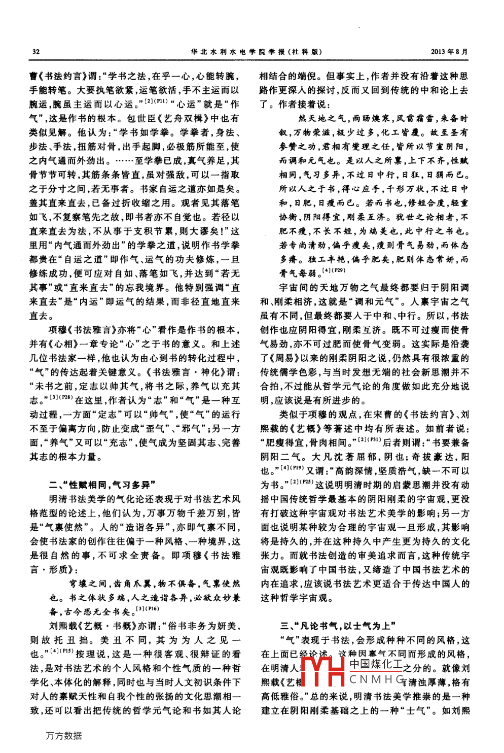 第29卷第4期華北水利水電學(xué)院學(xué)報(社科版)Vol 29 No 42013年8月Joumal of North China Institute of Water Conservancy and Hydroelectric Power( Social ScienceAug22013從“人氣”到“書氣”明清書法美學(xué)中的氣化論史鴻文(華北水利水電大學(xué)圖書館,河南鄭州450045)免、費(fèi)、免、費(fèi)免、、免、免、免、免免、免、、免、免角、免、免使免、免、免,免、免、免免、身、免、、免、克免,免、、免,免,免免免、免,免摘要:明清書法美學(xué)廣泛吸收了中國傳統(tǒng)哲學(xué)和美學(xué)中的“氣化”學(xué)說,以氣論書,強(qiáng)調(diào)“學(xué)書必先作氣”、“性賦相同,氣習(xí)多異”、“凡論書氣,以士氣為上”等,形成了從“人氣”到“書氣”的氣化系統(tǒng)論。關(guān)輸詞:明清書法美學(xué);人氣;書中圖分類號:B-49文獻(xiàn)標(biāo)識碼:A文章編號:1008-44442013)04-0031-03中國古代藝術(shù)美學(xué)稟承了中國傳統(tǒng)哲學(xué)的元?dú)庵?指迄于尖,撮管懸臂,而后運(yùn)筆。運(yùn)之既久,論。自曹丕提出“文以氣為主”之后,源于哲學(xué)中的使臂腕如鐵,指尖堅勁,運(yùn)筆如飛,縱橫收放,心元?dú)庹摫愠闪酥袊囆g(shù)美學(xué)的一條基線,它貫穿到不知有手,手不知有筆0中國藝術(shù)美學(xué)的方方面面,在不同藝術(shù)門類的美學(xué)氣”是從內(nèi)心發(fā)出的一種動力因素,作氣的過學(xué)說中均有所體現(xiàn)。明清書法美學(xué)作為中國書法美程是先盡一身之力于握筆之臂,然后這種“氣”就會學(xué)的集大成者,廣泛地吸收了中國傳統(tǒng)哲學(xué)和美學(xué)順著臂歸于握筆之指,再從握筆之指達(dá)到指尖,由指中的“氣化”學(xué)說,并對中國傳統(tǒng)藝術(shù)美學(xué)以氣論尖到筆中,再由筆轉(zhuǎn)化為氣韻生動的書法作品。經(jīng)藝、以氣論書的觀念做了全方位的總結(jié),并提出了一過這種充分“作氣”、“運(yùn)氣”的過程而創(chuàng)造出來的書些新的觀點(diǎn)。法作品,往往會達(dá)到極高的境界,而這一切都是在“運(yùn)筆如飛,縱橫收放,心不知有手,手不知有筆”的“學(xué)書必先作氣”忘我境界中完成的。由這種“作氣”、“運(yùn)氣”的觀點(diǎn)中國傳統(tǒng)哲學(xué)的氣化論是從宇宙天地的自然之出發(fā),他還批評了當(dāng)時單純強(qiáng)調(diào)“運(yùn)腕”作書的氣講起的,而這種自然之氣貫穿于宇宙間的萬事萬觀念物,人作為字宙間的一份子,也要稟受這種自然之氣書有遠(yuǎn)腕之說,而不及臂指;更有言運(yùn)骯的賦予。自然界以陰陽二氣為核心,構(gòu)筑了一個生者,欲腕之轉(zhuǎn)動而成書,引王右軍之愛蝸,謂取生不息的物象運(yùn)化系統(tǒng)。人體就是一個小宇宙,他其轉(zhuǎn)項若動脘。穿鑿甚矣!是蓋不知運(yùn)之義而也有自己的氣化系統(tǒng)?!叭藲狻币浴靶臍狻睘楹诵?腕之為何物也。夫運(yùn)者,先運(yùn)其心,次運(yùn)其身,“心氣”足便會在應(yīng)對事物時得心應(yīng)手。藝術(shù)創(chuàng)作運(yùn)一身之力,盡歸臂脘,堅如屈鐵,注全力于指也不例外,所以明清書法美學(xué)“心”、“氣”相連,認(rèn)為尖。運(yùn)之既久,俾指尖勁捷,運(yùn)筆如飛,迨乎至作書寫字,務(wù)求從內(nèi)心處作氣,氣順心暢,方可由內(nèi)精極熟,則折釵、屋漏、壁坼之妙,自然具于筆畫及外,眾妙兼?zhèn)?。清代嘉慶年間書法家朱履貞在之間,而畫沙、印泥之境于是乎可得矣!1P1《書學(xué)捷要》中把書法創(chuàng)作中的“作氣”、“運(yùn)氣”看說明作書不是單純地運(yùn)腕,而是由內(nèi)及外全身得十分關(guān)鍵。如他說心地運(yùn)氣,一旦運(yùn)氣精熟,力貫身心,便可使折釵、屋王右軍云:“心是將軍。”故學(xué)書必先作氣,漏、壁坼之妙,畫沙、印泥之境不期而至立志高邁,勇猛精進(jìn)。盡一身之力向臂,臂歸與朱履貞觀點(diǎn)接近的還有宋曹與包世臣等,宋收稿日期:2013-05-08中國煤化工作者簡介:史鴻文(1962一),男,河南洛寧人,華北水利水電大學(xué)圖書館教授。CNMHG華北水利水電學(xué)院學(xué)報(社科版)2013年8月曹《書法約言》謂:“學(xué)書之法,在乎一心,心能轉(zhuǎn)腕,相結(jié)合的端倪。但事實上,作者并沒有沿著這種思手能轉(zhuǎn)筆。大要執(zhí)筆欲緊,運(yùn)筆欲活,手不主運(yùn)而以路作更深入的探討,反而又回到傳統(tǒng)的中和論上去腕運(yùn)腕雖主運(yùn)而以心運(yùn)。1m)“心運(yùn)”就是“作了。作者接著說氣”,這是作書的根本。包世臣《藝舟雙楫》中也有然天地之氣,雨旸燠寒,風(fēng)雷霜雪,來備時類似見解。他認(rèn)為:“學(xué)書如學(xué)拳。學(xué)拳者,身法、敘,萬物榮滋,極少過多,化工皆覆。故至圣有步法、手法,扭筋對骨,出手起腳,必極筋所能至,使參贊之功,君相有燮理之任,皆所以節(jié)宣陰陽之內(nèi)氣通而外勁出。……至學(xué)拳已成,真氣養(yǎng)足,其而調(diào)和元?dú)庖?。是以人之所稟,上下不齊,性賦骨節(jié)節(jié)可轉(zhuǎn),其筋條條皆直,雖對強(qiáng)敵,可以一指取相同,氣習(xí)多異,不過日中行,日狂,日狷而已。之于分寸之間,若無事者。書家自運(yùn)之道亦如是矣所以人之于書,得心應(yīng)手,千形萬狀,不過日中蓋其直來直去,已備過折收縮之用。觀者見其落筆和,日肥,日瘦而已。若而書也,修短合度,輕重如飛,不復(fù)察筆先之故,即書者亦不自