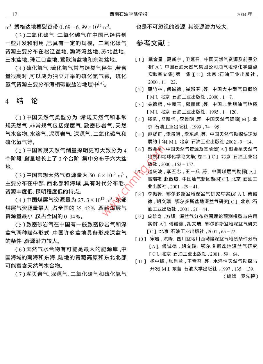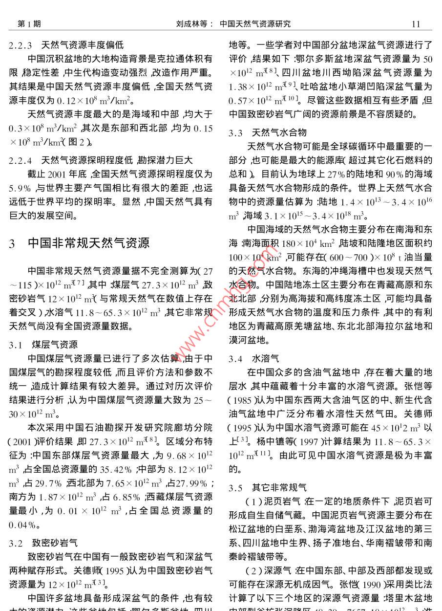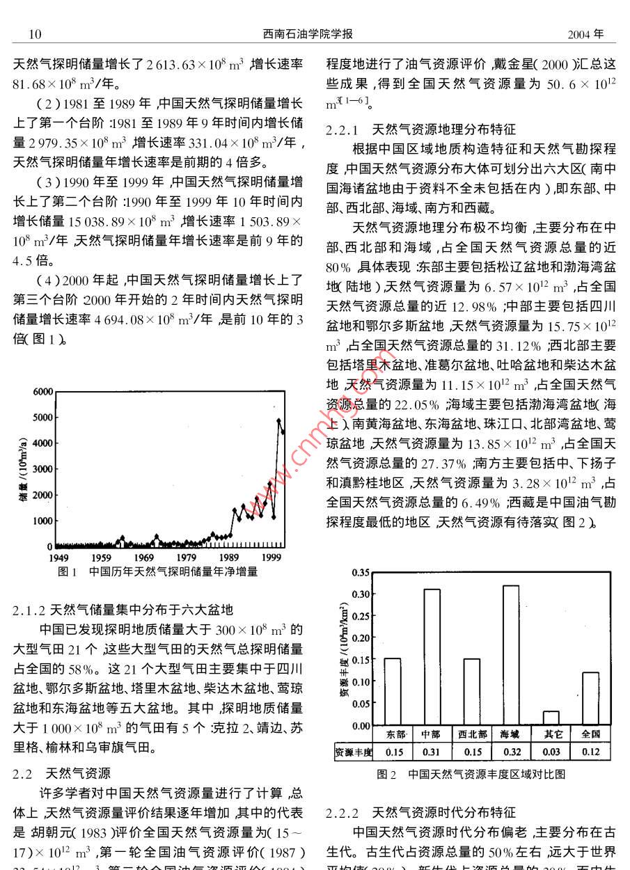 第26卷第1期西南石油學(xué)院學(xué)報(bào)Vol.26 No. 12004年2 月Journal of Southwest Petroleum InstituteFeb 2004文章編號(hào):1000 - 2634( 2004 )01 - 0009 - 04中國(guó)天然氣資源研究劉成林12 ,李景明2 ,李劍2 ,朱玉新,王浩+(1.石油大學(xué)北京昌平102249 ;2.中國(guó)石油勘探開(kāi)發(fā)研究院廊坊分院;3.中國(guó)石油勘探開(kāi)發(fā)研究院;4.勝利石油管理局建設(shè)項(xiàng)目經(jīng)濟(jì)技術(shù)評(píng)估咨詢中心)摘要:在大量統(tǒng)計(jì)數(shù)據(jù)的基礎(chǔ)上對(duì)中國(guó)天然氣資源從類(lèi)型、富集程度、分布特征等方面進(jìn)行了研究。首先,中國(guó)常規(guī)天然氣儲(chǔ)量探明史可大致分為4個(gè)階段,儲(chǔ)量增長(zhǎng)上了3個(gè)臺(tái)階集中分布于六大盆地;其次常規(guī)天然氣資源,主要分布在中部、西北部和海域其特點(diǎn)為時(shí)代分布老、豐度低、探明程度低、潛力大;第三,中國(guó)煤層氣資源量主要富集在東部、中部和西北部第四致密砂巖氣有一般致密砂巖氣和深盆氣兩種賦存形式,中國(guó)許多盆地具備形成深盆氣的條件也有較大的資源潛力第五中國(guó)海域的南海和東海陸地的青藏高原和東北北部可能富含天然氣水合物;第六中國(guó)眾多含油氣盆地的地層水蘊(yùn)藏著十分豐富的水溶氣資源最后泥頁(yè)巖氣、深源氣、二氧化碳?xì)夂土蚧瘹錃庖彩遣豢珊鲆暤馁Y源具有較大的資源潛力。關(guān)鍵詞:常規(guī)天然氣;非常規(guī)天然氣;煤層氣;致密砂巖氣;天然氣水合物水溶氣中圖分類(lèi)號(hào):TE155文獻(xiàn)標(biāo)識(shí)碼:A引言60%而含水飽和度高( > 40% 53] ,一般要經(jīng)過(guò)壓裂酸化等特殊作業(yè)才有開(kāi)采價(jià)值的天然氣。中國(guó)是世界上最早發(fā)現(xiàn)和利用天然氣的國(guó)家之(4)深盆氣: -種特殊的致密砂巖氣基本不受一并在公元13世紀(jì)就開(kāi)發(fā)了世界上第-個(gè)氣田一構(gòu)造圈閉控制,氣水倒置或無(wú)明顯氣水界面壓力異自流井氣田1。21世紀(jì)的世界能源結(jié)構(gòu)中天然氣常的天然氣。.將逐漸取代石油而成為頭等重要的能源這種發(fā)展(5)天然氣水合物:天然氣(主要是甲烷)和水趨勢(shì)已是國(guó)內(nèi)外許多經(jīng)濟(jì)專(zhuān)家與石油地質(zhì)專(zhuān)家的共分子組成的固體結(jié)晶物質(zhì),也稱(chēng)為甲烷水合物。識(shí)2。因此深入研究中國(guó)天然氣資源潛力就顯得(6)水溶氣在原始儲(chǔ)層條件下溶解于水中的極為重要。天然氣。(7)泥頁(yè)巖氣- -種儲(chǔ)集在泥頁(yè)巖中的天然氣。1中國(guó)天然氣資源類(lèi)型(8)深源氣:來(lái)自地殼深部和上地幔的無(wú)機(jī)成因天然氣或稱(chēng)為非生物成因天然氣[4]。根據(jù)天然氣的賦存狀態(tài)和儲(chǔ)層性質(zhì),可將中國(guó)天然氣類(lèi)型分為常規(guī)天然氣和非常規(guī)天然氣非常;2中國(guó) 常規(guī)天然氣資源規(guī)氣包括煤層氣、致密砂巖氣、天然氣水合物、水溶氣、泥頁(yè)巖氣、深源氣、二氧化碳?xì)夂土蚧瘹錃獾取?.1天然氣儲(chǔ)量(1)常規(guī)天然氣存在于物性較好的儲(chǔ)層中,不經(jīng)過(guò)50多年的發(fā)展中國(guó)天然氣儲(chǔ)量取得豐碩經(jīng)過(guò)改造就能開(kāi)發(fā)生產(chǎn)利用的天然氣。成果,為西氣東輸"工程奠定了堅(jiān)實(shí)的能源基礎(chǔ)。(2 )煤層氣在煤化作用過(guò)程中形成的,目前仍2.1.1天然氣儲(chǔ)量探明史大致可分為 4個(gè)階段,儲(chǔ)儲(chǔ)集在地下煤層中的天然氣2。量增長(zhǎng)上了3個(gè)臺(tái)階51。,(3)致密砂巖氣賦存于低孔( < 10% )低滲<(1 )1949年至1980年,中國(guó)天然氣探明儲(chǔ)量持0.5x10-3 pum2 )砂巖儲(chǔ)層之中,含氣飽和度低( <續(xù)增長(zhǎng)階段:1949 年至1980年的32年時(shí)間內(nèi),中國(guó)10西南石油學(xué)院學(xué)報(bào)2004年天然氣探明儲(chǔ)量增長(zhǎng)了2613.63x 108 m3增長(zhǎng)速率程度地進(jìn)行了油氣資源評(píng)價(jià)戴金星( 2000 )匯總這81.68X 108 m2/年。些成果,得到全國(guó)天然氣資源量為50. 6X 1012(2)1981至1989年,中國(guó)天然氣探明儲(chǔ)量增長(zhǎng)m1-6]上了第一個(gè)臺(tái)階:1981至1989年9年時(shí)間內(nèi)增長(zhǎng)儲(chǔ)2.2.1天然氣資源地理分布特征量2979.35* 108 m3增長(zhǎng)速率331.04x 108 m2/年,根據(jù)中國(guó)區(qū)域地質(zhì)構(gòu)造特征和天然氣勘探程:天然氣探明儲(chǔ)量年增長(zhǎng)速率是前期的4倍多。度中國(guó)天然氣資源分布大體可劃分出六大區(qū)(南中(3)1990年至1999年,中國(guó)天然氣探明儲(chǔ)量增國(guó)海諸盆地由于資料不全未包括在內(nèi)),即東部、中長(zhǎng)上了第二個(gè)臺(tái)階:1990年至1999年10年時(shí)間內(nèi)部、西北部、海域、南方和西藏。增長(zhǎng)儲(chǔ)量15038. 89x108 m3增長(zhǎng)速率1 503. 89x天然氣資源地理分布極不均衡主要分布在中108 m2/年天然氣探明儲(chǔ)量年增長(zhǎng)速率是前9年的部、西北部和海域,占全國(guó)天然氣資源總量的近4.5倍。80%具體表現(xiàn):東部主要包括松遼盆地和渤海灣盆(4)2000年起,中國(guó)天然氣探明儲(chǔ)量增長(zhǎng)上了地(陸地),天然氣資源量為6.57X 1012 m3 ,占全國(guó)第三個(gè)臺(tái)階2000年開(kāi)始的2年時(shí)間內(nèi)天然氣探明天然氣資源總量的近12.98%;中部主要包括四川儲(chǔ)量增長(zhǎng)速率4 694. 08x 108 m2/