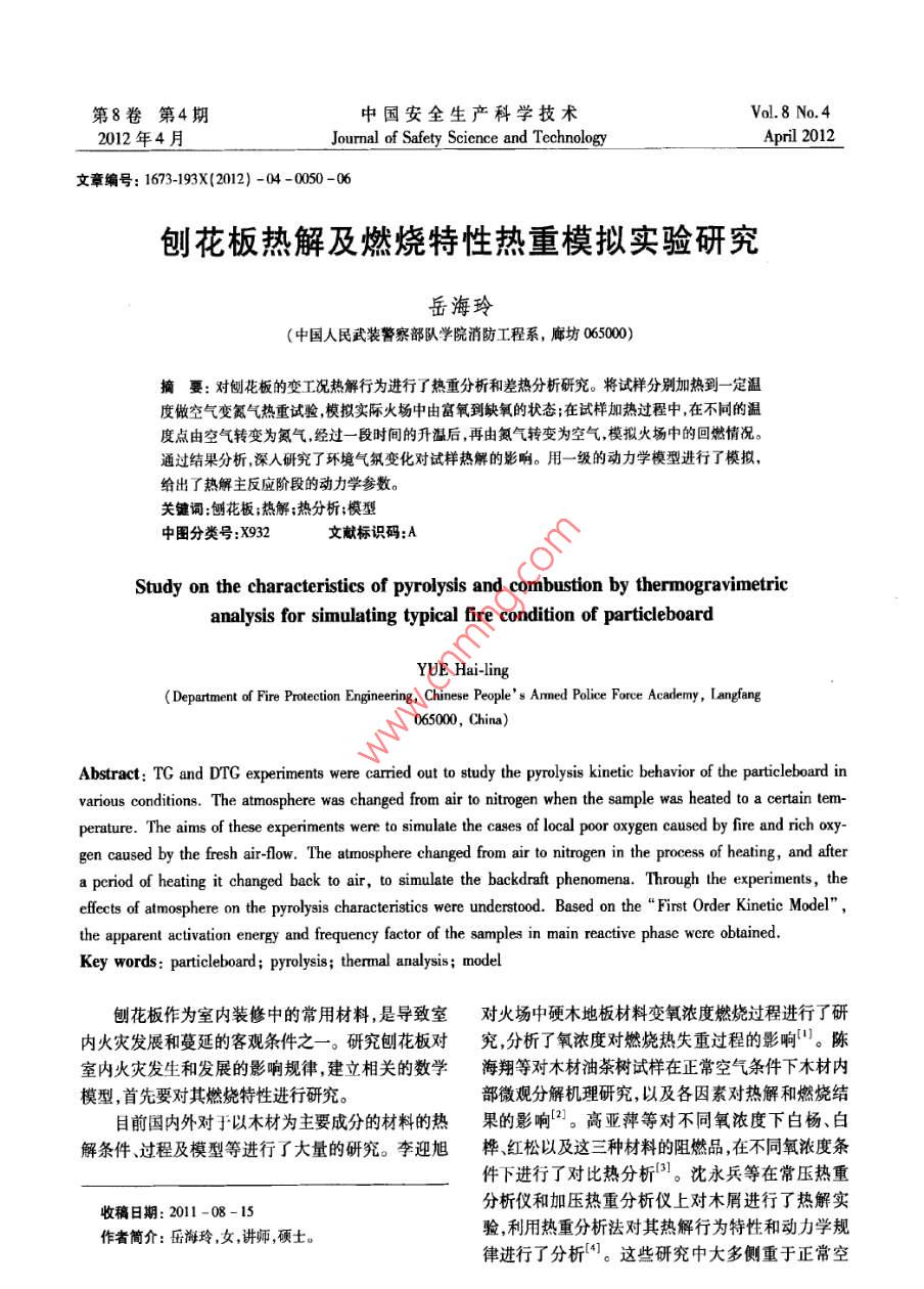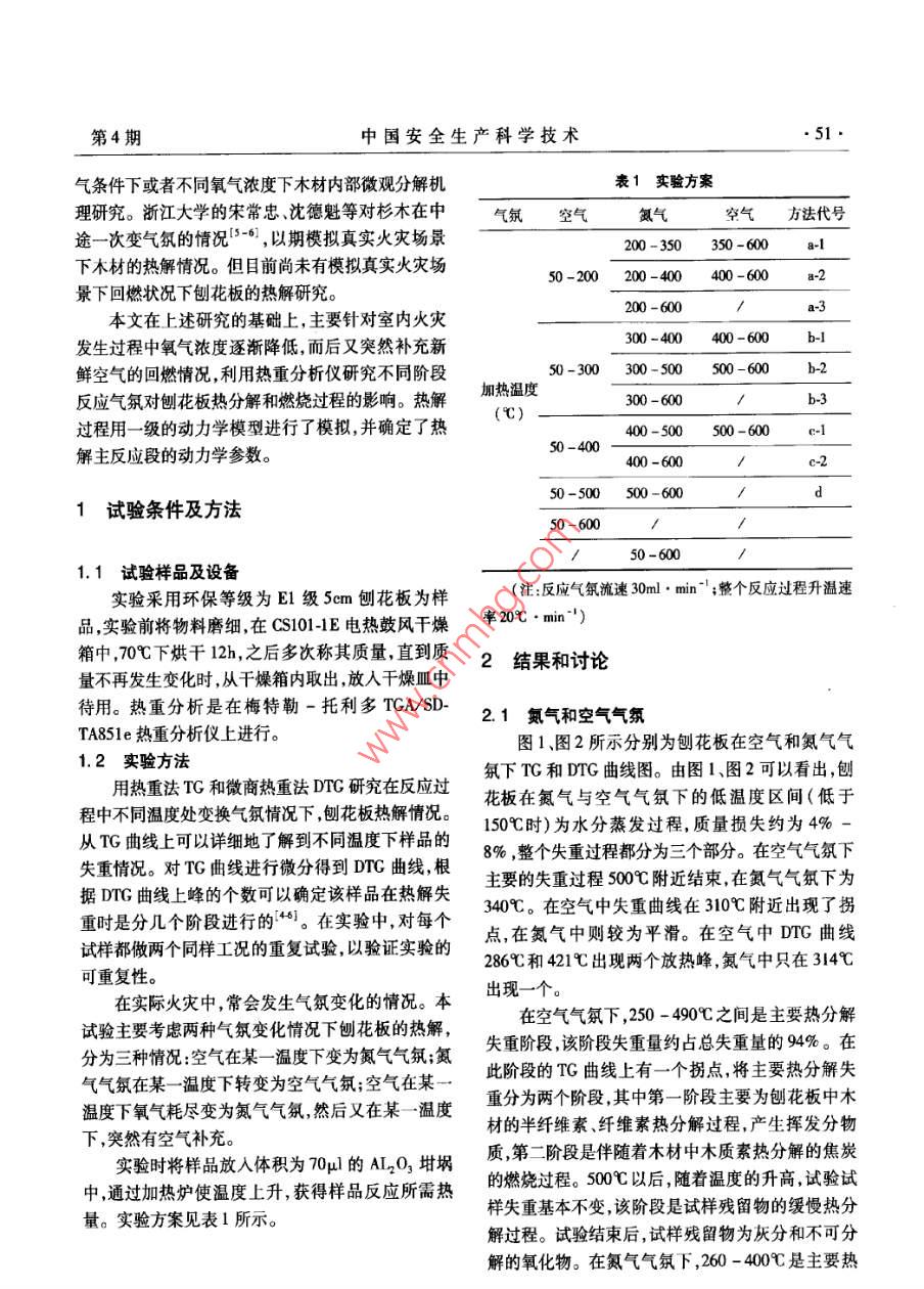 第8卷第4期中國安全生產(chǎn)科學(xué)技術(shù)Vol.8 No.42012年4月Jourmal of Safety Science and TechnologyApril 2012文章編號: 1673-193X(2012) -04 -0050-06刨花板熱解及燃燒特性熱重模擬實驗研究岳海玲(中國人民武裝警察部隊學(xué)院消防工程系,廊坊065000)摘要:對刨花板的變工況熱解行為進(jìn)行了熱重分析和差熱分析研究。將試樣分別加熱到一定溫度做空氣變氮?dú)鉄嶂卦囼?模擬實際火場中由富氧到缺氧的狀態(tài);在試樣加熱過程中,在不同的溫度點(diǎn)由空氣轉(zhuǎn)變?yōu)榈獨(dú)?經(jīng)過一段時間的升溫后,再由氮?dú)廪D(zhuǎn)變?yōu)榭諝?模擬火場中的回燃情況。通過結(jié)果分析,深入研究了環(huán)境氣氛變化對試樣熱解的影響。用-級的動力學(xué)模型進(jìn)行了模擬,給出了熱解主反應(yīng)階段的動力學(xué)參數(shù)。關(guān)鍵詞:刨花板;熱解;熱分析;模型中團(tuán)分類號:X932文獻(xiàn)標(biāo)識碼:AStudy on the characteristics of pyrolysis and combustion by thermogravimetrieanalysis for simulating typical fire condition of particleboardYUE Hai-ling(Department of Fire Proection Engineering, Chinese People' s Amned Police Force Academy, Langfang065000, China)Abstract: TG and DTG experiments were carried out to study the pyrolysis kinetie behavior of the particleboard invarious conditions. The atmosphere was changed from air to nitrogen when the sample was heated to a cetain tem-perature. The aims of these experiments were to simulate the cases of local poor oxygen caused by fire and rich oxy-gen caused by the fresh ar-flow. The atmosphere changed from air to nitrogen in the process of heating, and aftera period of heating it changed back to air, to simulate the backdraft phenomena. Through the experiments, theeffects of atmosphere on the pyrolysis characteristics were undertood. Based on the “First Order Kinetic Model" ,the apparent activation energy and frequency factor of the samples in main reactive phase were obtained.Key words: particleboard; pyrolysis; thermal analysis; nodel刨花板作為室內(nèi)裝修中的常用材料,是導(dǎo)致室對火場中硬木地板材料變氧濃度燃燒過程進(jìn)行了研內(nèi)火災(zāi)發(fā)展和蔓延的客觀條件之一。研究刨花板對究,分析了氡濃度對燃燒熱失重過程的影響"。陳室內(nèi)火災(zāi)發(fā)生和發(fā)展的影響規(guī)律,建立相關(guān)的數(shù)學(xué)海翔等對木材油茶樹試樣在正常空氣條件下木材內(nèi)模型,首先要對其燃燒特性進(jìn)行研究。部微觀分解機(jī)理研究,以及各因素對熱解和燃燒結(jié)目前國內(nèi)外對于以木材為主要成分的材料的熱果的影響”。高亞萍等對不同氧濃度下白楊、白解條件、過程及模型等進(jìn)行了大量的研究。李迎旭樺、紅松以及這三種材料的阻燃品,在不同氧濃度條件下進(jìn)行了對比熱分析P)。沈永兵等在常壓熱重分析儀和加壓熱重分析儀上對木屑進(jìn)行了熱解實收稿日期: 2011-08-15驗,利用熱重分析法對其熱解行為特性和動力學(xué)規(guī)作者簡介:岳海玲,女,講師,硬士。律進(jìn)行了分析[4]。這些研究中大多側(cè)重于正??盏?期中國安全生產(chǎn)科學(xué)技術(shù)氣條件下或者不同氧氣濃度下木材內(nèi)部微觀分解機(jī)表1實驗方案理研究。浙江大學(xué)的宋常忠、沈德魁等對杉木在中氣氛空氣氨氣空氣方法代號途一次變氣氛的情況'S-6) ,以期模擬真實火災(zāi)場景下木材的熱解情況。但目前尚未有模擬真實火災(zāi)場200 - 350350- 600a-景下回燃狀況下刨花板的熱解研究。50 -200200 -400400 -600.a-2本文在上述研究的基礎(chǔ)上,主要針對室內(nèi)火災(zāi)200 -600a-3發(fā)生過程中氧氣濃度逐漸降低,而后又突然補(bǔ)充新300 -400400-600b-1鮮空氣的回燃情況,利用熱重分析儀研究不同階段50-300300-500500 -600b-2反應(yīng)氣氛對刨花板熱分解和燃燒過程的影響。熱解加熱溫度300-600過程用-級的動力學(xué)模型進(jìn)行了模擬,并確定了熱(C)400-500500-600解主反應(yīng)段的動力學(xué)參數(shù)。50-400c1試驗條件及方法50-500 500-600d50-600/1.1 試驗樣品及設(shè)備50 -600實驗采用環(huán)保等級為E1級Sem刨花板為樣(注:反應(yīng)氣氛流速30ml . min"';整個反應(yīng)過程升溫速品,實驗前將物料磨細(xì),在CSI01-1E電熱鼓風(fēng)干燥率20●min~")箱中,70C下烘干l2h,之后多次稱其質(zhì)量,直到質(zhì)2結(jié)果和討論量不再發(fā)生變化時,從干燥箱內(nèi)取出,放人干燥皿中待用。熱重分析是在梅特勒-托利多TGAVSD-2.1氮?dú)夂涂諝鈿夥誘A851e熱重分析儀上進(jìn)行。1.2實驗方法圖1、圖2所示分別為刨花板在空氣和氮?dú)鈿庥脽嶂胤═G和微商熱重法DTC研究在反應(yīng)過氛下TG和DITG曲線圖。由圖1、圖2可以看出,刨程中不同溫度處變換氣氛情況下,刨花板熱解情況?;ò逶诘?dú)馀c空氣氣氛下的低溫度區(qū)間(低于從TG曲線上可以詳細(xì)地了解到不同溫度下樣品的150C時)為水分蒸發(fā)過程,質(zhì)量損失約為4% -失重情況。對TG曲線進(jìn)行微分得到DTC曲線,根8% ,整個失重過程都分為三個部分。在空氣氣氛下?lián)﨑TG曲線上峰的個數(shù)可以確定該樣品在熱解失主要的失重過程500C附近結(jié)束,在氮?dú)鈿夥障聻橹貢r是分幾個階段進(jìn)行的“41。在實驗中,對每個340%。在空氣中失重曲線在310C附近出現(xiàn)了拐試樣都做兩個同樣工況的重復(fù)試驗,以驗證實驗的點(diǎn),在氮?dú)庵袆t較為平滑。在空氣中DTG曲線可重復(fù)性。286心和421C出現(xià