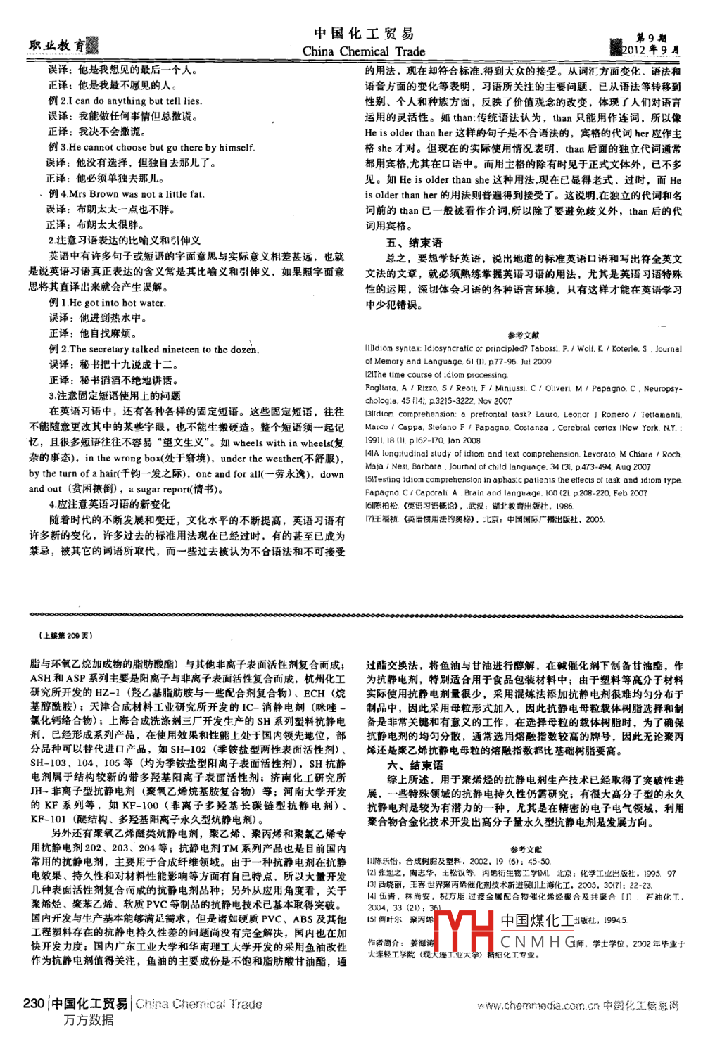 中國化工貿(mào)易第9期職業(yè)教育源China Chemical Trade2012年9月誤譯:他是我想見的最后一個人。的用法,現(xiàn)在卻符合標(biāo)準(zhǔn),得到大眾的接受。從詞匯方面變化、語法和正譯:他是我最不愿見的人。語音方面的變化等表明,習(xí)語所關(guān)注的主要問題,已從語法等轉(zhuǎn)移到例2.I can do anything but tell lies.性別、個人和種族方面,反映了價(jià)值觀念的改變,體現(xiàn)了人們對語言誤譯:我能做任何事情但總?cè)鲋e。運(yùn)用的靈活性。如than:傳統(tǒng)語法認(rèn)為,than 只能用作連詞,所以像正譯:我決不會撒謊。He is older than her這樣的向子是不合語法的,賓格的代詞her應(yīng)作主例3.He cannot choose but go there by himself.格she才對。但現(xiàn)在的實(shí)際使用情況表明,than 后面的獨(dú)立代詞通常誤譯:他沒有選擇,但獨(dú)自去那兒了。都用賓格,尤其在口語中。而用主格的除有時見于正式文體外,已不多正譯:他必須單獨(dú)去那兒。見。如He is older than she這種用法,現(xiàn)在已顯得老式、過時,而He例4.Mrs Brown was not a lttle fat.is older than her的用法則普遍得到接受了。這說明,在獨(dú)立的代詞和名誤譯:布朗太太一點(diǎn)也不胖。詞前的than已- -般被看作介詞,所以除了要避免歧義外,than 后的代正譯:布朗太太很胖。詞用賓格。2.注意習(xí)語表達(dá)的比喻義和引伸義五、結(jié)束語英語中有許多句子或短語的字面意思與實(shí)際意義相差甚遠(yuǎn),也就總之,要想學(xué)好英語,說出地道的標(biāo)準(zhǔn)英語口語和寫出符全英文是說英語習(xí)語真正表達(dá)的含義常是其比喻義和引伸義,如果照字面意文法的文章,就必須熟練掌握英語習(xí)語的用法,尤其是英語習(xí)語特殊思將其直譯出來就會產(chǎn)生誤解。性的運(yùn)用,深切體會習(xí)語的各種語言環(huán)境.只有這樣才能在英語學(xué)習(xí)例1.He got into hot water.中少犯錯誤。誤譯:他進(jìn)到熱水中。正譯:他自找麻煩。參考文獻(xiàn)例2.The secretary talked nineteen to the dozen.IlIdlom syntax: Idosyncratic or principled? Taboss. P. 1 Woll. K. 1 Koterle. s. . Journal誤譯:秘書把十九說成十二。of Memory and Language. 61 {), p77-96. Jul 2009l2IThe time course of ldiom processing正譯:秘書滔滔不絕地講話。Fogliala. A1 RIz20. S1 Reat.F 1 Miniussl. C1 Oliver. M 1 Papagno. C . Neuropsy-3.注意固定短語使用.上的問題chologie. 45 141.3213-222. Nov 2007在英語習(xí)語中,還有各種各樣的固定短語。這些固定短語,往往l3ldiom comprehension: 0 prefrontal task? Lauro, Leonor J Romero 1 Tettamant.不能隨意更改其中的某些字眼,也不能生搬硬造。整個短語須一起記Marco1 Cappa. Slefano F 1 Papagno. Costanza。Cerebral cortex INew York, NY.:憶,且很多短語往往不容易“望文生義"。如wheels with in wheels(復(fù)191. 18 (I. p.162-170. lan 2008雜的事態(tài)),in the wrong box(處于窘境), under the weather(不舒服),[4IA longiudinal study of idiom and text comprehension. Levorato, M Chiara 1 Roch.Msa 1 Nest, Barbara . Journal of child language. 34 131. p.473-494. Aug 2007by the turn of ahair(千鉤-發(fā)之際), one and for all(-勞永逸), downI5ITesting idiom comprehension in aphasic palienis the lfects of task and ldom lype.and out (貧困撩倒),a sugar repor(情書)。Papagno. C1 Caporali A。Brain and language. 100 (2. p208 220. Feb 20074.應(yīng)注意英語習(xí)語的新變化16|陳柏松英語習(xí)語概論》,武漢:胡北枚育出版杜,1986.隨著時代的不斷發(fā)展和變遷,文化水平的不斷提高,英語習(xí)語有171王福楨英語慣用法的奧必),北京:中國國際廣播出版社,2005.許多新的變化,許多過去的標(biāo)準(zhǔn)用法現(xiàn)在已經(jīng)過時,有的甚至已成為禁忌,被其它的詞語所取代,而-些過去被認(rèn)為不合語法和不可接受(上接第209頁)脂與環(huán)氧乙烷加成物的脂肪酸酯)與其他非離子表面活性劑復(fù)合而成;過酯交換法, 將魚油與甘油進(jìn)行醇解,在堿催化劑下制備甘油酯,作.ASH和ASP系列主要是陽離子與非離子表面活性復(fù)合而成,杭州化工為抗靜電劑, 特別適合用于食品包裝材料中;由于塑料等高分子材料研究所開發(fā)的HZ-1 (羥乙基脂肪胺與-些配合劑復(fù)合物)、 ECH (烷實(shí)際使用抗靜 電劑量很少,采用混煉法添加抗靜電劑很難均勻分布于基醇酰胺);天津合成材料工業(yè)研究所開發(fā)的IC-消靜電劑(瞇唑-制品中,因此采用母粒形式加入,因此抗靜電母粒載體樹脂選擇和制氧化鈣絡(luò)合物);上海合成洗滌劑三廠開發(fā)生產(chǎn)的SH系列塑料抗靜電備是非常關(guān)鍵和有意 義的工作,在選擇母粒的載體樹脂時,為了確保劑,已經(jīng)形成系列產(chǎn)品,在使用效果和性能上處于國內(nèi)領(lǐng)先地位,部抗靜 電劑的均勻分散,通常選用熔融指數(shù)較高的牌號,因此無論聚丙分品種可以替代進(jìn)口產(chǎn)品,如SH-102 (季銨鹽型兩性表面活性劑)、烯還是聚乙烯抗靜電母粒的熔融指數(shù)都比基礎(chǔ)樹脂要高。SH-103、104、105 等(均為季銨鹽型陽離子表面活性劑),SH 抗靜六、結(jié)束語電劑屬于結(jié)構(gòu)較新的帶多羥基陽離子表面活性劑;濟(jì)南化工研究所綜上所述,用于聚烯烴的抗靜電劑生產(chǎn)技術(shù)已經(jīng)取得了突破性進(jìn)H一非離子型抗靜電劑(聚氧乙嫦烷基胺復(fù)合物)等;河南大學(xué)開發(fā)展, 一些特殊領(lǐng)域的抗靜電持久性仍需研究:有很大高分子型的永久的KF系列等,如KF-100 (非離