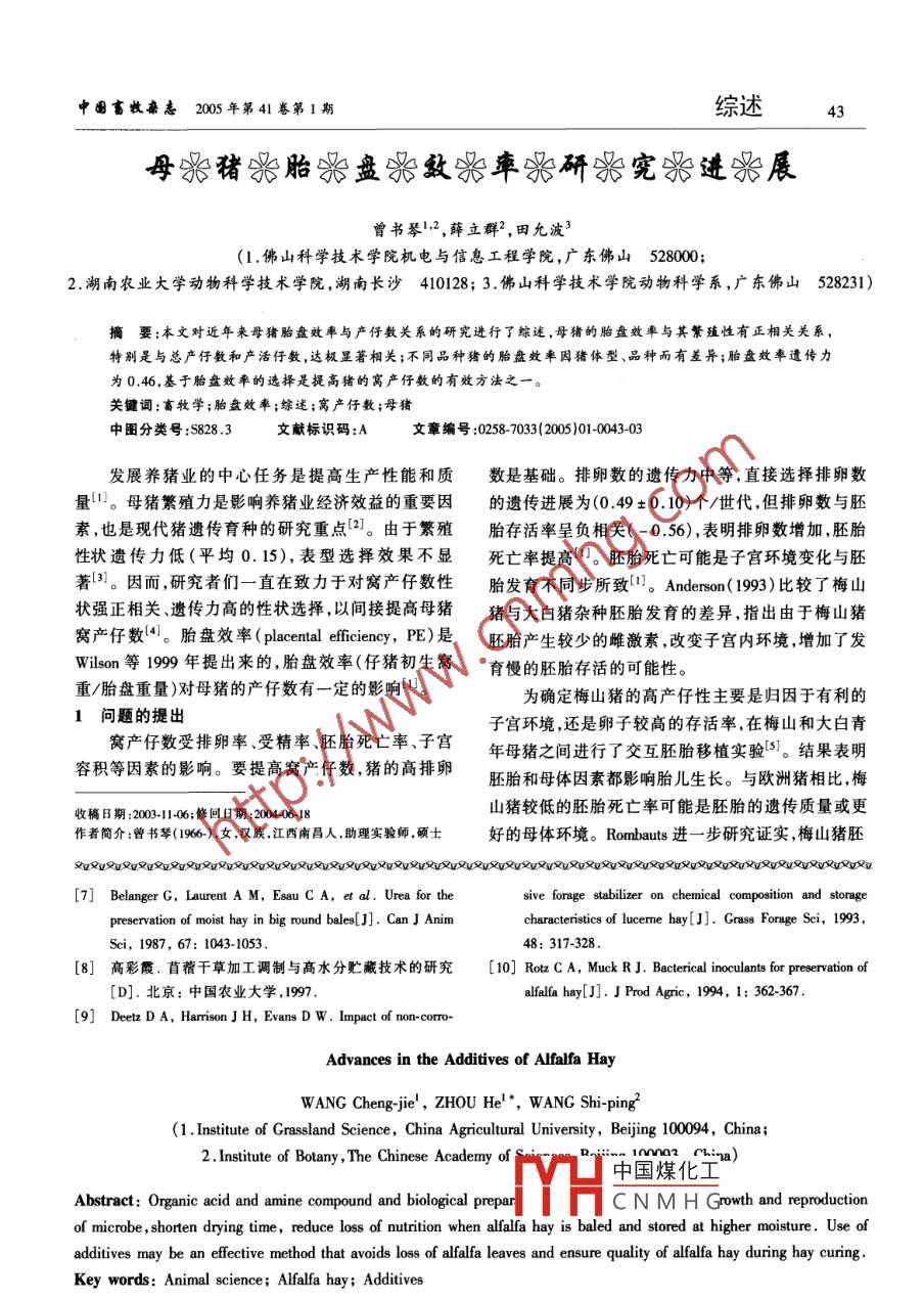 中國畜牧雜志2005年第41卷第1期綜述.4苜蓿干草添加劑研究進展王成杰',周禾",汪詩平2(1.中國農(nóng)業(yè)大學(xué)動物科技學(xué)院草地研究所,北京 100094; 2.中國科學(xué)院植物研究所,北京 100093)氣不不不當(dāng)不不不不當(dāng)不不當(dāng)不當(dāng)不不不不不不不你你不不不不當(dāng)不你不你不不不不你不不當(dāng)不不不不當(dāng)不不不不不不當(dāng)當(dāng)不來”摘要:苜蓿干草在高水分打捆貯藏時添加有機酸、胺類化合物和生物制劑等添加劑可以有效地抑制微生物的生長繁殖,縮短干燥時間,避免低水分牧草在打捆時的葉片脫落,是減少調(diào)制過程中營養(yǎng)物質(zhì)的損失,保證苜蓿干草質(zhì)量的有效措施。.關(guān)鍵詞:商牧學(xué);苜蓿干草;添加劑中圄分類號:S51+ .709.3文獻標(biāo)識碼:A文章編號:0258-7033(2005)01-0041-03苜蓿是世界上栽培最為廣泛最為重要的豆科牧(1984)")研究發(fā)現(xiàn)不添加任何防霉防腐劑進行高水草之一,也是我國分布廣、栽培歷史悠久、具有較高分打捆貯藏,苜蓿粗蛋白質(zhì)的消化率從71%降到經(jīng)濟利用價值的飼用豆科牧草。苜蓿擁有特殊的植53%,干物質(zhì)的消化率下降5%,干草的消化能也損物學(xué)和生物學(xué)特性,體現(xiàn)在生物產(chǎn)量、營養(yǎng)價值、可失。苜蓿干草添加劑的應(yīng)用主要是為了抑制草捆內(nèi)食性等諸多方面的優(yōu)異生產(chǎn)性能和經(jīng)濟價值。隨著有害微生物的活動,減少營養(yǎng)物質(zhì)的損失,提高苜蓿我國農(nóng)業(yè)產(chǎn)業(yè)結(jié)構(gòu)的調(diào)整,苜蓿產(chǎn)業(yè)也將得到更大干草蛋白質(zhì)和能量的消化率,有效地保證苜蓿干草的發(fā)展,對推動我國的畜牧業(yè)發(fā)展具有重要意義。的品質(zhì)。作為干草防霉防腐劑主要包括有機酸類、苜蓿干草在調(diào)制過程中,常因不良天氣而使收銨類化合物、尿素和生物防腐劑等。獲的鮮草不能適時干燥而使其品質(zhì)下降。在延長干1.1有機酸類苜蓿干草在高水分打捆貯藏添加燥時間或貯藏的過程中,由于霉菌的分解作用使大有機酸類物質(zhì)的目的是為了抑制干草貯藏期內(nèi)微生量的營養(yǎng)物質(zhì)遭到損失,從而降低干草的營養(yǎng)價值。物的活動。丙酸及其鹽類在合適的濃度下能夠有效因此,獲得優(yōu)質(zhì)干草除適時刈割外,更為重要的是在地抑制干草貯藏期間真菌、放線菌的生長繁殖,但乳加工調(diào)制和貯藏過程中最大限度地減少營養(yǎng)物質(zhì)的酸菌對其不敏感,仍有生活力,并能生產(chǎn)大量有機酸損失,滿足家畜的營養(yǎng)需求。而使牧草得以保存。Woolford(1984)2) 在實驗室條20世紀(jì)50年代末,國內(nèi)外學(xué)者開始對苜蓿干件下研究評析丙酸、乙酸、雙乙酸鈉、丙酸銨、雙丙酸草在高水分(20% ~ 25% )打捆貯藏進行研究。高水銨和磷酸三丁脂作為干草添加劑時發(fā)現(xiàn),在pH=5分打捆貯藏技術(shù)可以縮短干燥時間,減免降雨對干時,不加任何防霉劑,僅酸性環(huán)境就可以抑制菌類的草品質(zhì)的危害,對解決苜蓿干草調(diào)制期與雨季之間活動,而干草捆內(nèi)的pH多在6左右,因而在打捆貯存在的矛盾具有現(xiàn)實意義。本文就苜蓿干草在高水藏時就需要添加防霉劑,降低捆草內(nèi)pH值,形成酸分打捆防霉防腐劑研究應(yīng)用的現(xiàn)狀進行介紹,并在性環(huán)境。研究發(fā)現(xiàn)以雙丙酸銨的防霉效果較好,其此基礎(chǔ)上對其國內(nèi)的發(fā)展前景加以探討。中丙酸鹽類對細(xì)菌的生長發(fā)育有很好的抑制作用。1研究現(xiàn)狀對于有機酸類的有效性與長效性主要由牧草的牧草營養(yǎng)物質(zhì)的損失與草捆內(nèi)溫度和微生物的種類、干草含水量和添加劑有效成分的量來決定?;顒佑兄苯雨P(guān)系。苜蓿千草在高水分時打捆貯藏,噴灑在干草表面上的丙酸以兩種形式存在,解離型如沒有使用防霉防腐劑,就會發(fā)生熱害。Brandt 等丙酸分子(CH-CH2-C00- )和非解離型丙酸分子(CH+中國煤化工作用的是非解離型收稿日期:003-11-06;修回日期:2003-12-22丙酸|Y片CN M H G認(rèn)為丙酸及其鹽類基金項目:北京市科委“優(yōu)質(zhì)高產(chǎn)紫花莒幫生產(chǎn)關(guān)鍵技術(shù)研究"對于苜蓿干草在含水量20%~25%時進行打捆貯(H012010290112)藏的使用量應(yīng)在1.5%。由于有機酸類物質(zhì)具有一作者簡介:王成杰(1968-),男,內(nèi)蒙古興和縣人,碩士*通訊作者定腐蝕性,在生產(chǎn)運用當(dāng)中應(yīng)注意對工作人員和機42綜述中國畜牧雜志2005年第41卷第 1期械設(shè)備進行安全保護。生物進行競爭,可用作專用的苜蓿干草防腐劑。1.2 銨類化合物 銨類化合物已經(jīng)被成功地用于Deetz等(1993)9研究了苜蓿干草在含水量高水分干草的打捆貯藏,可有效地殺死霉菌孢子,抑20% ~ 25%時添加乳酸菌發(fā)酵產(chǎn)品與對照組比較,制腐敗菌、丁酸菌等大部分有害細(xì)菌的繁殖,降低草發(fā)現(xiàn)并不能夠有效控制草捆溫度。Rotz等捆內(nèi)溫度,減少熱害。同時具有輕微的堿化作用,破(1994)10]研究發(fā)現(xiàn)生物接種劑在青貯方面起到很壞纖維素-半纖維素-木質(zhì)素這些骨架物質(zhì),并使纖好的效果,而苜蓿干草在20% ~ 25%含水量范圍內(nèi)維素通過水解作用逐級切短,形成低聚糖或單糖,提不能夠使乳酸菌良好存活,故認(rèn)為這些產(chǎn)品在干