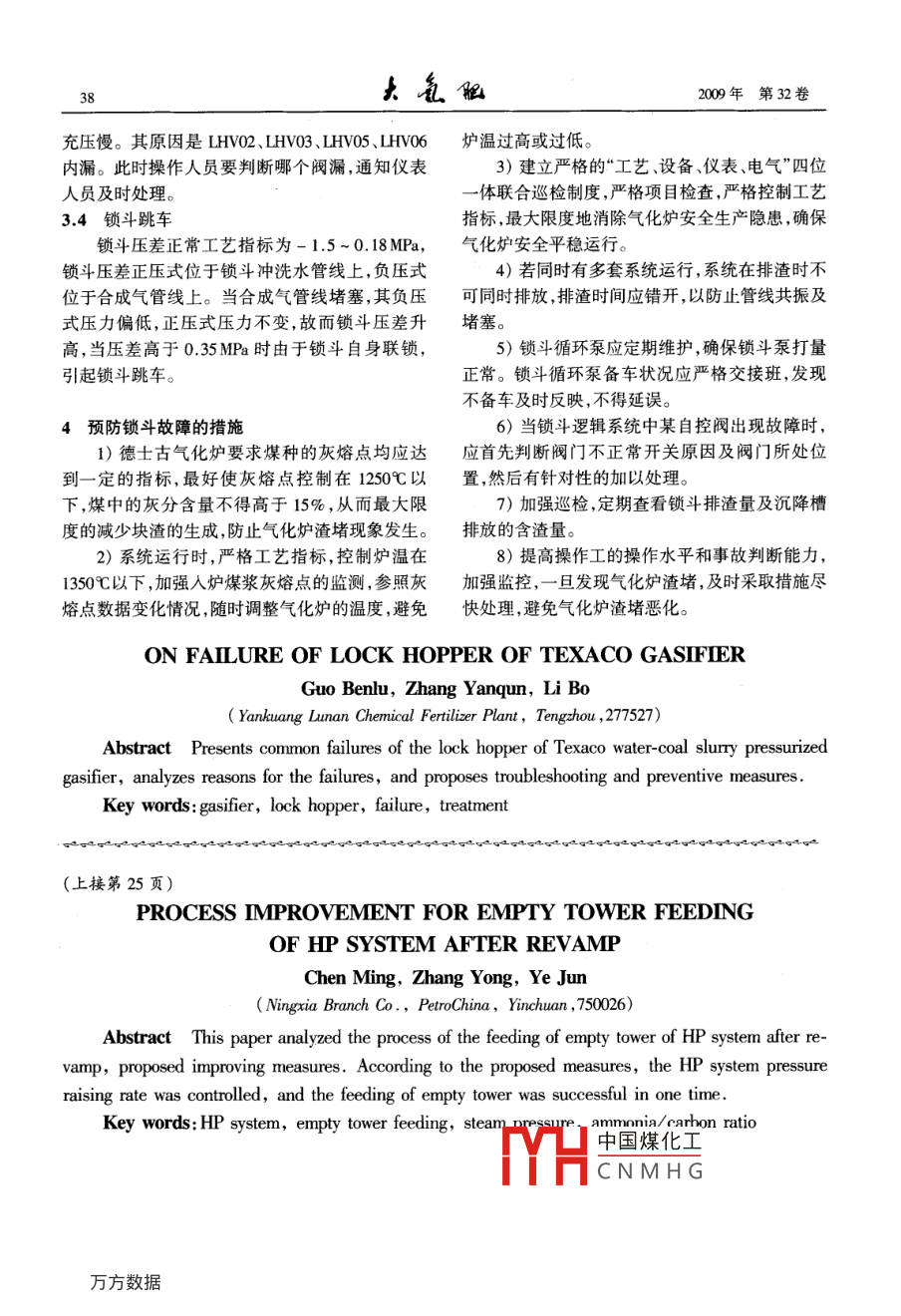 2009年2月大色配Feb. 2009第32卷第1期Large Scale Nitrogenous Fertilizer IndustryVol.32 No.1德士古氣化爐鎖斗故障淺析郭本陸張艷群李波(兗礦魯南化肥廠,山東滕州,277527)摘要介紹德士 古水煤漿加壓氣化爐鎖斗的常見故障,分析故障產(chǎn)生的原因,提出故障處理和預(yù)防措施。關(guān)鍵詞氣化爐鎖斗故障處理德士古水煤漿加壓氣化爐是-一個(gè)兩相并流氣使該泵建立 自身循環(huán)。鎖斗人口閥(LHV02)關(guān)化的爐型,煤漿經(jīng)高壓煤漿泵送人工藝燒嘴,同時(shí)閉,鎖斗與激冷室隔離。打開鎖斗泄壓閥來自空分的氧氣也送人工藝燒嘴,在三流式的工(LHV05)使鎖斗泄壓,鎖斗泄壓后壓力不得大于藝燒嘴:頭部混合后噴人氣化爐,在1380C左右的0.28 MPa,然后打開泄壓管線沖洗閥(IHV06),對(duì)高溫下發(fā)生部分氧化反應(yīng)生成水煤氣。煤灰中的泄壓管線進(jìn)行沖洗,這時(shí)LHVO5與LHV06關(guān)閉,無機(jī)物在高溫下被熔化產(chǎn)生熔渣,與反應(yīng)生成的隨后打開鎖斗沖洗閥(LHV04)和鎖斗出口閥粗煤氣并流經(jīng)渣口及下降管進(jìn)人到激冷室,粗煤(LHV03),渣排入渣池。當(dāng)沖洗罐液位泄至1 .0m氣被冷卻并為水汽所飽和,出激冷室后飽和氣體時(shí)LHV03關(guān)閉,鎖斗內(nèi)充滿水后關(guān)閉LHV04,再送人洗滌塔除去細(xì)粒,送至變換系統(tǒng)。而沉降在打開充壓閥(LHV07)讓高壓灰水給鎖斗充壓,當(dāng).激冷室底部的渣及少量沒有燃燒的炭,通過破渣壓力升到基本上與激冷室的壓力相同時(shí),打開機(jī)進(jìn)人鎖斗,通過鎖斗的排渣管線排人渣池。激LHV02,鎖斗進(jìn)入下一循環(huán),IHV07關(guān)閉, LHV08、冷室出來的黑水經(jīng)高中真空閃蒸罐回收熱量后,LHV09打開, LHV10關(guān)閉,建立鎖斗水循環(huán)。工藝黑水被送到沉降槽澄清后循環(huán)使用。流程如圖1所示。破渣機(jī)位于激冷室底部與鎖斗之間,燃燒室內(nèi)產(chǎn)生大塊熔渣甚至耐火磚脫落卡住或堵塞管比道,啟動(dòng)破渣機(jī)能夠使熔渣順利進(jìn)人鎖斗,避免鎖斗邏輯系統(tǒng)無法正常運(yùn)行或停車的惡性事故發(fā)破渣機(jī)白先調(diào)節(jié)閥生。鎖斗安全閥中1鋪斗冊鎖斗充壓閥鎖斗入口閥中有進(jìn)用。 管線沖洗閥1鎖斗系統(tǒng)流程鈉斗循環(huán)泵嘴享去渣池-網(wǎng)m廠鎖鎖斗泄壓閥鎖斗循環(huán)泵入口閥和斗沉降在激冷室底部的渣及少量沒有燃燒的酸洗回流閥,鎖斗泵出口頁斗沖洗閥流量調(diào)節(jié)閥炭,通過鎖斗安全閥、鎖斗人口閥進(jìn)入鎖斗。鎖斗力鎖斗出口閥集渣時(shí)需要借助鎖斗系統(tǒng)循環(huán)水流的夾帶和沖鎖斗泵擊,該水流是從鎖斗頂部管線進(jìn)人鎖斗循環(huán)泵,然圖1鎖斗系統(tǒng)工藝流程示意后經(jīng)泵打回激冷室錐底以強(qiáng)制水在激冷室錐底和鎖斗之間循環(huán)流動(dòng)。渣由激冷室進(jìn)人鎖斗后沉淀中國煤化工期200901070在鎖斗底部,從而使渣水分離,渣通過這種方式在YHCNMHG2006年畢業(yè)于山東科技給定的時(shí)間內(nèi)收集在鎖斗中,28 min后開始排渣。大學(xué)化工程與工藝專業(yè) ,現(xiàn)在兗礦魯南化肥廠氣化分廠從事技排渣之前,鎖斗循環(huán)泵管線上的循環(huán)閥(LHV10)術(shù)管理工作。聯(lián)系電話: 0632-2362659; E-mail: 184883622 @打開,人口閥(LHV08)關(guān)閉,出口閥(LHV09)關(guān)閉,qq. com。第1期郭本陸等.德士古氣化爐鎖斗故障淺析372鎖斗渣堵運(yùn)行。2.1 鎖斗渣堵現(xiàn)象2) LHV05輕微堵塞。確認(rèn)LHV07不漏及鎖1)鎖斗循環(huán)泵的出口流量由正常的22.0m2/斗溫度正常的條件下,鎖斗排渣時(shí)泄壓速度慢,而h降到10.0m2/h左右,嚴(yán)重時(shí)降至零,鎖渣系統(tǒng)且鎖斗泄壓不徹底,說明LHV05輕微堵塞。此時(shí)無法正常運(yùn)行。關(guān)閉LHV05,打開LHV07對(duì)鎖斗重新充壓,重新2)排渣量明顯減少,氣化爐排出物甚至出現(xiàn)充壓后再開LHVO5泄壓,就可利用較大的壓力差清水。將輕微堵塞的管線沖開。3)大量的細(xì)灰渣帶人閃蒸系統(tǒng),沉降槽底部3) LHV03 堵或LHV03后排渣管線堵。鎖斗排出的幾乎全部是細(xì)灰渣。排渣排不下來,鎖斗沖洗罐液位不降,現(xiàn)場敲擊排4)鎖斗壓力隨鎖斗泵出口流量下降而下降,渣管線后,鎖斗沖水洗罐液位下降一點(diǎn)后不再下其流量下降越多,壓力下降越大。降,說明LHV03堵或LHV03后排渣管線堵。關(guān)閉5)渣堵嚴(yán)重時(shí),氣化爐液位波動(dòng)較大,氣化LHV03/04,控制室手動(dòng)集渣,現(xiàn)場解開LHVO3后爐至高壓閃蒸罐流量調(diào)節(jié)閥調(diào)節(jié)失效。盲板對(duì)閥前后管線進(jìn)行疏通至正常。2.2鎖斗渣 堵的原因4)鎖斗循環(huán)泵管線堵。鎖斗循環(huán)泵出口流1)原料煤種變化。鎖渣系統(tǒng)運(yùn)行質(zhì)量與煤 量降低, 但鎖斗壓力不下降,說明鎖斗循環(huán)管線質(zhì)有很大的關(guān)系?;胰埸c(diǎn)過高或過低均會(huì)使氣化堵,此時(shí)停下鎖斗循環(huán)泵,若鎖斗循環(huán)泵進(jìn)口管線爐溫度發(fā)生變化,嚴(yán)重制約氣化裝置特別是鎖渣堵,則開泵進(jìn)口倒淋,利用鎖斗壓力將積渣從管線系統(tǒng)的正常運(yùn)行,表現(xiàn)為產(chǎn)氣量低、爐磚蝕損嚴(yán)中排出。若鎖斗管線仍然不正常,則可能泵出口重、鎖斗無法正常運(yùn)行等。管線堵,可采用酸洗回流閥排放法,即:停下鎖斗2)氣化爐操作工況的影響。氣化爐操作工循環(huán)