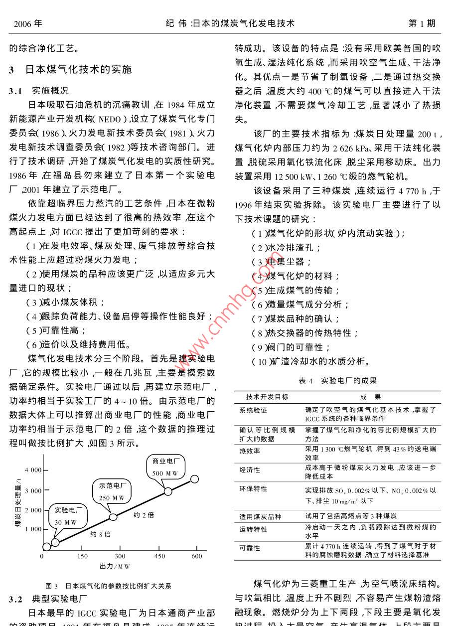 2006年2月電力環(huán)境保護(hù)第22卷第1期日本的煤炭氣化發(fā)電技術(shù)Current state of ICCC technique in Japan紀(jì)偉(山東省東岳能源有限責(zé)任公司白莊電廠山東肥城271613)摘要簡(jiǎn)述了日本的煤炭氣化發(fā)電發(fā)展現(xiàn)狀介紹了日本典型的實(shí)驗(yàn)電廠與示范電廠的技術(shù)參數(shù)。關(guān)鍵詞:CCC ;煤炭氣化;發(fā)電;日本Abstract :This paper introduces the development of the integrated coal gasification combined cycle ( IGCC ) in Japan ,gives some typical data of pilot plant and demonstration plant.Key words :1GCC ; power generation Japan中圖分類號(hào):TM611 .文獻(xiàn)標(biāo)識(shí)碼:B文章編號(hào):1009- 403X 2006 01- 0025 - 04日本是世界第二大工業(yè)國(guó),也是世界上最大的表1化石能源的世界蘊(yùn)藏量能源消費(fèi)國(guó)之一。日本是個(gè)國(guó)土狹小、資源貧乏的項(xiàng)目蘊(yùn)藏量國(guó)家能源的80%以上依賴進(jìn)口,目前是次于美、中煤/t1.3x 1012的世界第三位能源進(jìn)口大國(guó)。在能源構(gòu)成中,50%石油/桶.1.2x 1012以上依賴石油,石油中又有70%以上來(lái)自中東,因天然氣/m'1.44x 10' .此,日本的能源結(jié)構(gòu)過(guò)于單一,依賴的地區(qū)過(guò)于狹窄能源市場(chǎng)很容易受到世界形勢(shì)的左右。1970 年但煤也有缺點(diǎn)。首先它在化石燃料中碳含量最前后的石油危機(jī)使日本的經(jīng)濟(jì)遭受重創(chuàng),從此,日本高燃燒時(shí)產(chǎn)生較多的CO2 ;其次它是一種固體燃結(jié)束了持續(xù)20年之久的經(jīng)濟(jì)高速增長(zhǎng),-直在低迷料不如石油、天然氣那樣便于長(zhǎng)途運(yùn)輸;煤燃燒后的陰影下徘徊。確保能源的穩(wěn)定供應(yīng)成了日本政產(chǎn)生大量煤灰給環(huán)境造成很大負(fù)擔(dān);此外煤不能治、經(jīng)濟(jì)的戰(zhàn)略課題。近年來(lái),日本調(diào)整能源結(jié)構(gòu),用于大型燃?xì)廨啓C(jī)發(fā)電。因此,人們想到了古老的一方面把目光從石油的單-結(jié)構(gòu)擴(kuò)大到更加廣闊的煤炭氣化技術(shù),它可以將煤變?yōu)榍鍧崥怏w能源使煤領(lǐng)域,如原子能、可再生的綠色能源(包括太陽(yáng)能、風(fēng)炭發(fā)電在環(huán)境保護(hù)、熱效率等方面達(dá)到天然氣的水能、地?zé)?、生物質(zhì)等);另一方面,重新估價(jià)傳統(tǒng)能源平。煤的氣化綜合發(fā)電技術(shù)稱為ICCC Integrated煤的作用加大對(duì)煤炭氣化發(fā)電的研究力度。Coal Gasification Combined Cycle )是近年來(lái)世界熱門(mén)研究課題,日本亦將它作為21世紀(jì)能源領(lǐng)域的重要1煤炭的特 點(diǎn)以及氣化歷史發(fā)展方向。2000年,日本總發(fā)電量為9400億kWw h ,其中煤炭氣化技術(shù)是200多年前的1792年,由英國(guó)54%為火力發(fā)電,煤、石油、天然氣分別占18%、馬德克發(fā)明的。煤氣誕生后不久,由于在取暖、照10%、26%。明、炊事等方面的廣泛應(yīng)用迅速在英美等國(guó)家得到煤炭是人類最早使用的化石能源,它的H:O:C普及。19 世紀(jì)20年代,英美都建立了專業(yè)公司。之比為0.8:0.15:1。在所有化石能源中,它的蘊(yùn)藏到了20世紀(jì)20年代煤的氣化技術(shù)進(jìn)一步發(fā)展在量最為豐富并且地區(qū)的分布比較均衡,不像石油、1930年前后,美國(guó)就已經(jīng)擁有煤氣公司1萬(wàn)家,每天然氣那樣集中在少數(shù)地區(qū)。煤的蘊(yùn)藏遍及各大年轉(zhuǎn)化煤炭1200萬(wàn)to 20世紀(jì)后期受天然氣的競(jìng)洲,尤其是北美、俄羅斯、歐洲、中國(guó)最為豐富。這幾爭(zhēng)煤氣的應(yīng)用領(lǐng)域日漸萎縮。個(gè)地區(qū)的蘊(yùn)藏量占世界總蘊(yùn)藏量的1/2以上。在所IGCC技術(shù)有很多優(yōu)點(diǎn)。首先是它的CO2排放有化石能源中煤的價(jià)格最低并且市場(chǎng)波動(dòng)最小煤量較低按發(fā)出1kW h電量排放CO2量計(jì)算,傳統(tǒng)與其他化石能源全球蘊(yùn)藏量的比較見(jiàn)表1 ),可見(jiàn)煤的粉煤火力發(fā)電為964.7g ,IGCC為779.2g重油為2006年2月電力環(huán)境保護(hù)第22卷第1期比傳統(tǒng)燃煤方法低20%接近氣體化石燃料水平,結(jié)構(gòu)。這樣就可以充分利用地球上最豐富的煤炭資源,獲煤氣發(fā)熱交換得天然氣的效益。IGCC 可以擴(kuò)大煤的利用范圍,能生那分使用粉煤灰熔點(diǎn)較低的煤。在環(huán)境保護(hù)方面,ICGCC發(fā)電的S0,、NO,排放量低煤灰是熔融礦渣形式,水冷爐體積較小。IGCC 發(fā)電在價(jià)格上也具有優(yōu)勢(shì)。用川容器十2煤炭氣化技術(shù)的特點(diǎn)煤炭氣化發(fā)電的技術(shù)核心是在汽化爐中使煤炭煤+窄氣發(fā)生部分氧化,產(chǎn)生主要成分為CO與H2的煤氣,經(jīng)提純后作為燃?xì)廨啓C(jī)的發(fā)電燃料。煤氣的成分因爐渣煤氣化工藝不同而不同,如表2所示。成分不同導(dǎo)致熱值也有所不同。通常把熱值在3360~6300kJ/圖2氣流床的結(jié)構(gòu)m3的煤氣稱為低熱值煤氣,8 400~ 18 900kJ/m3的稱為中熱值煤氣,18900kJ/m3以上的稱為高熱值煤氣化劑有吹空氣和吹氧氣兩類。吹氧氣方式可氣。一般火力發(fā)電采用中低熱值煤氣。圖1概要地以獲得10500kJ/m3的中熱值煤氣優(yōu)點(diǎn)是煤氣成分中可燃性氣體濃度高,在燃?xì)廨啓C(jī)發(fā)電時(shí)產(chǎn)生的顯示了煤炭氣化發(fā)電系統(tǒng)流程。NO,少缺點(diǎn)是由于需要空氣分離工藝所以從輸電煤