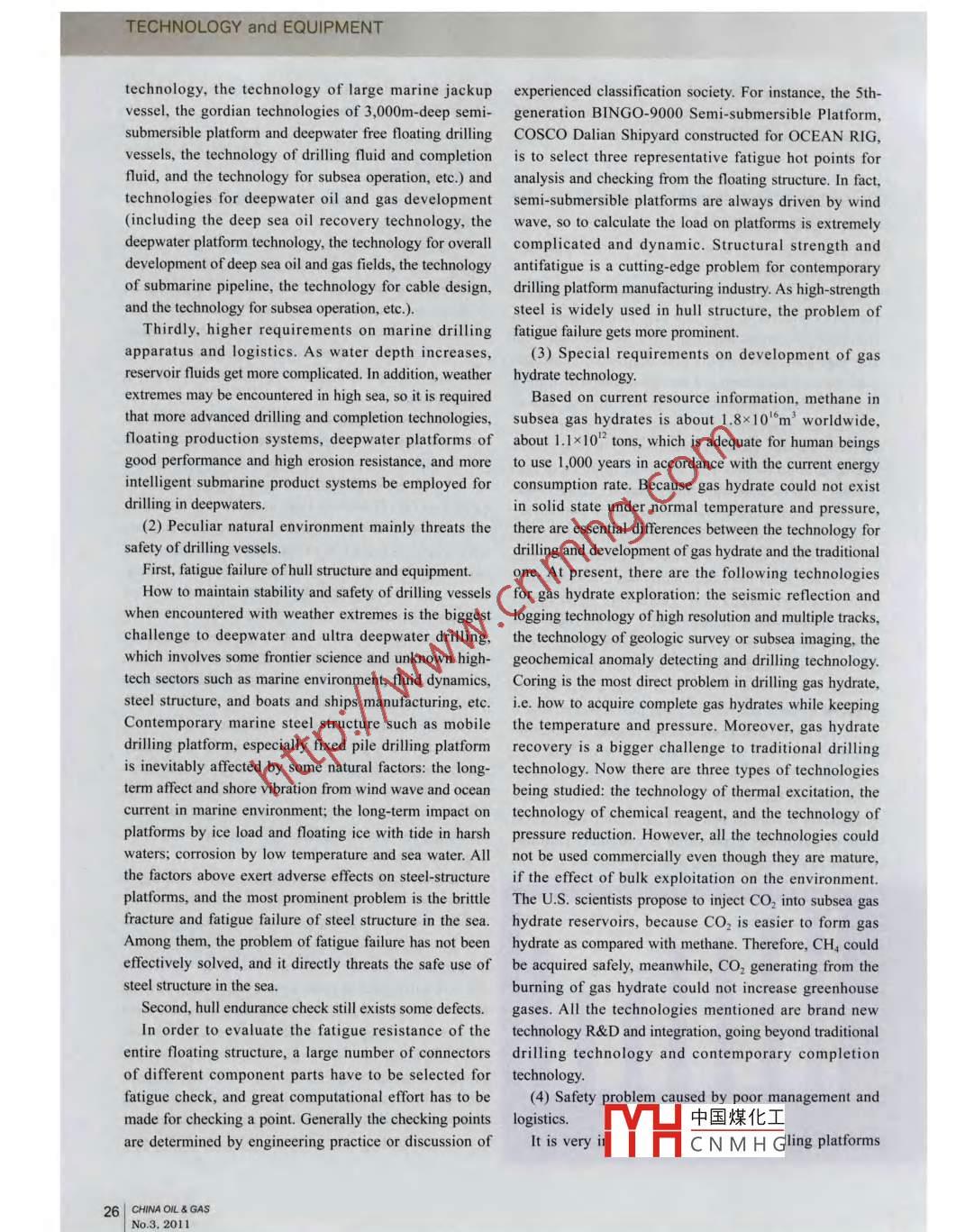 TECHNOLOGY and EQUIPMENTCurrent State and DevelopmentTrends of Deep Sea Oil and GasExplorationang wen(SINOPEC Research Inoleum EngineeringAs people probe deeply into submarine exploration will lie in deep water in the future, but only 3% have beenand development of oil, gas hydrates and other mineral produced so far, so it still has a great potential. Newlyreserves,deepwater oil and gas development has become proven oil and gas reserves were 16.4 billion tons of oila hotspot for world petroleum industry and the frontier of and gas equivalent from 2000 to 2005, 41% were in deeptechnological innovation. In the past few years, petroleum sea, 31% in shallow sea, and 28% on land. On the basiscompanies engaged in deep sea exploration put more effort of Offshore Resources, there were 434 marine oil and gason exploration and development of marine resources. development projects worldwide from 2001 to 2007, 48%However, the companies capable of carrying out deep of which were conducted in deepwater with water thesea operation can be reckoned up on the fingers of one depth more than 500m and 22% were in ultra deepwatershand, because such operation involves technological with the water depth more than 1, 200m.support, logistics support, legal issues, warning and Now more than 100 countries have been engaged inavoidance of natural disasters. Technologically, to have a offshore petroleum exploration, and more than 50 havebetter understanding of the technical difficulties in deep carried out deep sea exploration. The U.S. has the largestsea exploration and increase science and technology amount of offshore drilling in the world, and it has moreinvestment could not only ease power shortages in China, than 19,000 wells in the Gulf of Mexico and about 100but enable proven technologies to be integrated and then wells under production in Gulf Area. Besides, UKdevelop high-efficiency technological systemsMalaysia, India, Russia and some other countries havealso been engaged in a great quantity of marine drillingOverview of deepwater and ultra deepwater BP, Petrobras, Statoil, Exxon Mobil, Shell, Unocal,explorationand some other companies equipped with deepwaterBased on international conventions, water domains less exploration and development technologies usuallythan 400m deep, 400-1, 500m deep and more than 1, 500m cooperate with each other to carry out exploration anddeep are named as conventional water depth, deepwater exploitation of中國煤化工 North Seaand ultra deepwater, respectively. As predicted by the the Gulf of Muth China SeaWorld Deepwater Report, 44% of oil and gas reserves became targetsC N MH Go deep sea oil24 CHINA OIL& GASo.3.2011TECHNOLOGY and EQUIPMENTand water activities from 2005 to 2008. Global deepwater few European developed countries have mastered coreoil and gas exploration is witnessing a rapid development, deepwater exploration technologiesas the continental-shelf oil and gas exploration extends tothe oceanTechnological difficulties in deepwater and ultradeepwater drillingCurrent state of deepwater and ultra deepwater (1)Deepwater exploration and development vsoil and gas explorationtraditional drillingCurrent state of deepwater and ultra deepwater Deepwater drilling has to deal with the problems asdrilling technologyfollows: the berth of offshore fixed platforms or freeExploration and development of deepwater oil and gas floating platforms in deep sea, the unstabilizing geofactorresources features in high and new technologies, high of deepwater sea bed, the deepwater well control whilerisk, high investment and high yield, yet the high yield floating, and effective protection of deep sea environment,and huge additional benefits from deepwater oil and gas etc. With respect to traditional onshore drillingexploration and development lure the attention of world's technology, marine drilling technology has the followinglarge petroleum companies. Deepwater drilling data in characteristicsthe past few years show that global drilling capacity has Firstly, how to locate the exact position of oil and gasreached 10,000m, and there have been 15 drilling vessels reservoirs during oil and gas exploration. Reservoir fluidsoperating in deepwaters with the water depth more than get complicated as water depth rises. Some technologies3, 000m, with the maximum lifting capacity being 14,000 for oil and gas exploration in deepwaters have to betons during offshore operation, deepwater pipe-laying employed for offshore drilling engineering, includinglength has reached 12,000km, remedial operation could the long-cable seismic signal measuring and analytibe carried out in the area with the water depth more than technology, the multi-wave field analytic technology, the2,000m, and there have been more than 204 production technology for identification of large reservoirs in deeprigs operating in deepwaters. There were 2, 100 subsea waters, and the technology for identification of subtle oiproduction systems in 2003 and 5, 700 in 2007. The and gas reservoirs, etc. The expenditure for marine oildepth of drilling with semi-submersible platforms in and gas exploration is five to six times land exploration,the world was mostly between 60 and 2,000m, with a drilling cost is higher than 10,000 RMB per meter, 300 tomaximum of 3, 100m. The U.S. is worlds first country 600 million dollars have to be used for construction of aengaged in deep sea research and development, and it medium-sized offshore oilfield, and two to three billionowns advanced platforms and submarine completion dollars are needed to construct a large one. Thereforeequipment. As well some European countries have their various technologies have to be used to thoroughlyown merits in deep sea exploration and development. analyze regional tectonics and hydrocarbon accumulationFig. I presents the statistics of success ratio of deepwater laws, accurately locate hydrocarbon structures of hugeexploration in various places of the world. The success reserve