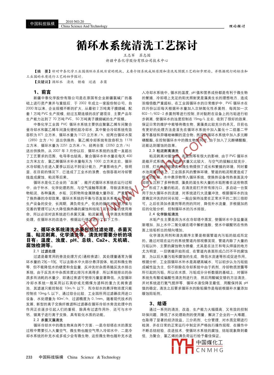 中國科技縱橫2010 NO.20China Science And Technology理論探討循環(huán)水系統(tǒng)清洗工藝探討王志軍蘇志國新疆中泰化學(xué)股份有限公司技術(shù)中心[摘要]針對中泰化學(xué)工業(yè)園循環(huán)水系統(tǒng)目前的現(xiàn)狀,主要介紹系統(tǒng)成垢原因和清洗及預(yù)膜工藝的初步理論,并根據(jù)現(xiàn)行的標(biāo)準(zhǔn)和工業(yè)園的水質(zhì)進行工藝的初步探討。[關(guān)鍵詞]循環(huán)水清洗銹瘤過濾殺菌1、前言入冷卻水系統(tǒng)中。循水的溫度,pH值和營養(yǎng)成份都是有利于微生物新疆中泰化學(xué)股份有限公司是在原國有企業(yè)新疆氯堿廠的基的繁殖,冷卻塔上充足的陽光照射更是藻類生長的理想地方,造成礎(chǔ)上進行資產(chǎn)兼并與重組后,于2002 年成立一家股份制公司。自濃縮倍數(shù)嚴(yán)重超標(biāo)。在工業(yè)園循環(huán)水的8常維護中. PVC循環(huán)水在2000年以來,企業(yè)規(guī)模不斷的擴大.從最初2萬噸離子膜燒堿、四月份以后每天根據(jù)補水量加入次鈉氧化性殺菌劑,每周加一次套1萬噸PVC生產(chǎn)規(guī)模,經(jīng)過五期連續(xù)的改擴建項目,主要產(chǎn)品年602-1/602-2 殺菌劑等進行控制,并對黏附在設(shè)備上的污垢進行初生產(chǎn)能力達到了70萬噸PVC.50 萬噸離子膜燒堿的生產(chǎn)規(guī)模。步剝離,使循環(huán)水的濁度控制在15mg/L 左右,收到了很好的效果,中泰化學(xué)工業(yè)園PVC循環(huán)水系統(tǒng)主要供應(yīng)聚氯乙烯車間聚合保證日常的維護中能夠?qū)⑽⑸铩⒕孱惐容^充分的殺滅。目前也釜冷卻水和氯乙烯車間溴化鋰機組冷卻水.其中聚合冷卻系統(tǒng)有效有更好的處理方法是首先在循環(huán)水系統(tǒng)中加入氯化十二烷基二甲.容積為871立方米,循環(huán)水量為1123立方米/h,經(jīng)兩臺循環(huán)水泵基芐基銨和異噻唑啉酮的混合物:然后在循環(huán)水系統(tǒng)中加入多元醇(2650 立方/h)送出供換熱:氯乙烯冷卻系統(tǒng)有效容積為1178磷酸酯。在控制循環(huán)水中的微生物的同時.由于加入了元醇磷酸酯.立方米,循環(huán)水量為2251立方米/h.經(jīng)兩臺泵(2050 立方/h)還能達到緩蝕的效果。送出供換熱。從2007年3月份以后.循環(huán)水系統(tǒng)的濁度一直超出2.3粘泥剝離清洗了工藝要求的范圍,電導(dǎo)率也較高。聚合循環(huán)水補水量在每天400粘泥剝離對緩蝕劑.殺菌劑等有很大的影響,由于PVC循環(huán)水立方米左右,氯乙烯循環(huán)水補水量每天為1000 立方米左右。循環(huán)是敞開式系統(tǒng),每天的補水量又比較大,與空氣的接觸比較充分.水冷卻能力在進入夏季以后達不到設(shè)計能力,嚴(yán)重影響生產(chǎn)。很明日照,燈光等給細菌類和微生物提供了成長和繁殖的環(huán)境:同時蓄顯,在目前的情況下,已造成了工業(yè)水的浪費.也很容易對冷卻管水池周圍的施工、工業(yè)園多風(fēng)的整體環(huán)境,管道的粘泥程度造成了線造成腐蝕、粘泥等后果。很大的影響。水中懸浮物帶入循環(huán)系統(tǒng),使換熱設(shè)備傳熱表面及冷循環(huán)水是化工企業(yè)的” 血液”.敞開 式循環(huán)水系統(tǒng)在運行過程卻塔.上沉積了多種物質(zhì).藻類的滋生和大量的水垢附著在這些物質(zhì)中.由于補水.化學(xué)處理藥劑、 與空氣接觸等因素, 導(dǎo)致該系統(tǒng)生上,形成了大量的粘泥。在清洗前打開所有排污口,多啟動一臺泵物粘泥、各種藻類.水垢.沉積物和金屬銹瘤大量存在.嚴(yán)重影響用于加大循環(huán)水的流速,對系統(tǒng)進行大流量沖洗,根據(jù)循環(huán)水的濁了換熱器的冷卻效果。循環(huán)水系統(tǒng)的平衡與否直接關(guān)系著公司主要度確定沖洗的時間長短,- 般應(yīng)保持濁度在正常水平的二到三倍即生產(chǎn)設(shè)備的安全、長周期、滿負(fù)荷生產(chǎn)。優(yōu)良的循環(huán)水處理方案與可。之后在添加殺菌劑等藥劑的同時,降低補水流量,并根據(jù)加藥完善的管理可以大大降低換熱器的腐蝕和結(jié)垢,延長設(shè)備的使用壽后的化驗分析,控制循環(huán)水的污水排放。命。所以必須對該系統(tǒng)進行殺菌滅藻.粘泥剝離、 化學(xué)清洗和預(yù)膜2.4化學(xué)除垢清洗處理。在循環(huán)水的改造中,根據(jù)運行情況進行了如下工作:水垢產(chǎn)生主要是因為水在冷卻塔中蒸發(fā).使循環(huán)水中含鹽量逐漸增加,加上水中二氧化碳在塔中解析逸散,使水中碳酸鈣在傳熱2、循環(huán)水系統(tǒng)清洗主要包括過濾處理、殺菌滅面上結(jié)垢析出的傾向增加。藻、粘泥剝離、化學(xué)清洗等。清洗時需要分析的項化學(xué)清洗用劑和清洗順序主要是根據(jù)管道內(nèi)污垢的組成而定目有溫度、濁度、pH、總鐵、Ca2+、 無機磷、的。通過對現(xiàn)在運行的系統(tǒng)管道內(nèi)部觀察發(fā)現(xiàn).管道內(nèi)除了大量的腐蝕檢測等。污垢以外.主要的腐蝕物為銹瘤.尤其是在法蘭和彎頭焊接的地方2.1過濾處理尤為明顯.-旦銹瘤開始形成.在管道內(nèi)表面形成凸凹不平的腐蝕過濾是最常用的旁流處理方式(通稱旁濾).其處理量通常為循面,為以后大量污垢和腐蝕的生成、降低水流速等形成促進作用。環(huán)水量的2% ~5%,可以去除水中大部分懸浮固體.粘泥和微生物根據(jù)分析.工業(yè)園循環(huán)水補水是高硬高堿水,可 以初步認(r
