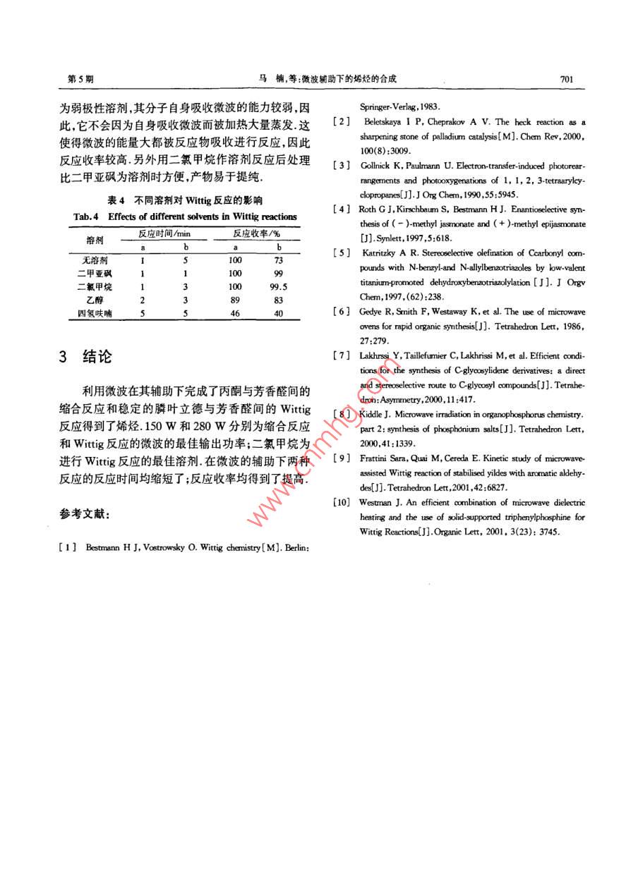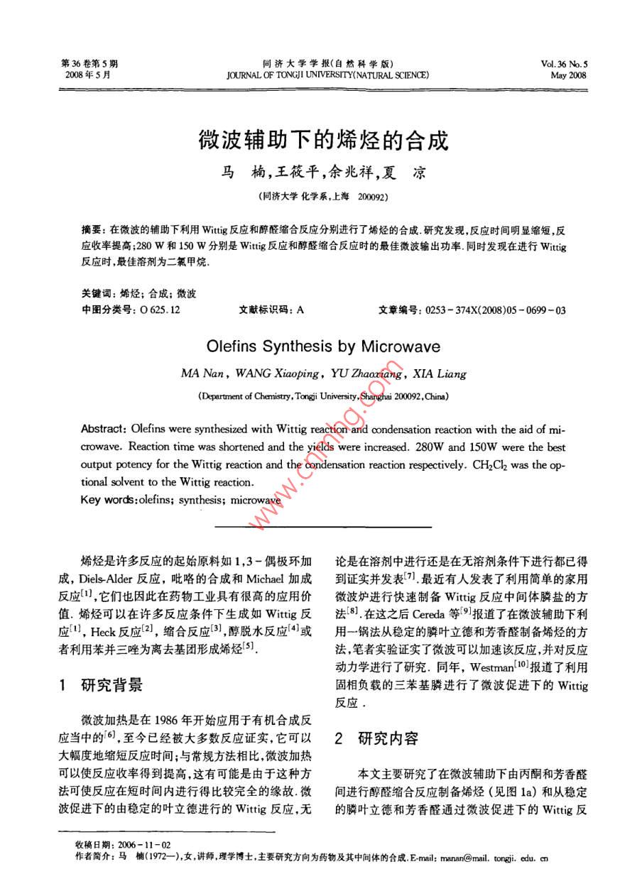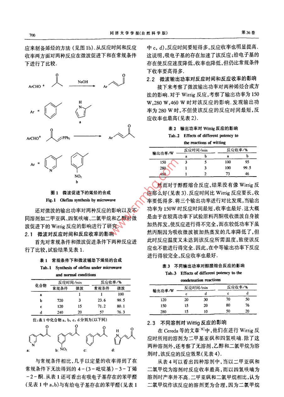 第36卷第5期同濟大學學報(自然科學版)Vol.36 No.52008年5月JOURNAL OF TONGJI UNIVERSITY(NATURAL SCIENCE)May 2008微波輔助下的烯烴的合成馬楠,王筱平,余兆祥,夏涼(同濟大學化學系,上海2002)摘要:在微波的輔助下利用Wittig反應和醇醛縮合反應分別進行了烯烴的合成.研究發(fā)現(xiàn),反應時間明顯縮短,反應收率提高;280W和150W分別是Wittig反應和醇醛縮合反應時的最佳微波輸出功率.同時發(fā)現(xiàn)在進行Wittig反應時,最佳溶劑為二氯甲烷.關鍵詞:烯烴;合成;微波中圖分類號: 0 625.12 .文獻標識碼: A文章編號: 0253 - 374X(2008)05 - 0699-03Olefins Synthesis by MicrowaveMA Nan, WANG Xiaoping, YU Zhaoriang, XIA Liang(Dpartment of Chemistry, Tongji University, Shanghai 200092 ,China)Abstract: Olefins were synthesized with Wittig reaction and condensation reaction with the aid of mi-crowave. Reaction time was shortened and the yields were increased. 280W and 150W were the bestoutput potency for the Wittig reaction and the condensation reaction respectively. CH2Cl2 was the op-tional solvent to the Wittig reaction. .Key words:olefins; synthesis; microwave烯烴是許多反應的起始原料如1,3-偶極環(huán)加論是在溶劑中進行還是在無溶劑條件下進行都已得成,Diels-Alder 反應,吡咯的合成和Michael加成到證實并發(fā)表[].最近有人發(fā)表了利用簡單的家用反應",它們也因此在藥物工業(yè)具有很高的應用價微波爐進行快速制備Wittig反應中間體膦鹽的方值.烯烴可以在許多反應條件下生成如Wittig反法[8].在這之后Cereda等[9]報道了在微波輔助下利應, Heck反應[2],縮合反應[3],醇脫水反應[4或用一鍋法從穩(wěn)定的膦葉立德和芳香醛制備烯烴的方者利用苯并三唑為離去基團形成烯烴[5].法,筆者實驗證實了微波可以加速該反應,并對反應動力學進行了研究.同年,Westman[10]報道了利用1研究背景固相負載的三苯基膦進行了微波促進下的Wittig反應.微波加熱是在1986 年開始應用于有機合成反應當中的6,至今已經(jīng)被大多數(shù)反應證實,它可以2研究內(nèi)容大幅度地縮短反應時間;與常規(guī)方法相比,微波加熱可以使反應收率得到提高,這有可能是由于這種方本文主要研究了在微波輔助下由丙酮和芳香醛法可使反應在短時間內(nèi)進行得比較完全的緣故.微間進行醇醛縮合反應制備烯烴(見圖1a)和從穩(wěn)定波促進下的由穩(wěn)定的葉立德進行的Wittig 反應,無的膦葉立德和芳香醛通過微波促進下的Wittig反收稿日期: 2006-11-02 .作者簡介:馬楠(1972- -),女,講師 ,理學博士,主要研究方向為藥物及其中間體的合成. Email: manan@mail. # edu. a700同濟大學學報(自然科學版)第36卷應來制備烯烴的方法(見圖1b).從反應時間和反應中c,d),反應時間要短得多,反應收率也明顯提高.收率兩方面對兩種反應在微波促進下和在常規(guī)條件這說明,吸電子基的存在加速了該反應;給電子基的下進行了比較.存在使反應速度降低,收率也降低,但仍比常規(guī)條件下收率要高得多.2.2微波輸出功率對 反應時間和反應收率的影響NaOHArCHO +接下來考察了微波輸出功率對兩種烯烴合成方法的影響.對于Wittig反應,考察了輸出功率為150w,280w,460W時對該反應的影響.發(fā)現(xiàn)輸出功Ar =率為280 W時,不但使該反應的反應時間最短,反應收率也最高(見表2).表2輸出功率對Wittg反應的影響是sypPhTab.2 Effects of different potency tothe reactions of witting反應時間/min反應收率/% _輸出功率/W009528099.57346NO2b然而對于醇醛縮合反應,結果沒有像Wittig反圖1微波促進 下的烯烴的合成應那么好(見表3).反應時間比Wittig反應要長,收Fig. 1 Olefins synthesis by microwave率要低得多.將三個輸出功率進行對比發(fā)現(xiàn),當輸出還對微波的輸出功率對兩種反應的影響以及不功率為150W時反應時間最短,收率也最好這大概同溶劑如二甲亞砜、四氫呋喃、二氯甲烷和乙醇對微是由于在較高功率下試驗原料丙酮吸收微波自身被波促進下的Wittig反應的影響進行了研究.加熱揮發(fā),使反應進行得不完全,而在較低功率下雖2.1微波對 反應時間和反應收率的影響然丙酮因為吸收微波被加熱蒸發(fā)的幾率降低了,但首先對常規(guī)條件和微波促進條件下兩種反應進此時反應溫度又未達到該反應所需溫度,致使該反應也不能進行得完全.因此,在中等輸出功率下反應行了比較,試驗結果見表1.進行得較完全,反應收率也最好.表1常規(guī)條件下和微波輔助下烯烴的合成表3不同輸出功率對醇醛縮合反應的影響Tab.1 Synthesis of olefins under microwaveTab.3 Effects of different potency to theand normal conditionscondensation reactions化合物反應收率/%常規(guī)條件微波1100d72023.6200512071.280.11508076240_576.380__1050注:表1中化合物a, b, c, d分別為(以下同)2.3 不同溶劑對Wittig反應的影響在Cereda等的文章9中,他們在進行Wittig反應時所用的溶劑為二甲基亞砜和四氫呋喃.除了這兩種溶劑外,還考察了無溶劑.乙醇和二氯甲烷為溶b: NO2劑時,該反應的反應效果(見表4).與常規(guī)條件相比,幾乎以定量的收率得到了在從表4可以看出四種溶劑中,當以二甲亞砜和常規(guī)條件下無法得到的4-(3-吡啶基)-3-丁烯二氯甲烷為溶劑時反應收率最高,而以四氫呋喃為-2-酮.從表1還可看出有吸電子基存在的苯甲醛溶劑時產(chǎn)率并不高.二甲亞砜和二氯甲烷相比,認為(見表1中a,b)與有給電子基存在的苯甲醛(見表1二氯甲烷作該反應的溶劑更為合理,因為二氯甲烷第5期馬楠,等:微波輔助下的烯烴的