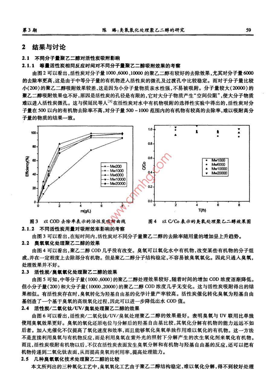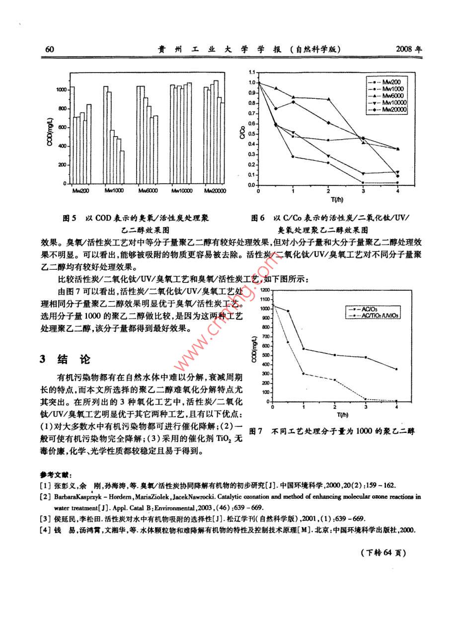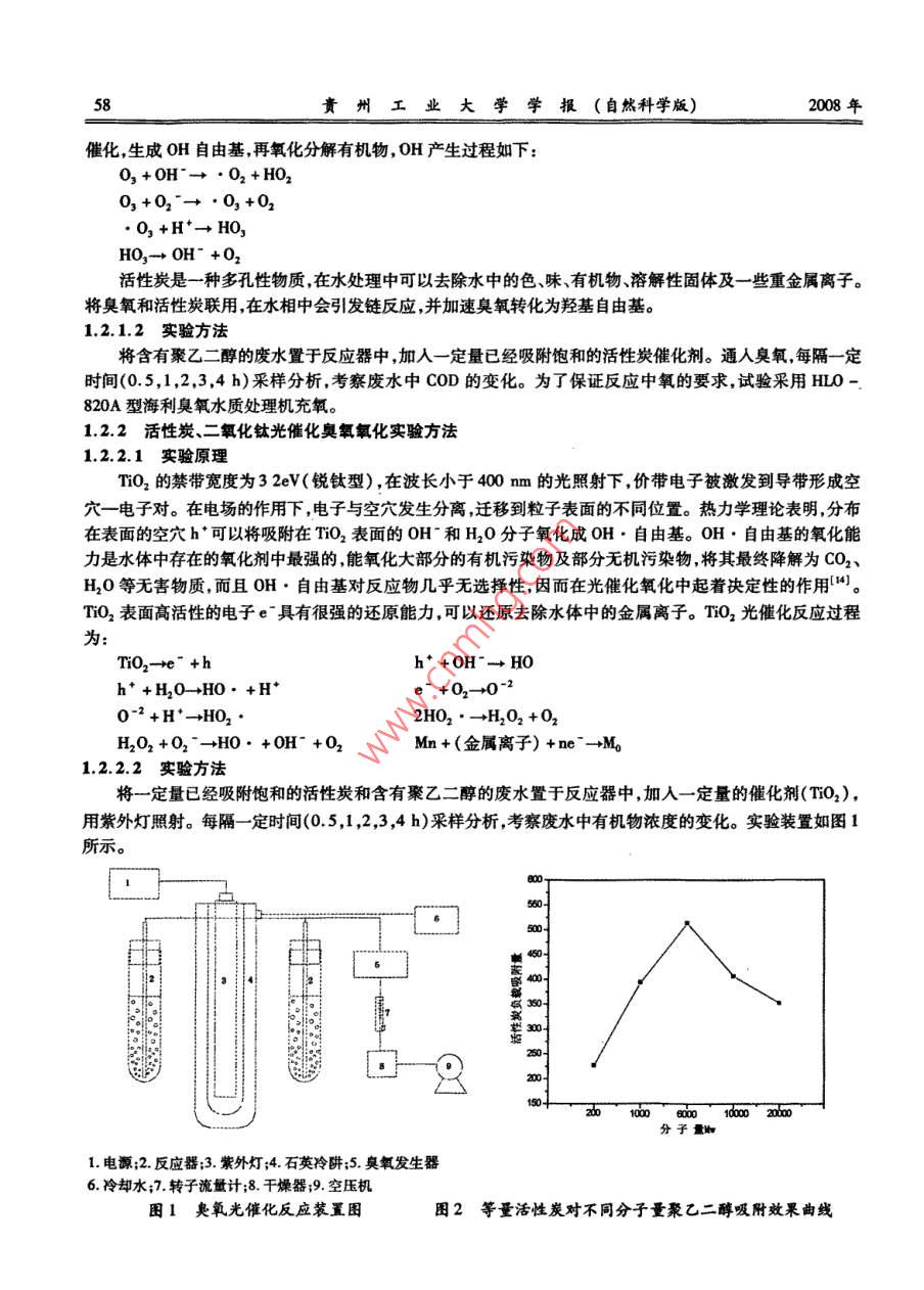 第37卷第3期貴州工業(yè)大學(xué)學(xué)報(自然科學(xué)版) Vol.37 No.32008年5月 JOURNAL OF GUIZHOU UNIVERSITY OF TECHNOLOGYMay.2008 (Natural Science Edition)文章編號:1009-0193(2008)03-0057-04臭氧氧化處理聚乙二醇的研究陳璐(貴州師范大學(xué)材建工程學(xué)院,貴州貴陽550014)摘要:系統(tǒng)地研究了臭氧氧化處理水中難降解有機(jī)化合物聚乙二醇的方法及效果,分別選用了氧,O3/活性炭和TiO2/UV/O3/活性炭復(fù)合處理的方法,結(jié)果表明,TiO2/UVO活性炭復(fù)合處理聚乙二醇得到最好效果。關(guān)鍵詞:奧氧氧化;聚乙二醇;光催化氧化;COD中分類號:T文獻(xiàn)標(biāo)識碼:A0前言臭氧具有極強(qiáng)的氧化性,臭氧氧化及與此有關(guān)深度氧化處理工藝如臭氧紫外線,在廢水處理中有廣闊的前景。臭氧是一種強(qiáng)氧化劑,它能與許多有機(jī)物質(zhì)發(fā)生反應(yīng),其氧化作用機(jī)理目前尚無肯定的研究結(jié)論,通常認(rèn)為主要來自臭氧離解的·OH自由基,它是發(fā)生在水中的已知氧化劑中最活潑的氧化劑,它很容易通過基型反應(yīng)將各種類型的有機(jī)物氧化?!H自由基還可與其他物質(zhì)如苯衍生物等形成二次氧化基(R"),它還能將碳酸鹽或重碳酸鹽離子氧化成可起三次氧化劑作用的碳酸根(CO3)或重碳酸根(HCO3),臭氧分子可離解成過氧化物離子(HO2-CO2)的過羥基1。聚乙二醇又名聚乙烯二醇或聚氧乙烯二醇,是一種不同聚合度的混合物。由于聚合度的不同,會產(chǎn)生性質(zhì)用途上的差別。目前常見的聚乙二醇有PE200、eg400、peg600、Peg4000、PEG6000等。一般來說聚乙二醇化學(xué)性質(zhì)比較穩(wěn)定,無臭或味微臭,具有吸濕性,絕大多數(shù)都易溶于水。本類物質(zhì)可溶于乙醇、丙酮氯仿等多數(shù)有機(jī)溶媒。本類物質(zhì)通常情況下不活潑、不水解、耐熱。在室溫條件下,分子量在700以下的聚乙二醇類通常為無色或幾乎無色的透明澄清稠液體,分子量在2000以上時,室溫下為固體。聚乙二醇水溶液pH值呈微酸性或中性。室內(nèi)實驗表明,聚乙二醇在水中發(fā)生強(qiáng)烈吸附并形成兩層或更多有序?qū)?。分子量?0以上的PEG均具有良好的可結(jié)晶性能以下就臭氧在處理溶解于水中的分子量分別為200,1000,600,000000的聚乙二醇的問題進(jìn)行研究。1實驗方法1.1實驗材料及儀器1.1.1實驗材料分別采用分子量為2000、2000聚乙二醇配置COD約為1000mg/L的模擬廢水,催化劑選用了 Degusa25納米級的銳鈦礦型二氧化鈦和30-80目的活性炭,實驗用水為蒸餾水。1.1.2實驗儀器SGY1型多功能光化學(xué)儀,HLO820A型臭氧水質(zhì)處理機(jī),LZB4型玻璃轉(zhuǎn)子流量計。1.2實驗方法1.2.1活性炭、臭氧氧化實驗方法1.2.1.1實驗原理往水中投加臭氧,其強(qiáng)氧化性使有機(jī)物分子斷鏈成小分子,從而易于生物降解。反應(yīng)的途徑:通過OH收稿日期:2008-03-19作者簡介陳璐(1983-),女,貴州畢節(jié)人,助教,研究方向:水污染控制技術(shù)。58貴州工業(yè)大學(xué)學(xué)報(自然科學(xué)版)2008年催化,生成OH自由基,再氧化分解有機(jī)物,OH產(chǎn)生過程如下:O3+H→O2+H2O3+02→03+2O3+H+→H3O3→OH+O22活性炭是一種多孔性物質(zhì),在水處理中可以去除水中的色、味、有機(jī)物、溶解性固體及一些重金屬離子。將臭氧和活性炭聯(lián)用,在水相中會引發(fā)鏈反應(yīng),并加速臭氧轉(zhuǎn)化為羥基自由基。1.2.1.2實驗方法將含有聚乙二醇的廢水置于反應(yīng)器中,加入一定量已經(jīng)吸附飽和的活性炭催化劑。通入臭氧,每隔一定時間(0.5,1,2,3,4h)采樣分析,考察廢水中COD的變化。為了保證反應(yīng)中氧的要求,試驗采用HLO-820A型海利臭氧水質(zhì)處理機(jī)充氧。1.2.2活性炭、二氧化鈦光催化奧氧氧化實驗方法1.2.2.1實驗原理tiO2的禁帶寬度為32eV(銳鈦型),在波長小于400m的光照射下,價帶電子被激發(fā)到導(dǎo)帶形成空穴一電子對。在電場的作用下,電子與空穴發(fā)生分離,遷移到粒子表面的不同位置。熱力學(xué)理論表明,分布在表面的空穴h+可以將吸附在TiO2表面的OH和2O分子氧化成OH·自由基。OH·自由基的氧化能力是水體中存在的氧化劑中最強(qiáng)的,能氧化大部分的有機(jī)污染物及部分無機(jī)污染物,將其最終降解為CO2、H2O等無害物質(zhì),而且OH·自由基對反應(yīng)物幾乎無選擇性,因而在光催化氧化中起著決定性的作用4。tiO2表面高活性的電子e具有很強(qiáng)的還原能力,可以還原去除水體中的金屬離子。TiO2光催化反應(yīng)過程為:ti2→e+hh+oh→hoh++h2O→HO+H+e+O2→0-20-2+H+→HO22HO2→H2O2+O2H2O2+2→o+oh+O2n+(金屬離子)+ne→M1.2.2.2實驗方法將一定量已經(jīng)吸附飽和的活性炭和含有聚乙二醇的廢水置于反應(yīng)器中,加入一定量的催化劑(iO2),用紫外燈照射。每隔一定時間(0.5,1,2,3,4h)采樣分析,考察廢水中有機(jī)物濃度的變化。實驗裝置如圖1所示。450400303002001502010006000100000分子量1.電源;2.反應(yīng)器;3.紫外燈;4.石英冷阱;5.臭氧發(fā)生器6.冷卻水;7.轉(zhuǎn)子流量計;8.干燥器;9.空壓機(jī)圖1臭氧光催化反應(yīng)裝置圖圖2等量活性炭對不同分子量聚乙二醇吸附效果曲線第3期陳璐:臭氧氧化處理聚乙二醇的研究592結(jié)果與討論2.1不同分子量聚乙二醇對活性炭吸附影響2.1.1等量活性炭相同反應(yīng)時間對不同分子量聚乙二醇吸附效果的考察由圖2可以看出,活性炭對分子量1000、6000、10000的