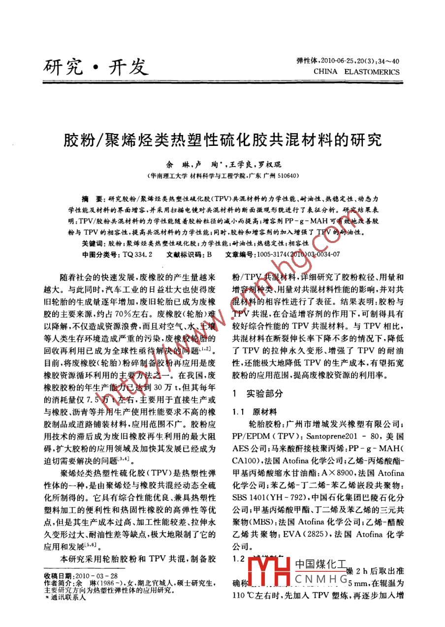 研究·開發(fā)彈性體,20100625,20(3):34~40CHINA ELASTOMERICS膠粉/聚烯烴類熱塑性硫化膠共混材料的研究余琳,盧殉’,王學(xué)良,羅權(quán)琨(華南理工大學(xué)材料科學(xué)與工程學(xué)院,廣東廣州510640)摘要:研究膠粉/聚烯烴類熱塑性硫化膠(TPV)共混材料的力學(xué)性能、耐油性、熱穩(wěn)定性、動(dòng)態(tài)力學(xué)性能及材料的界面增容,并采用掃描電鏡對(duì)共混材料的斷面微觀形貌進(jìn)行了表征分析。研究結(jié)罘表明:TPV/膠粉共混材料的力學(xué)性能隨著膠粉粒徑的減小而提高;增容劑P-g-MAH可有效地改善膠粉與TPⅤ的相容性,提高共混材料的力學(xué)性能;同時(shí),膠粉和增容劑的加入增強(qiáng)了TPV的耐油性關(guān)鍵詞:膠粉;聚烯烴類熱塑性硫化膠;力學(xué)性能;耐油性;熱穩(wěn)定性;相容性中圖分類號(hào):TQ334.2文獻(xiàn)標(biāo)識(shí)碼:B文章編號(hào):1005-3174(2010)03-003407隨著社會(huì)的快速發(fā)展,廢橡膠的產(chǎn)生量越來粉/TPV共混材料,詳細(xì)研究了膠粉粒徑、用量和越大。與此同時(shí),汽車工業(yè)的日益壯大也使得廢增容劑種類、用量對(duì)共混材料性能的影響,并對(duì)共舊輪胎的生成量逐年增加,廢舊輪胎已成為廢橡混材料的相容性進(jìn)行了表征。結(jié)果表明:膠粉與膠的主要來源,約占70%左右。廢橡膠(輪胎)難TPV共混,在合適增容劑的作用下,可制得具有以降解,不僅造成資源浪費(fèi),而且對(duì)空氣、水、土壤較好綜合性能的TPⅤ共混材料。與TPV相比等人類生存環(huán)境造成嚴(yán)重的污染,廢橡膠輪胎的共混材料在斷裂伸長(zhǎng)率下降不多的情況下,降低回收再利用已成為全球性亟待解決的問題2。了TPV的拉伸永久變形、增強(qiáng)了TPV的耐油目前,將廢橡膠(輪胎)粉碎制備膠粉冉應(yīng)用是廢性,還能極大地降低TPV的生產(chǎn)成本,有望拓寬橡膠資源循環(huán)利用的主要方法之一。在我國(guó),廢膠粉的應(yīng)用范圍提高廢橡膠資源的利用率橡膠膠粉的年生產(chǎn)能力已達(dá)到30萬t,但其每年的消耗量?jī)H7.5萬t左右,主要用于直接生產(chǎn)或?qū)嶒?yàn)部分與橡膠、瀝青等并用生產(chǎn)使用性能要求不高的橡1.1原材料膠制品或道路鋪裝材料,應(yīng)用范圍不廣。膠粉應(yīng)輪胎膠粉:廣州市增城發(fā)興橡塑有限公司;用技術(shù)的滯后成為廢舊橡膠再生利用的最大阻PP/EPDM(TPV): Santoprene201美國(guó)礙,擴(kuò)大膠粉的應(yīng)用領(lǐng)域及加快其發(fā)展已經(jīng)成為AES公司;馬來酸酐接枝聚丙烯:PP-g-MAH(迫切需要解決的問題3,4。CA100),法國(guó) Atofina化學(xué)公司;乙烯-丙烯酸酯聚烯烴類熱塑性硫化膠(TPV)是熱塑性彈甲基丙烯酸縮水甘油酯:A×8900,法國(guó) Atofina性體的一種,是由聚烯烴與橡膠共混經(jīng)動(dòng)態(tài)全硫化學(xué)公司;苯乙烯-丁二烯-苯乙烯嵌段共聚物化所制得的。它具有綜合性能優(yōu)良、兼具熱塑性SBS1401(YH-792),中國(guó)石化集團(tuán)巴陵石化分塑料加工的便利性和熱固性橡膠的高彈性等優(yōu)公司;甲基丙烯酸甲酯、丁二烯及苯乙烯的三元共點(diǎn),但是其生產(chǎn)成本過高、加工性能較差、拉伸永聚物(MBS):法國(guó) Atofina化學(xué)公司;乙烯-醋酸久變形過大、耐油性差等缺點(diǎn),極大地限制了它的乙烯共聚物:EVA(2825),法國(guó) Atofina化學(xué)應(yīng)用和發(fā)展公司本研究采用輪胎膠粉和TPV共混,制備膠1.2中國(guó)煤化工:(0532,女兩北宜坡人,士研究生,確2h后取出準(zhǔn)CNMHG5mm,.在輥溫為熱塑性彈性體的應(yīng)丿10℃左右時(shí),先加入TPV塑煉,再逐步加入增第3期余琳,等.膠粉聚烯烴類熱塑竹硫化膠共混材料的研究容劑和膠粉混合物待物料全部加入完畢后,混煉粉共混材料的力學(xué)性能比純TPV低,但其中拉5min,打卷,出片。將上述所得的共混材料放入伸永久變形得到改善,較之純TPⅤ要低。隨著模具中,于170℃下預(yù)熱15min,排氣10次后保膠粉的粒度越來越小,膠粉的比表面積越來越大,壓5min,然后迅速移至冷壓機(jī)上冷壓至室溫成其在TPⅤ中的分散性有所提高,因此拉伸強(qiáng)度片,根據(jù)相關(guān)標(biāo)準(zhǔn),將研制片材裁剪為測(cè)試樣品進(jìn)撕裂強(qiáng)度和斷裂伸長(zhǎng)率上升。同時(shí),可能因?yàn)殡S行性能測(cè)試。著膠粉粒徑越小,膠粉更容易在TPV網(wǎng)絡(luò)結(jié)構(gòu)1.3性能測(cè)試中形成連續(xù)相,分子鏈間內(nèi)摩擦增大,使TPV分(1)力學(xué)性能:試樣的拉伸強(qiáng)度、斷裂伸長(zhǎng)子鏈回復(fù)性變差,不可逆形變變大,而造成共混材率、拉伸永久變形及撕裂強(qiáng)度均在德國(guó)生產(chǎn)的料拉伸永久變形增大。zwick/ Roell z010型萬能試驗(yàn)機(jī)上進(jìn)行,拉伸性2.2增容劑種類對(duì)共混材料的力學(xué)性能的影響能按照 ASTM D412進(jìn)行測(cè)試,撕裂性能按照對(duì)于兩相體系,良好的相容性是聚合物共混ASTMD624進(jìn)行測(cè)試。物獲得優(yōu)良性能的一個(gè)重要前提”。純TPV與(2)耐油性:選用ASTM3“油,按照GB/膠粉的相容性并不好,因此需要加入增容劑來改T1690—2006進(jìn)行測(cè)試善它們的相容性。不同增容劑種類對(duì)共混材料力(3)熱穩(wěn)定性能:試樣的熱失重在德國(guó)學(xué)性能的影響如表2所示。從表2可以看出,PPNetzsch TG209F1型熱重分析儀上測(cè)定測(cè)試溫g-MAH作為TPV/膠粉共混材料的增容劑度范圍為30~65