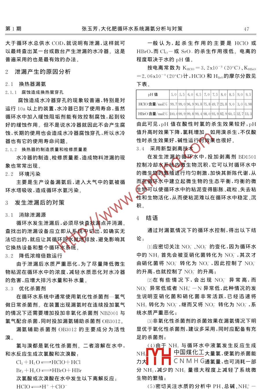 第22卷第1期甘肅科技Vol.22 No.12006年1月Gansu Science and TechonlogyJan. 2006大化肥循環(huán)水系統(tǒng)漏氨分析與對(duì)策張玉芳(蘭州石化公司化肥廠,甘肅蘭州730060)摘要:分析了循環(huán)水系統(tǒng)產(chǎn)生泄漏的原因和危害,提出了泄漏的判定查找方法、解決系統(tǒng)泄漏的對(duì)策到了實(shí)踐的驗(yàn)證對(duì)其它存在泄露的循環(huán)水系統(tǒng)有一定的借鑒作用。關(guān)鍵詞:循環(huán)水;泄漏;分析;對(duì)策中圖分類號(hào):TQ111.16蘭州石化公司化肥廠380#水場(chǎng)循環(huán)冷卻水裝研判水質(zhì)狀況,通過對(duì)以下各項(xiàng)指標(biāo)在泄漏時(shí)產(chǎn)生置采用敞開式循環(huán)冷卻水工藝,原設(shè)計(jì)循環(huán)水量為的異變綜合分析,判斷系統(tǒng)是否泄漏。28802m3 /h,系統(tǒng)保有水量為10000m3 ,采用非有機(jī)1.1 循環(huán)水水質(zhì)觀察膦酸鹽的AEC專利水處理技術(shù),是-一個(gè)集防腐、阻.當(dāng)氨泄漏至循環(huán)水中微生物大量繁殖,藻類快垢和微生物控制的綜合水處理技術(shù),配合由計(jì)算機(jī)速滋生,水就變得腥臭,顏色變成黃褐色或深褐色??刂频娜詣?dòng)在線監(jiān)測(cè)、控制和加藥系統(tǒng),確保循環(huán)1.2日常報(bào)表數(shù)據(jù)分析水系統(tǒng)的長(zhǎng)周期穩(wěn)定運(yùn)行。(1)水中NH N、NO2和NO3離子濃度增高;合成氨廠的循環(huán)冷卻水系統(tǒng)中,大氣中的(2)PH值發(fā)生變化;NH3、NO等會(huì)通過冷卻塔的氣水交換,更為甚者設(shè)(3)總鐵與濁度:大多數(shù)微生物都會(huì)對(duì)金屬產(chǎn)生腐備中的NHs的泄漏為微生物的生存提供了豐富的蝕,硫酸鹽還原菌會(huì)對(duì)金屬(鐵)產(chǎn)生較大的腐蝕,被腐氨營(yíng)養(yǎng)源,使微生物大量繁殖與滋長(zhǎng),冷卻水在冷卻蝕下來的鐵離子在氧氣作用下氧化生成Fe(OH)3沉塔內(nèi)噴淋曝氣過程中溶入大量的氧氣,為好氧性微淀物。生物提供了必要的條件,而冷卻水中的懸浮物形成的淤泥又為厭氧性微生物提供了庇護(hù)場(chǎng)所,因此,有Fe(OH)。為黃色或褐色沉淀物,會(huì)造成循環(huán)水些循環(huán)冷卻水系統(tǒng)成了-些微生物的-一個(gè)巨大的捕顏色加深,導(dǎo)致濁度升高。另-方面微生物藻類本身具有光的散射作用,增大輝濁度。當(dāng)泄漏產(chǎn)生時(shí),集器和培養(yǎng)器。氨對(duì)循環(huán)水系統(tǒng)的危害:氨的污染促進(jìn)了硝化微生物數(shù)量會(huì)急劇上升,金屬腐蝕加重,循環(huán)水中的菌群的大量繁殖和亞硝酸根的大量產(chǎn)生。硝化菌群總鐵就會(huì)大幅上升,濁度也會(huì)上升,達(dá)正常并得值的的大量繁殖會(huì)造成換熱器的生物性腐蝕和結(jié)垢,亞1倍以上。硝酸根會(huì)消耗大量的殺菌劑氯,而使氯殺生效率大(4)余氯:循環(huán)水系統(tǒng)一般都采用氯氣殺菌。大降低;使PH值發(fā)生變化,從而影響腐蝕和結(jié)垢的當(dāng)有機(jī)物泄漏時(shí),微生物藻類大量繁殖,氯氣消耗就控制,氨剛進(jìn)入循環(huán)水系統(tǒng)時(shí),會(huì)造成PH值上升,增加,另外有機(jī)物也與氯氣產(chǎn)生化學(xué)反應(yīng),消耗氯總堿度增加,接著會(huì)造成硝化菌群的大量繁殖,從而氣,所以在裝置發(fā)生泄漏時(shí)測(cè)得的余氯比正常值低使氨態(tài)氮被不斷地轉(zhuǎn)化成亞硝酸根和硝酸根等酸性了許多,若泄漏量大;甚至可能測(cè)不到余氯。物質(zhì),亞硝酸根還能將部分殺菌劑氯轉(zhuǎn)化成氯根,最(5)細(xì)菌總數(shù)與粘泥量:循環(huán)水系統(tǒng)細(xì)菌總數(shù)-終使循環(huán)水的PH值下降;氨的污染還能使水的顏般在1X105個(gè)/mL以下,粘泥量控制在4mL/m3色變深、粘泥物質(zhì)增多,從而使?jié)岫壬仙R韵轮袊夯ぶ笜?biāo),說明細(xì)菌獲得了充足MHCNMHG世漏的可能。1泄漏的判定與查找1.3泄漏源查找循環(huán)水系統(tǒng)產(chǎn)生泄漏,必然會(huì)引起循環(huán)水水質(zhì)分析COD:在用氣相色譜儀查出的可能發(fā)生泄以及它的各項(xiàng)分析指標(biāo)發(fā)生異變,水冷器換熱效果漏的水冷器中,取各水冷器出水水樣分析COD,與的降低,因而可以通過觀察水質(zhì):以及取樣分析等來循環(huán)水總供水COD進(jìn)行比較,凡水冷器出水COD .第1期張玉芳:大化肥循環(huán)水系統(tǒng)漏氨分析與對(duì)策47大于循環(huán)水總供水COD,就說明有泄漏,這樣就可-般認(rèn)為,起殺生作用的主要是HCIO或以最終查出某一臺(tái)或數(shù)臺(tái)產(chǎn)生泄漏的水冷器。這是HBrO,而Clo-或SrO_的殺生作用很低。電離的普遍采用的也是最有效的辦法。程度取決于水的pH值。按電離常數(shù)為KHco = 3.2x10~ 8 (20°C)、KHmo2泄漏產(chǎn)生的原因分析=2.06x10~*(20°C)計(jì), HCIO和Hpeo的摩爾分?jǐn)?shù)見2.1換熱器漏氨下表。2.1.1腐蝕造 成換熱管穿孔pH值5.05.56.06.57.07.5808.59.09.腐蝕造成水冷器穿孔的現(xiàn)象較普遍,特別是對(duì)HAO含量/ mol% 99. 7|99.0|96.9|90. 875. 8|49.7|23.8| 9.0| 3.00. 98運(yùn)行10a以上的裝置,水冷器已到了使用壽命,雖然HBrO 含量/ mol% 100. 099. 99.899. 4| 98.0|93. 9|82. 960.5|32. 7|13.循環(huán)水中加入緩蝕阻垢劑能有效控制腐蝕,起到較好的緩蝕作用。但不是說水冷器就因此不會(huì)產(chǎn)生腐由此可見,pH值在酸性時(shí)氯的殺生效果較好,pH蝕,長(zhǎng)期的使用也會(huì)造成水冷器腐蝕穿孔,所以水冷值升高時(shí)效果下降,氯