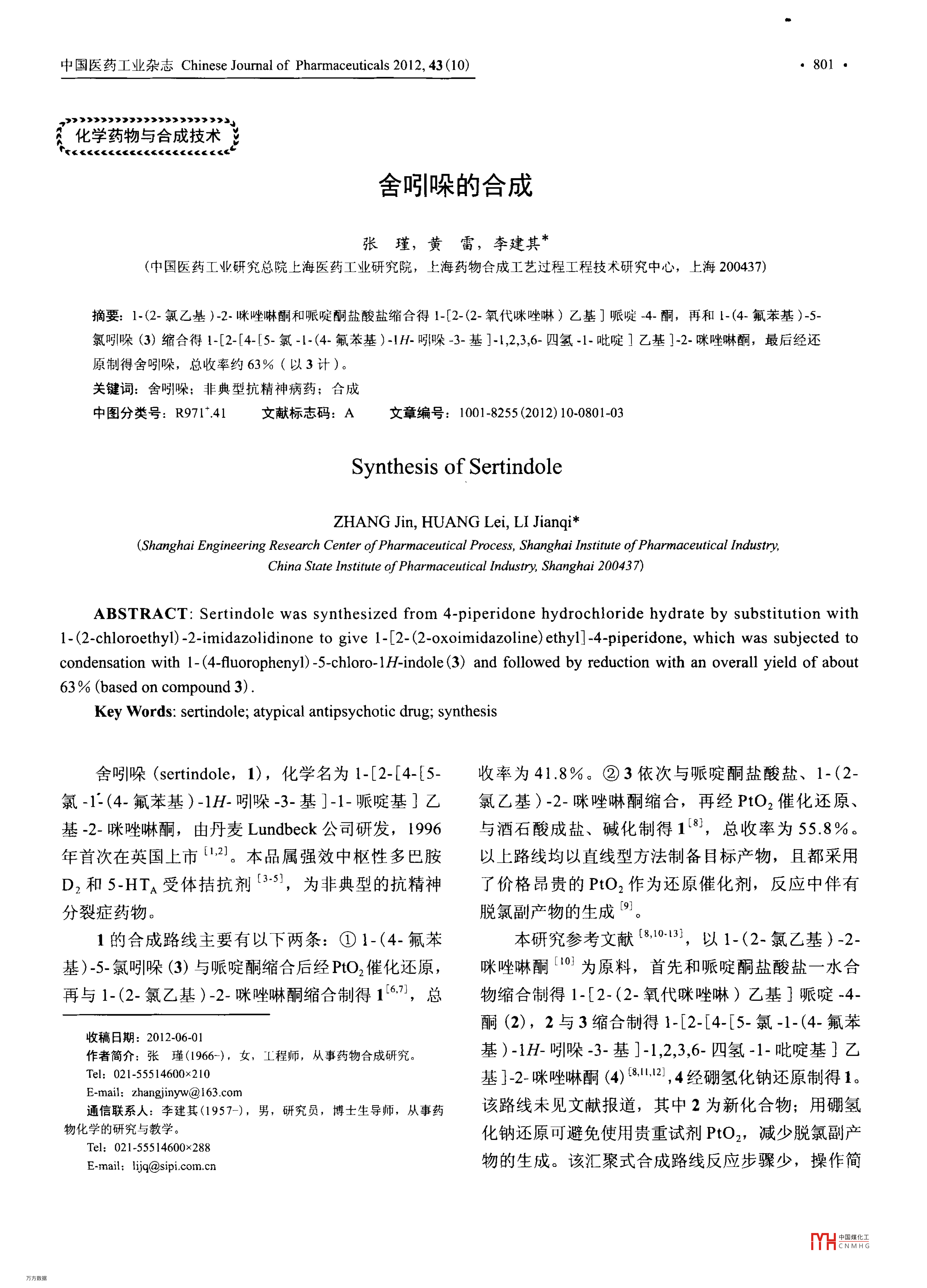 中國(guó)醫(yī)藥工業(yè)雜志 Chinese journal of pharmaceuticals2012,43(10)》》》》》》》》》》》》》》》》》》》化學(xué)藥物與合成技術(shù)《《《《《《《《《《《《《《《《《《《舍吲哚的合成張瑾,黃雷,李建其*〔中國(guó)醫(yī)藥工業(yè)研究總院上海醫(yī)藥工業(yè)硏究院,上海藥物合成工藝過(guò)程工程技術(shù)硏究中心,上海200437)摘要:1-(2-氯乙基)-2·咪唑啉酮和哌啶酮鹽酸鹽縮合得1-[2-(2-氧代咪唑晽)乙基]哌啶-4-酮,再和-(4-氟苯基)-5-氯吲哚(3)縮合得!-[2-「4-「5-氯-1-(4-氟苯基)-lH-吲哚-3-基]-1,2,3,6-四氫-1-吡啶η乙基]-2-咪唑晽酮,最后經(jīng)還原制得舍吲哚,總收率約63%(以3計(jì))關(guān)鍵詞:舍吲哚;非典型抗精神病藥;合成中圖分類號(hào):R97141文獻(xiàn)標(biāo)志碼:A文章編號(hào):10018255(2012)100801-03Synthesis of sertindoleZHANG Jin, HUANG Lei, LI Jianqi*( Shanghai Engineering Research Center of pharmaceutical Process, Shanghai Institute of pharmaceutical Industry,China state Institute of pharmaceutical Industry, Shanghai 200437)ABSTRACT: Sertindole was synthesized from 4-piperidone hydrochloride hydrate by substitution with1-(2-chloroethy1)-2-imidazolidinone to give 1-[2-(2-oxoimidazoline) ethyl]-4-piperidone, which was subjected tocondensation with 1-(4-fluoropheny1)-5-chloro-1H-indole (3)and followed by reduction with an overall yield of about63%(based on compound 3Key Words: sertindole; atypical antipsychotic drug; synthesis舍吲哚( sertindole,1),化學(xué)名為l-[2-[4-[5-收率為41.8%。②3依次與哌啶酮鹽酸鹽、1-(2氯-1-(4-氟苯基)-1H吲哚-3-基]-1-哌啶基]乙氯乙基)-2-咪唑啉酮縮合,再經(jīng)PtO2催化還原基-2-咪唑啉酮,由丹麥 Lundbeck公司研發(fā),1996與酒石酸成鹽、堿化制得18,總收率為558%年首次在英國(guó)上市2。本品屬?gòu)?qiáng)效中樞性多巴胺以上路線均以直線型方法制備目標(biāo)產(chǎn)物,且都采用D2和5-HT受體拮抗劑3,為非典型的抗精神了價(jià)格昂貴的PO2作為還原催化劑,反應(yīng)中伴有分裂癥藥物脫氯副產(chǎn)物的生成。1的合成路線主要有以下兩條:①1-(4-氟苯本研究參考文獻(xiàn).1013,以1-(2-氯乙基)-2基)-5-氯吲哚(3)與哌啶酮縮合后經(jīng)PO2催化還原,咪唑啉酮0為原料,首先和哌啶酮鹽酸鹽一水合再與1-(2-氯乙基)-2-咪唑啉酮縮合制得16,總物縮合制得1-[2-(2-氧代咪唑啉)乙基]哌啶酮(2),2與3縮合制得1-[2-[4-[5-氯-1-(4-氟苯收稿日期:2012-06-01作者簡(jiǎn)介:張瑾(1966-),女,工程師,從事藥物合成研究基)-1H-吲哚-3-基]-1,2,3,6-四氫-1-吡啶基]乙Tel:021-55514600×210基]-2-咪唑啉酮(4)32,4經(jīng)硼氫化鈉還原制得1。E-mail;zhangjinyw(163.com通信聯(lián)系人:李建其(1957),男,研究員,博士生導(dǎo)師,從事藥該路線未見(jiàn)文獻(xiàn)報(bào)道,其中2為新化合物;用硼氫物化學(xué)的研究與教學(xué)?;c還原可避免使用貴重試劑PO2,減少脫氯副Tel:021-55514600×288E-mail:lijq@sipi.com.cn物的生成。該匯聚式合成路線反應(yīng)步驟少,操作簡(jiǎn)中國(guó)醫(yī)藥工業(yè)雜志 Chinese journal of pharmaceuticals2012,43(10)HCL·H2NaHCO3/MIBK0NHNaBH4/THFNH圖11的合成路線便,成本低,產(chǎn)品純度高,有利于工業(yè)化生產(chǎn),總(CDCl3)8:2.59(brs,2H),267(t,J=68Hz,2H)收率為62.8%(以3計(jì))。1的合成路線見(jiàn)圖1。279(t,J=56Hz,2H),328(s,2H),3.38~343(m實(shí)驗(yàn)部分4H),353~3.56(m,2H),4.78(brs,lH),6.16(s,1-[2-(2-氧代咪唑啉)乙基]哌啶-4酮(2)1H),714~7.40(m,7H),7.88(d,J=72Hz,1H將1-(2-氯乙基)-2-咪唑啉酮(按文獻(xiàn)自制,舍吲哚(1)212g,1.43mo)、哌啶酮鹽酸鹽ˉ水合物(l57g,將4(60g,0.14mol)和THF(1000ml)置1.02mo1)、碳酸氫鈉(258g,3.07moU)和甲基反應(yīng)瓶中,攪拌均勻,室溫加入硼氫化鈉(30g,異丁酮(l000m)置反應(yīng)瓶中,于90~95℃反0.79mol),滴加冰乙酸(5ml),室溫?cái)嚢?h,應(yīng)24h,過(guò)濾,濾液蒸干,剩余物用乙醚-乙酸向反應(yīng)液中慢慢滴加37%鹽酸(150ml),攪拌乙酯(1:1,200m)打漿洗滌,得淡黃色固體30min,加水(800ml),減壓蒸除THF,加30%2(137g,63.4%),mp112~14℃。MS(m/z):氫氧化鈉溶液(約200ml)調(diào)至約pH12,用二氯212M+H];HNMR(400MHz,CDC13)8:241(t,甲烷(400m1×3)萃取,合并有機(jī)層,經(jīng)飽和氯化6.0Hz,4H),2.61(t,J=6.4Hz,2H),2.78(t,J=鈉溶液(300m)洗滌,經(jīng)無(wú)水硫酸鈉干燥后過(guò)濾,52Hz,4H),332(t,J=6.0Hz,2H),3.36~3.38(m,濾液減壓蒸于,剩余物用丙酮重結(jié)晶,得白色結(jié)2H),347~3.51(m,2H),511(s,H)晶1(43g,71.3%),mp153~154℃(文獻(xiàn)61-[2-[4-[5-氯-1-(4氟苯基)-1H吲哚3-154-155℃)。純度98.8%[HPLC歸一化法:基]-12,3,6-四氫-1-吡啶基]乙基]-2-咪唑啉酮(4)色譜柱 Sepa GP-C8柱(4.6mmx250mm,5μm)將2(100g,0.47mol)、濃鹽酸(320m)和流動(dòng)相磷酸鹽緩沖液(pH7.2)-乙腈·THF(50冰乙酸(320ml)置反應(yīng)瓶中,加熱至回流,滴43:7);檢測(cè)波長(zhǎng)230nm;柱溫40℃;流速加3(按文獻(xiàn)8自制,80g,0.33mol)的冰乙酸1ml/min]。MS(m/z):44[M+H]+;HNMR(480m1)溶液,繼續(xù)回流1h,冷卻至室溫,加(400MHz,CDCl2)8:1.77~1.87(m,2H),205(d,入丙酮(300ml),過(guò)濾,加至20%氫氧化鈉溶液J=7.6Hz,2H),2.27(t,J=6.4Hz,2H),2.62(t,J(100ml)中,用乙酸乙酯(200ml×3)提取,合并64Hz,2H),2.82(m,1H),3.13(d,J=7.6Hz,2H有機(jī)層,經(jīng)無(wú)水硫酸鈉干燥后過(guò)濾,濾液減壓蒸干,3.38~3.44(m,4H),353~3.57(m,2H),4.66(s,得類白色固體4(126g,88.1%),mpl45~147℃1H),7.07(s,1H),7.3~7.21(m,3H),7.32(d,J文獻(xiàn):146℃)。MS(m2):439[M+H]t;HNMR88Hz,1H),7.38~745(m,2H),7.63(d,≠=2.0Hz,中國(guó)醫(yī)藥工業(yè)雜志 Chinese Journal of pharmaceuticals20l2,43(10)8031H)。l092-1101刁李雯,王宇,娗璐蕗,等.以烷基咪唑型