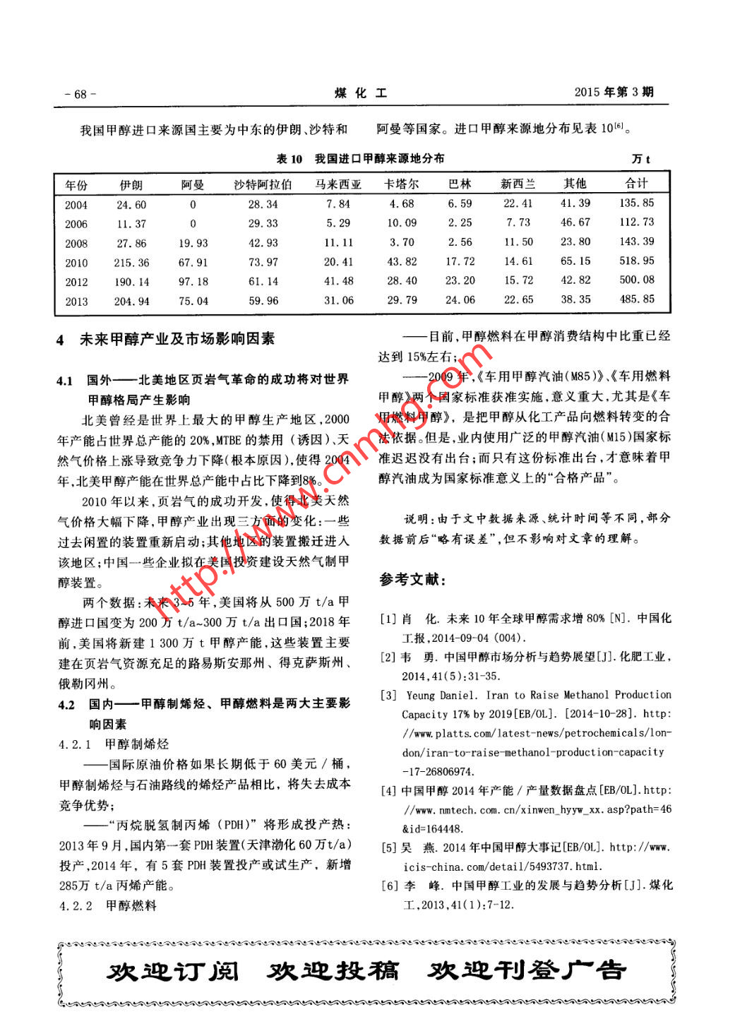 .第43卷第3期煤化工Vol.43 No.32015年6月Coal Chemical IndustryJun. 2015國內(nèi)外甲醇產(chǎn)業(yè)及市場分析肖建新(福州耀隆化工集團(tuán)公司,福建福州350014).摘要分析了世界甲醇市場格局,并對(duì)世界主要大型甲醇裝置、新增甲醇產(chǎn)能情況進(jìn)行了介紹。著重介紹了中國甲醇產(chǎn)業(yè)的現(xiàn)狀,分析了我國甲醇的生產(chǎn)、消費(fèi)、大型裝置、進(jìn)出口情況等。最后對(duì)影響國內(nèi)外甲醇產(chǎn)業(yè)及市場的因素進(jìn)行了分析。關(guān)鍵詞甲醇,市場, 發(fā)展?jié)摿?生產(chǎn),消費(fèi),進(jìn)出口文章編號(hào): 1005- 9598 (2015) -03-0063-07中 圖分類號(hào):TQ223.12°1文獻(xiàn)標(biāo)識(shí)碼:A1世界甲 醇市場情況能12070萬t/a,生產(chǎn)能力主要集中在中國、中東、南美和東歐部分地區(qū),其中中國約4 900萬t/a、中東1.1世界甲醇的生產(chǎn) 、消費(fèi)、進(jìn)出口1 610萬t/a、美洲1 360萬t/a,這3個(gè)區(qū)域產(chǎn)能占甲醇是全球流通的大宗產(chǎn)品,中國、歐洲、北美作全球甲醇產(chǎn)能的2/3以上。除中國是集生產(chǎn)和需求于為甲醇的最主要需求地區(qū),其貿(mào)易量約占全球甲醇貿(mào)一體,其余兩個(gè)地區(qū)均以出口為主,本地消化甲醇極易的3/4。目前甲醇行業(yè)的全球主要貿(mào)易流向是南美少。2013年國際甲醇供需情況見表1。全球(除中國大產(chǎn)品流向北美市場,對(duì)其他區(qū)域的影響力相對(duì)較弱;陸外)主要大型甲醇生產(chǎn)裝置及產(chǎn)能情況見表2。中東產(chǎn)品流向歐洲和東北亞,兼顧東西市場,是全球1.2 世界甲醇主要新增產(chǎn)能甲醇市場的主要供應(yīng)商;另外還有部分東北亞的甲醇未來新增甲醇產(chǎn)能主要集中在中國、南北美、伊來自東南亞市場,但數(shù)量不大。中東、南美為主要出口朗。中國由于MTO/MTP項(xiàng)目大量投產(chǎn),甲醇供大于求地區(qū),東亞、西歐、北美為主要進(jìn)口地區(qū)。的市場情況將發(fā)生改變;加上中國國內(nèi)天然氣價(jià)格上據(jù)安迅思(ICIS)統(tǒng)計(jì),2013年,全球甲醇有效產(chǎn)漲,致使天然氣制甲醇裝置大面積停產(chǎn),和國內(nèi)對(duì)于表12013 年國際甲醇供需情況有效產(chǎn)能/萬t.al產(chǎn)量/萬t需求量/萬t進(jìn)口量/萬t 出口量/ 萬t凈進(jìn)口量/ 萬t全球12 0707 6757 6762703.2 7033302352220-215歐洲8006401010.560190370美洲1 3601 08087059000-210中東1 330581100.-1032亞洲7 9704 390(+1 180) 5 478(+1 328)1480.3921088.印度603(1401300110東北亞地區(qū)7 3303 890(+1 090)50781 1901 188東南亞地區(qū)580470( +90 )260160注:數(shù)據(jù)來源安迅思中國,括號(hào)內(nèi)數(shù)據(jù)為相對(duì)上年變化量。收稿日期:2015-04-10作者簡介:肖建新( 1964- ),男,福建福州,高級(jí)工程師,學(xué)士, 1987年本科畢業(yè)于華僑大學(xué)機(jī)械制造專業(yè),現(xiàn)主要從事煤化工等行業(yè)產(chǎn)品的生產(chǎn)、經(jīng)銷及研發(fā)工作,E mail: 13905929787@139. com..-64-煤化工2015年第3期表2全球( 中國大陸除外)主要甲醇生產(chǎn)裝置及產(chǎn)能統(tǒng)計(jì)”產(chǎn)能公司名稱/地點(diǎn)備注/萬t.al新西蘭(Wai tara Valley和Motunui)2432014年產(chǎn)量219.6萬t特立尼達(dá)和多巴哥(Atlas )3112. 52014年產(chǎn)量90.7萬t特立尼達(dá)和多巴哥( Titan)87.52014年產(chǎn)量66.4萬t埃及》532014年產(chǎn)量41.6萬tMe thanex2)加拿大(Medicine Hat )562014年產(chǎn)量50.5萬t智利1和IV1802014年產(chǎn)量16.5萬t智利兩座工廠搬遷過來,Gei smar100美國路易斯安那州( Geismar 1和Geismar 2)1預(yù)計(jì)2015年初投產(chǎn),Geismar 2預(yù)計(jì)2016年投產(chǎn)合計(jì)9422014年產(chǎn)量485. 3萬t75SABIC與三菱瓦斯公司各投Saudi Methanol Company (A1- Jubail)85資50%的合資公司)0SABIC170(沙特阿拉伯)由巴林王國政府、SABIC和科Gulf Petrochemical Industries Company(巴林)威特PIC共同擁有Nat ional Methanol Company ( Ibn Sina)(Al- Jubail)105SABIC和CTE各50%所有權(quán)6452013年產(chǎn)量約480萬t165Zagros Petrochemical Co. (ZPC )Zagros Petrochemical Co. (ZPC)NPC(伊朗)Fanavaran Petrochemical Co. (FPC )harg Petrochemical Co. (KPC)66Shiraz Petrochemical Co..8.4_604. 44 Methanol Holdings Trinidad Ltd. - (MHTL)(特立尼達(dá)和多巴哥)1895 Petronas Methanol Labuan Sdn Bhd - (PML) (馬來西亞)Salalah Methanol Co. (阿曼)0man Methanol Co. LLC( 0MC)(阿曼)Atlantic Methanol Production Co. - (Ampco) (赤道幾內(nèi)亞)Metafrax(俄羅斯)0Togliatti Azot (Toaz)(俄羅 斯)1International Methanol Co. - (IMC) (沙特阿拉伯)由沙特阿拉伯Sipchem投資65%,日本JAMC投資35%2Qatar Fuel Additives Co. Ltd. - (Qafac) (卡塔爾)99注:1)數(shù)據(jù)主要來源于各公司官方網(wǎng)站;2)考慮天然氣供應(yīng)情況,有效產(chǎn)能約600萬t/a;3)Methanex占股63. 1%, 裝置總產(chǎn)能180萬t/a;4)Methanex占股50% ,裝置總產(chǎn)能130萬t/a。環(huán)境問題的重視,長遠(yuǎn)來看,相對(duì)便宜的國際甲醇價(jià)機(jī)構(gòu)預(yù)測(cè),至2016年北美新增甲醇產(chǎn)能約560萬格將帶動(dòng)中國甲醇進(jìn)口量上升。南北美方面,據(jù)相關(guān)t/a,非洲和南美將新增300萬t/a,2016年以后北美.2015年6月肖建新:國內(nèi)外甲醇產(chǎn)業(yè)及市場分析.65-甲醇基本實(shí)現(xiàn)自給,南美甲醇產(chǎn)能出現(xiàn)大量過剩,南t,約消耗2 800萬t甲醇;二是甲醇制芳烴技術(shù)取得美地區(qū)也將到東北亞、尤其是中國尋找甲醇的出口市突破.華電集團(tuán)世界首套